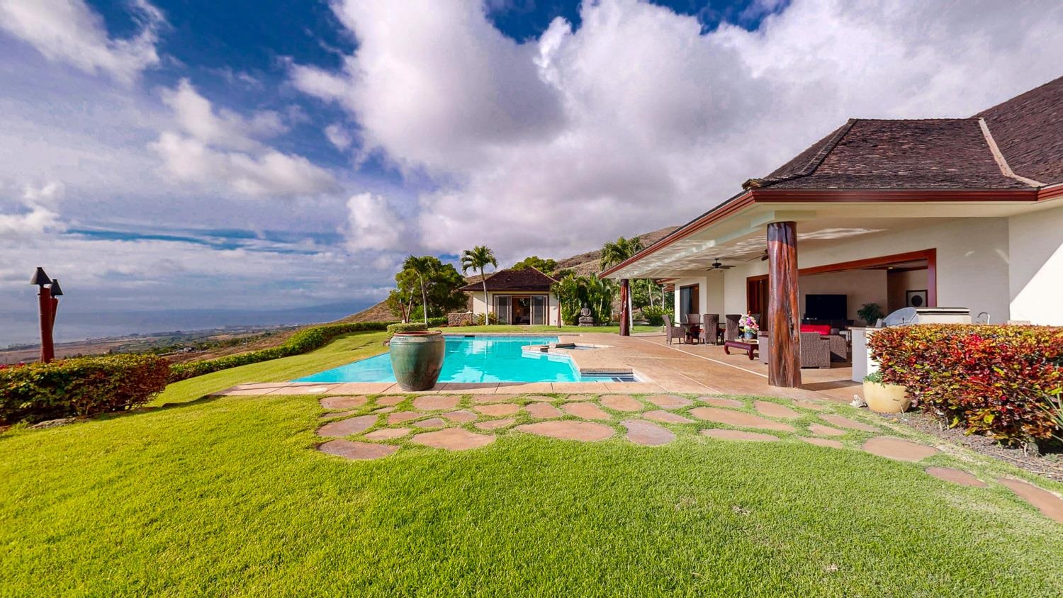 Within the gated community of Wailea Pualani, 384 Pualoa Nani Place is a design forward residence that blends privacy, craftsmanship, and modern comfort in a truly special setting. This 3 bedroom, 2 bathroom home with a large dedicated office spans 2,078 square feet and has been thoughtfully curated with distinctive finishes and upgrades throughout. The open living, dining, and kitchen areas are anchored by vaulted ceilings, black aluminum windows and doors, and distressed hand-scraped bamboo flooring, creating a warm yet contemporary aesthetic. Custom walnut woodwork carries throughout the home, complemented by statement lighting, bold wallpaper, and curated wall finishes that give the space a unique and elevated vibe. The recently remodeled kitchen is a showpiece, featuring walnut veneer cabinetry, a waterfall island slab, tile backsplash, farmhouse sink, induction cooktop, Miele appliances, and a built-in coffee station. An adjacent lounge seating area overlooks the pool, offering a seamless indoor outdoor connection. All bedrooms feature custom California Closet systems and fresh paint, while the remodeled bathrooms include Kohler fixtures, a tiled shower, and a luxurious primary soaking tub. Additional upgrades include a brand new salt-free charcoal whole-home water filtration system, Lennox central AC, a hardwired internal server supporting TV, speakers, and security cameras, and 41 solar panels for energy efficiency. Outdoor living shines with a 53 foot pool and spa with Baja shelf completed in 2021, surrounded by a lush green border that provides exceptional privacy. The landscaped backyard is ideal for relaxing or entertaining, while curb appeal and landscaping make an immediate impression. With impressive curb appeal, thoughtful upgrades throughout, and a setting designed for both privacy and lifestyle, this home sits at the end of a quiet cul-de-sac and offers a rare combination of design forward living and everyday ease.
