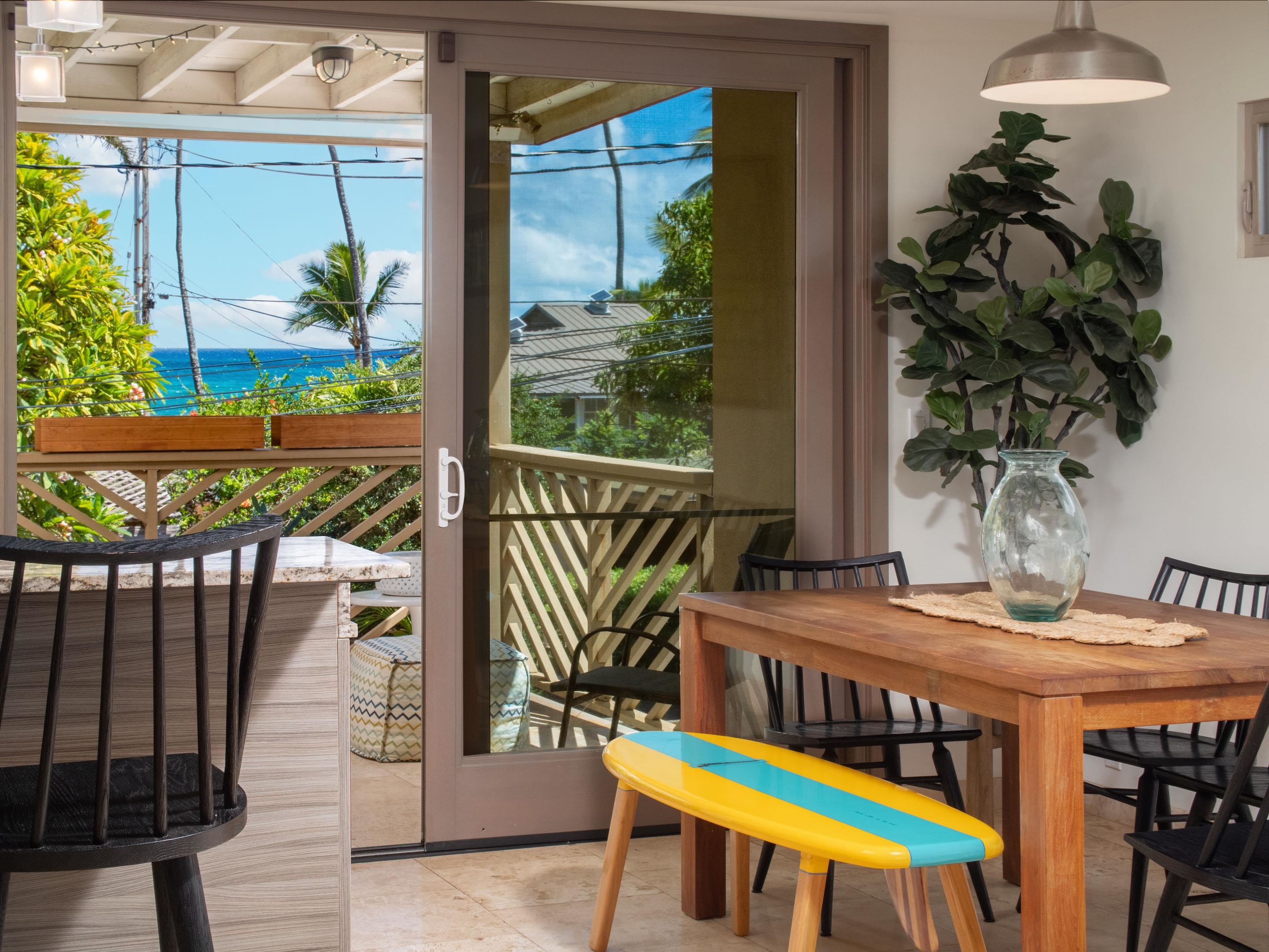 Spacious, Elegant Home & Cottage on a Culdesac in an Upscale Haiku Neighborhood. Discover this 2 story, 3-bedroom, 3 bath, executive style home in a prime location offering indoor-outdoor living with sweeping ocean & treetop views in the fresh island breeze. Spanning 2,194 sq. ft. of living space, plus an additional 584 sq. ft. of covered lanai, this two-story home is designed for both comfort & style. 9-foot ceilings & crown molding throughout give the home a distinguished, uplifting feel. Upstairs you'll find the primary bedroom with ensuite bath, walk-in closet, private entrance, guest bed & bath (all baths travertine); a well-appointed kitchen with solid cherry cabinets, green river rock granite counters, Stainless appliances & cherry wood floors flowing seamlessly into the Great room which opens onto the spacious lanai with expansive views. Downstairs features a third bedroom, walk-in closet, bath, additional family room with wet bar (perfect for entertaining or multi-generational living), a "finished" 2-car garage, plus 1-car garage/shop/studio with sliding doors to private patio. Located in "Rainbow alley," Close to Everything: beaches, restaurants, stores, main byways. Well maintained. All conforming. Sellers doing 1031 EXCH. Listing agent is co-trustee of selling trust. The separate 600 sq.ft. Ohana with fresh paint, is a 2/1 cottage featuring 9-foot ceilings, Chef's kitchen, granite counters, solid wood cabinets, gas stove, tile floors & updated bathroom. The attached carport has washer/dryer/sink, ample storage cabinets, 2 storage rooms. A fenced yard provides a private outdoor area for lounging & pet. (Cottage appliances are updated since the photos.) Vinyl siding on all structures gives a "clean" appearance while providing for easy & low cost maintenance in lush Haiku. Colorful landscaping reminds us of paradise. An outdoor shower nestled among apple-banana trees provides for the full island living experience. When you want a lot of house without the big expense of property maintenance in lush Haiku, but still have the feeling of privacy & fresh tropical breezes, look no further. Seize this rare opportunity to own two well-built, well maintained, all-conforming, R-3 zoned homes on Maui's beautiful North Shore. Make an offer! For inquiries or to schedule a showing, contact your favorite realtor.