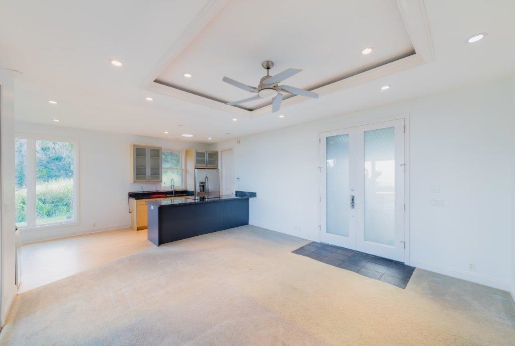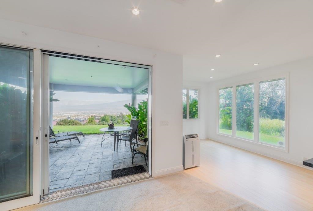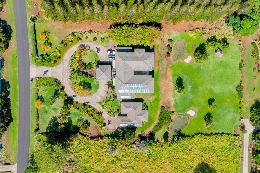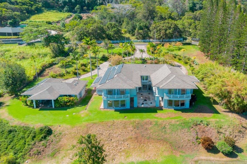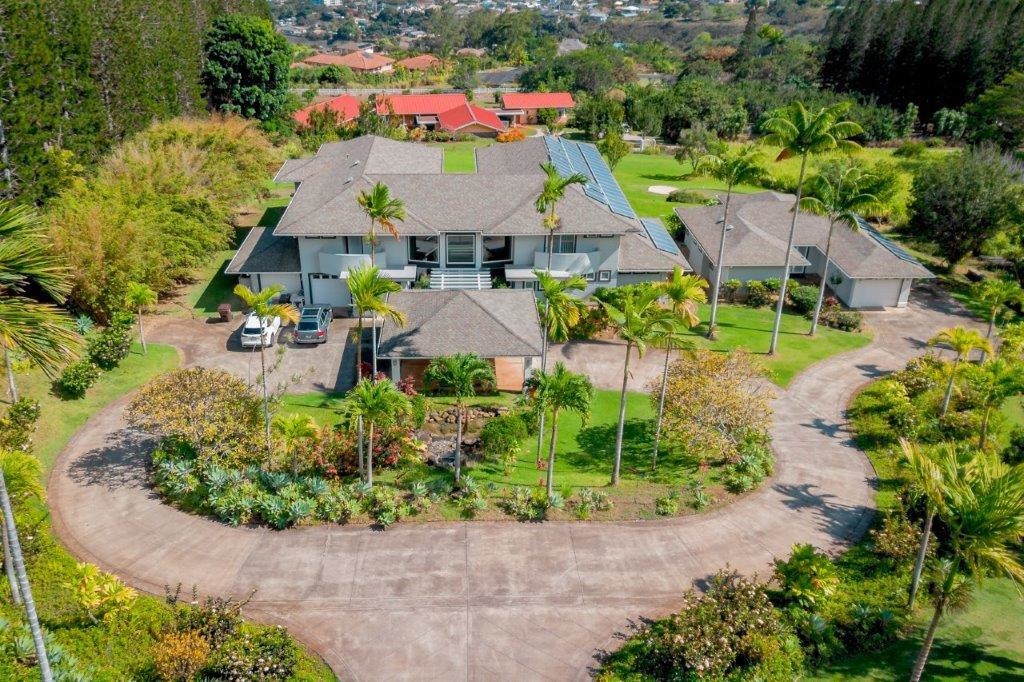 Delight in living the Maui lifestyle! This estate home in the fabulous Wailuku countryside in Wailuku Country Estates is 10 minutes from town but feels like you are way out in the country. The large 2 acre lot allows for a glorious feeling of space with room to work on your golf game with a couple of putting greens to hone your skills. The right side of the house is dedicated to home fitness with a half court basketball court leading into an above ground pool room with a jetted pool to swim against the current to keep you fit. All of this is accessed through a lovely Porte Cochere entry to a spacious entry area with stairs leading up on both sides of the room to the office/landing at the top of the stairs. With a bird's eye view of the surrounding mountains down to the ocean, it is a great spot to work from home. The right side of the upstairs has three bedrooms with private baths and a large laundry area. The left side of the upstairs area is the main suite with a luxurious bedroom area, large dressing room/closet and drawer system and a spa bath that is perfect for keeping you looking your best! Head downstairs via the private stairs to the kitchen, eating area and family entertainment area. The core of the house is the kitchen which is centered around the cooking area so the cook is engaged in the conversation with the family. There is a 3 bay garage to store your vehicles and hobby items and a charging station to keep your electric vehicles going via solar panels which keep your electric bill low. Next door is a delightful cottage with 2 bedrooms and 2 baths for your guests or extended family to enjoy. This home is very large and comfortable. Call your agent today for a private showing.
