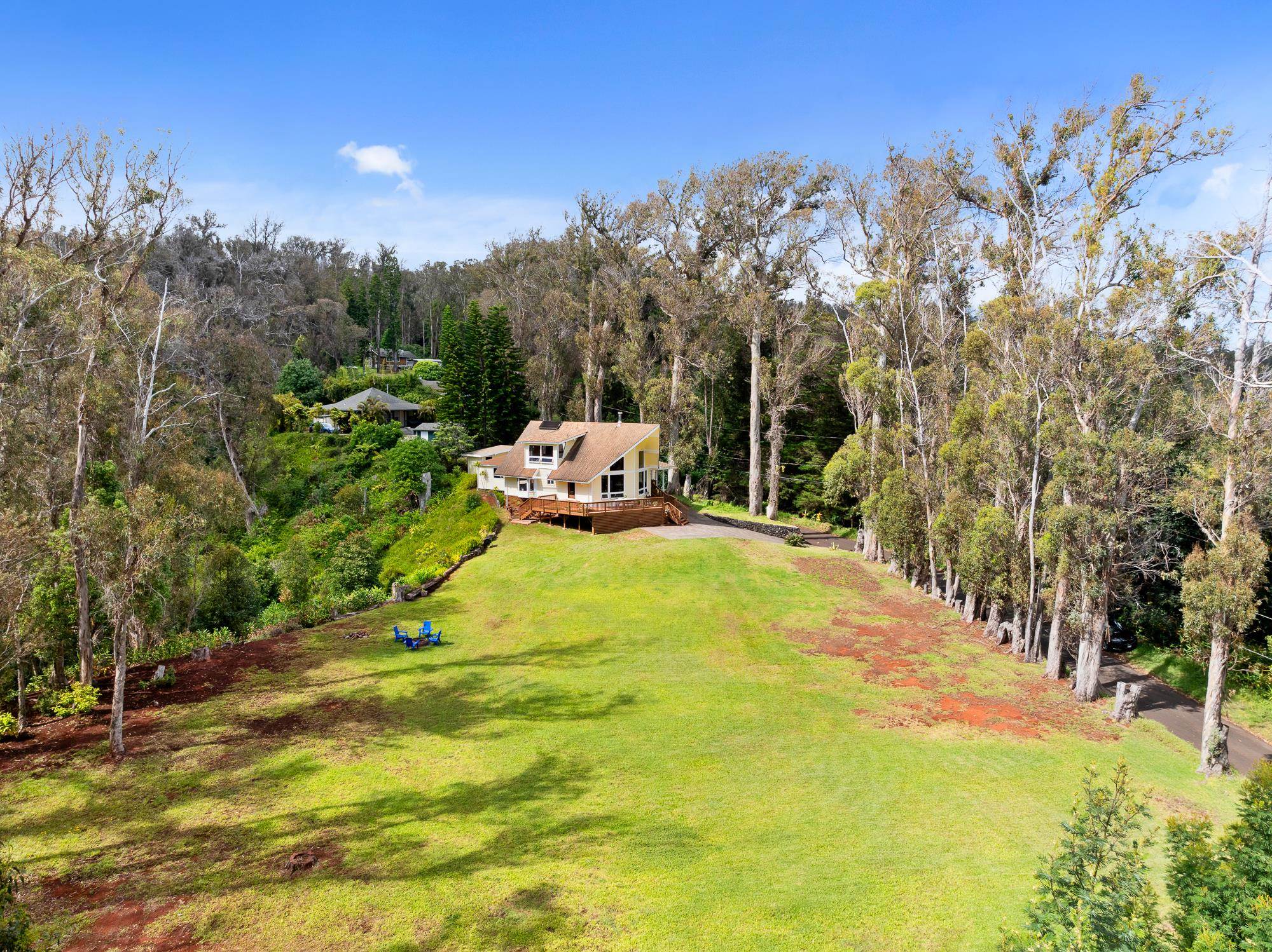 Welcome to 1733 Pi‘iholo Road, a unique Upcountry Maui property offering charm, flexibility, and natural beauty. This rare opportunity includes two separate TMKs totaling 1.14 acres, a well-built Lindal Cedar 3 bedroom 2 bath home on 0.2 acres, and an adjoining 0.94 acre agricultural lot, currently 11th on the County water meter list. Both parcels are being sold together, providing a future owner with space and potential for growth, creative use, or additional development. Perched at approximately 3,000 feet elevation, the home enjoys cooler temperatures and fresh mountain air. Inside, vaulted ceilings and oversized windows fill the home with natural light and frame views of the surrounding trees and distant ocean. Lindal Cedar construction, new appliances (not pictured), and a wraparound deck add warmth, comfort, and a strong connection to the outdoors. The open concept layout is perfect for comfortable living and entertaining, while the expansive land offers room for gardens, fruit trees, or additional structures. The adjoining parcel enhances the property’s value, whether for extended family, agriculture, or long term investment. There is also an option for furnishings to be included in the sale, offering a convenient turnkey opportunity. Located just minutes from Makawao Town and near Makawao Forest Reserve and Waihou Springs, you will have quick access to hiking, biking, and riding trails while still enjoying the peace and privacy of Upcountry living. This is a versatile and inviting property, ideal for investors or multi generational families looking to create a legacy in one of Maui’s most desirable regions.