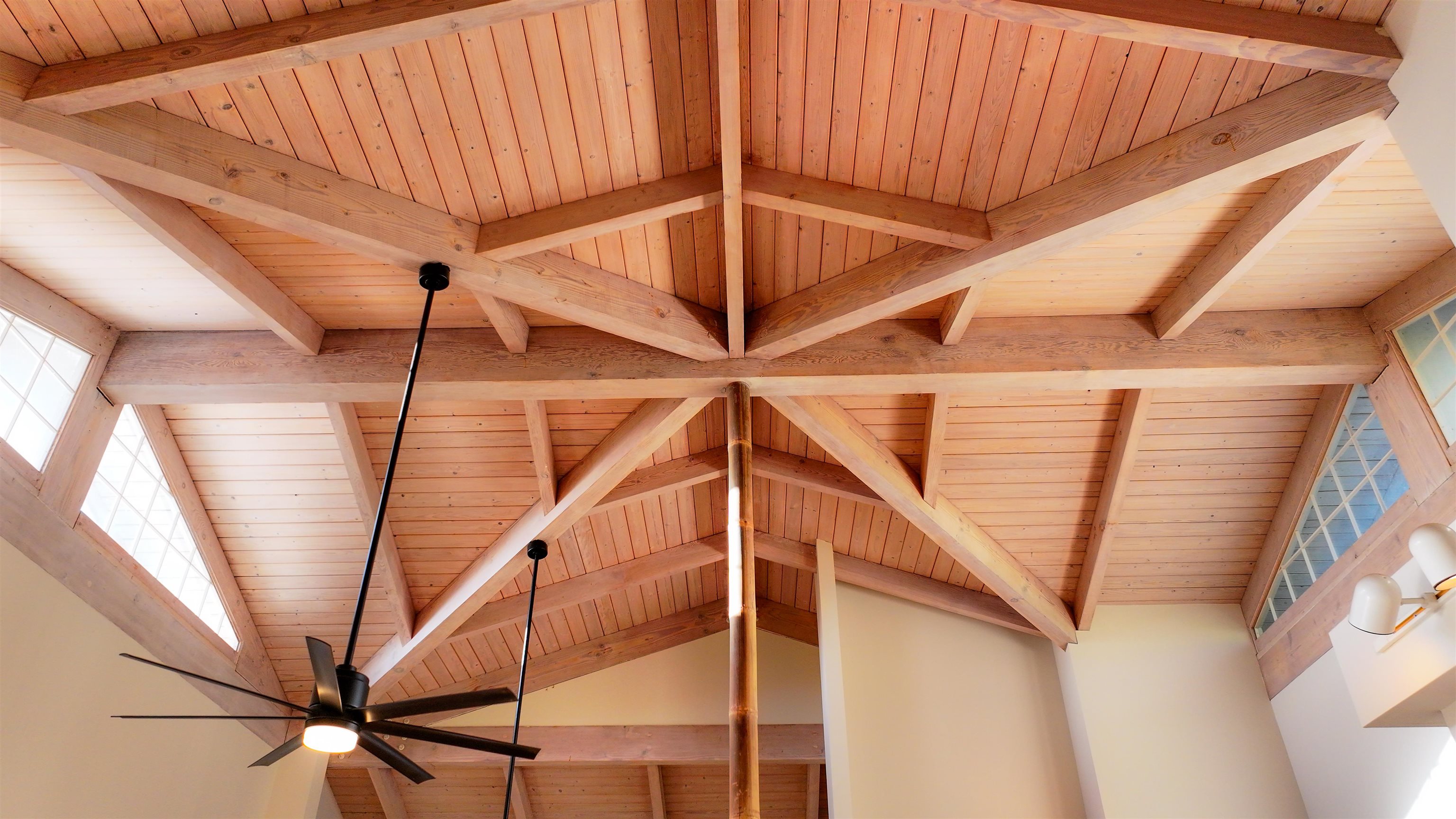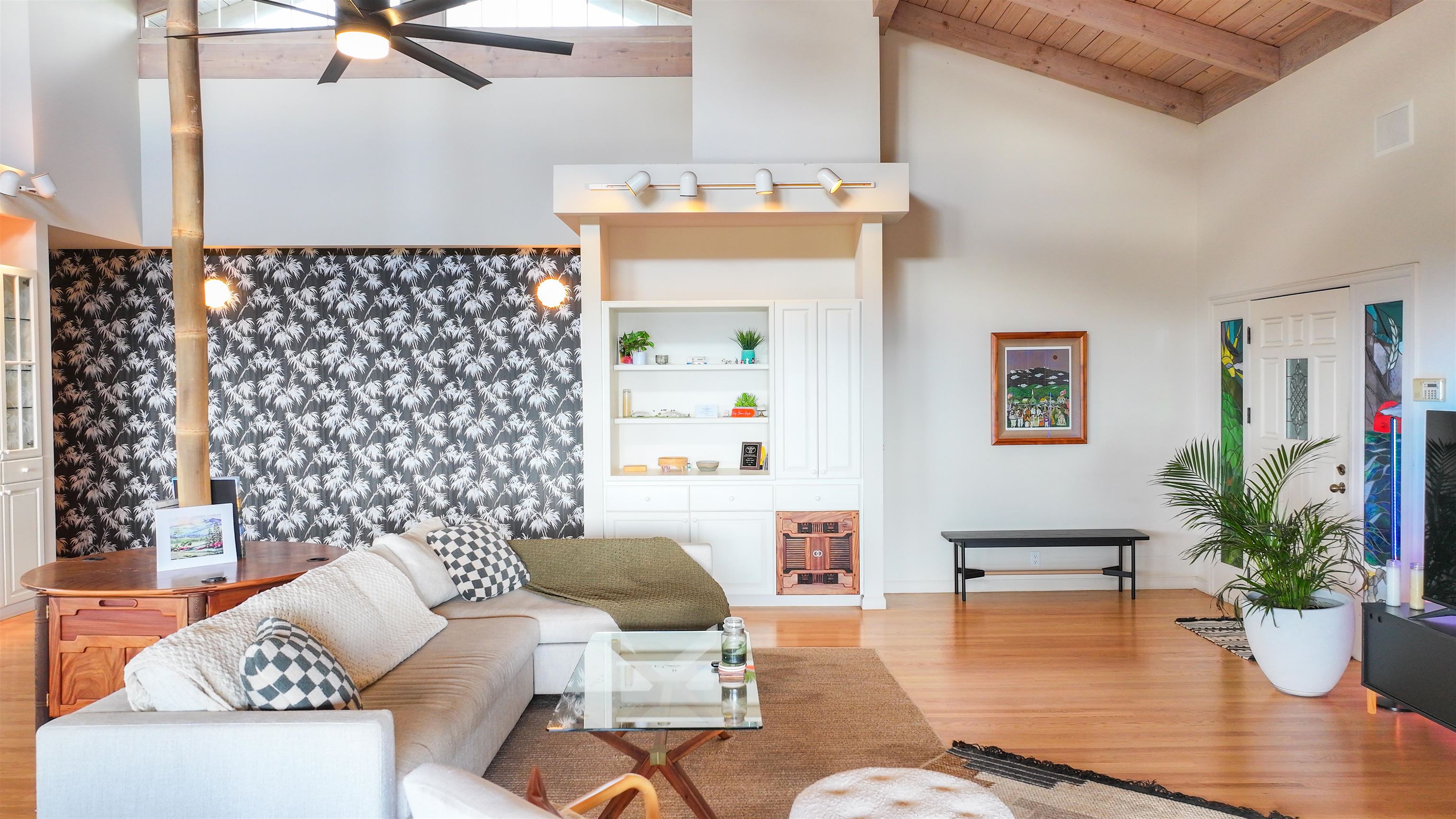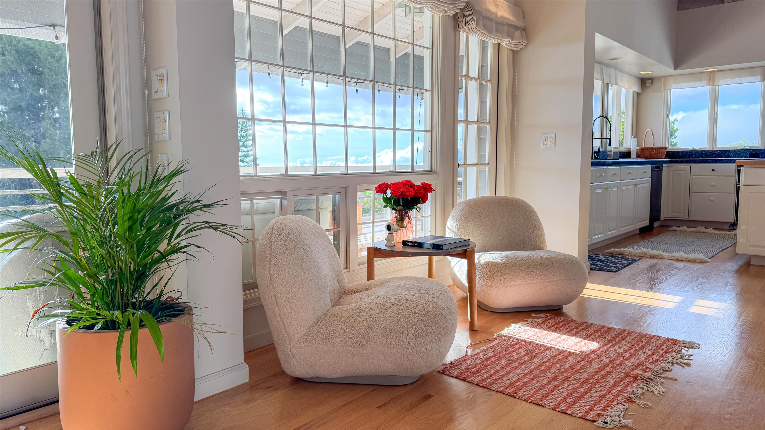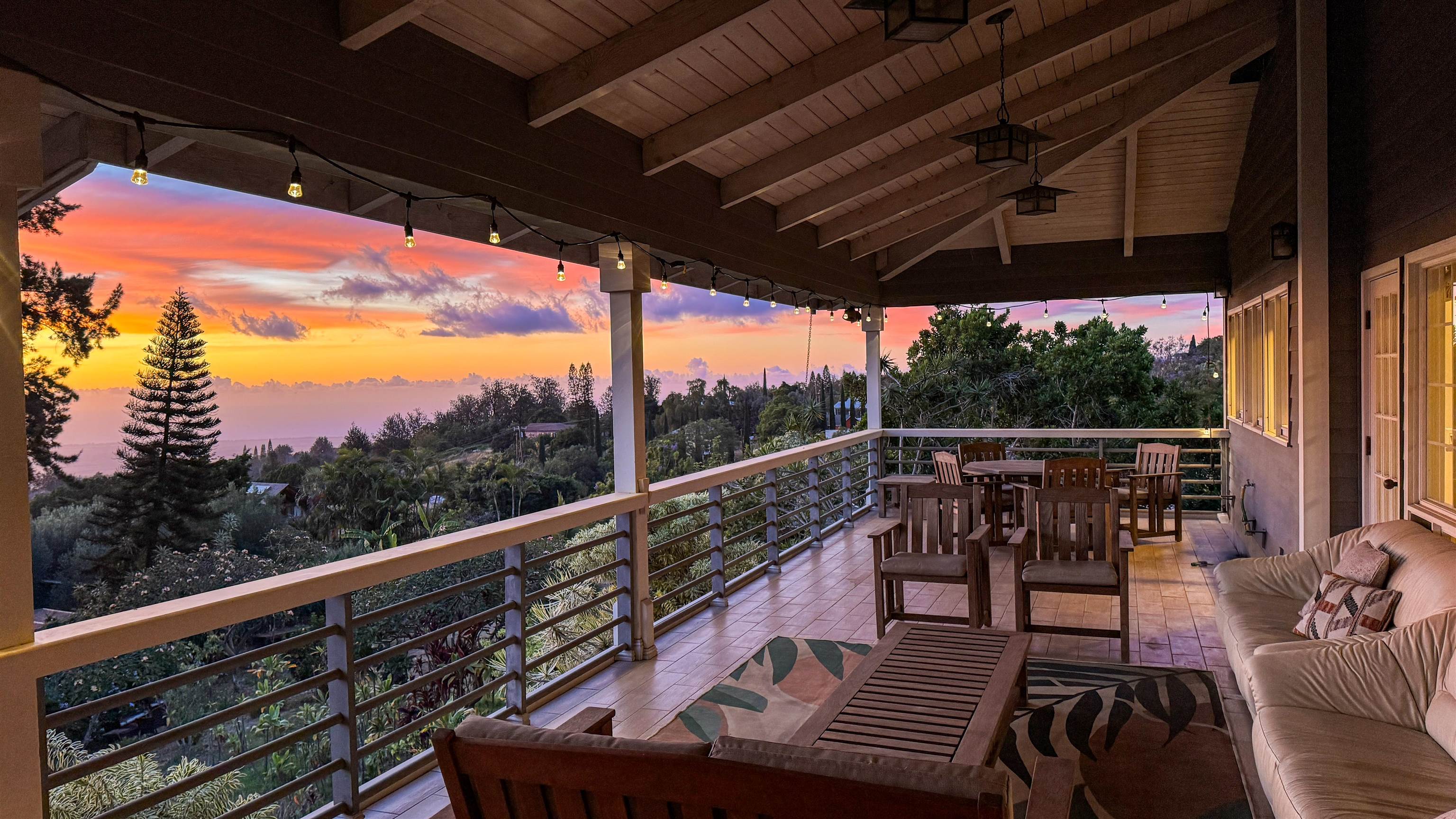 This Kula home captures the essence of upcountry living with spectacular bi-coastal ocean views and refreshing mountain breezes. The dramatic vaulted open beam ceiling, soaring 20 feet high, evokes a sense of grandeur and openness. The open concept design seamlessly blends with almost 1,000 square feet of covered lanai, providing an effortless indoor-outdoor living experience, thoughtfully oriented to capture the setting sun. On cooler evenings, the living room's standalone wood-burning fireplace adds a cozy ambiance. The well-maintained custom home boasts refinished hardwood floors and a new roof installed in 2022 with Interlock’s metal slate shingles. A full 2 bed / 2 bath ohana unit below is ideal for extended family and guests or generating rental income. The spacious kitchen features granite countertops, a butcher block island, custom cabinetry, and a pantry. The primary bedroom with a generous walk in closet offers privacy as the two additional bedrooms are in the other wing of the home. Both bathrooms are adorned in marble tile. The home, elevated on post and pier foundations, includes a carport with ample storage and parking for five to six vehicles. The terraced half-acre property, with dry stack rock walls, is beautifully landscaped with mature plants and mango trees. Situated at 2,600 feet elevation in the heart of Kula, this home combines rural tranquility with convenience, being close to schools like Haleakala Waldorf, Carden Academy, Kula Elementary, and King Kekaulike High. The listing agent is the property owner and holds an active Hawaii real estate license.