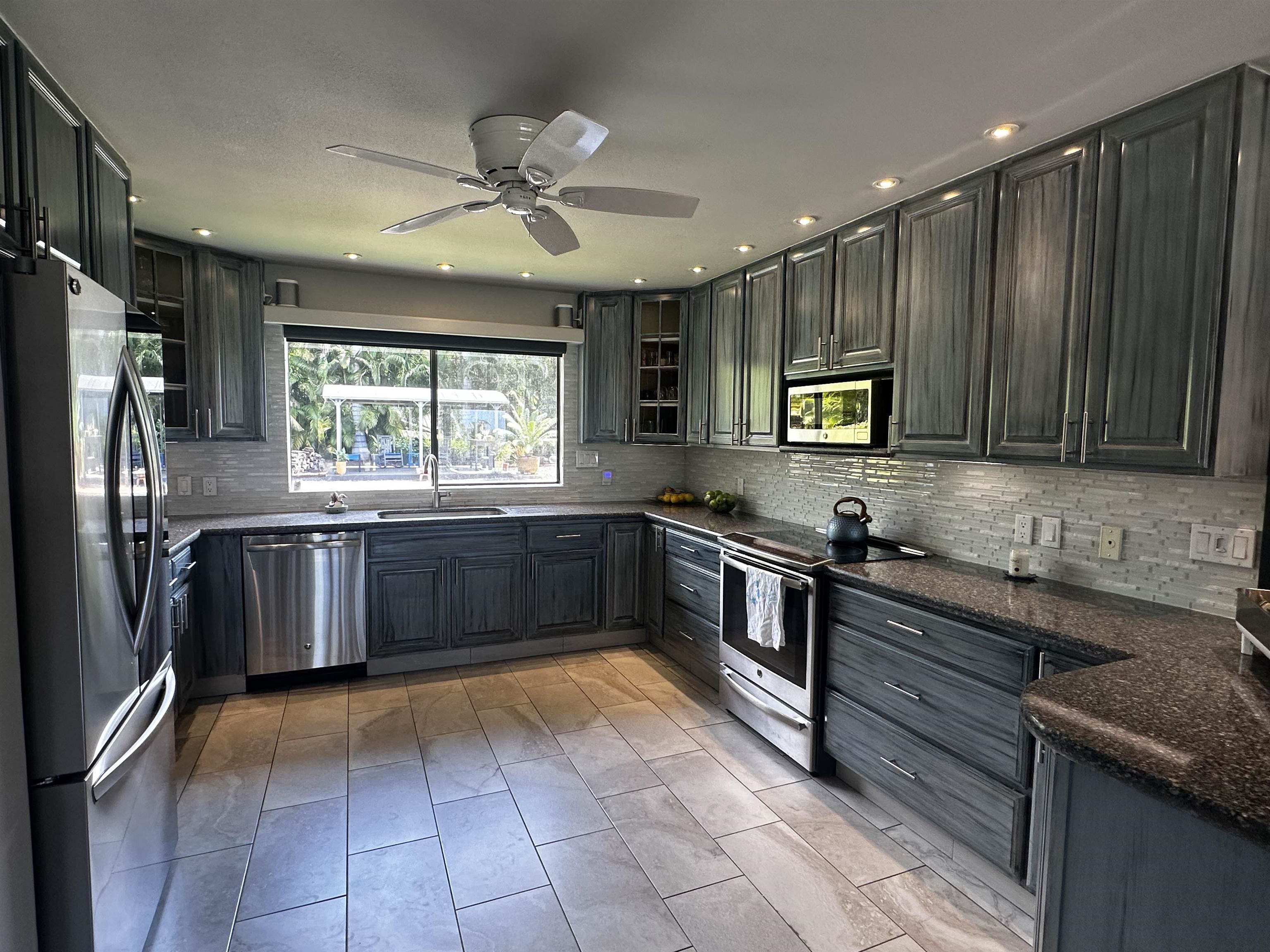 UNIQUE single-level home on well-landscaped, 1/2 acre lot. Expansive front yard with nice ocean and mountain views. Private backyard with large, tiled pool. Well-planned improvements: new rock walls at front and sides, cesspool to septic conversion, upgraded A/C, upgraded electric, 52 solar panels with net metering, new roof and more. Separate 2 car garage with full bath and guest room. Additional parking in 3 stall carport. Make sure and see this homeāit is fantastic as is, but if expansion is on your mind, this is an ideal opportunity! Seller is a licensed Realtor in Hawaii.