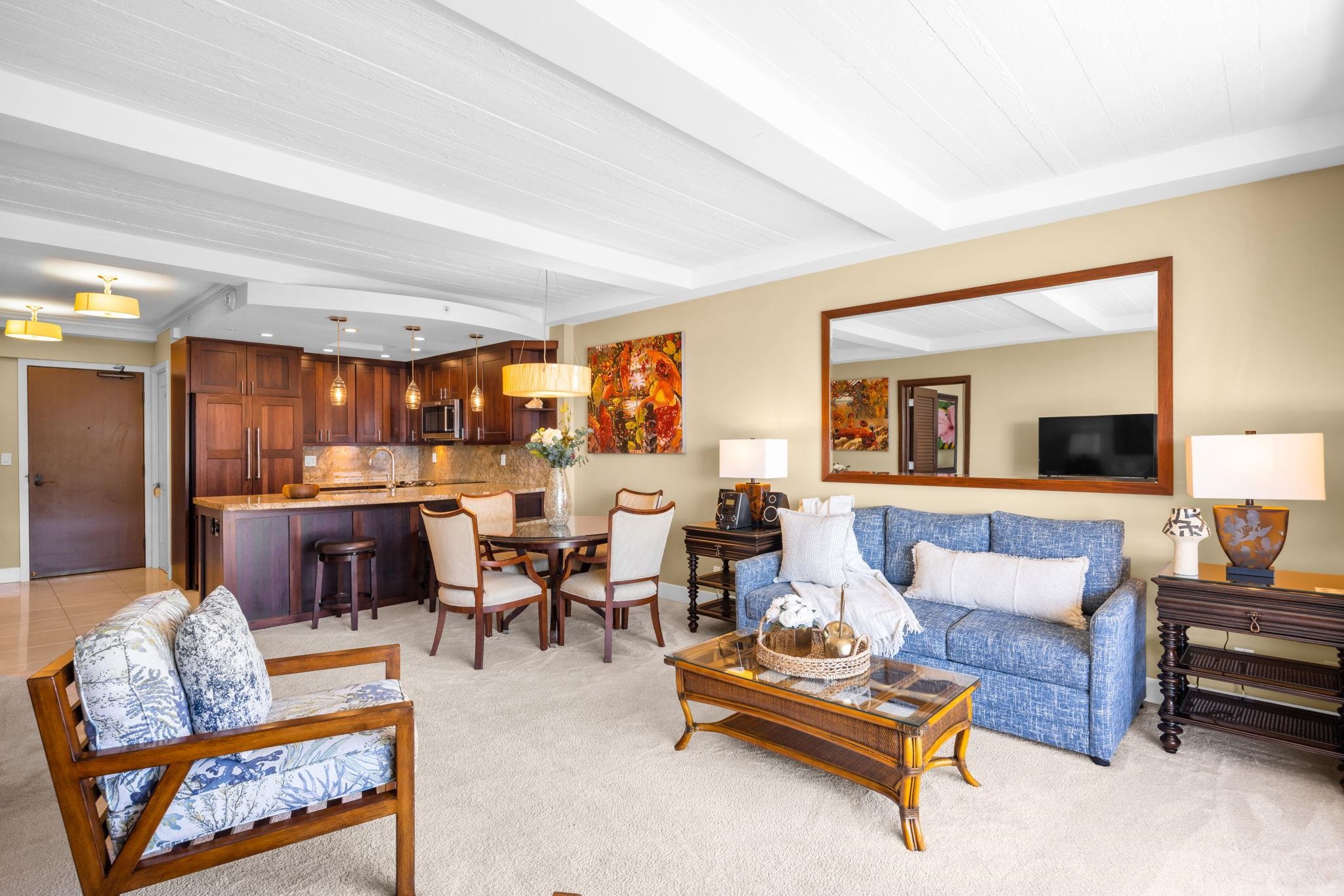 MAJOR PRICE IMPROVEMENT! WHO needs a Fifth Avenue Penthouse when you can have this "rare" gem on world famous Kaanapali Beach! E KOMO MAI and Welcome to The Whaler, the ultimate address on the golden sands of Maui's westside shores! Here you will find the lifestyle you deserve where luxury, glorious sunsets (and whale watching in season), and legacy converge in the heart of Maui’s most iconic beachfront resort. This rare offering presents an exceptional opportunity to own a spacious, tastefully furnished, turnkey residence just one stack behind the direct oceanfront units which are generally priced hundreds of thousands more! Enjoy the oversized lanai area where you can immerse yourself in sweeping island, mountain and majestic ocean views! At sunset, the resort turns into a magical paradise with tiki torches, boats sailing into the horizon, and twinkling lights in the foothills create memories to last a lifetime! This 9th floor high-rise 1bd/2ba condo residence delivers the ultimate island experience and updated throughout with high-end custom finishes, central A/C, and no stairs from the underground parking to the unit! The HOTEL ZONED district permits legal use as Airbnb-ready, allowing for lucrative short-term rentals while you’re away, truly a bonus for those seeking that option. Step outside to the famed Kaanapali Beach Walk, a vibrant oceanfront promenade lined with luxury spa resort hotels, high -end shops, plethora of dining options, and entertainment at Whaler's Shopping Village. The Whaler’s resort amenities include a beachfront pool and jacuzzi, fitness center, tennis/pickleball courts, sauna, hotel style concierge services, and lush tropical grounds — all just steps from the surf. Whether you're seeking a high-performing investment, a vacation retreat, or a legacy property to pass down for generations, this residence offers unmatched value and luxury. Don’t miss your chance to own in one of Maui’s most prestigious high-rise communities — where every day feels like a five-star escape. Call today for your private showing of this exclusive unit at the Whalers! Click on Video tour to experience the Whaler Lifestyle!