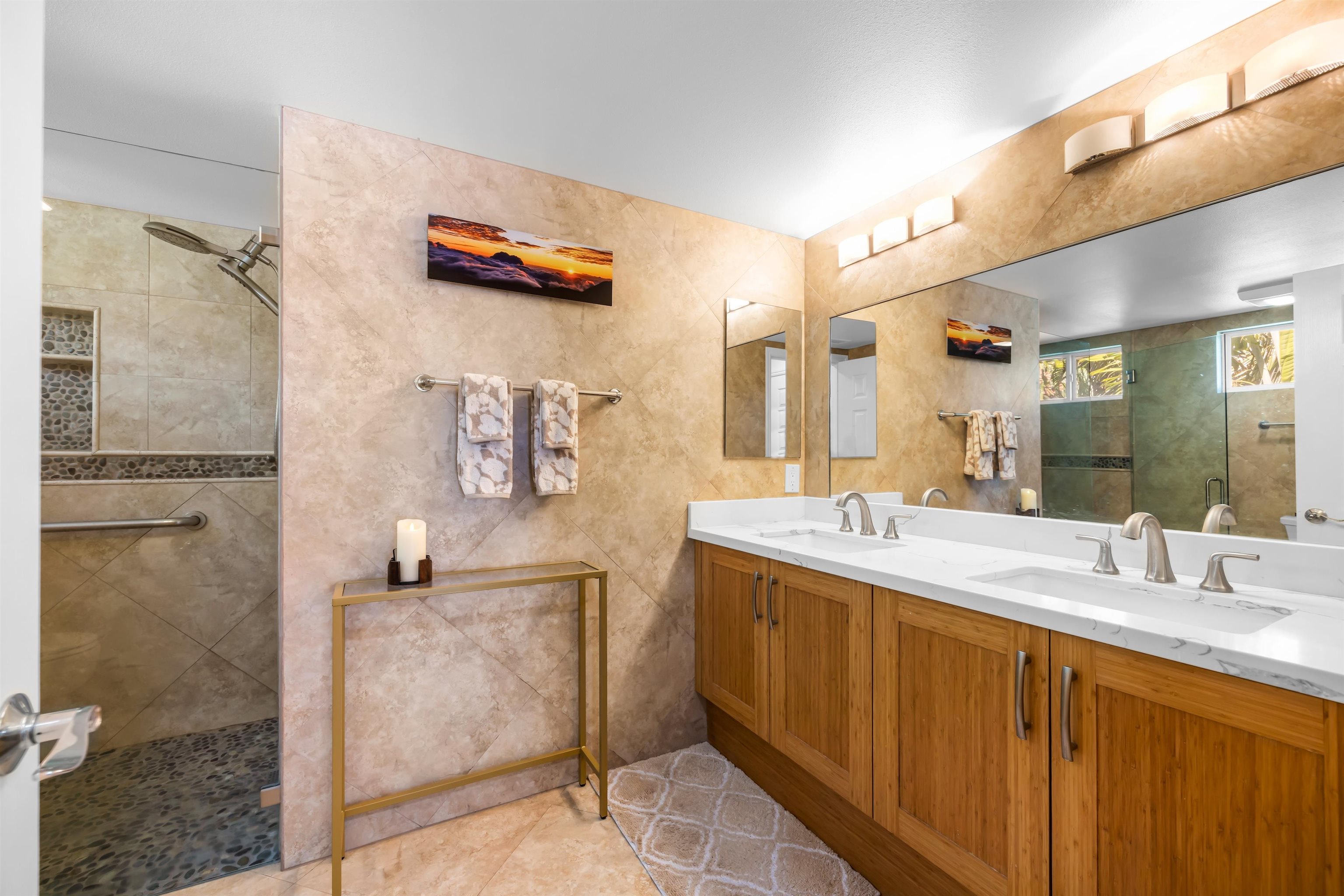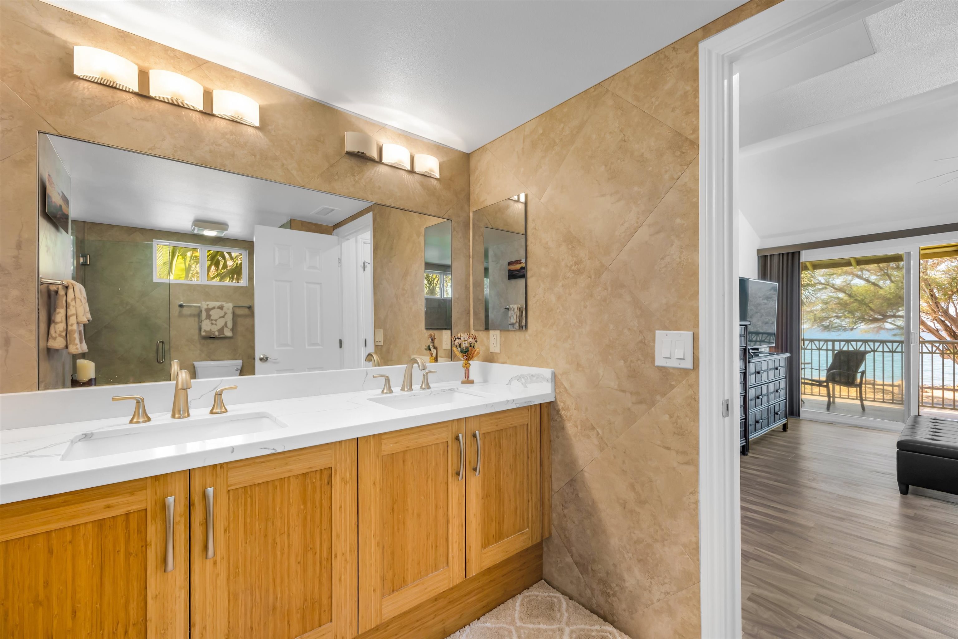 Rare, almost oceanfront Kai Makani 46-203 - fully remodeled 2BR/2BA with modern kitchen, custom cabinetry, stone counters, upgraded appliances, luxury vinyl flooring, and beautifully updated baths. Central A/C throughout. Highly desired building with cooling ocean breezes and direct beach access - stairs off the lanai lead straight to a gorgeous sandy shoreline. Kai Makani offers a resort lifestyle with a pool, hot tub, fitness center, and your own personal storage room. Exceptional location and move-in ready.
