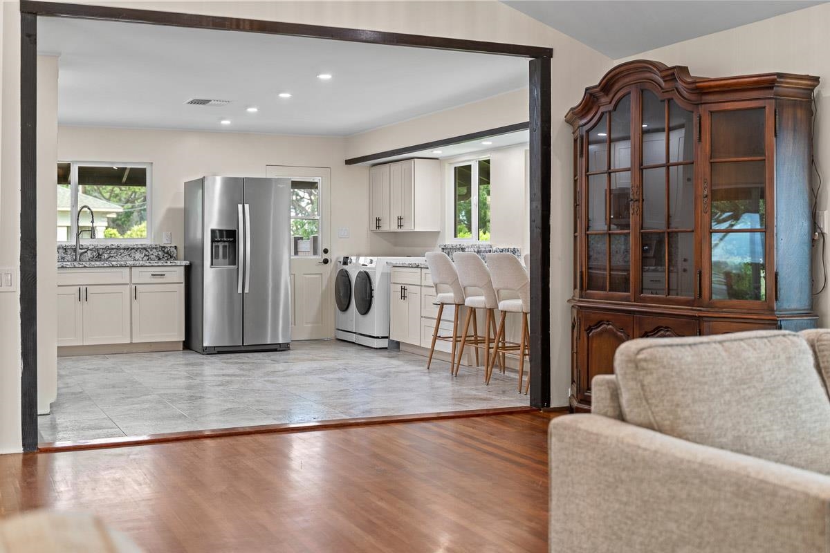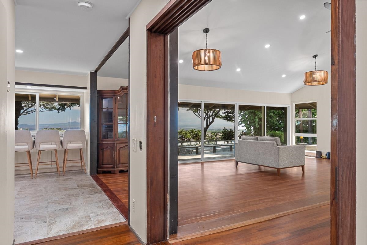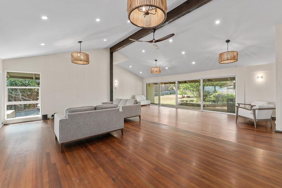 Experience island living at its finest with this beautifully renovated home located at 549 Honoapiilani Hwy in the vibrant heart of Wailuku, Maui. This charming 2-bedroom, 1.5-bathroom residence is designed for modern comfort and style. Enjoy the benefits of brand-new, energy-efficient windows, a durable new roof, and elegant Ohia wood flooring throughout. The home features updated plumbing and electrical systems, contemporary lighting, and sleek kitchen and bathroom cabinetry, all complemented by fresh interior and exterior paint. The spacious yard is a canvas for your imagination, offering potential for expansion or the creation of additional dwellings. An exclusive koi pond adds a serene and unique touch to the landscaping, providing a peaceful retreat in your own backyard. Centrally located, this property offers easy access to all of Maui's attractions, while maintaining a secluded and tranquil atmosphere. Embrace the opportunity to own this charming, beautifully updated home and experience the best of island living in Wailuku! Schedule your appointment for a showing today! Some of the photos are virtually staged. (Seller is related to Listing Agent)