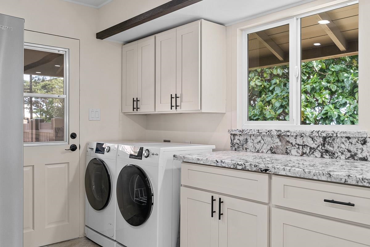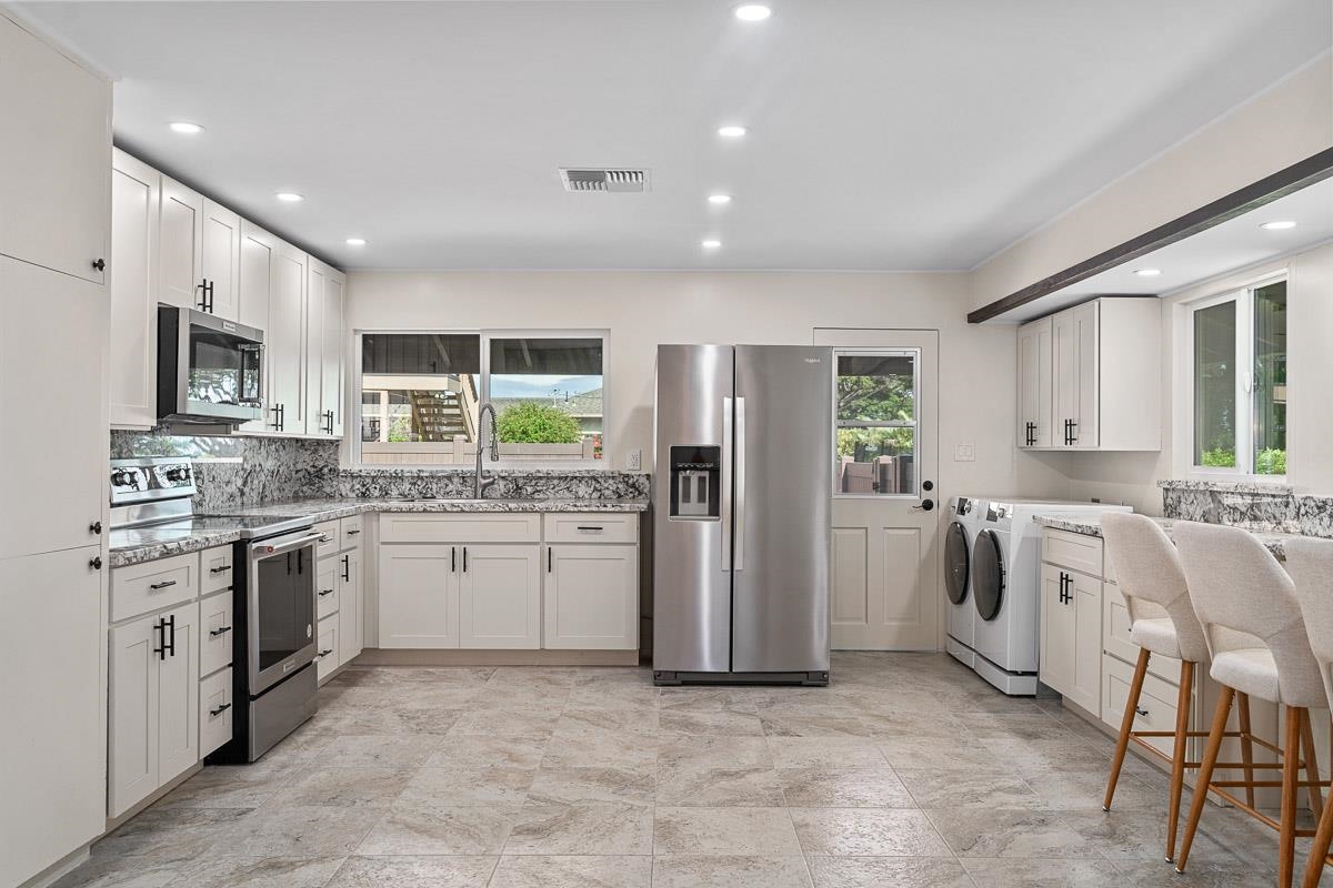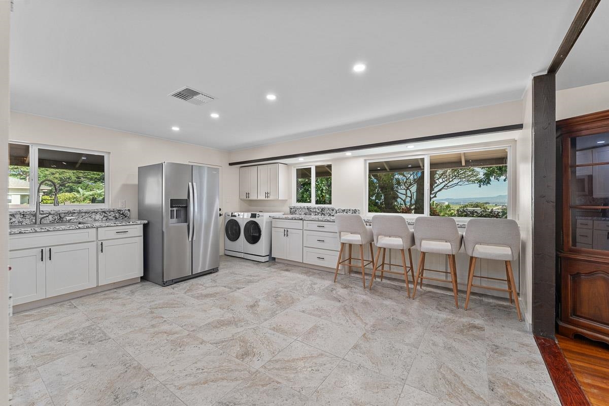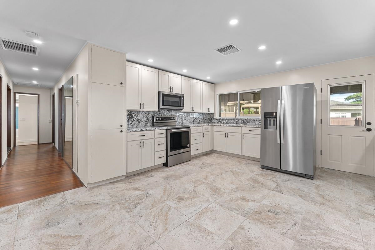 Experience island living at its finest with this beautifully renovated home located at 549 Honoapiilani Hwy in the vibrant heart of Wailuku, Maui. This charming 2-bedroom, 1.5-bathroom residence is designed for modern comfort and style. Enjoy the benefits of brand-new, energy-efficient windows, a durable new roof, and elegant Ohia wood flooring throughout. The home features updated plumbing and electrical systems, contemporary lighting, and sleek kitchen and bathroom cabinetry, all complemented by fresh interior and exterior paint. The spacious yard is a canvas for your imagination, offering potential for expansion or the creation of additional dwellings. An exclusive koi pond adds a serene and unique touch to the landscaping, providing a peaceful retreat in your own backyard. Centrally located, this property offers easy access to all of Maui's attractions, while maintaining a secluded and tranquil atmosphere. Embrace the opportunity to own this charming, beautifully updated home and experience the best of island living in Wailuku! Schedule your appointment for a showing today! Some of the photos are virtually staged. (Seller is related to Listing Agent)