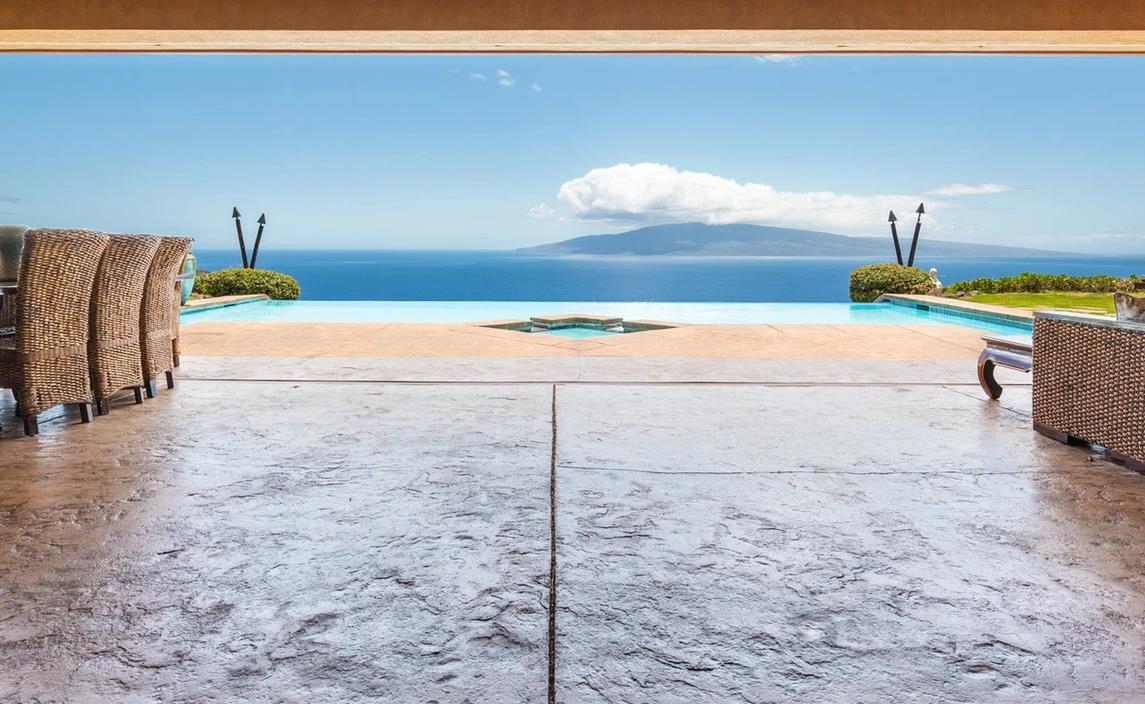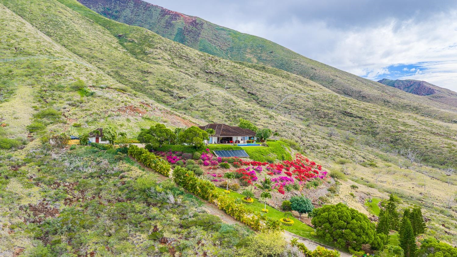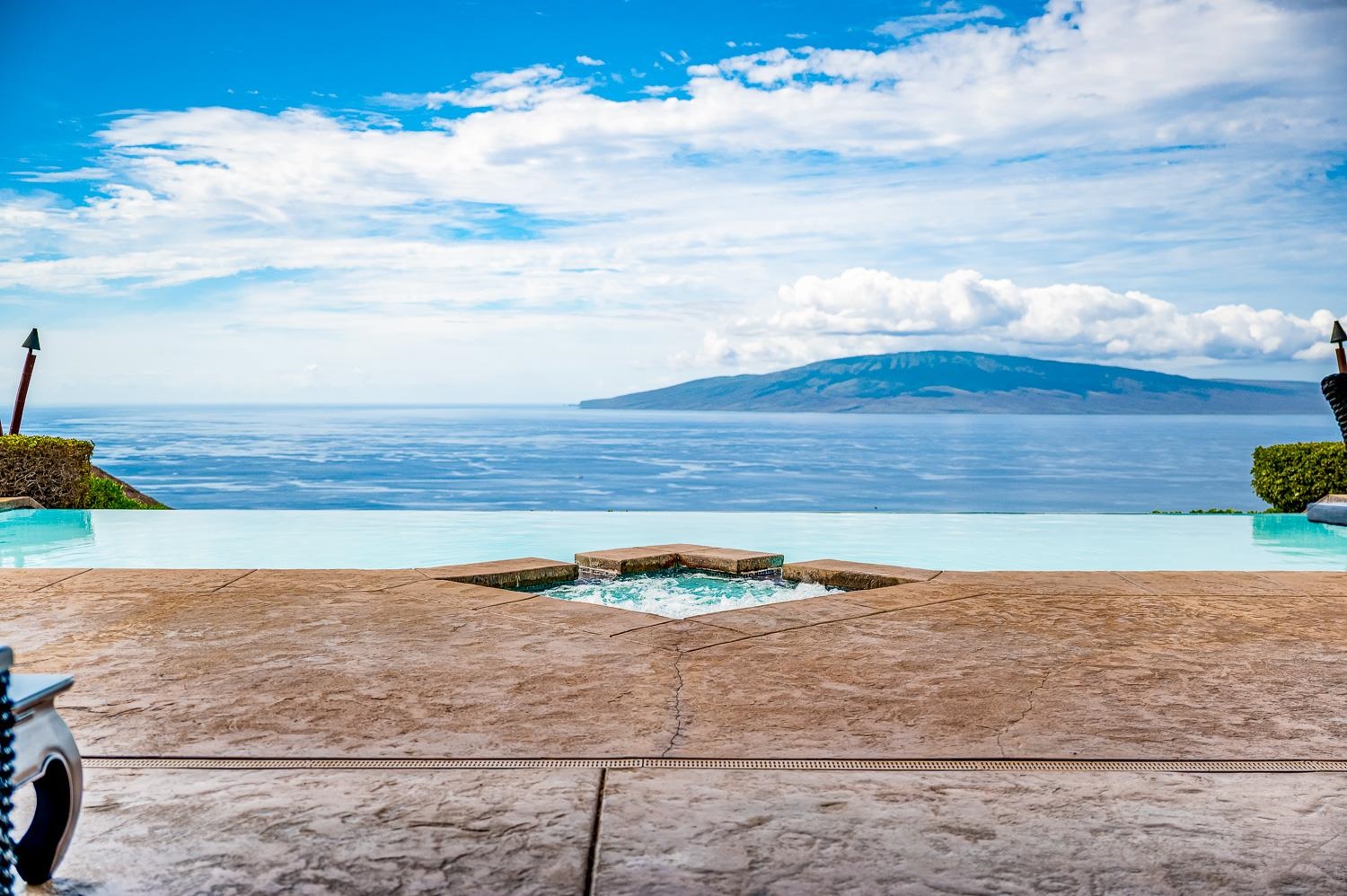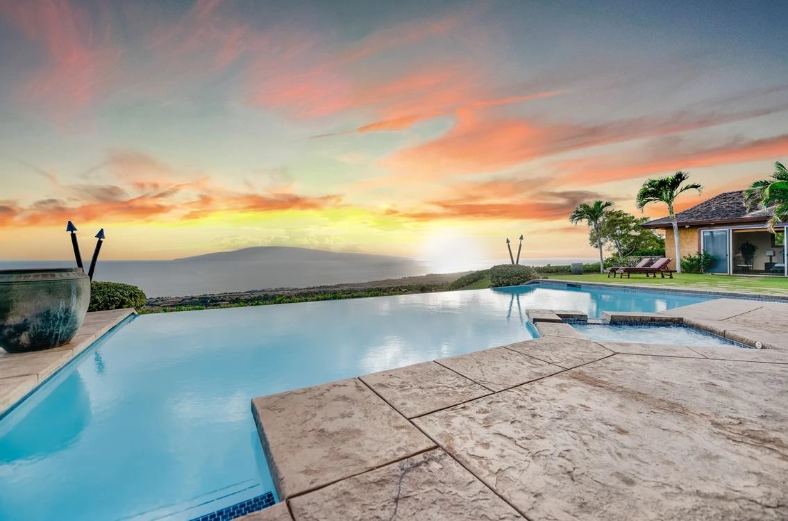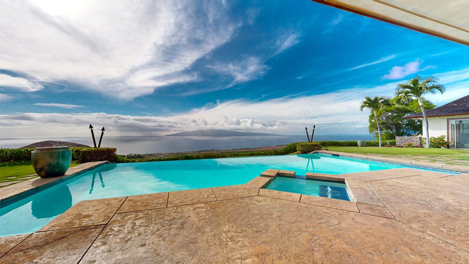 Perched at the top of tranquil Launiupoko, 81 Iliahi remains a landmark residence, now refreshed with thoughtful updates that elevate its already captivating design. The exterior has been newly painted, including the fascia, trim, and exterior doors. Inside, carpeting in the guest bedrooms and bonus room has been replaced with new laminate flooring, and all sliding-door glass has also been replaced. At nearly 1,000 feet above sea level, the home enjoys its own gentle microclimate and unobstructed 180-degree views of the Pacific, with Lanai and Molokai stretching across the horizon. The architecture continues to blend Balinese inspiration with luxurious functionality, expressed through four spacious bedrooms, a large dedicated office, and five beautifully finished bathrooms, each enriched with African Mahogany, Monkeypod, Venetian Plaster, and premium fixtures. The Great Room remains one of the home’s most unforgettable features. Folding pocket doors, with new glass, open wide to the covered lanai, creating a sweeping indoor–outdoor living experience and framing the panorama of the island of Lanai floating in the distance. The kitchen is equipped with top-tier appliances, custom wood cabinetry, and a large bay window positioned to capture the dramatic vista. A substantial center island offers both workspace and a relaxed gathering spot. Two serene Primary Bedroom Suites enjoy direct lanai access, spa-like baths with soaking tubs, and generous walk-in closets, while two additional Guest Suites provide comfort and privacy for family or visitors. Outdoors, the heated infinity pool remains a showpiece, warmed by an efficient solar system and set to overlook the rolling acreage below. Nearby, a separate, furnished guest house/ohana with a discreet outdoor shower offers an inviting retreat. The property is further supported by three 5,000-gallon water tanks with an independent delivery system, ensuring consistent access to both potable and agricultural water. Secluded, expansive, and newly renewed, this 35.7-acre Residential CPR estate blends elevated island style with natural beauty. 81 Iliahi remains a standout, both figuratively and literally, offering a private Maui sanctuary ready for its next steward. Don't miss the chance to make this fabulous property your own. Note this listing is a Residential CPR.