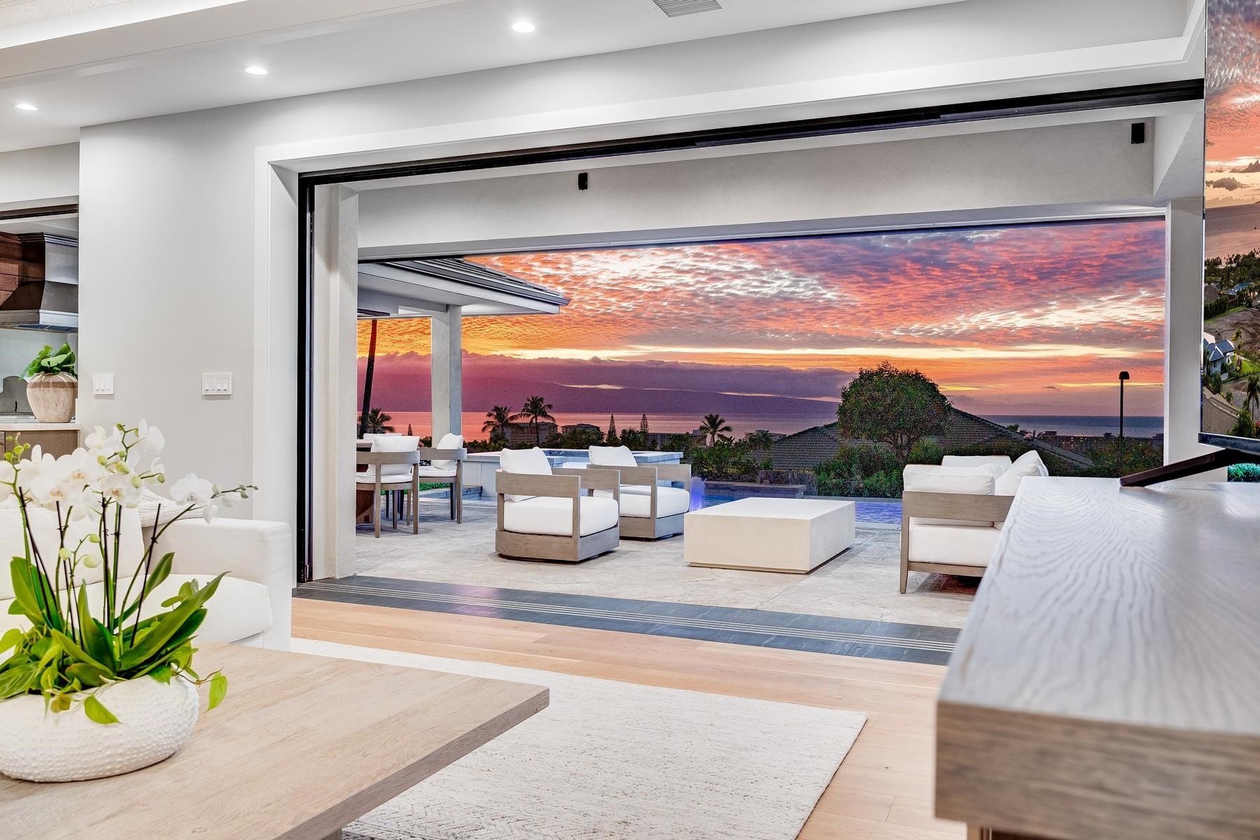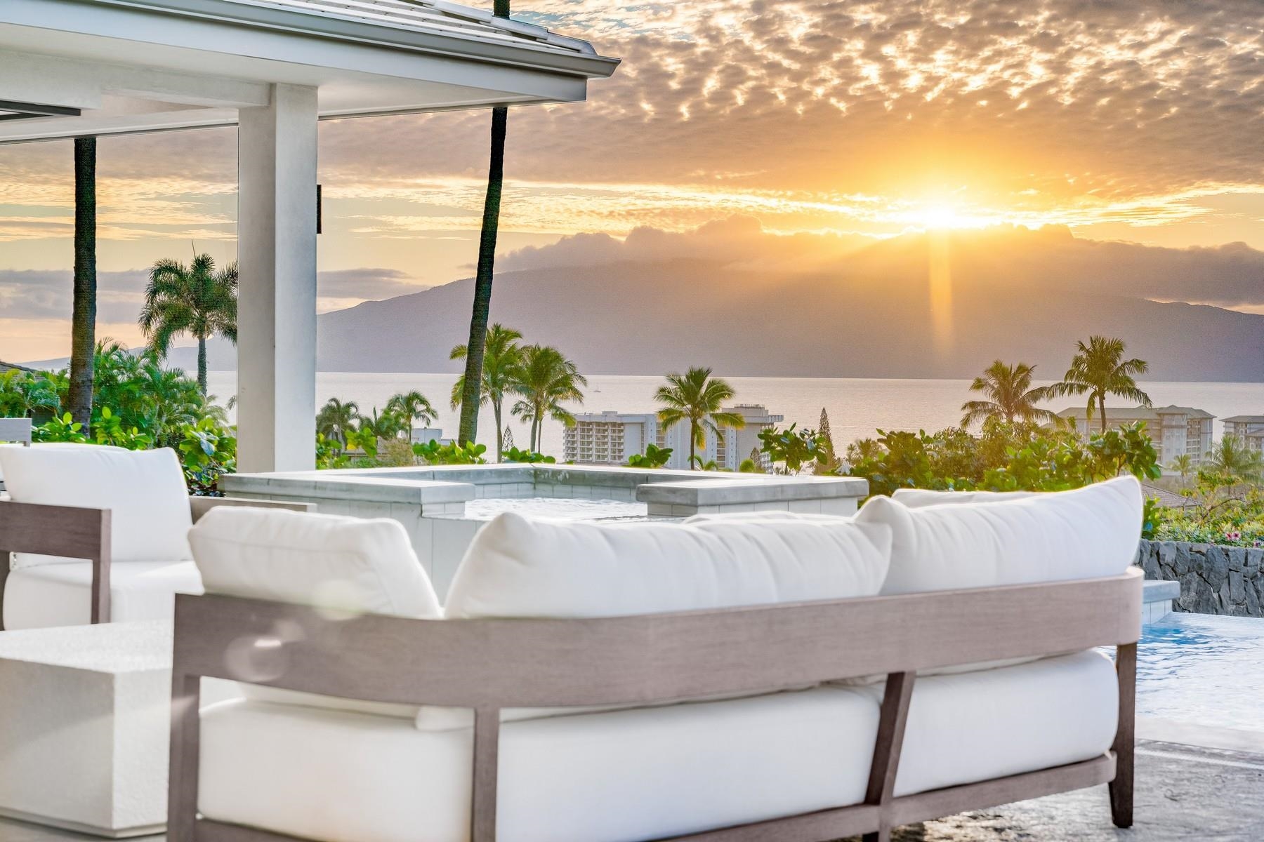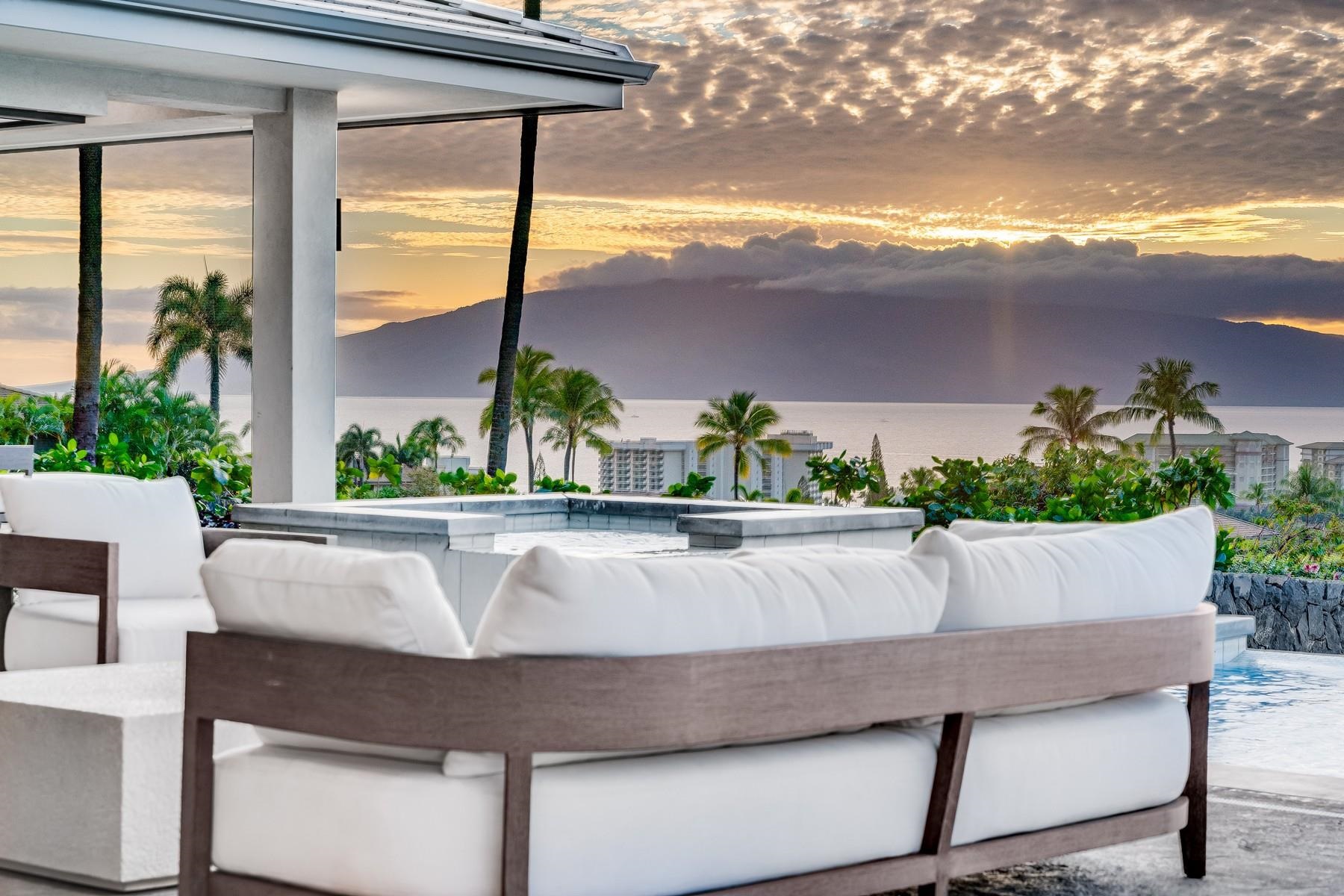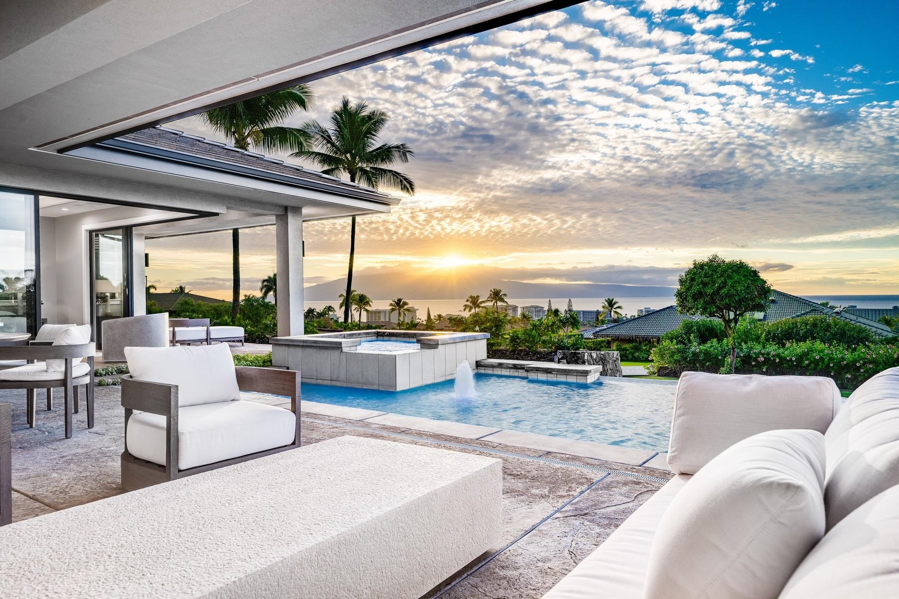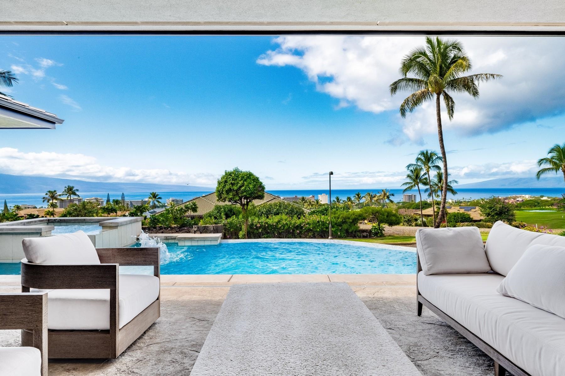 Discover elevated island living in one of Maui’s most desirable gated communities—Lanikeha at the Kaanapali Golf Estates. This exceptional single-level, newly built 4-bedroom custom residence offers refined craftsmanship, contemporary island design, and panoramic ocean views of the Pacific, Molokai, and Lanai, with breathtaking sunsets and seasonal whale watching. Designed for seamless indoor-outdoor living, the open-concept floor plan connects the living, dining, and kitchen areas, creating an ideal setting for entertaining. High-end finishes include French-cut, live-sawn wide-plank European White Oak wood floors, quartz countertops, custom cabinetry, and abundant natural light throughout. The gourmet chef’s kitchen features top-of-the-line Thermador appliances, a gas range, and a spacious quartz center island, complemented by an outdoor kitchen and BBQ area. Expansive covered lanais capture sweeping ocean and outer-island views. The home includes two luxurious primary suites, including a main retreat with a spa-inspired en-suite bath, private lanai access, and serene ocean vistas. Additional guest bedrooms offer comfort and privacy. A resort-style infinity-edge pool completes the outdoor experience, perfectly positioned to enjoy the stunning views. Lanikeha amenities include a Community Recreation Center with pool, fitness center, kitchen, and game room. Located minutes from Kaanapali Beach, championship golf courses, Whalers Village shopping and dining, luxury spas, and iconic Black Rock, this home offers an exceptional blend of luxury, comfort, and convenience.