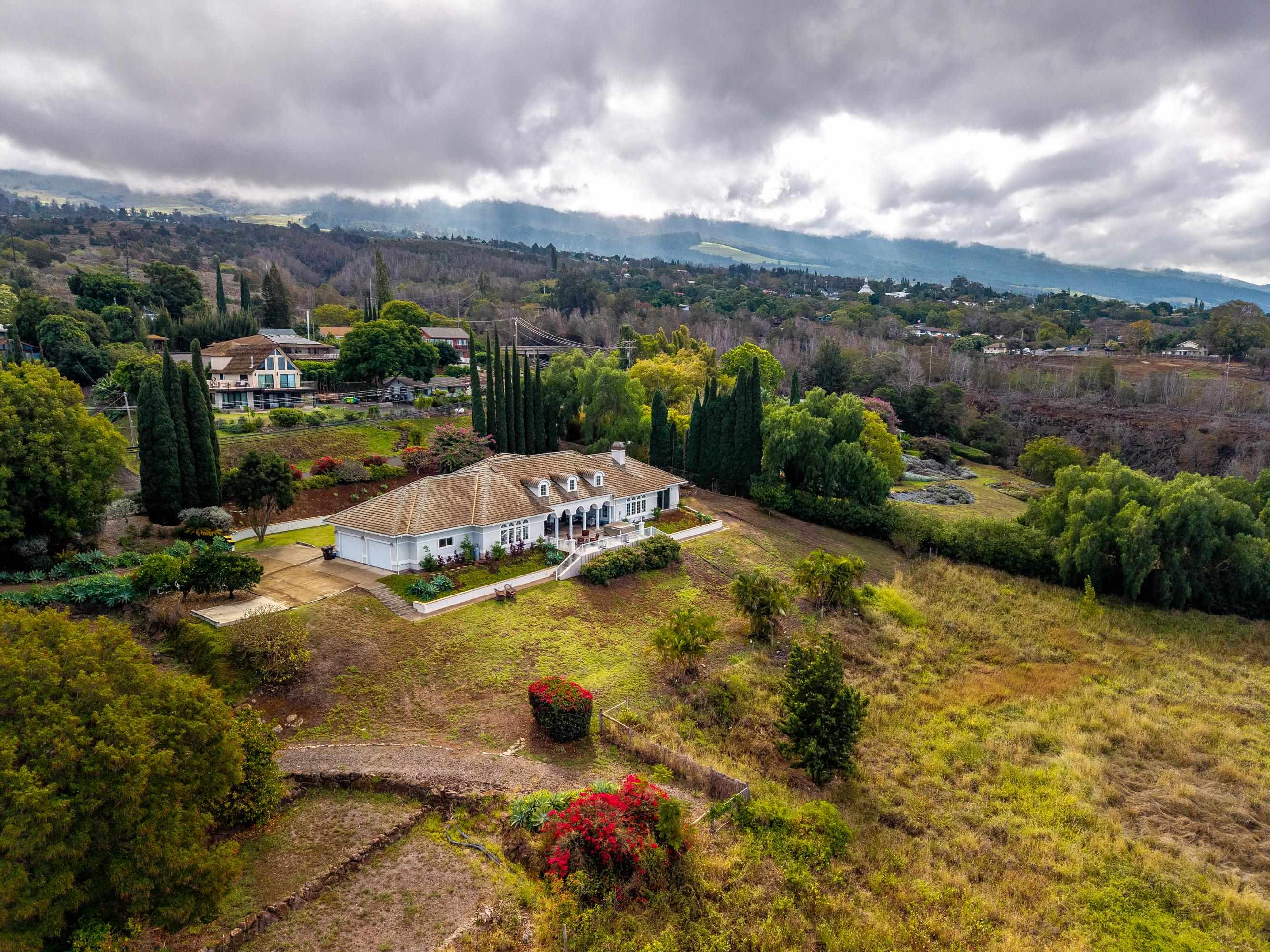 Perched in coveted Lower Kula, this Mediterranean-inspired villa commands a truly superb setting with breathtaking Coast-to-Coast VIEWS! Tucked behind a private, gated entry, the property offers rare seclusion and quiet enjoyment, surrounded by natural beauty, open skies and an ideal climate. Architectural details define the home's timeless elegance. Arched windows frame sweeping vistas, an exquisite roofline crowns the residence, and a columned entry creates a grand sense of arrival. Inside, travertine tile and warm oak floors set a refined yet welcoming tone. TWO spacious living areas provide flexibility for both intimate gatherings and larger entertaining and are complemented by a formal dining room, ideal for hosting memorable gatherings. A glassed-in study provides a quiet, light-filled space for work or reflection, while split air conditioning ensures comfort throughout the home. The generous primary suite is a private retreat, featuring immense VIEWS that stretch to the ocean and a giant walk-in closet. Polished wood stairs lead to cozy bedrooms, offering comfort and privacy for family or guests. Outdoor living is equally compelling, with a large covered deck perfectly positioned to take in stellar, ocean-facing VIEWS- ideal for sunrise coffee, sunset dinners, or simply savoring the serenity of this remarkable Lower Kula estate.