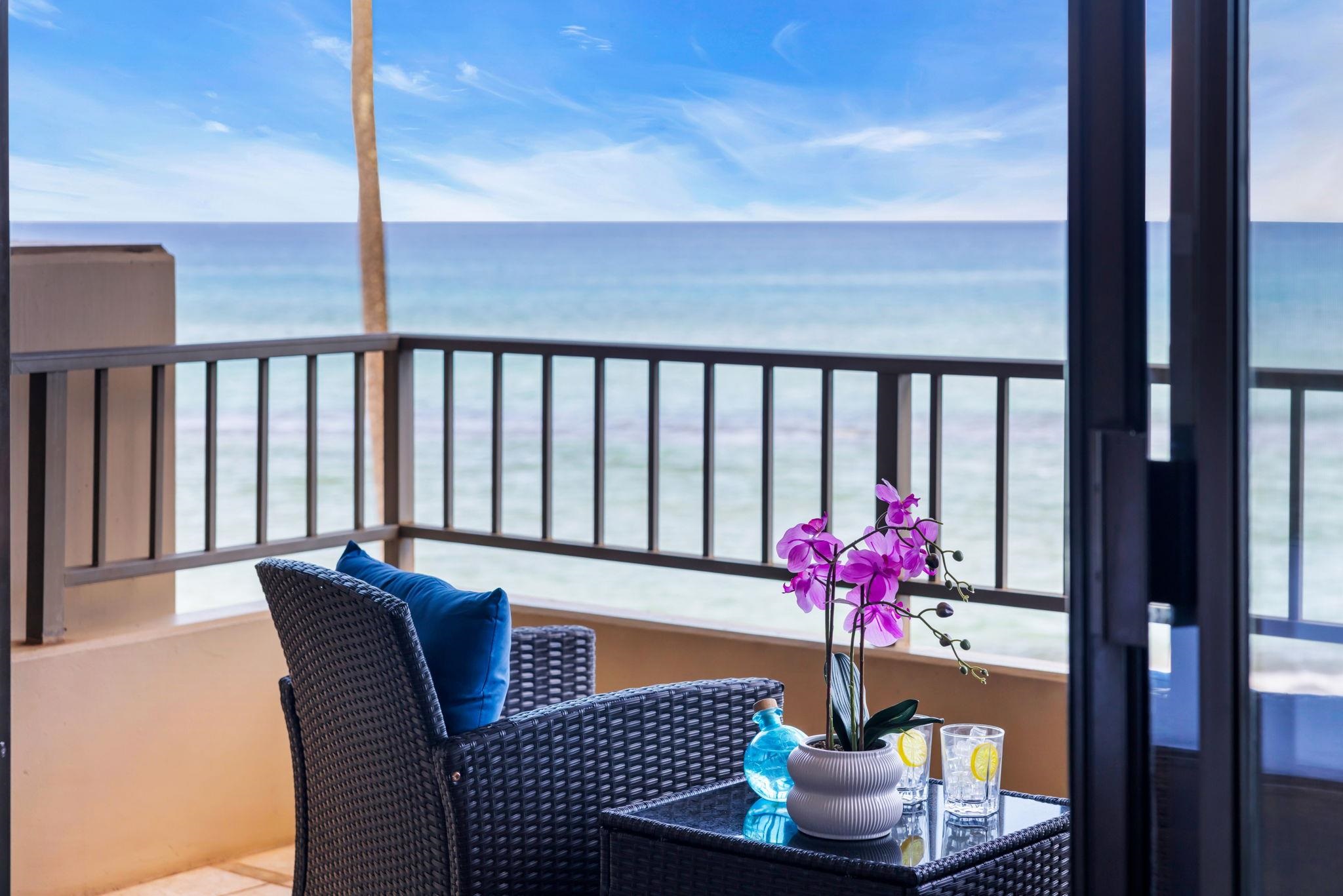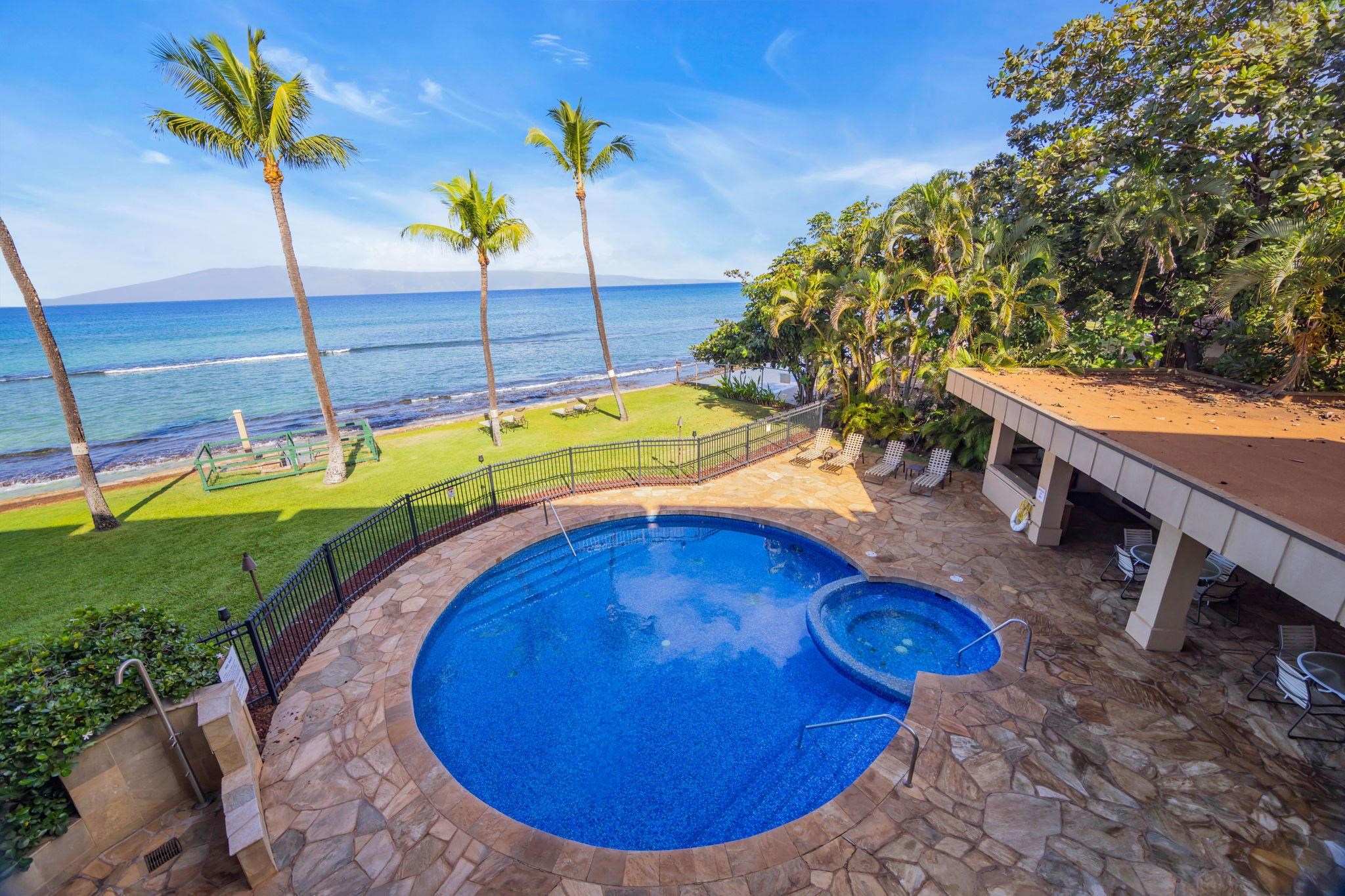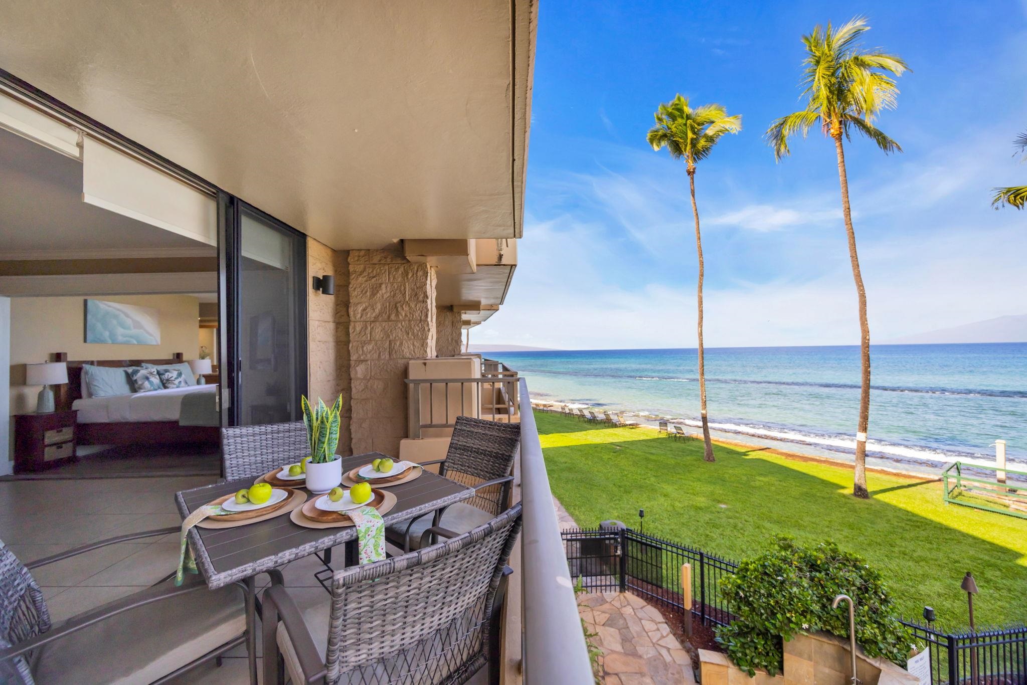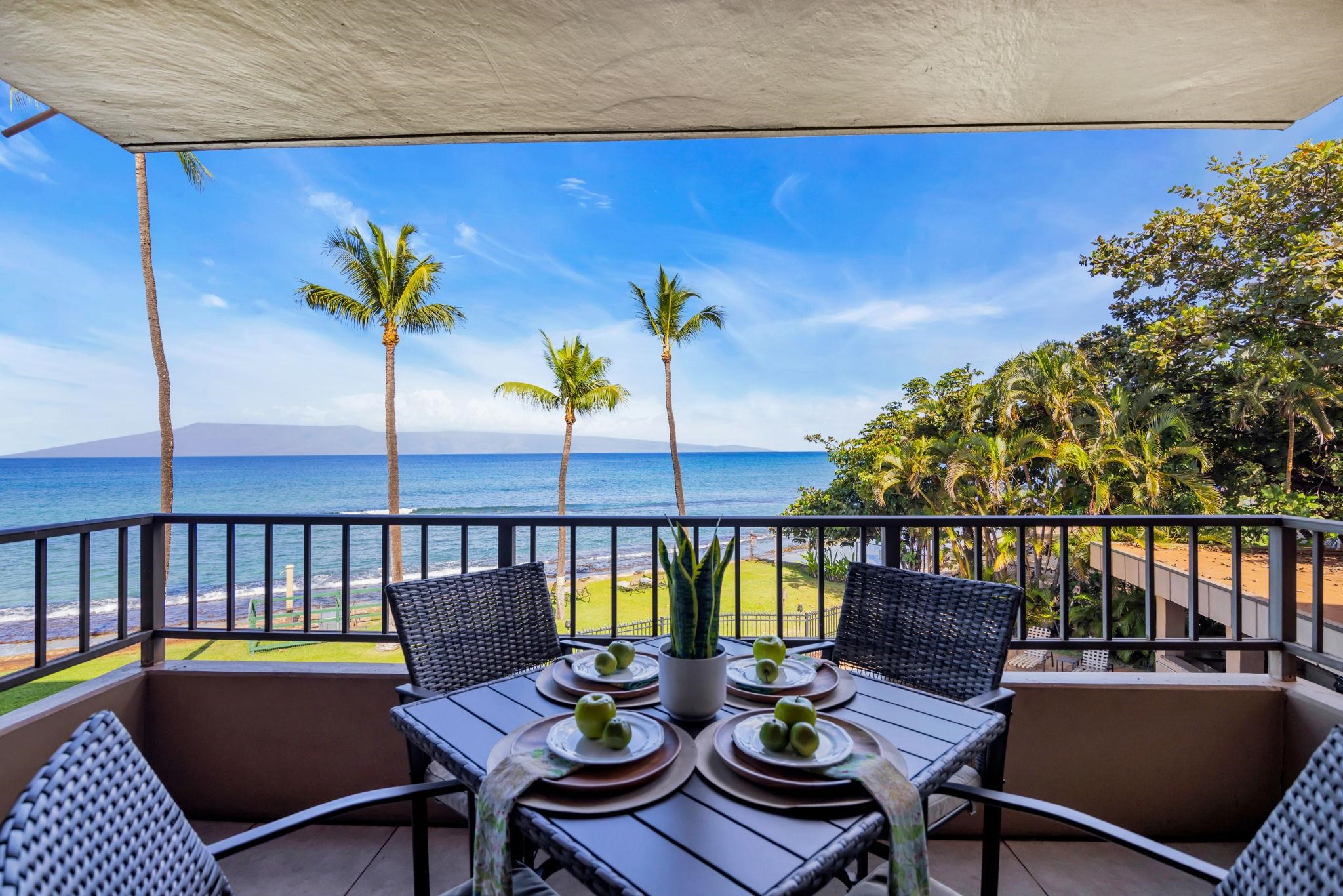 This beautiful Paki Maui oceanfront unit is one level, recently remodeled with new vinyl plank flooring in the bedrooms, new furniture, ceiling fans, shower glass in master and blinds. Shows like a model. Granite counters in the fully equipped kitchen. The entry has a beautiful travertine turtle perfect island ambiance. Spacious floorplan has 2 lanais to enjoy the indoor/outdoor living we have on the ocean. This unit is direct oceanfront with year-round sunset views and island views of Molokai and Lanai. It is close to restaurants, shopping and world famous golf. Paki Maui has ample parking. Sold fully furnished.