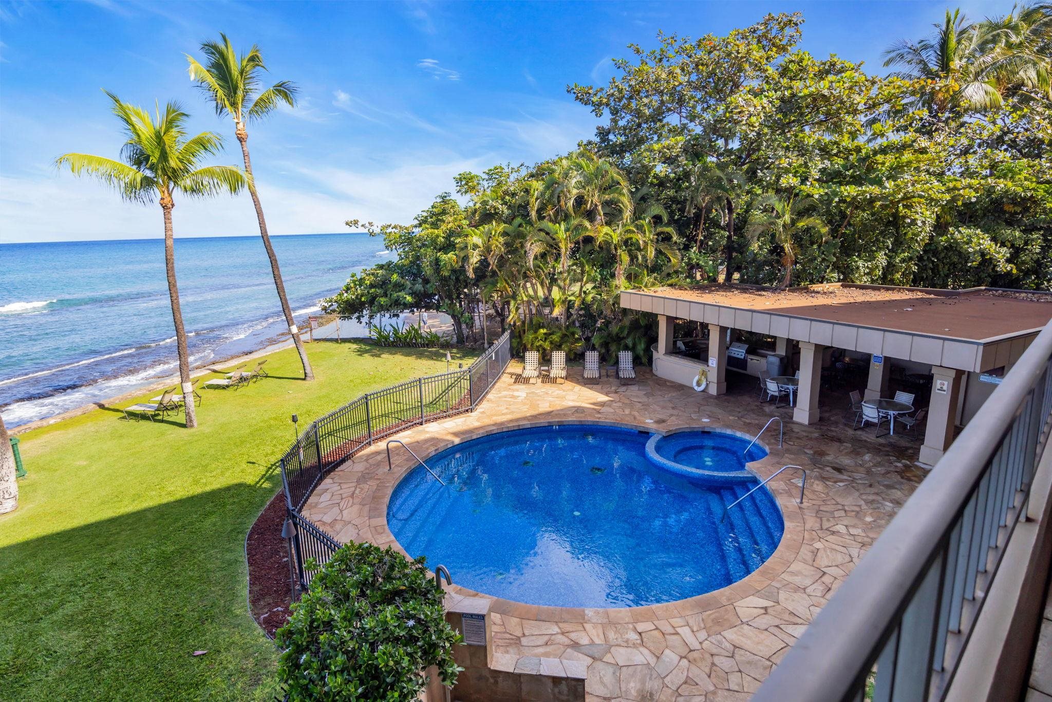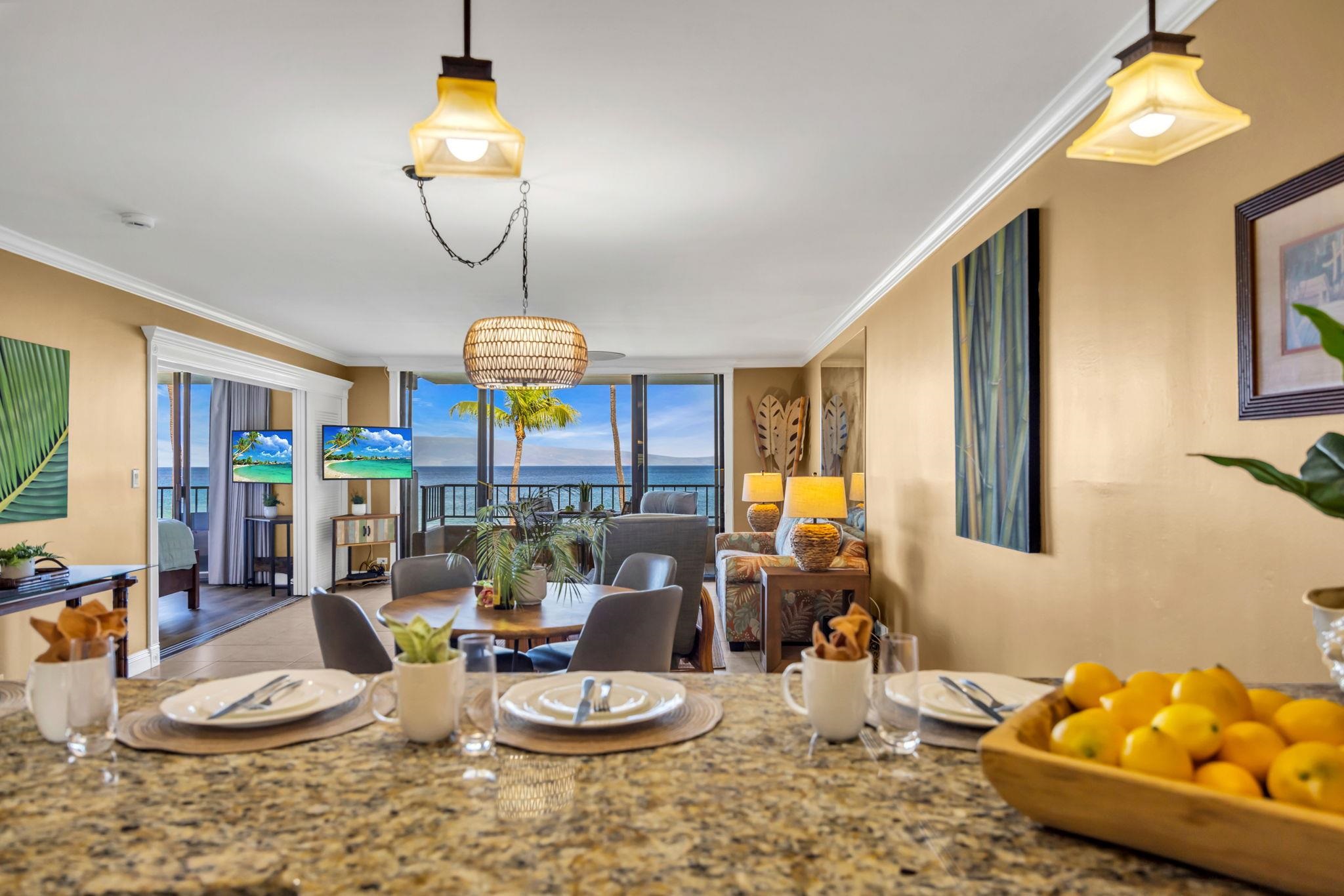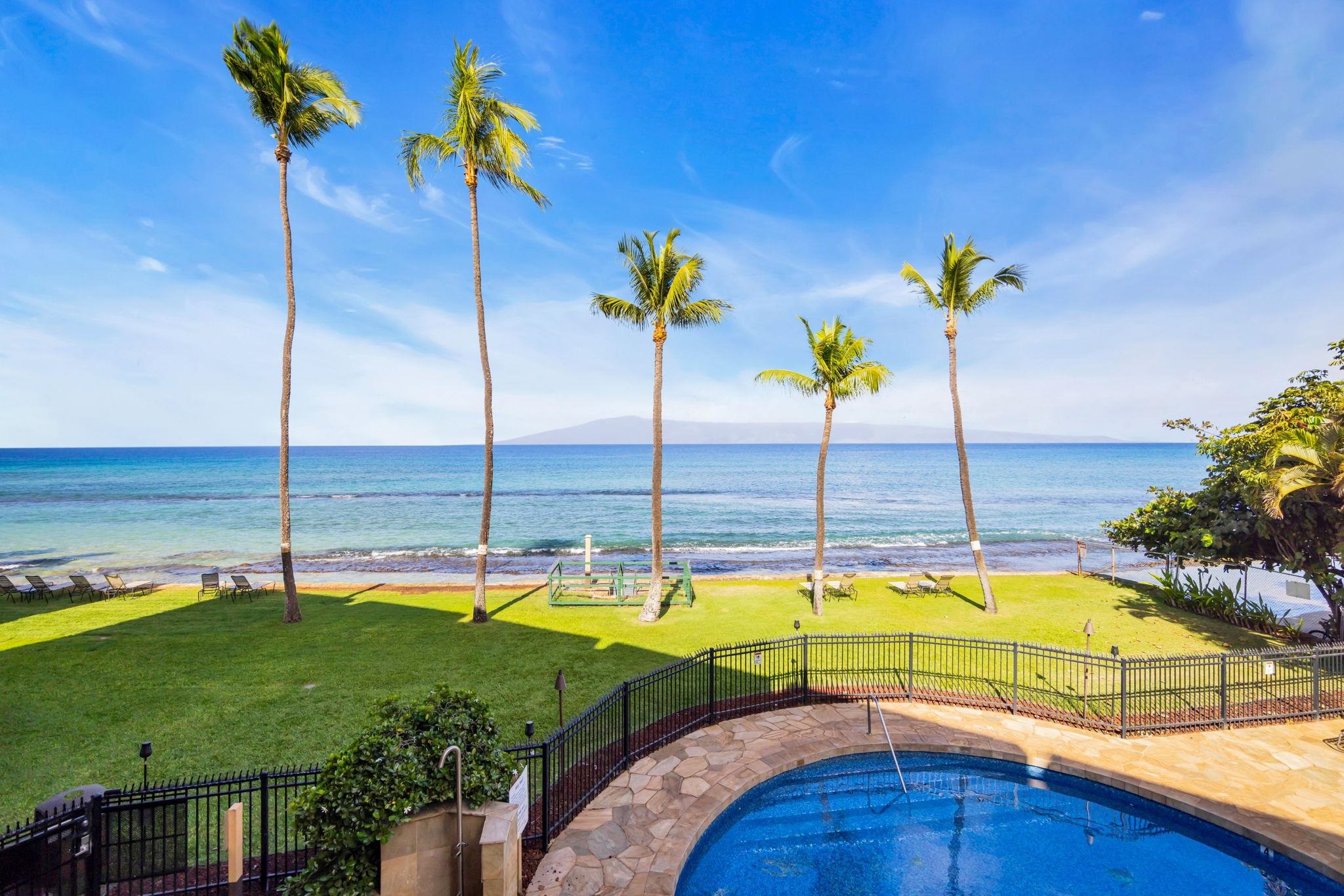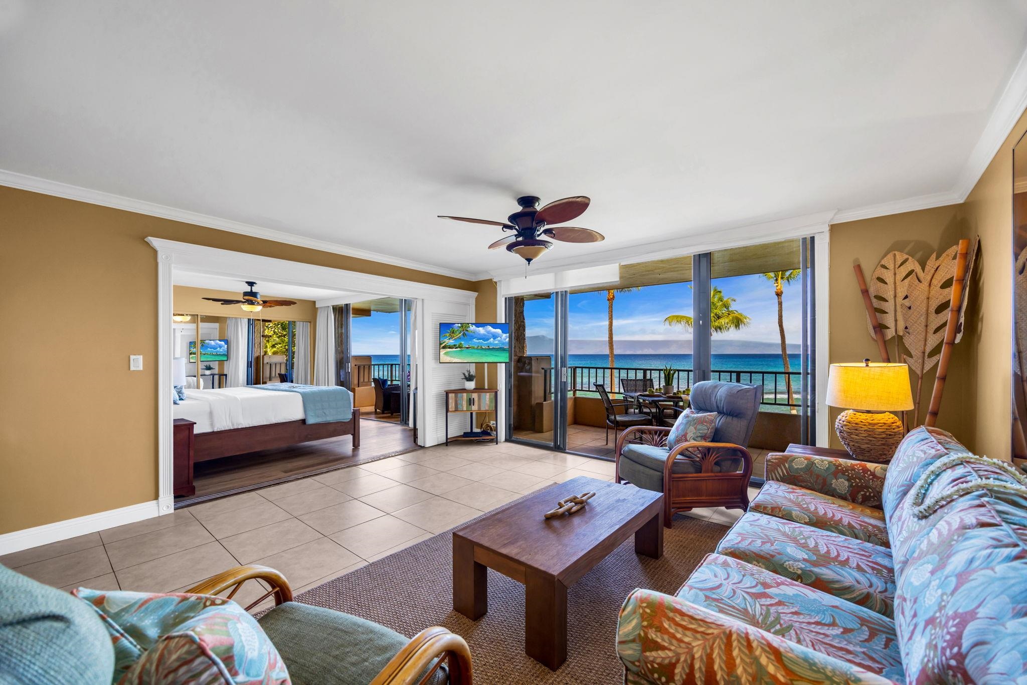 This beautiful Paki Maui oceanfront unit is one level, recently remodeled with new vinyl plank flooring in the bedrooms, new furniture, ceiling fans, shower glass in master and blinds. Shows like a model. Granite counters in the fully equipped kitchen. The entry has a beautiful travertine turtle perfect island ambiance. Spacious floorplan has 2 lanais to enjoy the indoor/outdoor living we have on the ocean. This unit is direct oceanfront with year-round sunset views and island views of Molokai and Lanai. It is close to restaurants, shopping and world famous golf. Paki Maui has ample parking. Sold fully furnished.