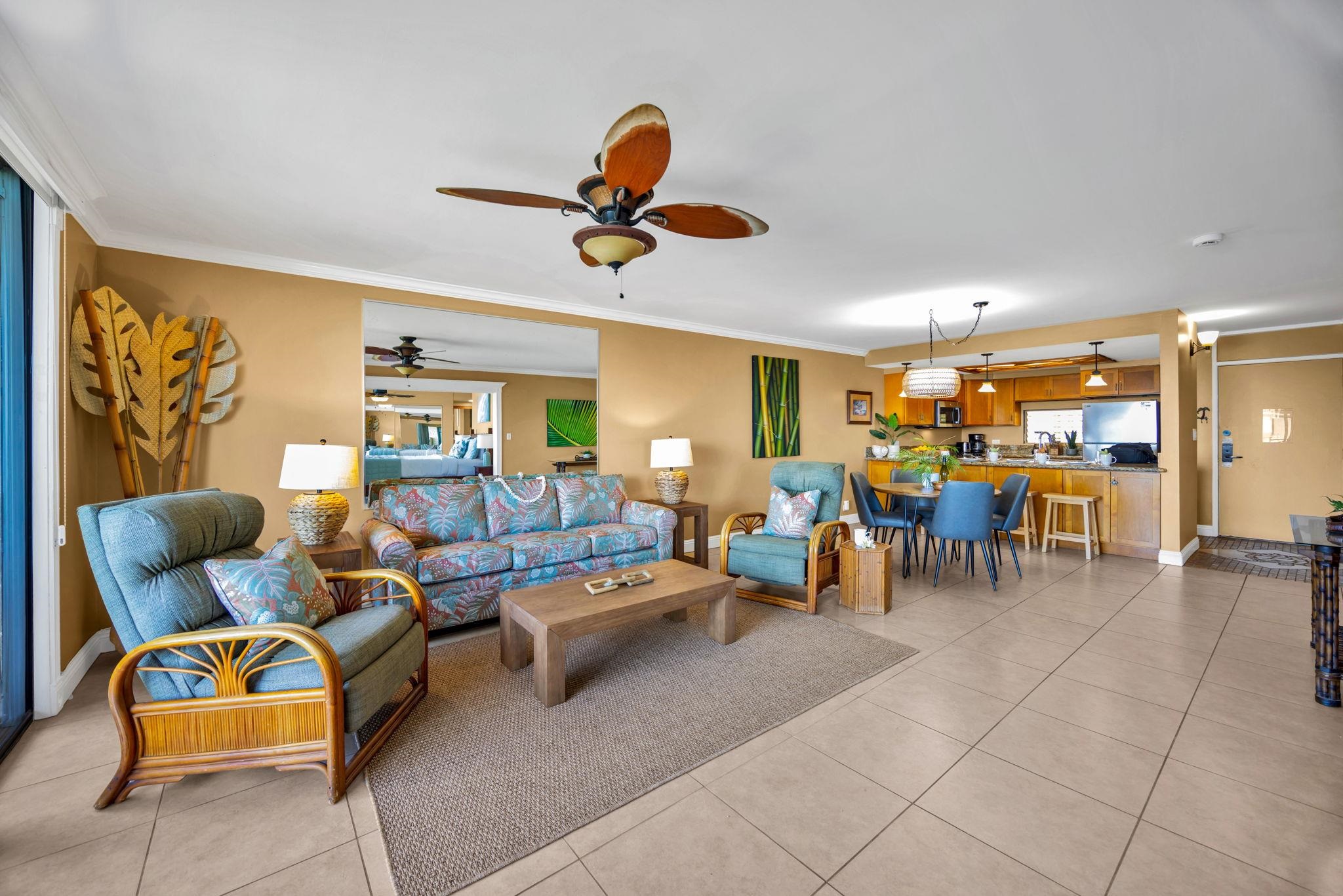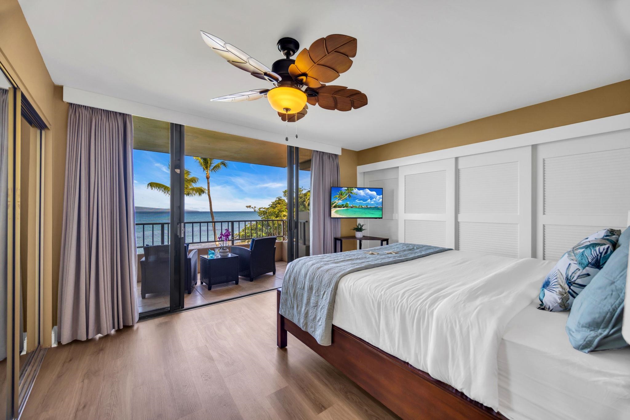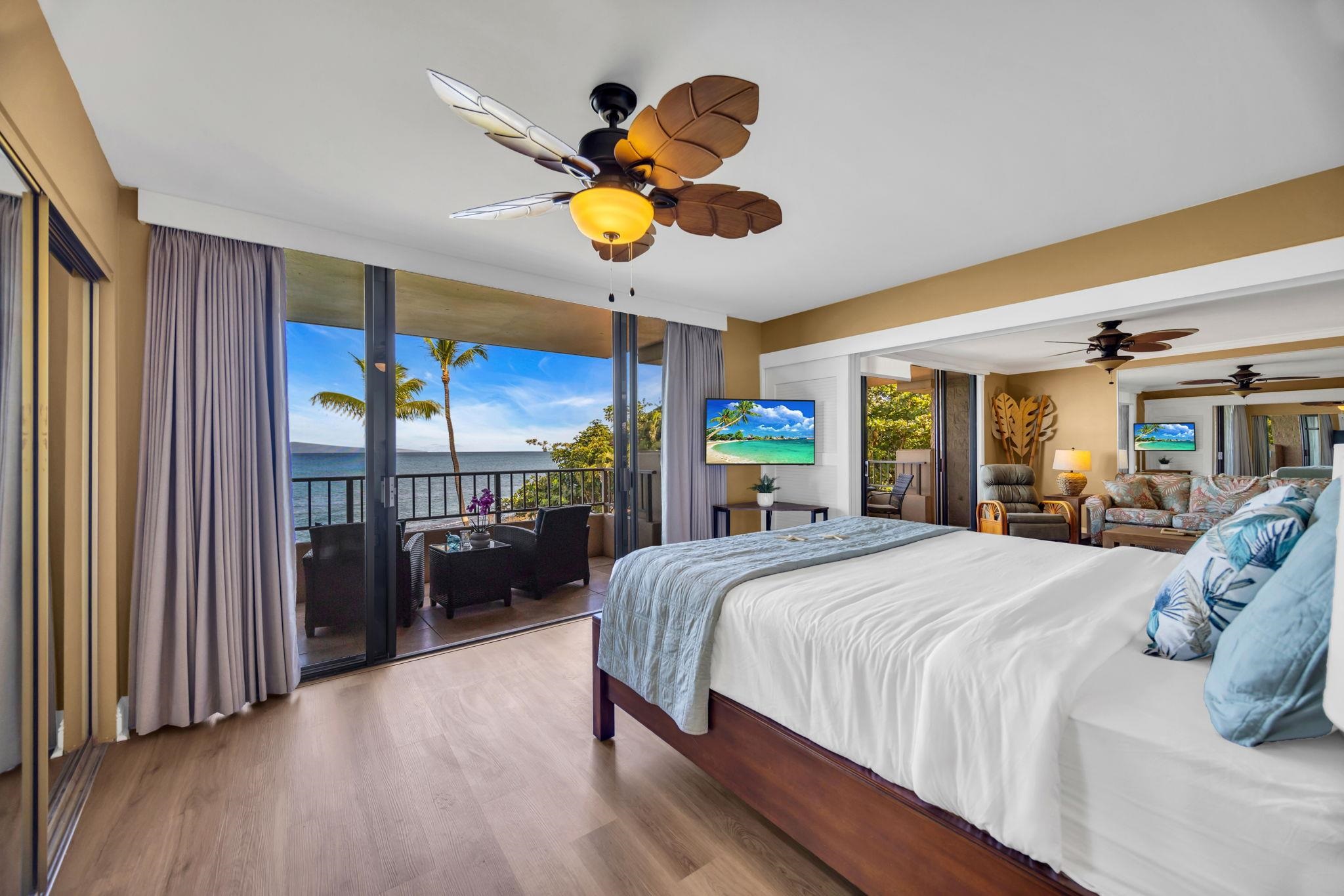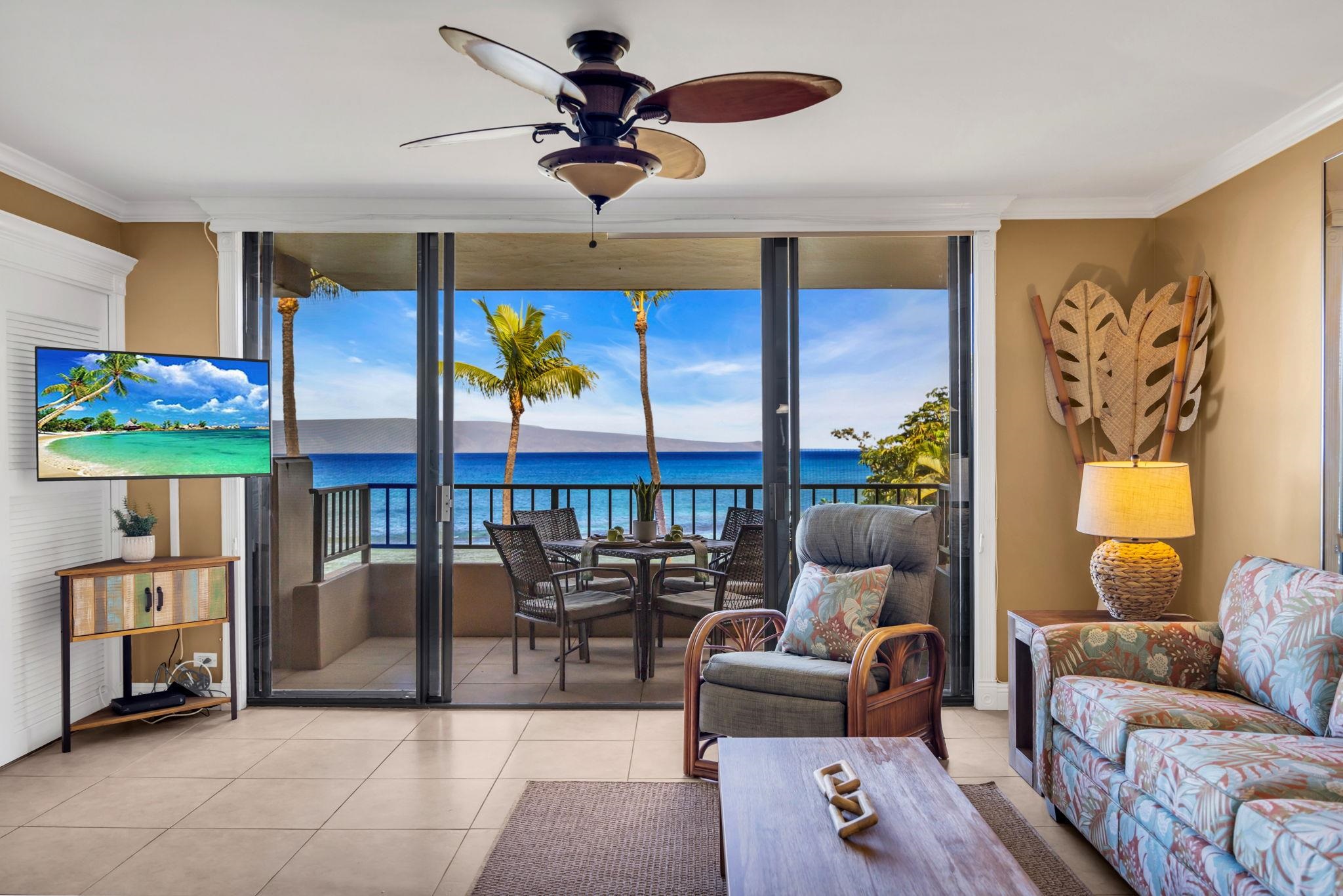 This beautiful Paki Maui oceanfront unit is one level, recently remodeled with new vinyl plank flooring in the bedrooms, new furniture, ceiling fans, shower glass in master and blinds. Shows like a model. Granite counters in the fully equipped kitchen. The entry has a beautiful travertine turtle perfect island ambiance. Spacious floorplan has 2 lanais to enjoy the indoor/outdoor living we have on the ocean. This unit is direct oceanfront with year-round sunset views and island views of Molokai and Lanai. It is close to restaurants, shopping and world famous golf. Paki Maui has ample parking. Sold fully furnished.