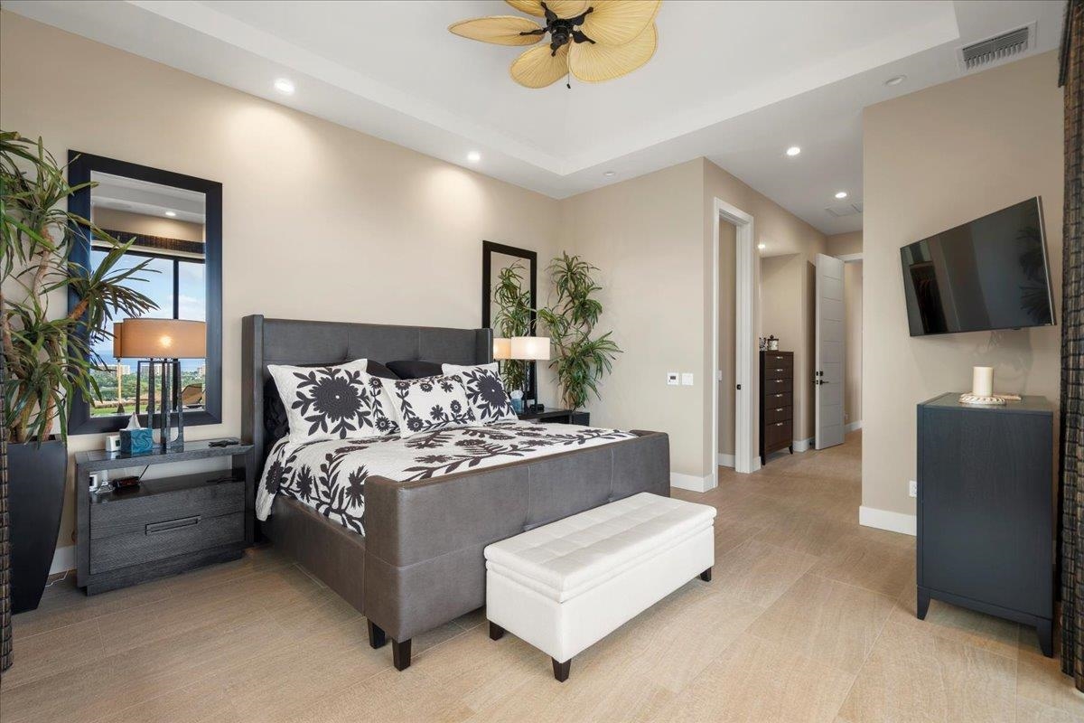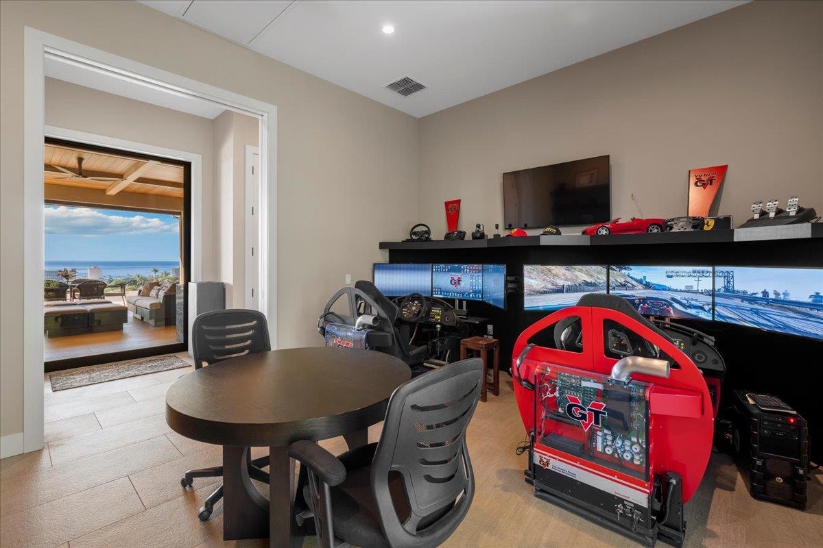 Perched above the 7th green of the Ka'anapali Kai Golf Course in the coveted double-gated community of Lanikeha, this luxury single-level residence is offered for the first time since being built and represents the first-ever double one-acre estate brought to market in Ka'anapali. Spanning two premier, tiered one-acre parcels totaling a full two acres, the property is widely regarded as occupying the two best lots in the neighborhood, delivering unmatched privacy, elevation, and long-term view protection. Oriented between Lana'i and Moloka'i, the home enjoys protected west-facing ocean views, year-round sunsets, seasonal whale watching, and beautifully framed golf course vistas. Situated at approximately 202 feet of elevation, the residence is intentionally positioned above the adjacent parcel, preserving view corridors in perpetuity—an advantage only possible through ownership of both lots. Lanikeha is a golf-cart-friendly community offering convenient access to Ka'anapali Beach, Whalers Village, world-class golf, tennis, dining, and resort amenities. The home features refined contemporary design with seamless indoor-outdoor living, including a Fleetwood window wall, clear cedar ceiling details, a quartzite waterfall kitchen island, Bosch double convection ovens, dual dishwashers, separate food and appliance pantries, and a spacious covered lanai with outdoor kitchen, built-in grill, and remote solar screens positioned perfectly for sunsets between the neighbor islands. The great room is enhanced with in-wall Wisdom audio speakers, surround sound, and remote solar shades. The residence includes three bedrooms plus a den, four bathrooms, a private entry courtyard, outdoor pool bath, spa off the primary suite, outdoor shower, and an oversized 3+ car garage with high clearances and dedicated golf cart parking. Smart-home features include Sonos and Russound whole-house audio, Leviton/Snaplink lighting and climate control, extensive security cameras, and six independent AC zones. The two-acre grounds feature mature palms, flowering trees, terraced orchard paths, manicured lawns, privacy berms, LED landscape lighting, and a 40-zone irrigation system, along with fruiting trees including bananas, citrus, mango, and papaya. A ground-mounted solar array benefits from a rare transferable legacy 1:1 net-metering agreement, providing exceptional long-term energy savings. Residents enjoy access to Lanikeha’s private clubhouse with fitness center, billiards room, entertainment hall, catering kitchen, locker rooms, two spas, covered outdoor gathering areas, and a resort-style infinity-edge pool overlooking the Pacific. Combining coastal modern design, protected west-facing views, and unprecedented land rarity, this offering stands among the most significant estates ever presented in the Ka'anapali Resort. Both 24 and 44 Anapuni Loop must be purchased and closed simultaneously.