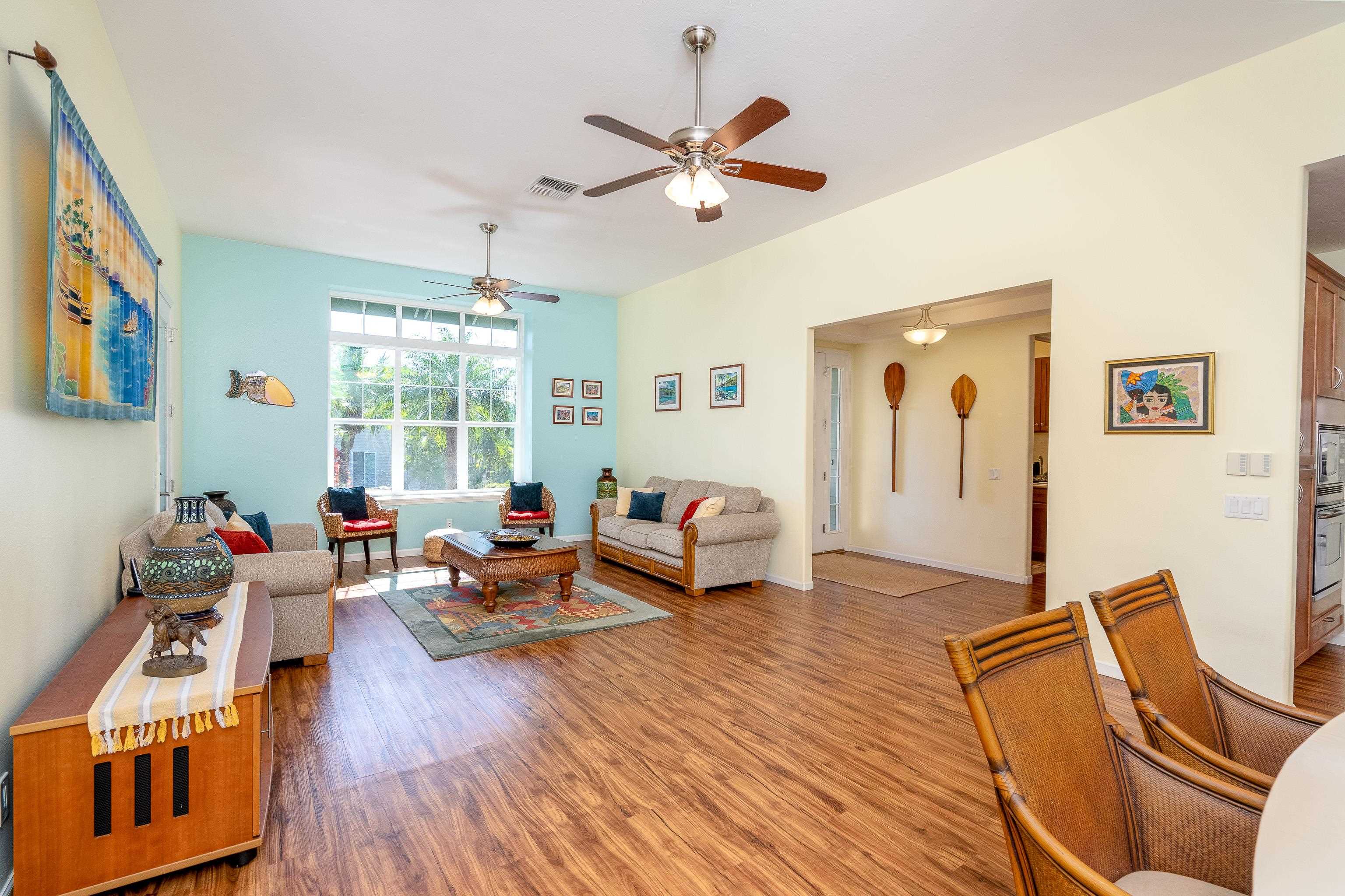 Tired of stairs?? This stunning, single-level residence, located in upscale Moana Estates, offers a relaxing island lifestyle you won't want to miss! This house has a great floor plan with high ceilings! The spacious open-concept kitchen with its granite countertops, has a pass-thru window for your easy lanai dining and entertainment. The kitchen flows seamlessly into the large, bright dining and living areas with their high ceilings, where a large bay window frames views of the lush tropical landscaping in front. Sliding glass doors at the rear open on to a gorgeous, tropical and covered patio. There is an additional covered lanai at the front off the master bedroom. The master suite is thoughtfully positioned for privacy on one side of the home and is separate from the two guest bedrooms on the opposite side. It features a generous walk-in closet and an additional mirrored closet. The ensuite bathroom has a soaking tub and separate walk-in shower. One guest bedroom includes its own bathroom and private garden access. Luxury vinyl plank flooring spans the main living areas, while the bathrooms and laundry room feature tile flooring. With its multiple banana trees (more in the front yard too!), trellis, built-in barbecue, and electrical outlet for a small fridge, this lovely tropical paradise provides the ideal venue for your outdoor parties and dining. The back garden is gated on one side and could be fully enclosed on the other for your dog. It may also provide access to a pool, should you wish to consider adding one. This home includes an owned, net-metered photovoltaic system and central air conditioning. Ideally located in South Kihei, Moana Estates is close to beautiful beaches, shopping, dining, and world-class golf courses. Seller is willing to sell the home furnished, including the two queen-size adjustable Tempur-Pedic beds. Seller may require a lease back after close of escrow. Property can usually be shown with a couple of hours' notice, if required.