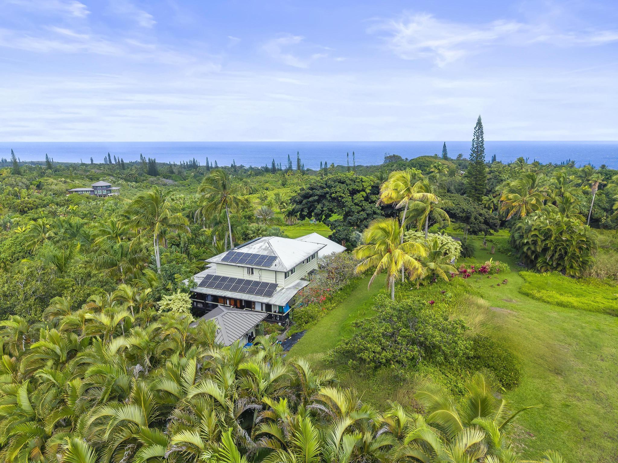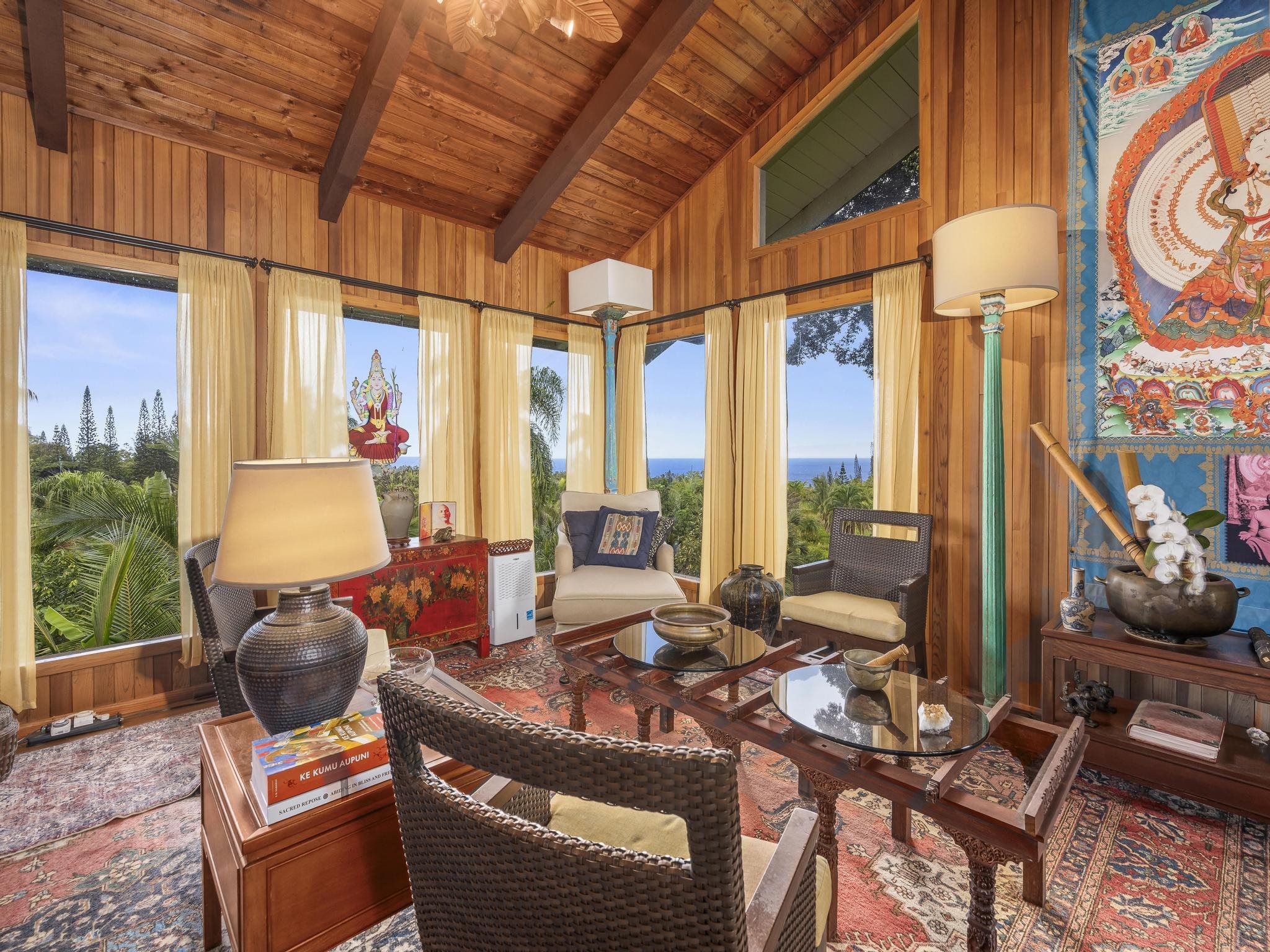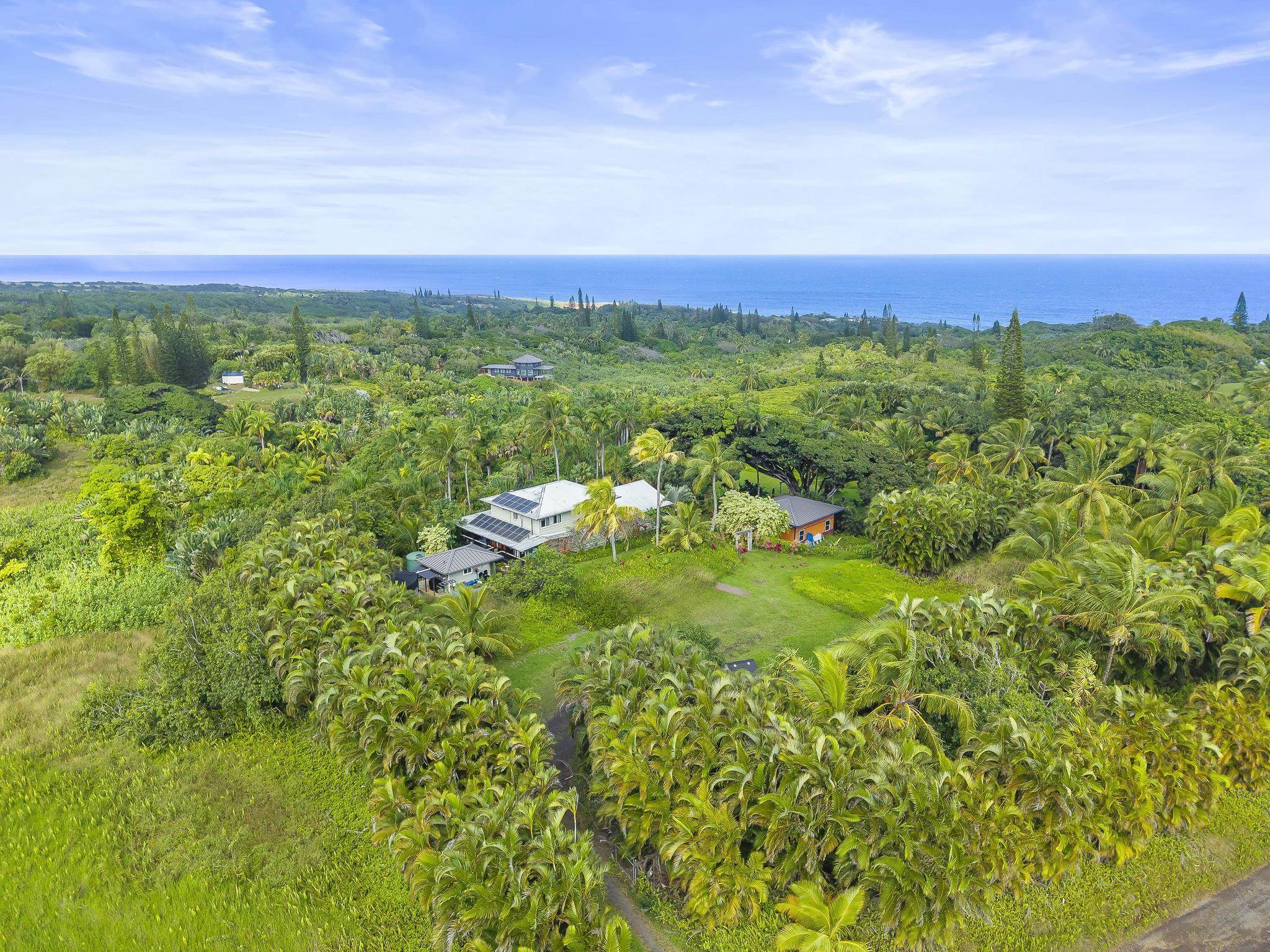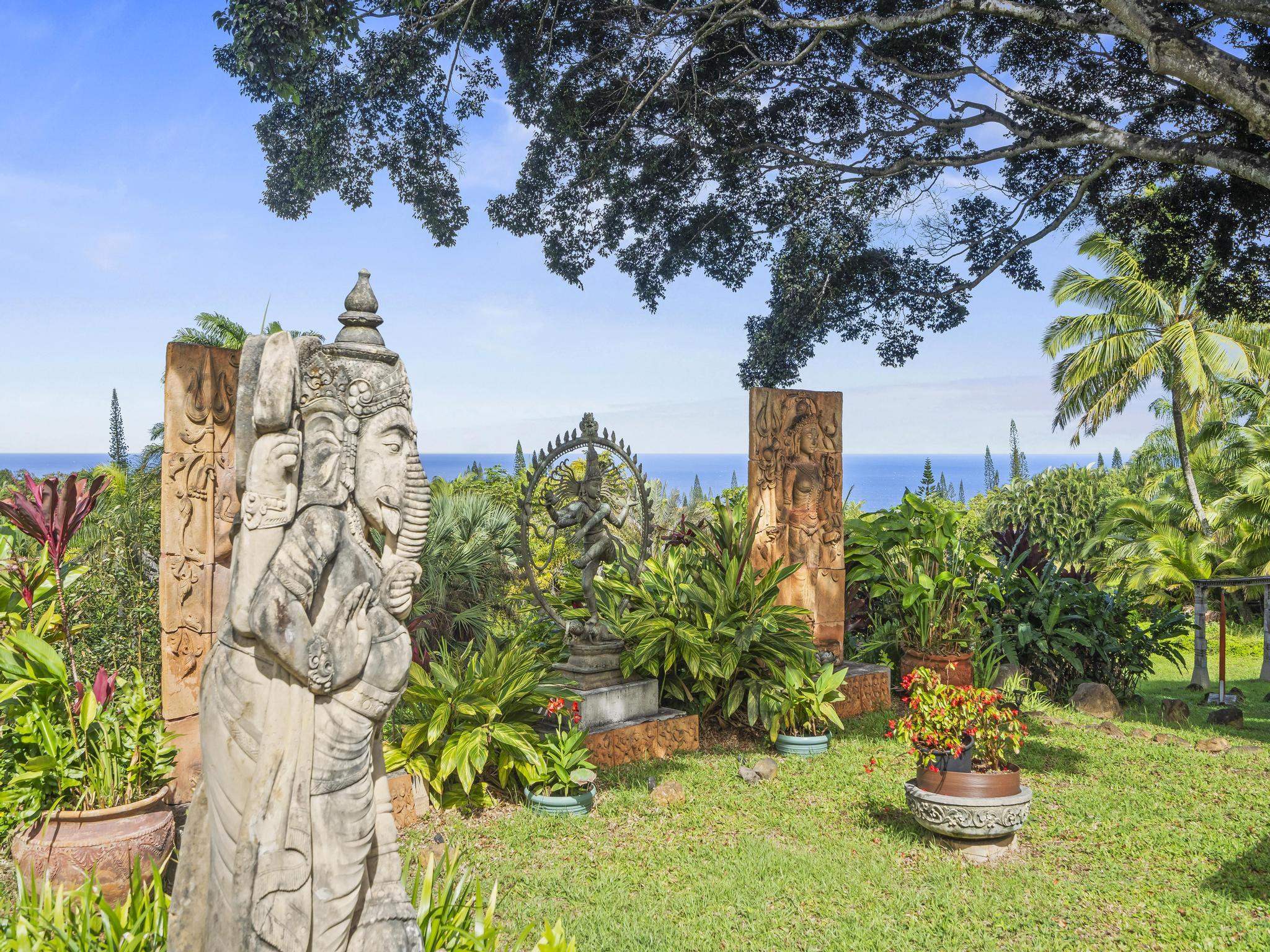 Serene estate set on 3.7 lush, tropical acres with sweeping ocean views, located just past Twin Falls in one of Maui’s most established off-grid communities. This peaceful and private property offers a retreat-like atmosphere, featuring an extensive collection of mature palms, a perennial stream, and gentle ponds that invite reflection and creative expression. Meandering paths encourage slow walks and quiet moments of connection with the land, with endless potential for expanded tropical gardens. The property invites you to grow your own food and live a self-sustaining lifestyle. At night, it feels as though you could reach out and touch the stars. Nestled within the grounds is a tranquil meditation temple designed to calm the heart and center the mind, along with a thoughtfully curated meditation garden adorned with beautiful sculptures that add an artistic, soulful presence to the landscape. The land feels intentional, grounded, and naturally inspiring—ideal for those drawn to mindful, creative living. The two-story residence features 5 bedrooms and 6.5 baths, complemented by a dedicated library and an additional computer room—well-suited for study, remote work, or creative pursuits. An expansive covered deck capturing panoramic ocean and garden views. An opportunity for those seeking privacy, tranquility. Seller financing is offered.
