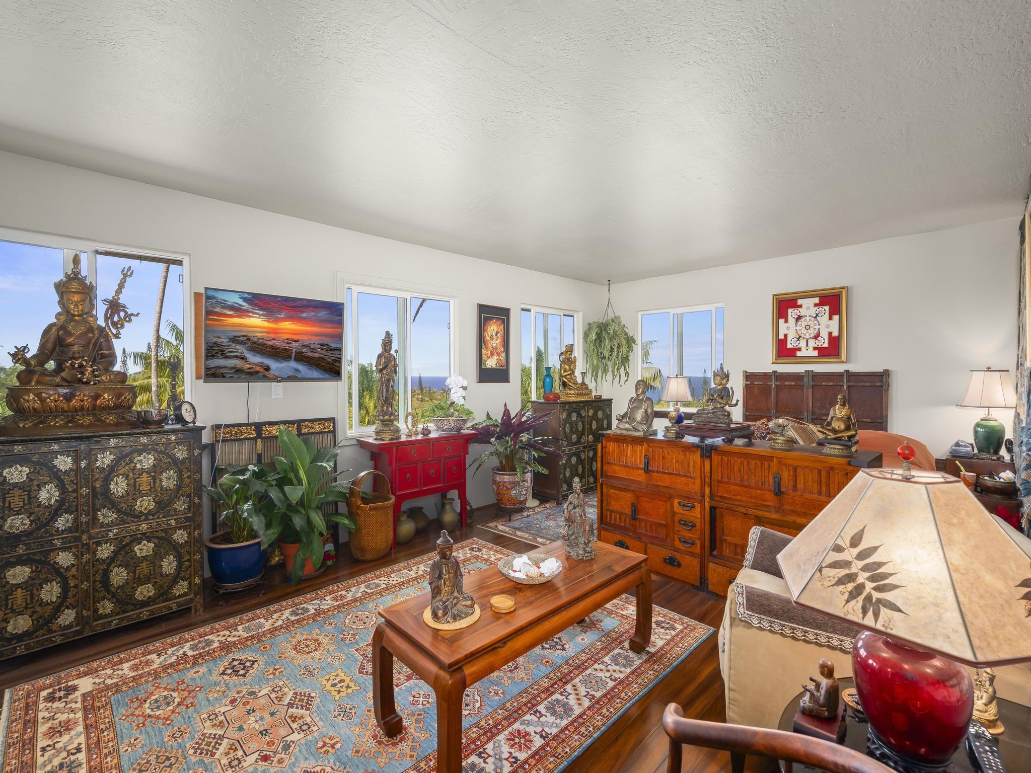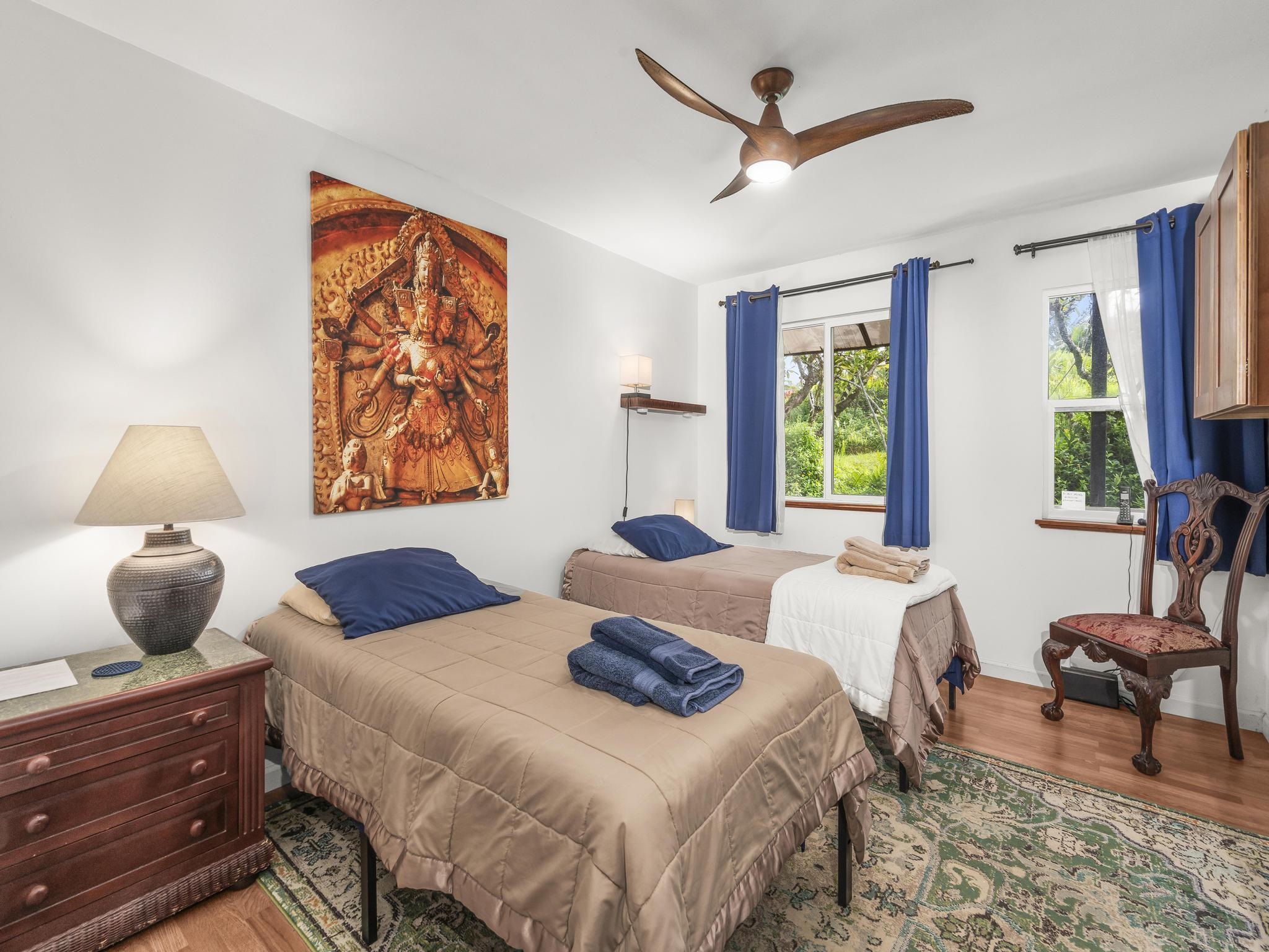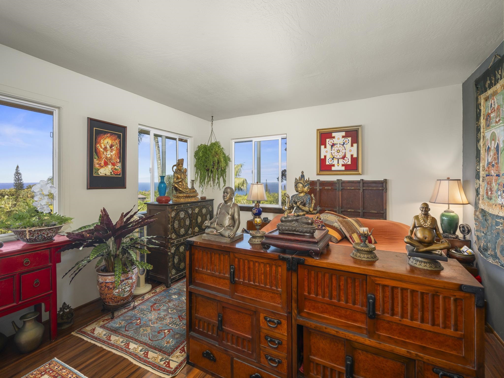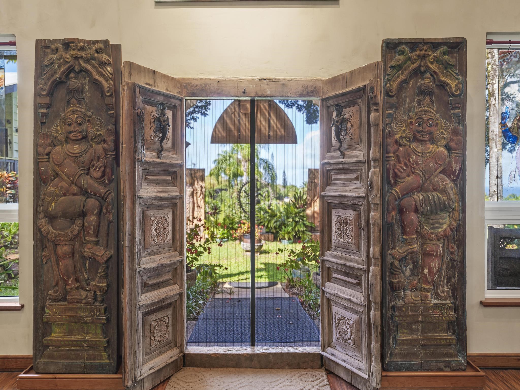 Serene estate set on 3.7 lush, tropical acres with sweeping ocean views, located just past Twin Falls in one of Maui’s most established off-grid communities. This peaceful and private property offers a retreat-like atmosphere, featuring an extensive collection of mature palms, a perennial stream, and gentle ponds that invite reflection and creative expression. Meandering paths encourage slow walks and quiet moments of connection with the land, with endless potential for expanded tropical gardens. The property invites you to grow your own food and live a self-sustaining lifestyle. At night, it feels as though you could reach out and touch the stars. Nestled within the grounds is a tranquil meditation temple designed to calm the heart and center the mind, along with a thoughtfully curated meditation garden adorned with beautiful sculptures that add an artistic, soulful presence to the landscape. The land feels intentional, grounded, and naturally inspiring—ideal for those drawn to mindful, creative living. The two-story residence features 5 bedrooms and 6.5 baths, complemented by a dedicated library and an additional computer room—well-suited for study, remote work, or creative pursuits. An expansive covered deck capturing panoramic ocean and garden views. An opportunity for those seeking privacy, tranquility. Seller financing is offered.