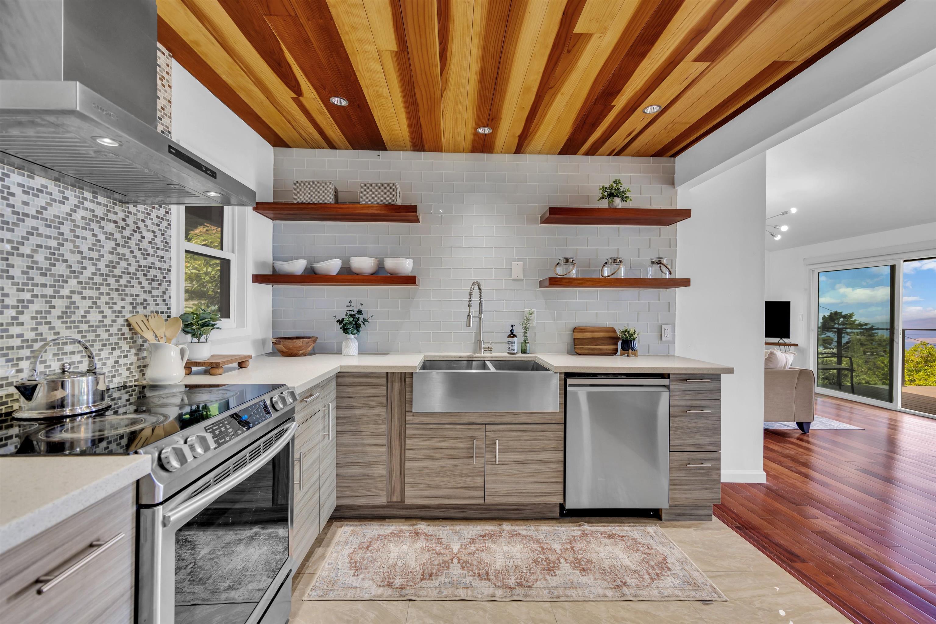Renovated modern retreat in the heart of Kula. This beautifully updated home on ¾ of an acre offers stunning bi-coastal and year-round sunset views. The open-concept layout flows seamlessly to an expansive lanai—perfect for entertaining or quiet evenings overlooking the horizon. Features include net-metered photovoltaic, catchment water system, and elegant finishes throughout. Enjoy ample outdoor space for farming or gardening, with mature avocado trees already thriving. Private, peaceful, and move-in ready—this is Upcountry living at its best.
