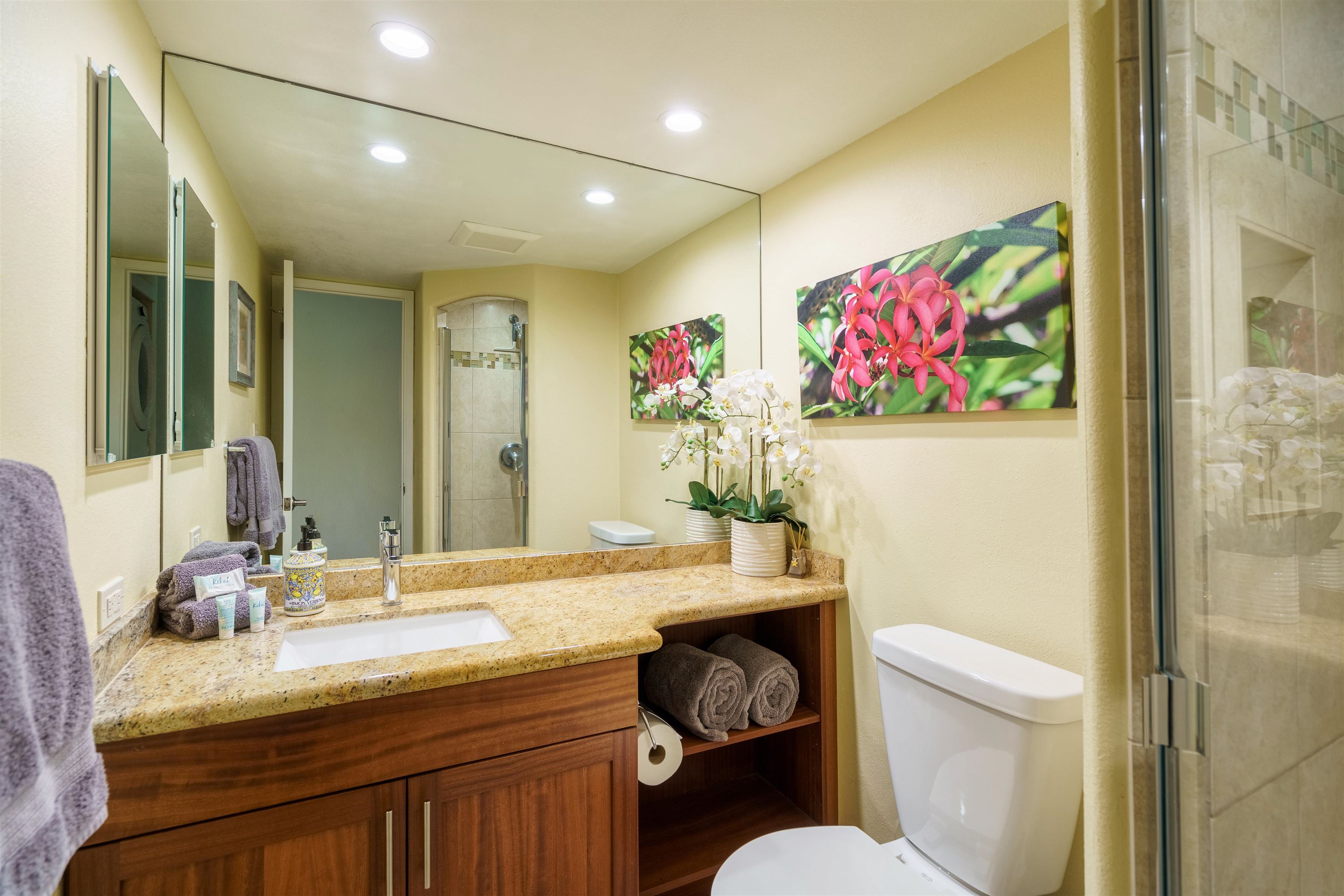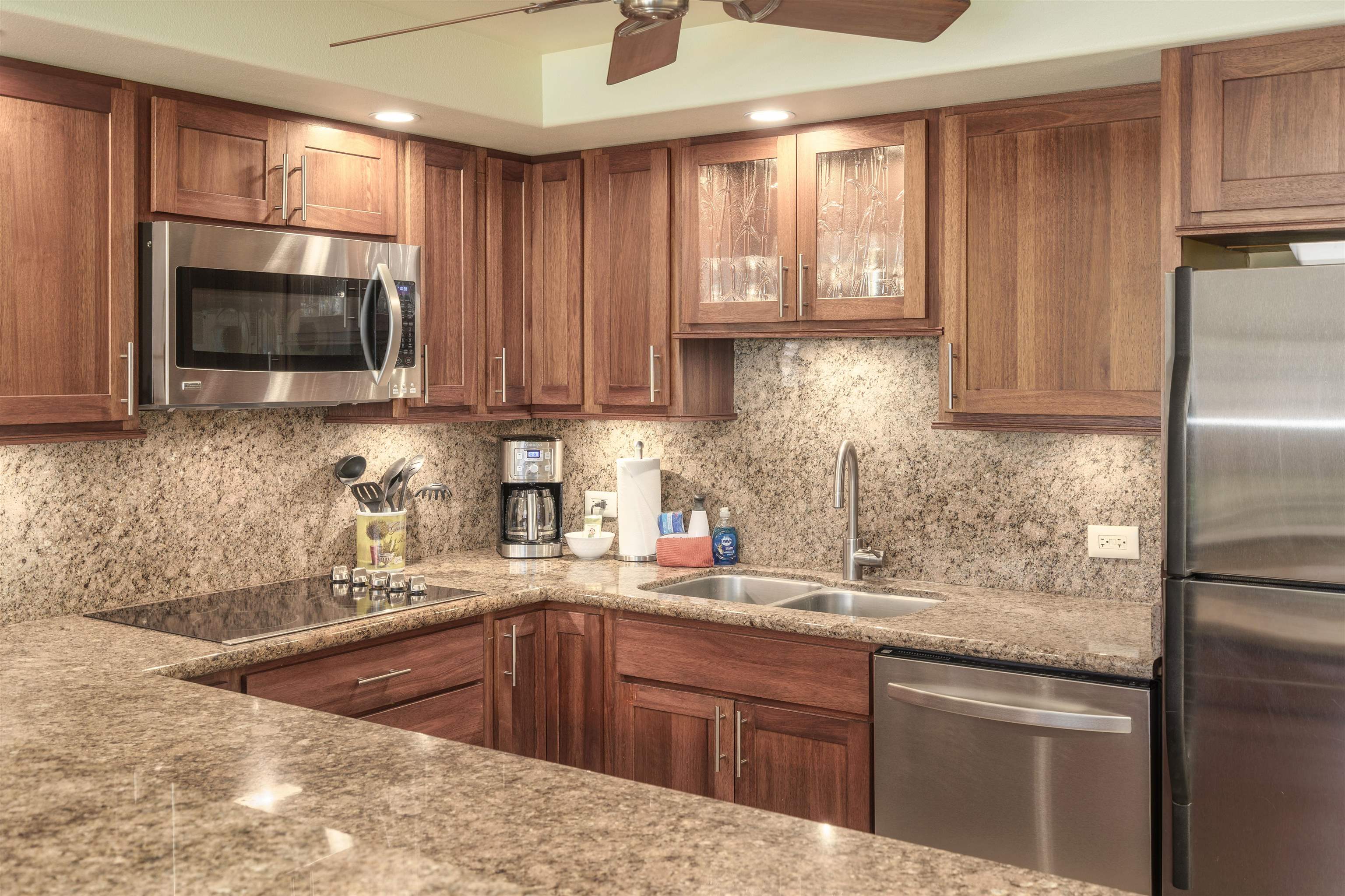 Nicely remodeled, turnkey, a prized location within the inner court, and priced to sell! This immaculate 1 bedroom, 2 bathroom condo at Kamaole Sands features ground floor convenience in coveted building #2 with a picturesque location and in close proximity to the pool and BBQ area's. The condo has been a guest favorite with features including uniform tile flooring throughout, solid wood cabinetry with granite counters, AC in the living room and bedroom, stainless steel kitchen appliances, a well equipped kitchen, nicely renovated showers, a rare living room window offering additional light and views, and a full sized in unit washer and dryer. The condo is being sold furnished and is a turnkey rental. Located just steps away from Kamaole Beach Park III, makes this condo an ideal location in South Kihei. Resort amenities include a children’s wading pool, an adult and family hot tub, fitness room, ping pong table, gas BBQ area's throughout the resort, 3 pickle ball courts, 2 tennis courts, high speed wifi, and cable. Kamaole Sands is an extremely popular resort, as the condo is within walking distance to restaurants, shops, and a number of great beaches in South Kihei.