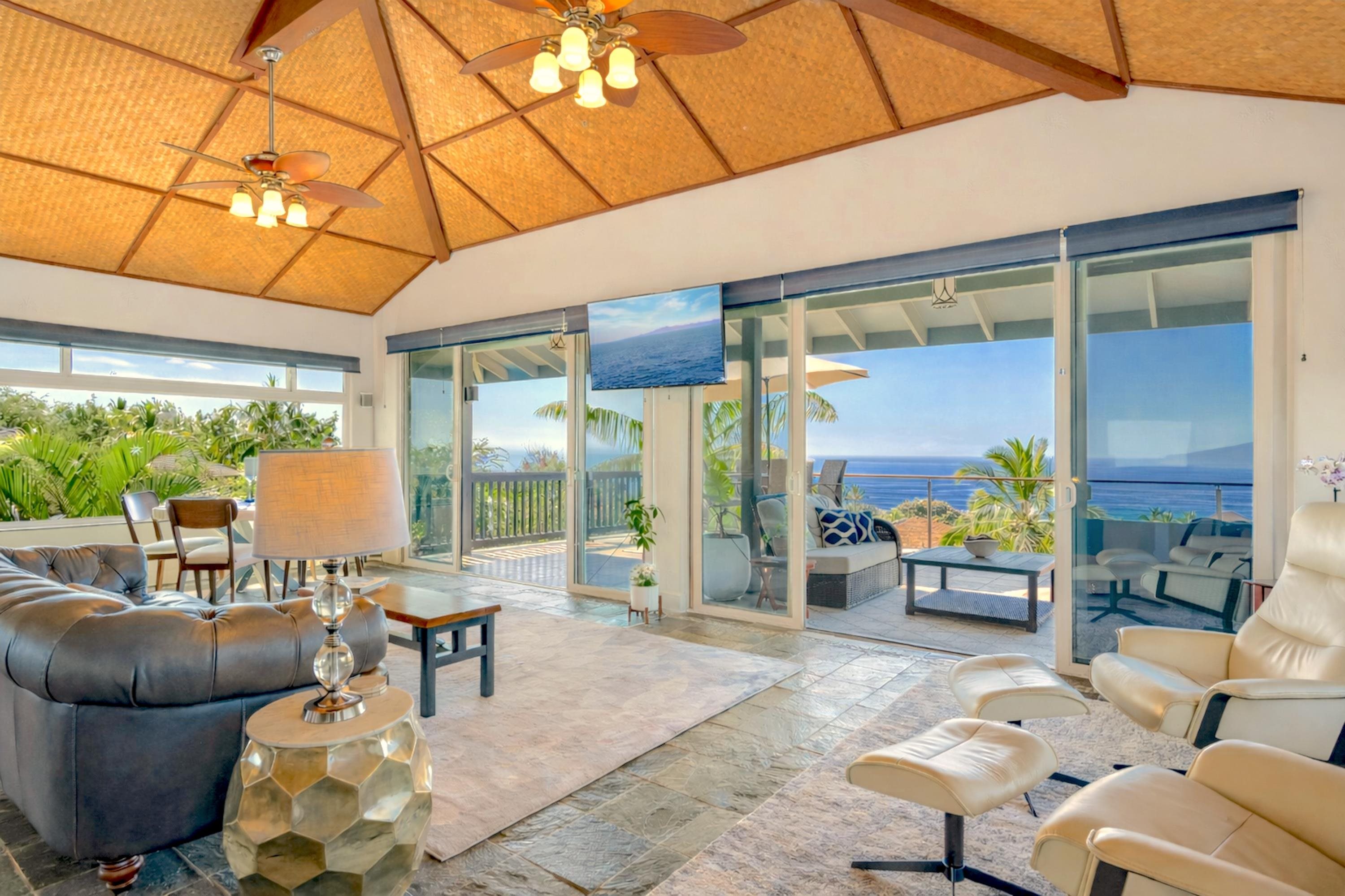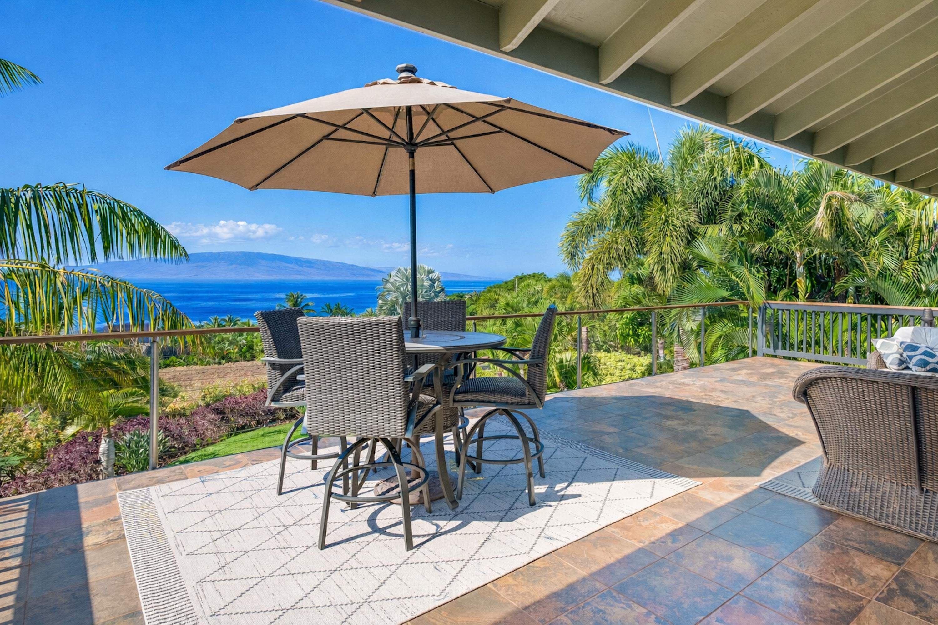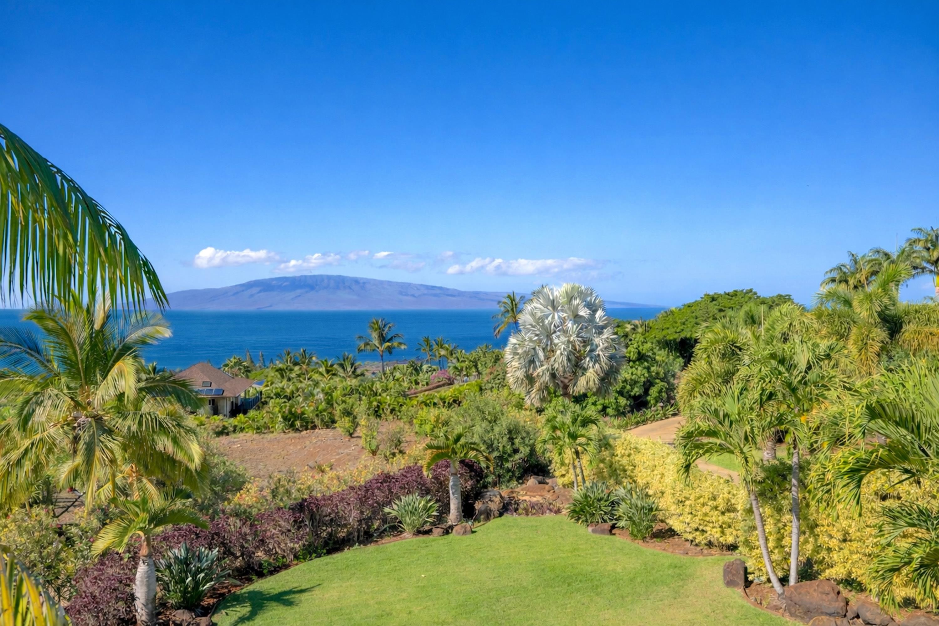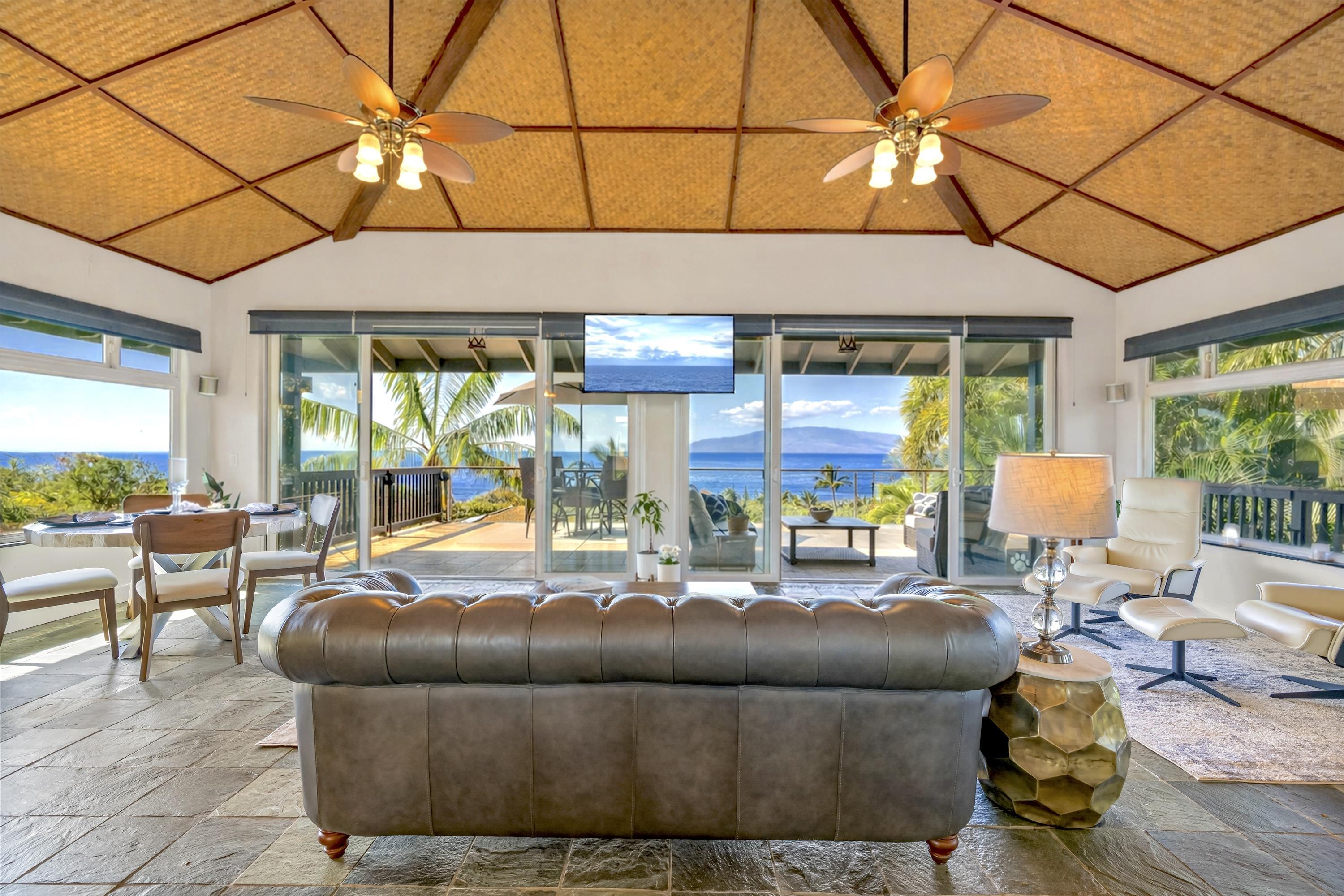 Set on 1.5 acres in desirable Launiupoko, this artistic residence offers expansive ocean views from nearly every room and throughout the property, framed by the dramatic backdrop of the West Maui Mountains. Enjoy ever-changing ocean vistas, nightly sunsets, and seasonal whale activity from home. Designed for Maui’s indoor-outdoor lifestyle, the home features generous lanais on two levels. The kitchen and main living area open seamlessly to a spacious lanai, ideal for both entertaining and everyday island living. The lower-level lanai provides direct access to the infinity-edge pool and outdoor living area. The primary suite features an en-suite bathroom and opens to the lanai and pool, while the second bedroom also enjoys outdoor access and ocean views. Distinct Hawaiian design elements include stamped plaster walls, bamboo ceilings, custom cabinet hardware, and detailed stone floorwork. Additional features include split AC units in each bedroom and upstairs, whole-house water filtration, reverse osmosis drinking water, solar water heating, mature tropical landscaping with irrigation and solar lighting, an established fruit orchard, carport parking, two storage sheds with electricity, EV charging outlet, and specialty window coverings. As the designated main home within a two-unit CPR, the property may offer additional flexibility for future expansion/garage, subject to applicable approvals.