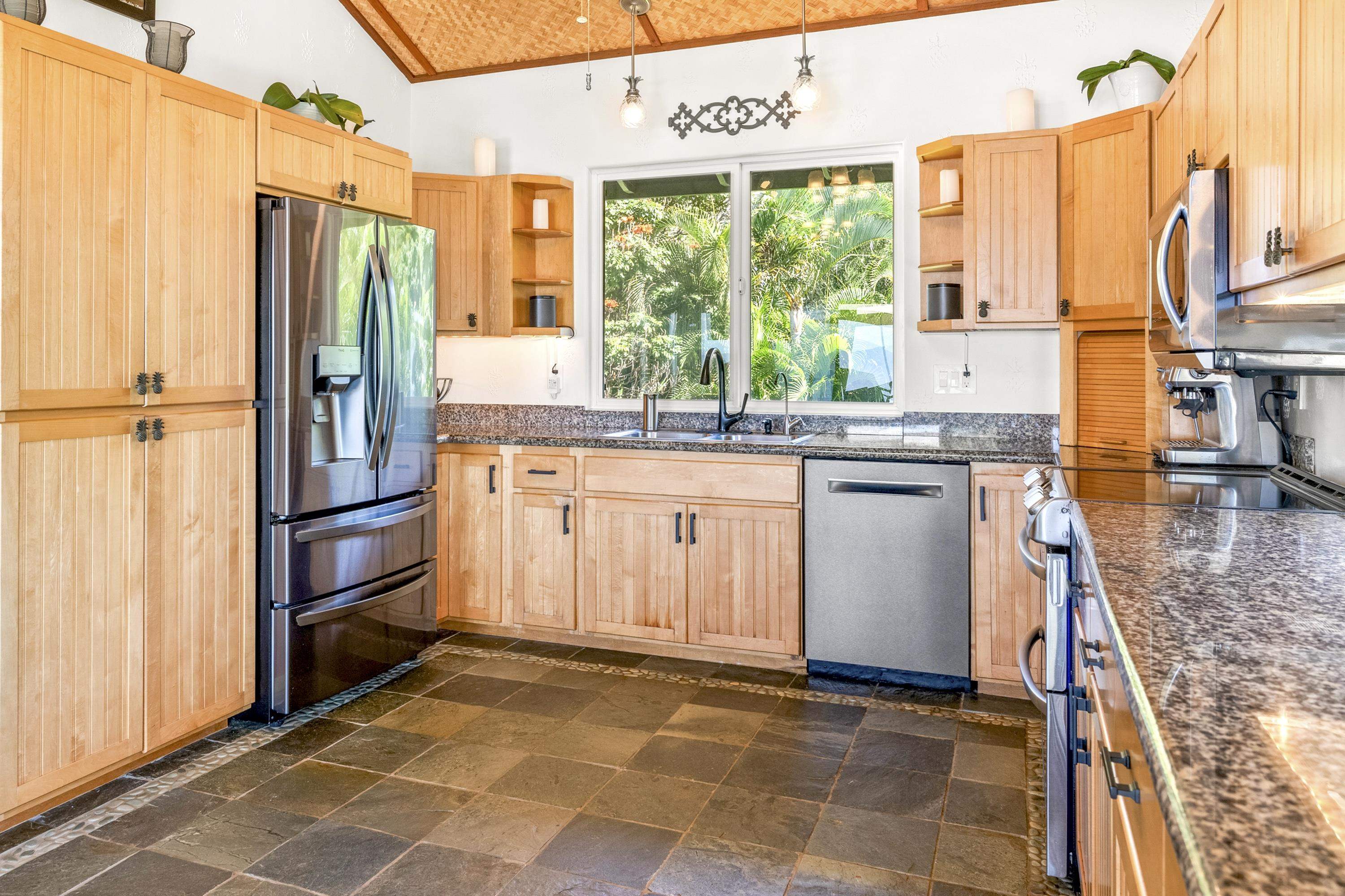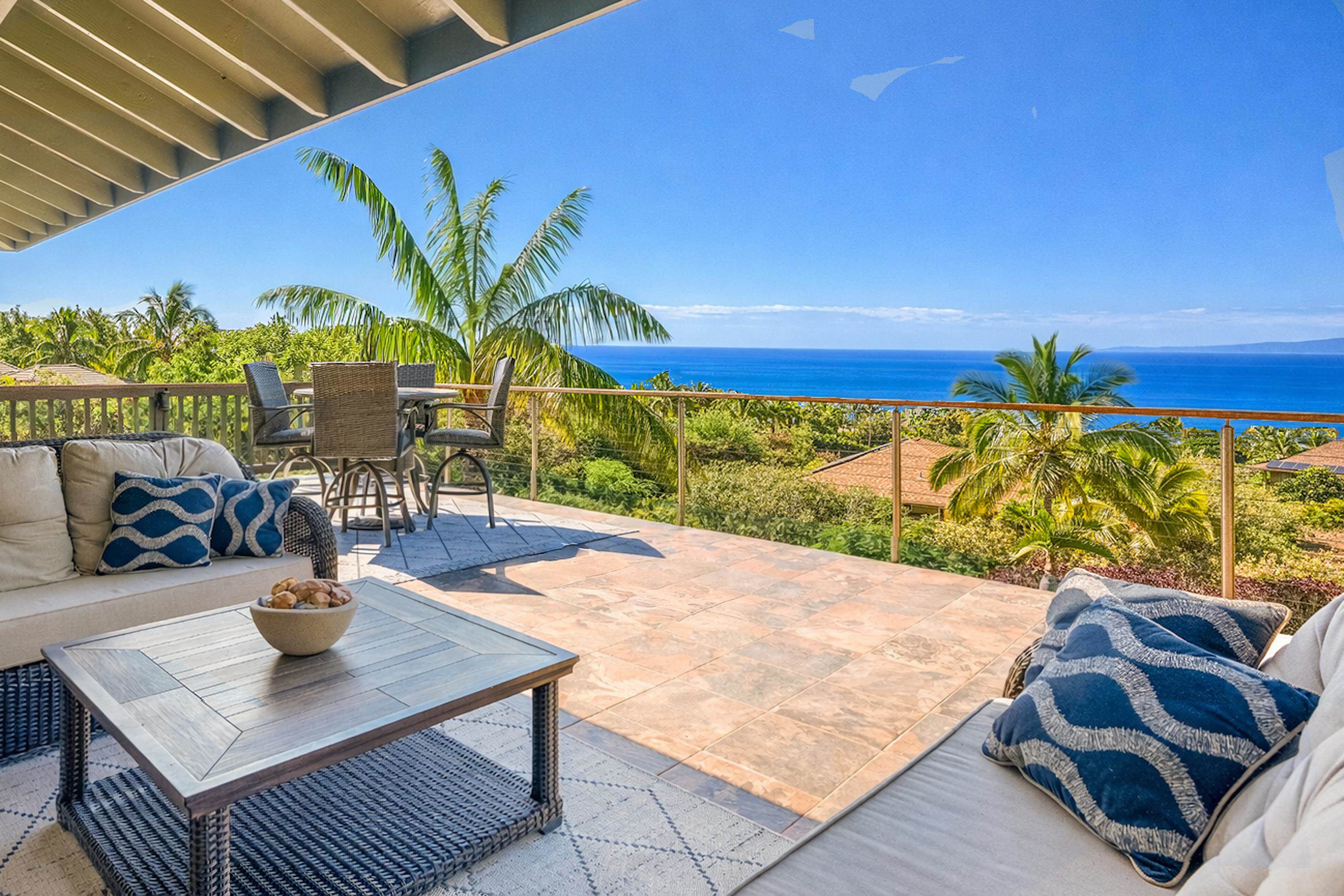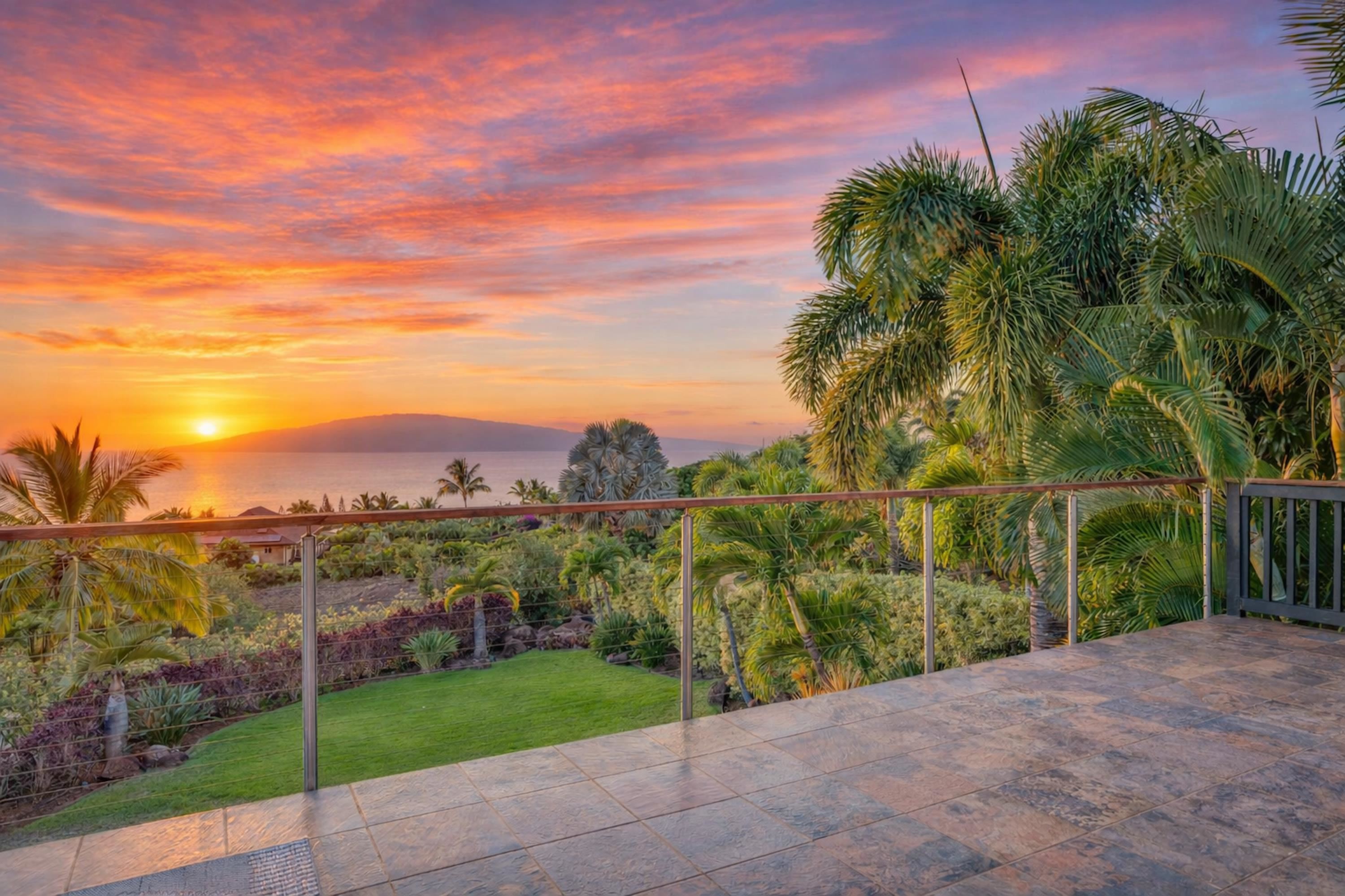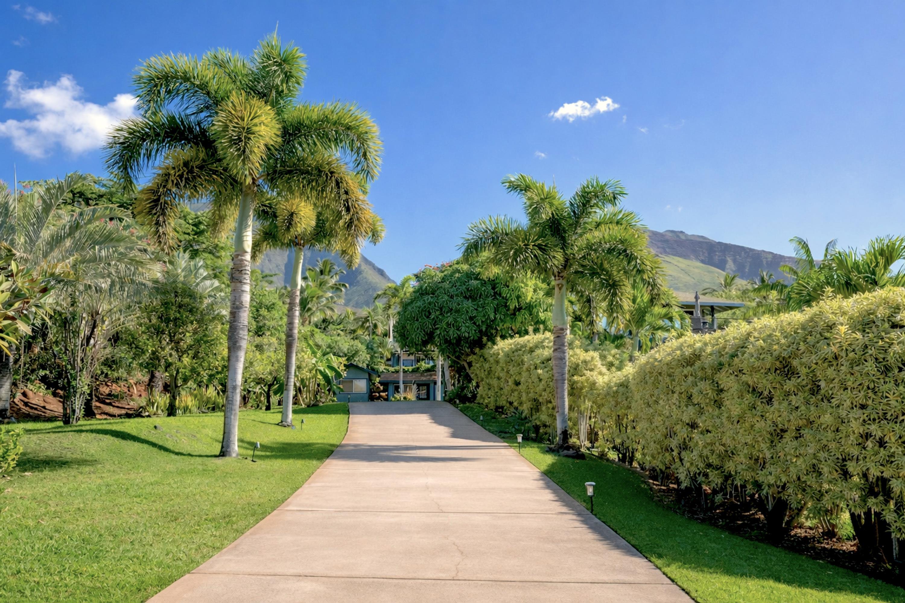 Set on 1.5 acres in desirable Launiupoko, this artistic residence offers expansive ocean views from nearly every room and throughout the property, framed by the dramatic backdrop of the West Maui Mountains. Enjoy ever-changing ocean vistas, nightly sunsets, and seasonal whale activity from home. Designed for Maui’s indoor-outdoor lifestyle, the home features generous lanais on two levels. The kitchen and main living area open seamlessly to a spacious lanai, ideal for both entertaining and everyday island living. The lower-level lanai provides direct access to the infinity-edge pool and outdoor living area. The primary suite features an en-suite bathroom and opens to the lanai and pool, while the second bedroom also enjoys outdoor access and ocean views. Distinct Hawaiian design elements include stamped plaster walls, bamboo ceilings, custom cabinet hardware, and detailed stone floorwork. Additional features include split AC units in each bedroom and upstairs, whole-house water filtration, reverse osmosis drinking water, solar water heating, mature tropical landscaping with irrigation and solar lighting, an established fruit orchard, carport parking, two storage sheds with electricity, EV charging outlet, and specialty window coverings. As the designated main home within a two-unit CPR, the property may offer additional flexibility for future expansion/garage, subject to applicable approvals.