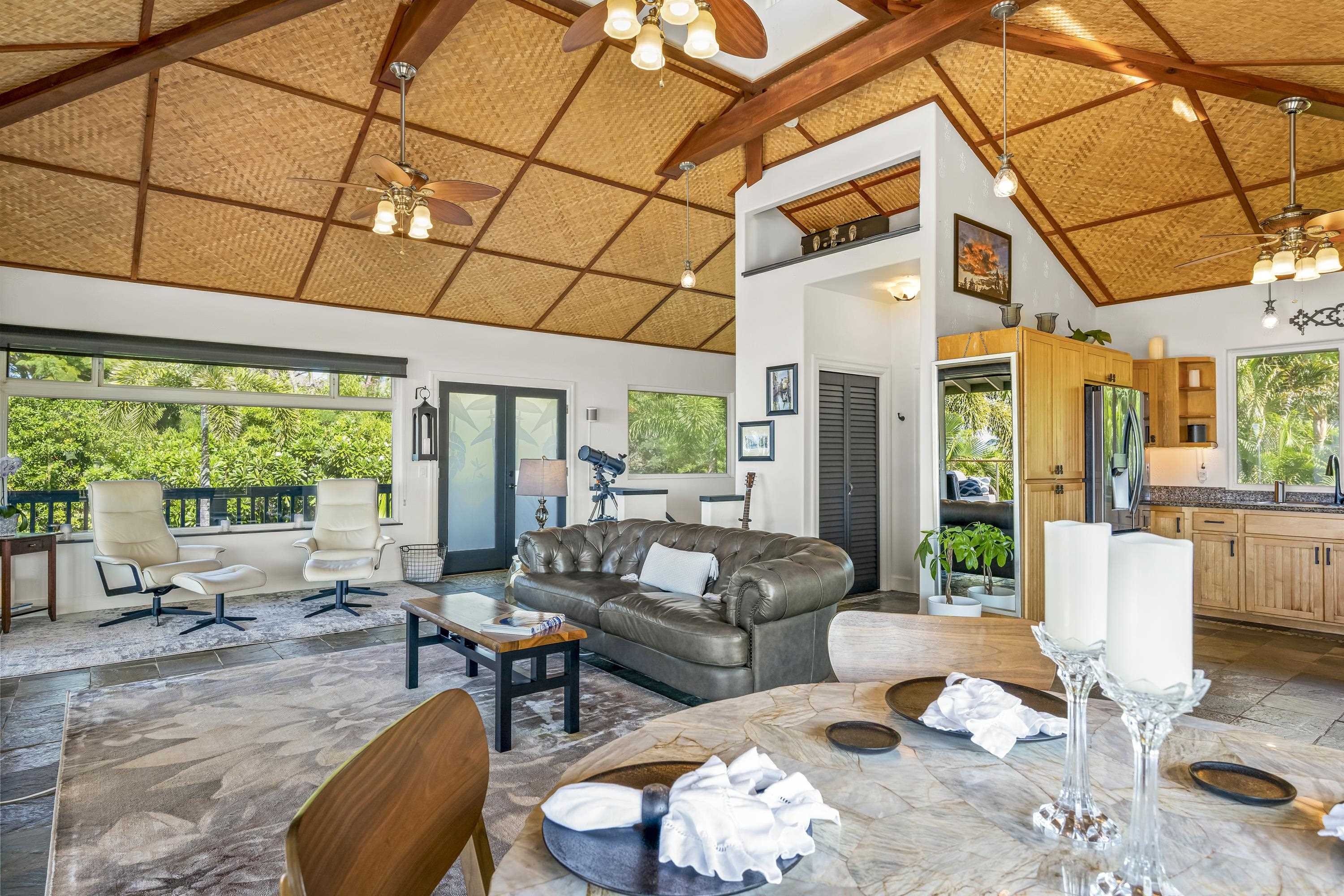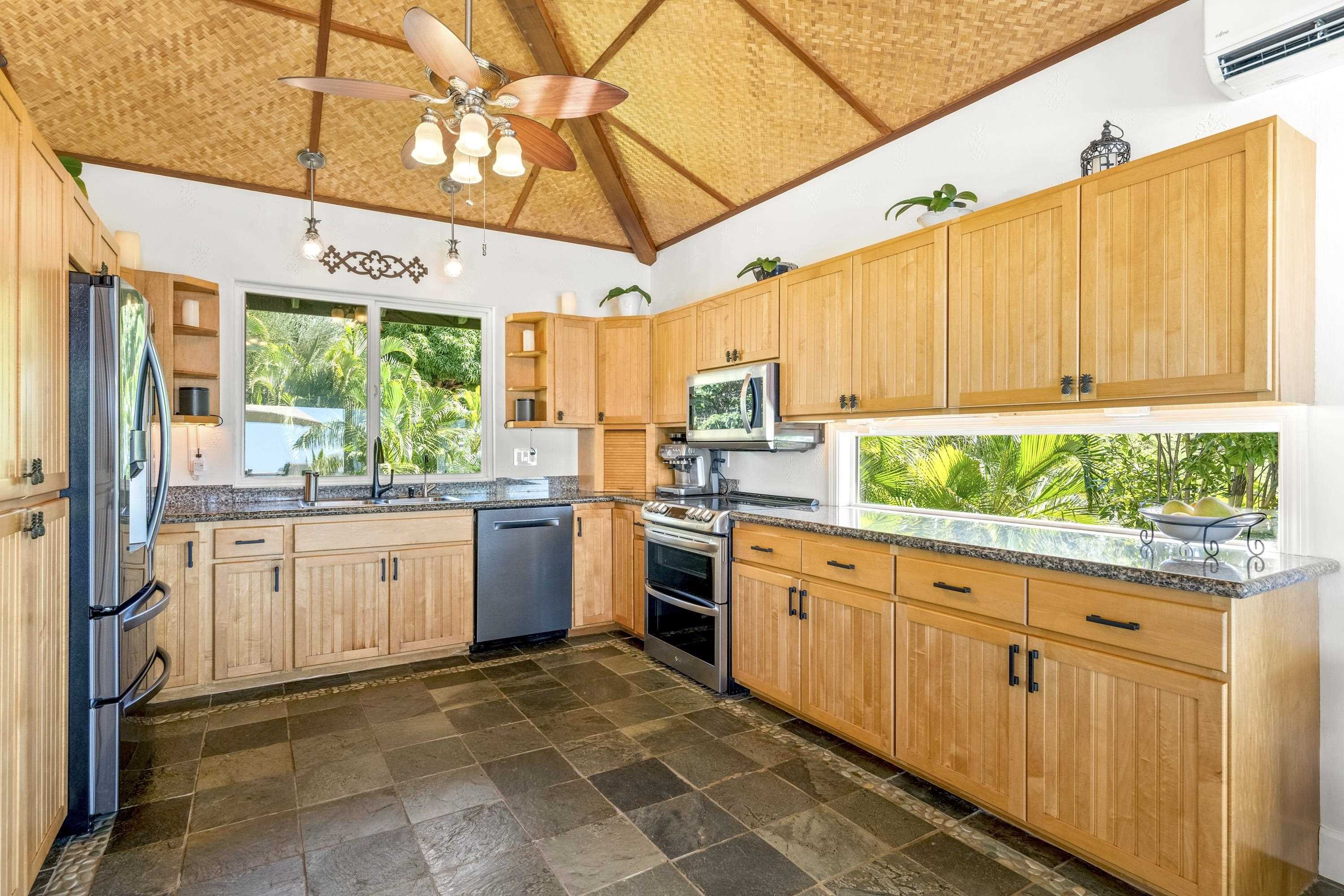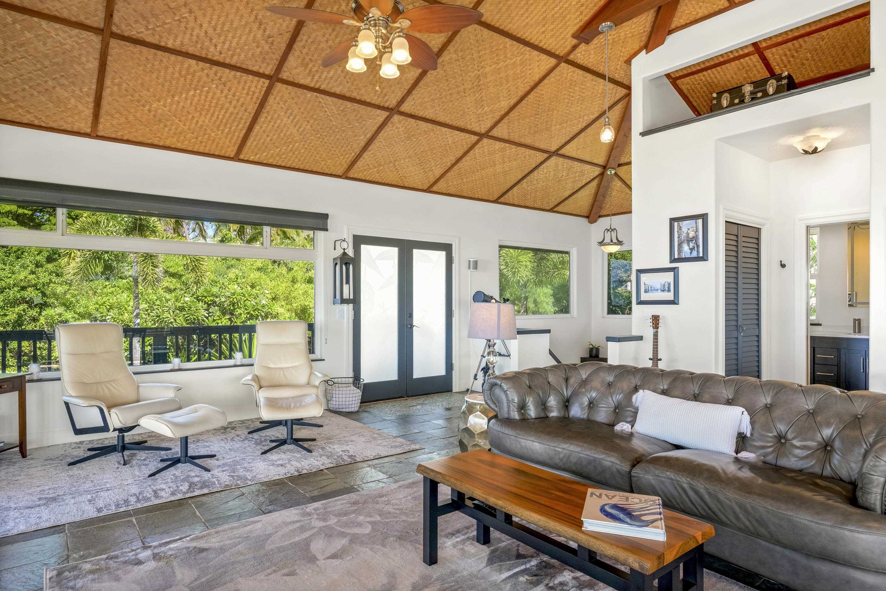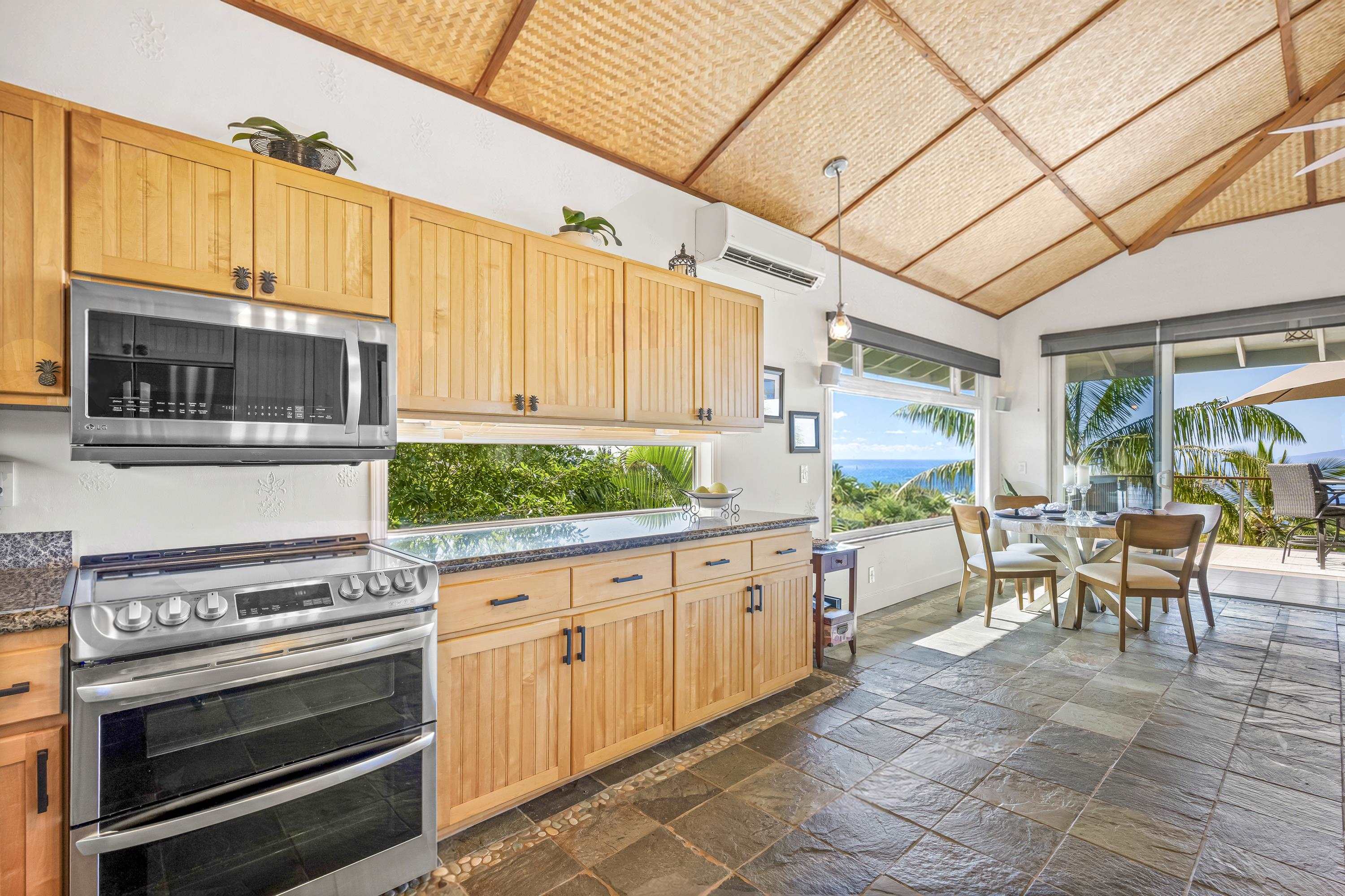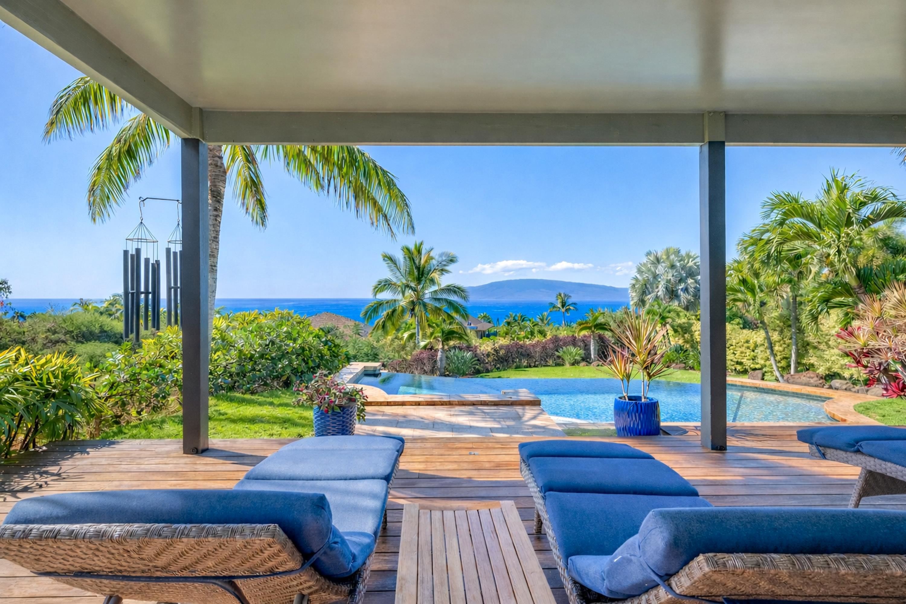 Set on 1.5 acres in desirable Launiupoko, this artistic residence offers expansive ocean views from nearly every room and throughout the property, framed by the dramatic backdrop of the West Maui Mountains. Enjoy ever-changing ocean vistas, nightly sunsets, and seasonal whale activity from home. Designed for Maui’s indoor-outdoor lifestyle, the home features generous lanais on two levels. The kitchen and main living area open seamlessly to a spacious lanai, ideal for both entertaining and everyday island living. The lower-level lanai provides direct access to the infinity-edge pool and outdoor living area. The primary suite features an en-suite bathroom and opens to the lanai and pool, while the second bedroom also enjoys outdoor access and ocean views. Distinct Hawaiian design elements include stamped plaster walls, bamboo ceilings, custom cabinet hardware, and detailed stone floorwork. Additional features include split AC units in each bedroom and upstairs, whole-house water filtration, reverse osmosis drinking water, solar water heating, mature tropical landscaping with irrigation and solar lighting, an established fruit orchard, carport parking, two storage sheds with electricity, EV charging outlet, and specialty window coverings. As the designated main home within a two-unit CPR, the property may offer additional flexibility for future expansion/garage, subject to applicable approvals.