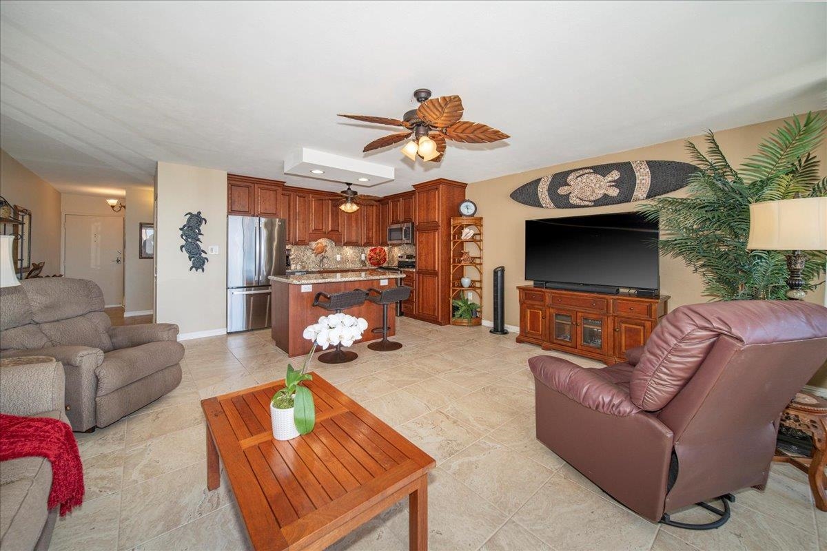 HOTEL-ZONED. SHORT-TERM VACATION RENTAL ALLOWED. Discover Kihei Ali‘i Kai B-303 — a beautifully remodeled third-floor residence with panoramic ocean views of Kaho‘olawe and Molokini. Perfectly located in the heart of South Kihei, just above the soft white sands of Kamaole Beach Park I, this unit offers the ideal blend of comfort, lifestyle, and investment potential. This spacious 1-bedroom, 1-bathroom condo features 700 sq. ft. of interior living space and a huge 150 sq. ft. lanai. The open-concept design invites natural light and island breezes, creating seamless flow between the living area and lanai. Kihei Ali'i Kai features resort-style amenities, including a large heated pool, hot tub, sauna, pickleball courts, barbecue area, and paddleboard storage — all just moments from white sand beaches and close to popular restaurants and shops. Turnkey, fully-furnished and income-ready — this is your opportunity to own a piece of Maui paradise.