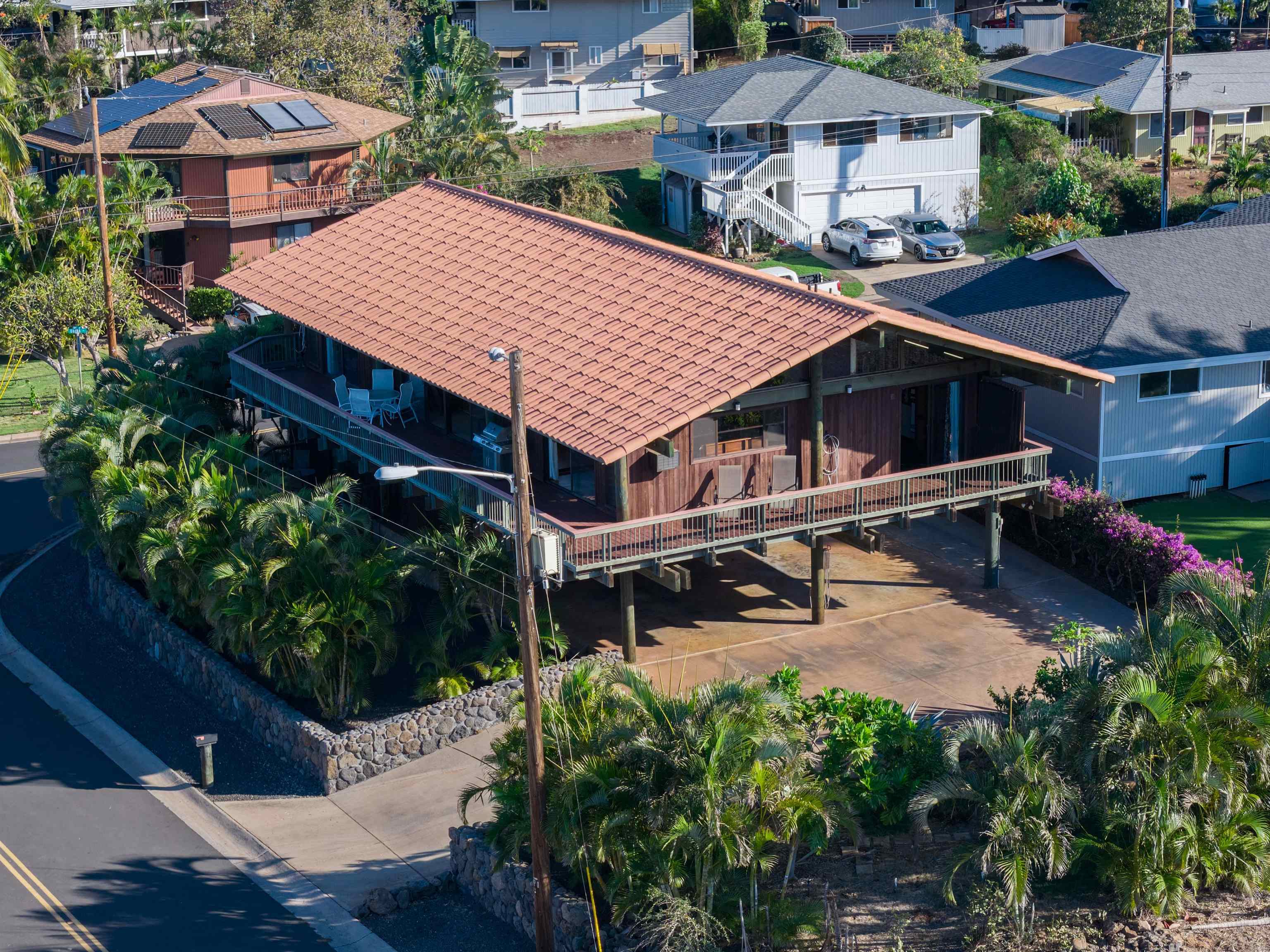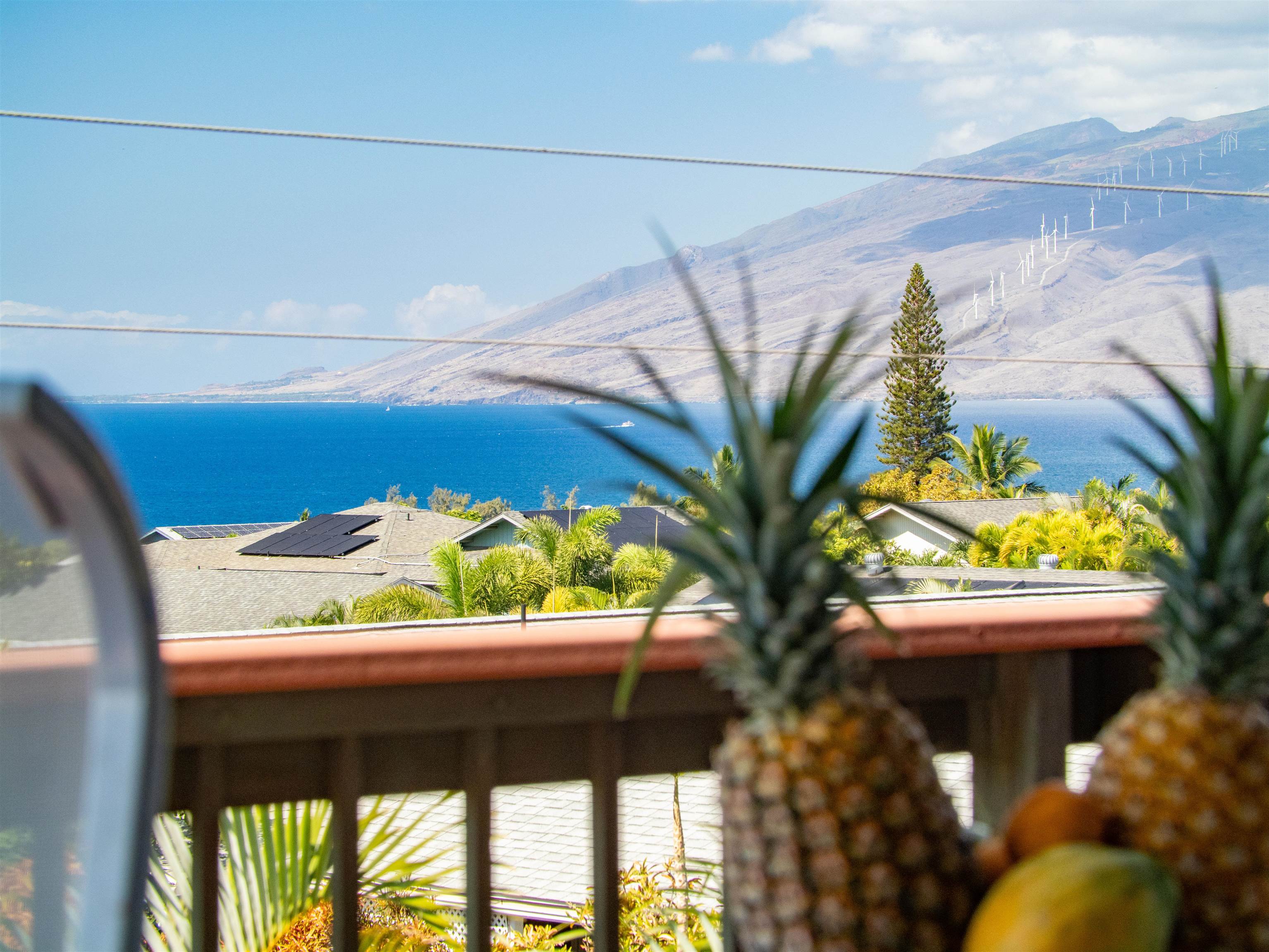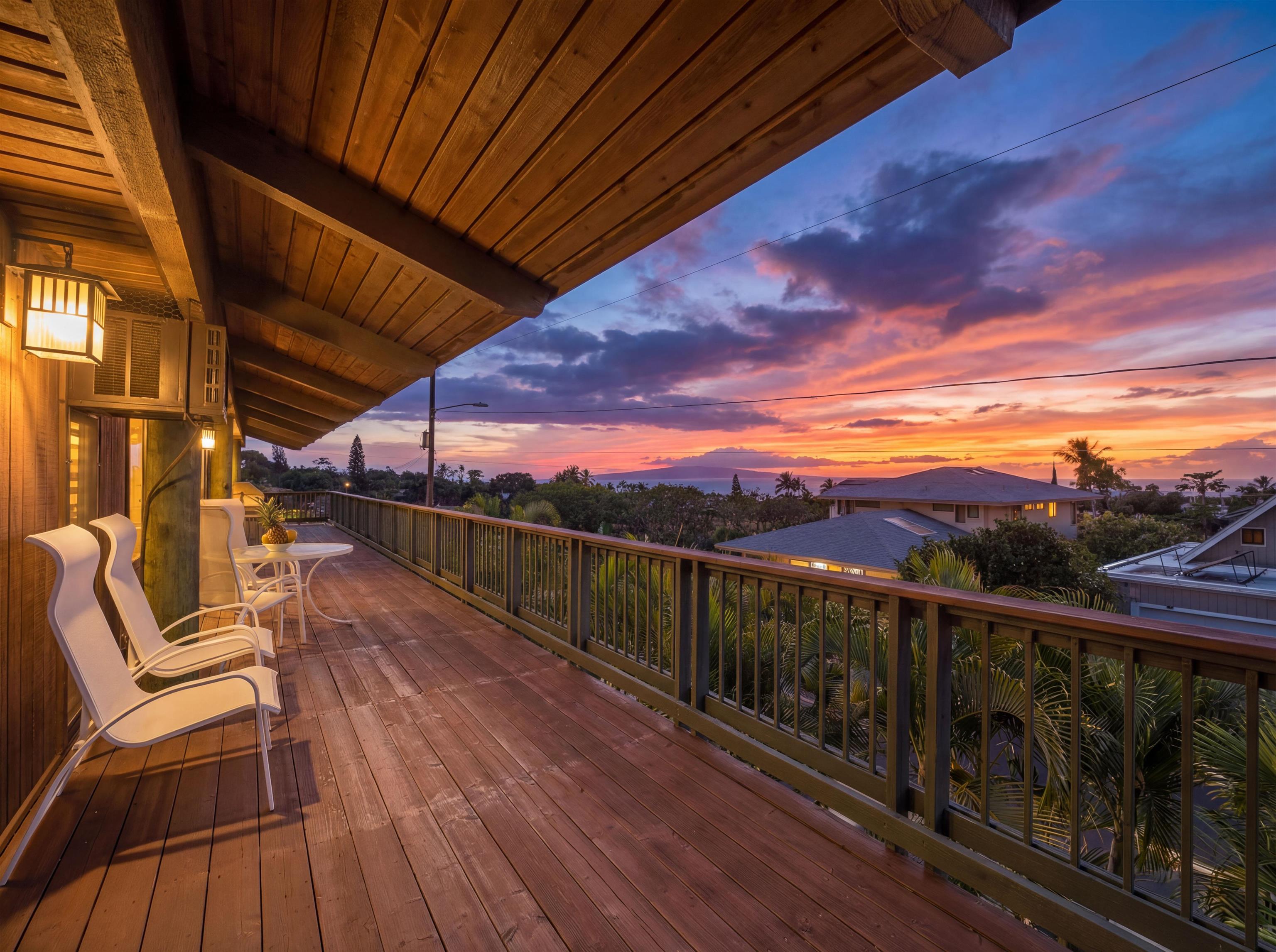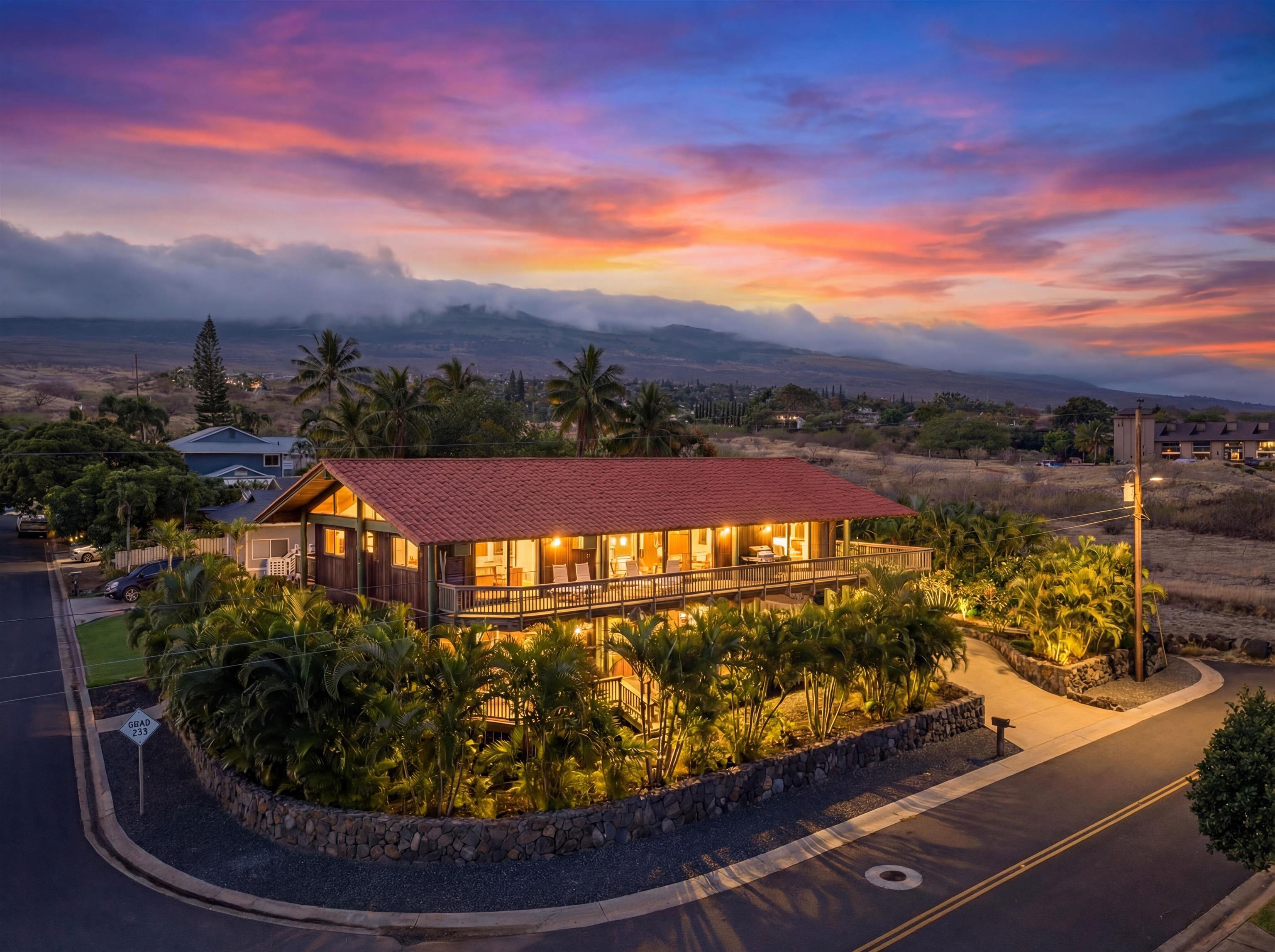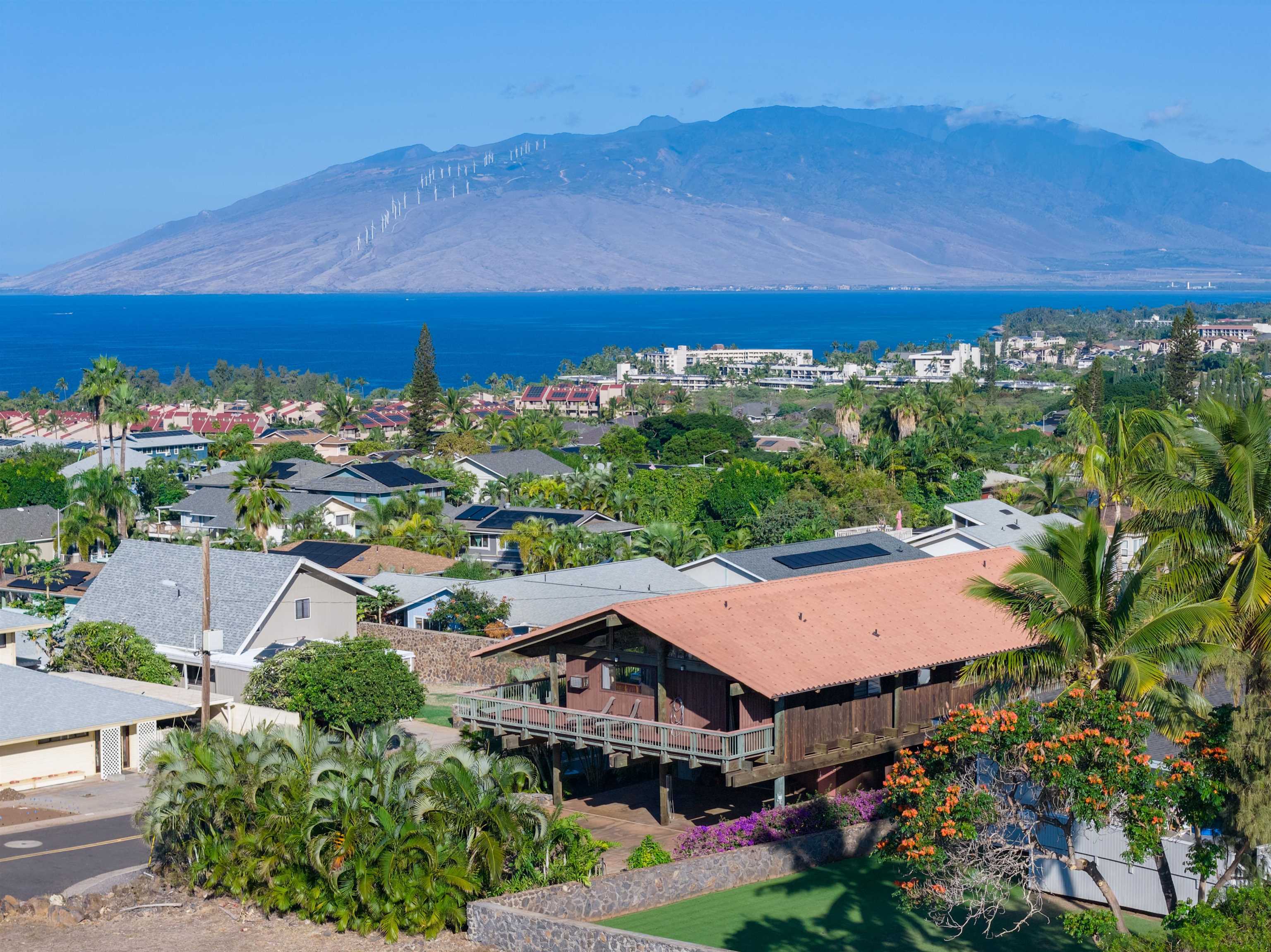 Few residences embody the spirit of refined Maui living quite like this exceptional Stiller pole home, gracefully positioned on a premier ocean-view lot at the gateway to Wailea. From sunrise to sunset, take in commanding panoramic vistas spanning the West Maui Mountains, Molokini, and the majestic slopes of Haleakala. Designed and built by the highly regarded Stiller Homes, this architecturally distinctive residence reflects enduring craftsmanship, quality construction, and timeless island elegance. Set at the end of Ohina Road, the elevated, end-of-road location offers rare privacy and unobstructed views above neighboring homes. Vaulted ceilings and a sophisticated open-concept great room create an inviting sense of space, flowing seamlessly to an expansive wraparound deck-an ideal setting for sunset soirees and effortless indoor-outdoor entertaining. The upper-level living area features three generously sized bedrooms and two beautifully appointed baths, while the lower level includes a flexible storage or workshop space. A private-entry, 934 sq. ft. one-bedroom ohana on the ground level has been lightly used for family visits and offers elegant accommodations for guests or extended living. Thoughtful recent upgrades enhance both form and function, including the reconfiguration of interior spaces to create a grand great room, a remodeled kitchen with custom cabinetry, fresh interior and exterior wood stain, enhanced lava rock wall surrounding the property and the addition of a curated garden area featuring mature lemon, orange, and papaya trees. Ample parking further complements this exceptional island retreat.