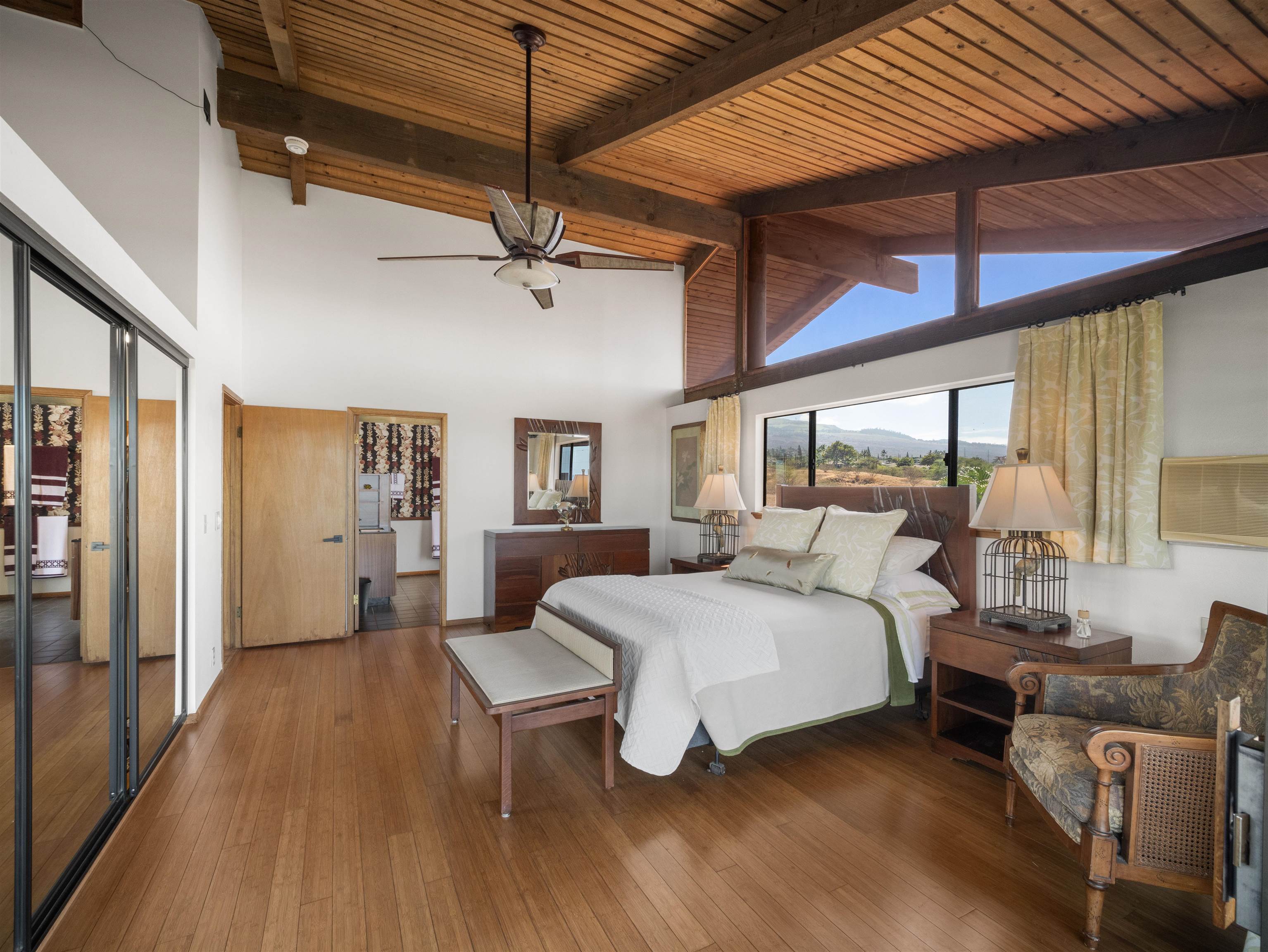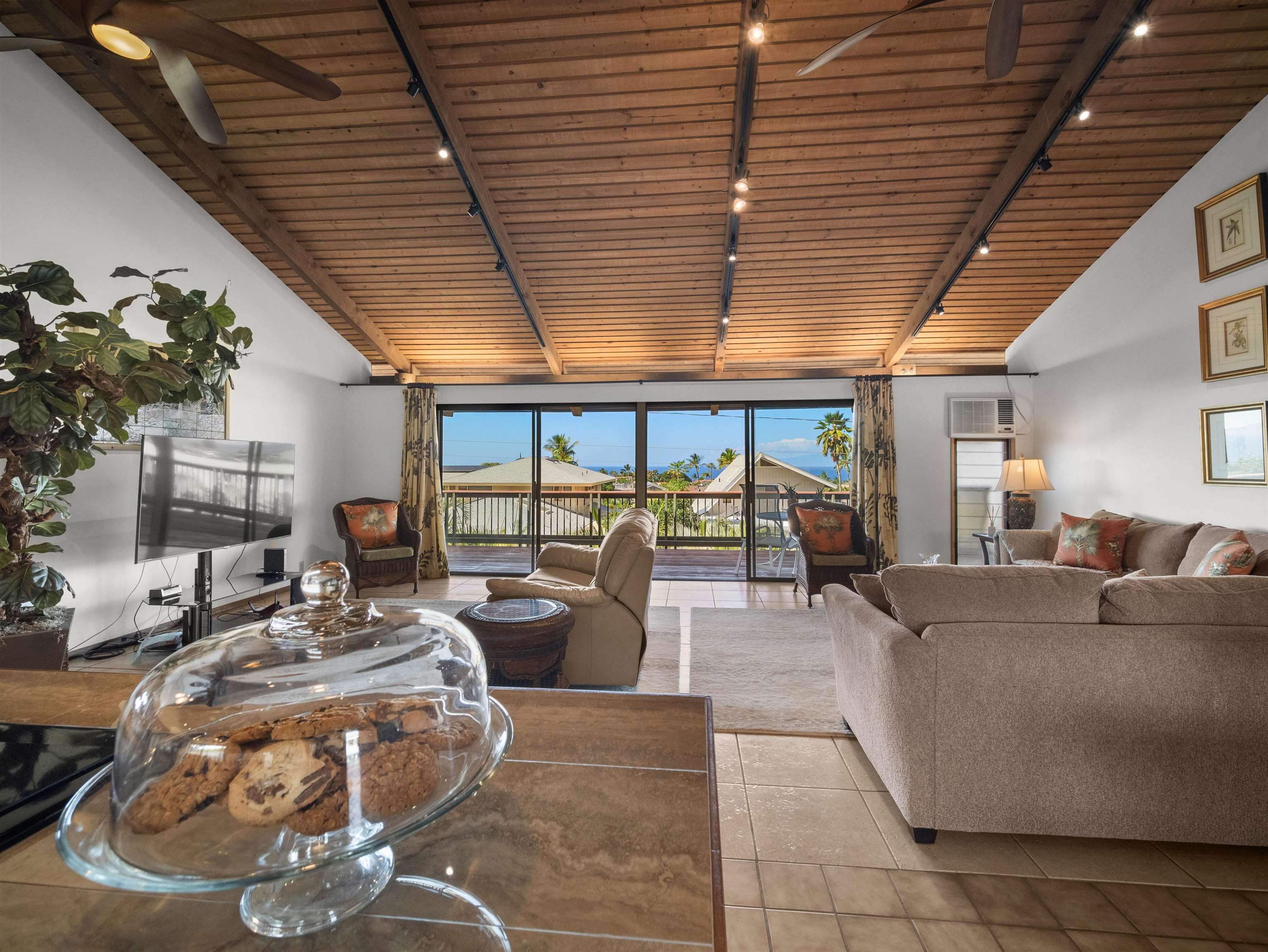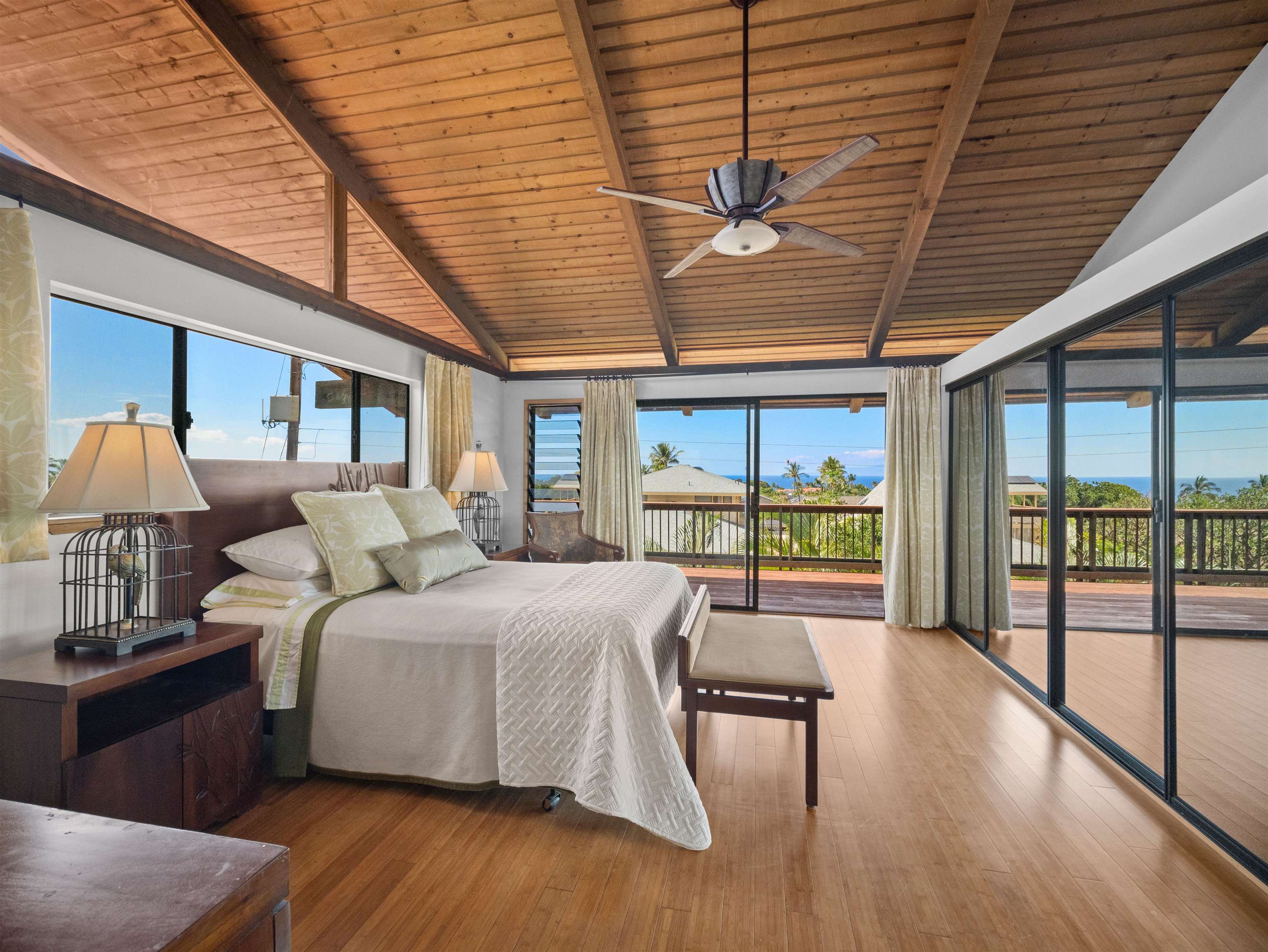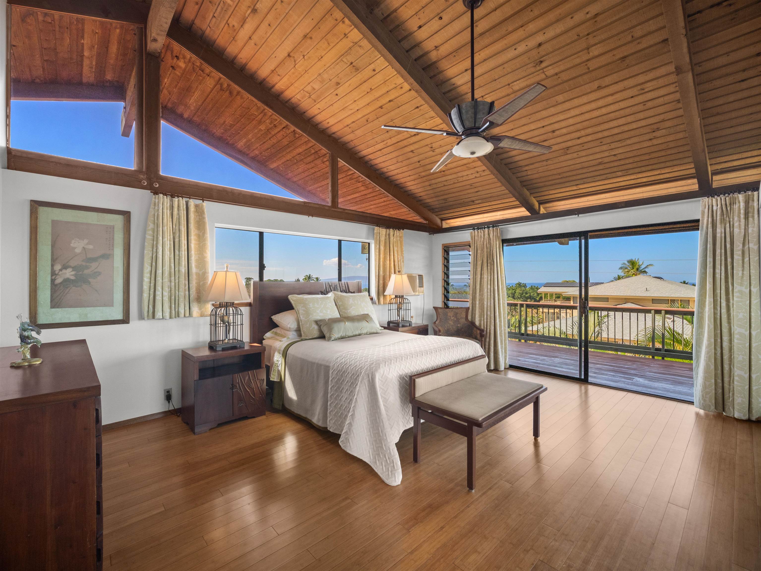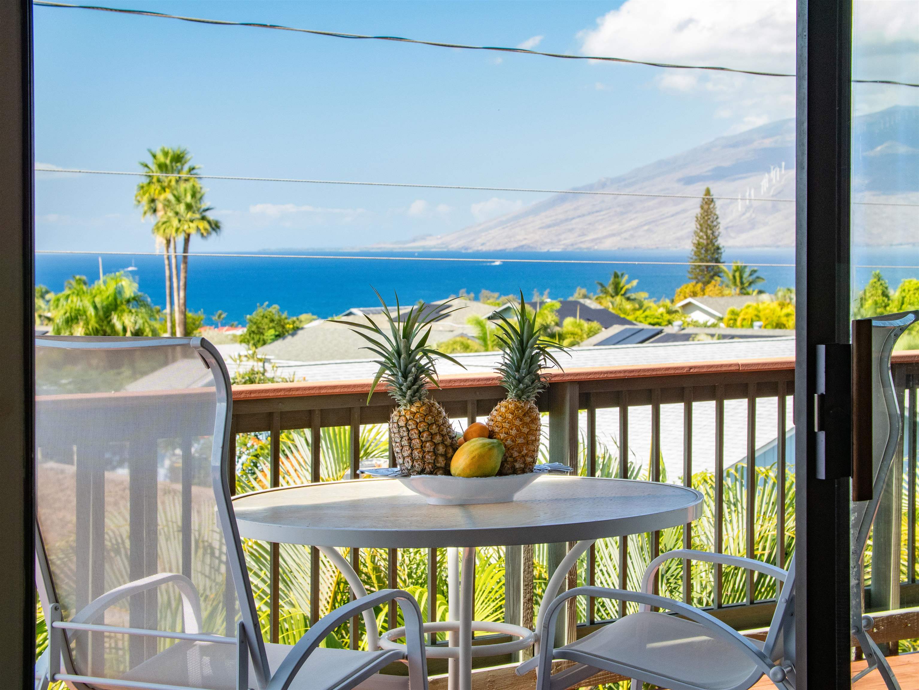 Few residences embody the spirit of refined Maui living quite like this exceptional Stiller pole home, gracefully positioned on a premier ocean-view lot at the gateway to Wailea. From sunrise to sunset, take in commanding panoramic vistas spanning the West Maui Mountains, Molokini, and the majestic slopes of Haleakala. Designed and built by the highly regarded Stiller Homes, this architecturally distinctive residence reflects enduring craftsmanship, quality construction, and timeless island elegance. Set at the end of Ohina Road, the elevated, end-of-road location offers rare privacy and unobstructed views above neighboring homes. Vaulted ceilings and a sophisticated open-concept great room create an inviting sense of space, flowing seamlessly to an expansive wraparound deck-an ideal setting for sunset soirees and effortless indoor-outdoor entertaining. The upper-level living area features three generously sized bedrooms and two beautifully appointed baths, while the lower level includes a flexible storage or workshop space. A private-entry, 934 sq. ft. one-bedroom ohana on the ground level has been lightly used for family visits and offers elegant accommodations for guests or extended living. Thoughtful recent upgrades enhance both form and function, including the reconfiguration of interior spaces to create a grand great room, a remodeled kitchen with custom cabinetry, fresh interior and exterior wood stain, enhanced lava rock wall surrounding the property and the addition of a curated garden area featuring mature lemon, orange, and papaya trees. Ample parking further complements this exceptional island retreat.