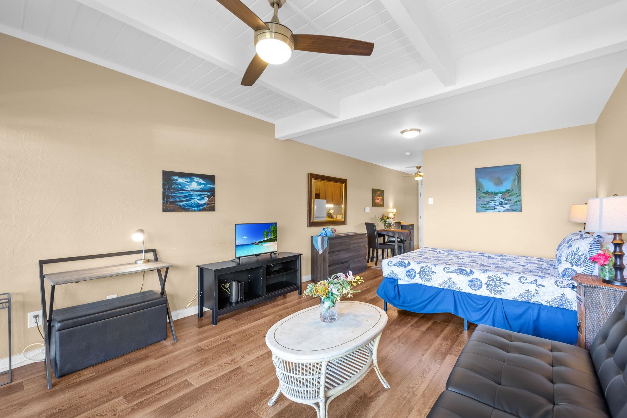 Ground floor Kihei Bay Surf studio with ocean views from the lanai, located directly across the street from Kalepolepo Beach Park. This nicely updated offering with custom tile walk in shower and updated finished throughout presents a rare and unique opportunity to own two side-by-side ground floor units (#107 also available), ideal for flexible use, extended living space, or dual rental potential. Enjoy easy access with a few stairs, a private lanai that captures ocean views, and the convenience of a central Kihei location close to beaches, dining, shopping, and outdoor activities. Kihei Bay Surf is a popular complex featuring a pool, hot tub, BBQ area, and on-site laundry, making it well suited for both personal enjoyment and investment. A distinctive opportunity in one of Kihei's most accessible beachfront neighborhoods. Listed well under county assessed value and maintenance fees INCLUDE electric! Schedule your private showing today!