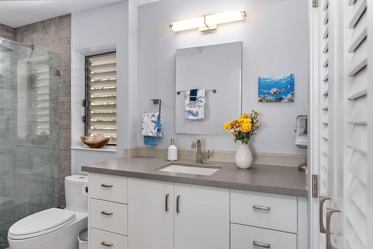 Step into this stunning, beautifully remodeled 1 bedroom, 2 bath condo, and be immediately captivated by sweeping ocean views that stretch from Makena to the West Maui Mountains. Inside, soaring ceilings and abundant natural light create an open, airy living space that seamlessly frames the expansive ocean panorama. The condo has been thoughtfully updated with modern finishes throughout, including upgraded kitchen appliances, walk-in showers, custom vanities and lighting, split air conditioning, premium roller shades, and luxurious furnishings. The spacious bedroom features its own private lanai, additional storage, and a beautifully appointed en-suite bath. Designed for comfort and versatility, this generously sized condo easily accommodates four guests with a sleeper sofa, and inviting furnishings. Located in a highly sought-after community just above the Wailea Blue Golf Course. This exceptional property offers the perfect blend of tranquility and convenience, with Wailea's premier restaurants, bars, and shopping just a short and easy walk away. Offered fully furnished with only minor exclusions, this is a rare opportunity to own a turnkey retreat in the coveted Wailea Ekolu community. Do not miss the chance to make this exceptional island getaway your own!