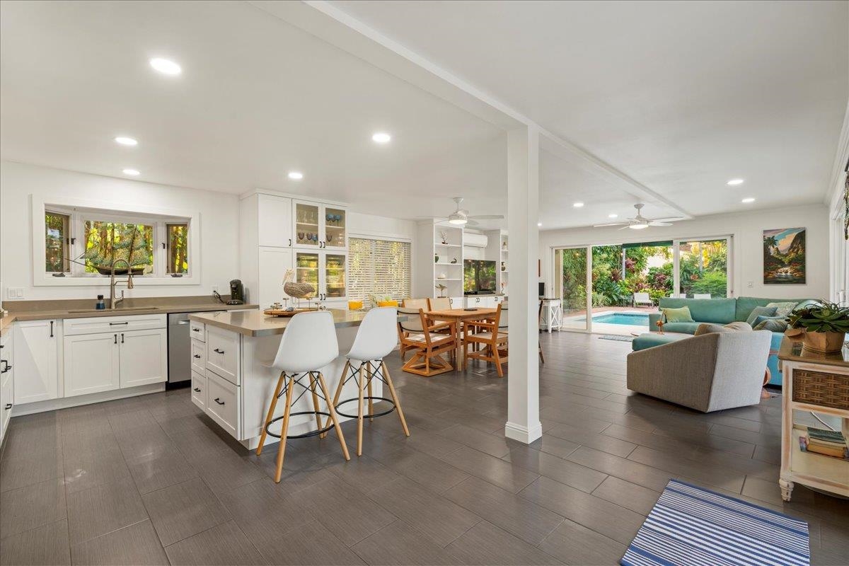 Wailea Kai is one of the closest communities to the beach! 3 BR 2.5 BA with a pool and easy walking distance to Keawakapu Beach. This recently updated home offers a unique living style with the master on the main level and 2 bedrooms tucked away separately with a jack & jill bath, all 3 with vaulted ceilings. The master has a large lanai that overlooks the pool and lawn area. A major remodel of the living room and kitchen were completed last year, including all new appliances and furnishings. Relax in the openness of the living room and kitchen, which includes a large island with numerous sitting spaces, all overlooking the pool through numerous windows and sliding doors. Enjoy the large pool and covered lanai's with a very private feel with no road noise, surrounded by beautiful gardens and fruit trees. Split A/C units in the living room and all 3 bedrooms. Capitalize on very low electric bills with 22 owned solar panels under the banked system, and a solar hot water system. 2 car garage. Located at the end of a quiet cul-de-sac.