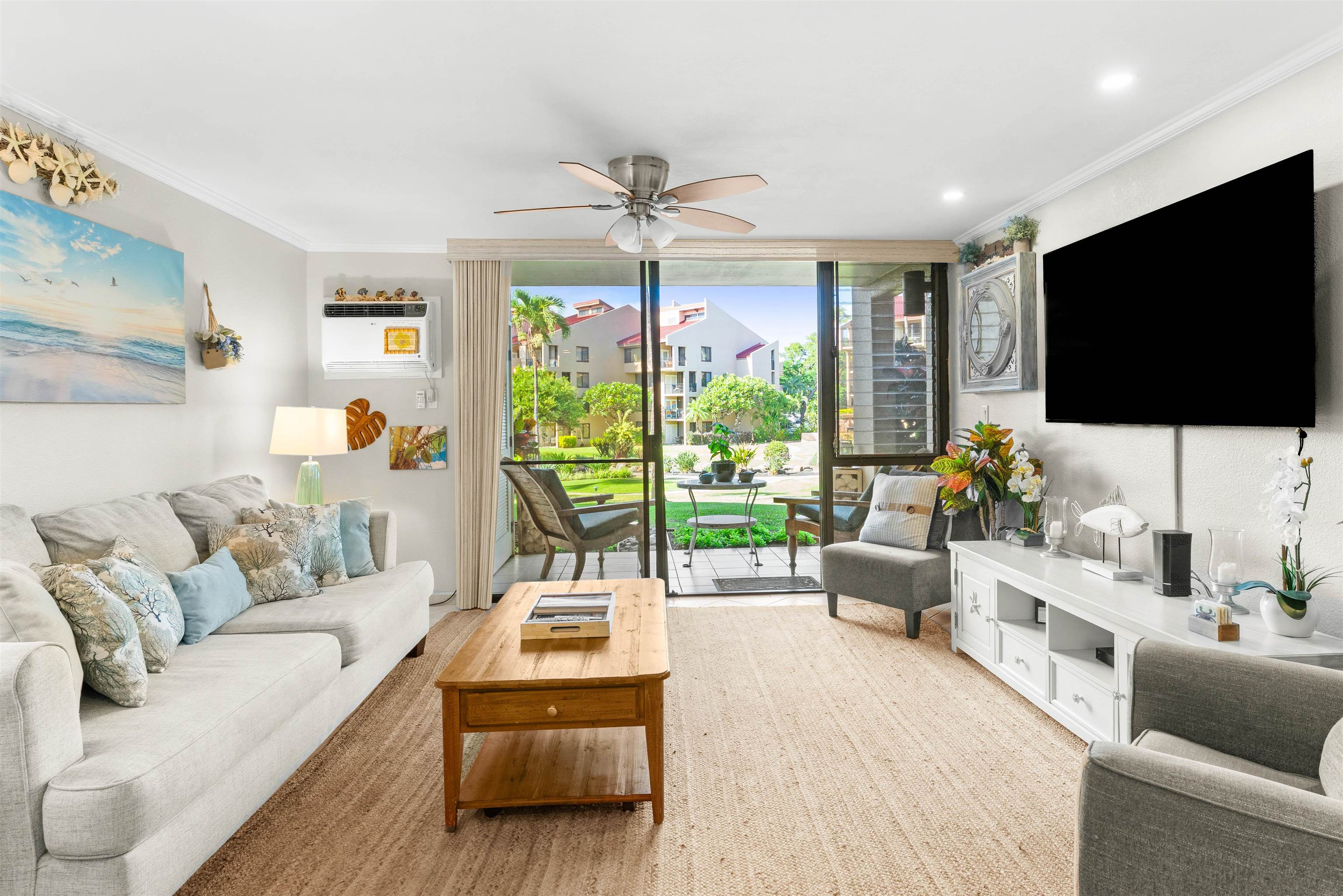 Turn-key, ground-floor condo in the highly desirable Kamaole Sands resort, ideally located in the center of the courtyard with easy access to the pool, gym and BBQ areas. Enjoy garden views with a peek of the ocean and sunset skies from the private lanai. This 1 bedroom, 2 bath unit is updated with granite countertops, newer kitchen cabinetry, walk-in showers and tile flooring throughout the entire condo. Situated directly across the street from Kamaole Beach Park III—one of Maui’s top beaches—and close to restaurants, shopping, the Kihei boat ramp, golf courses, and the Shops at Wailea. A proven short-term vacation rental and ideal personal getaway. Resort amenities include a large pool, children’s wading pool, two hot tubs, fitness center, BBQ pavilion, waterfalls and ponds, four tennis courts, and beautifully maintained tropical grounds.