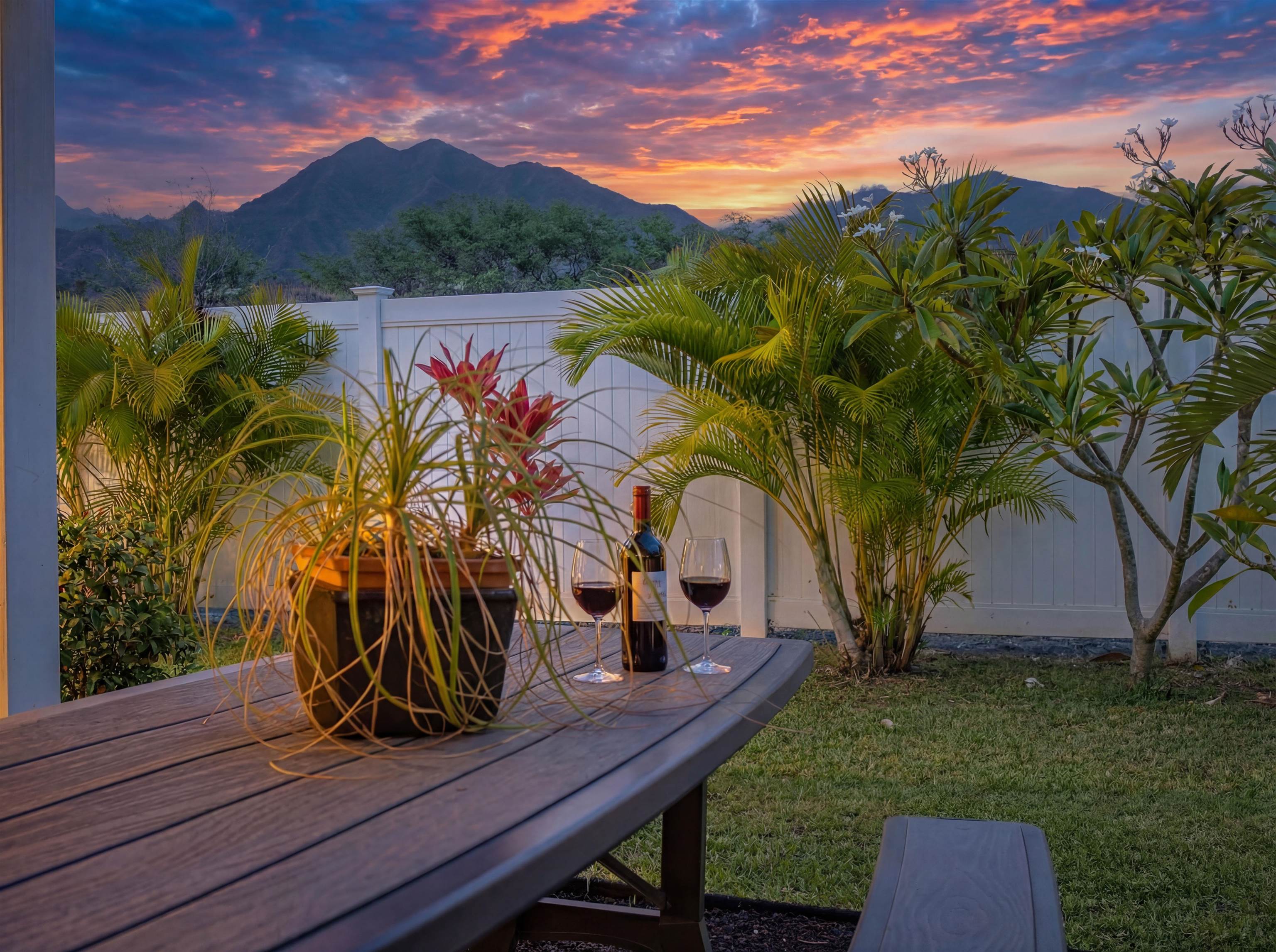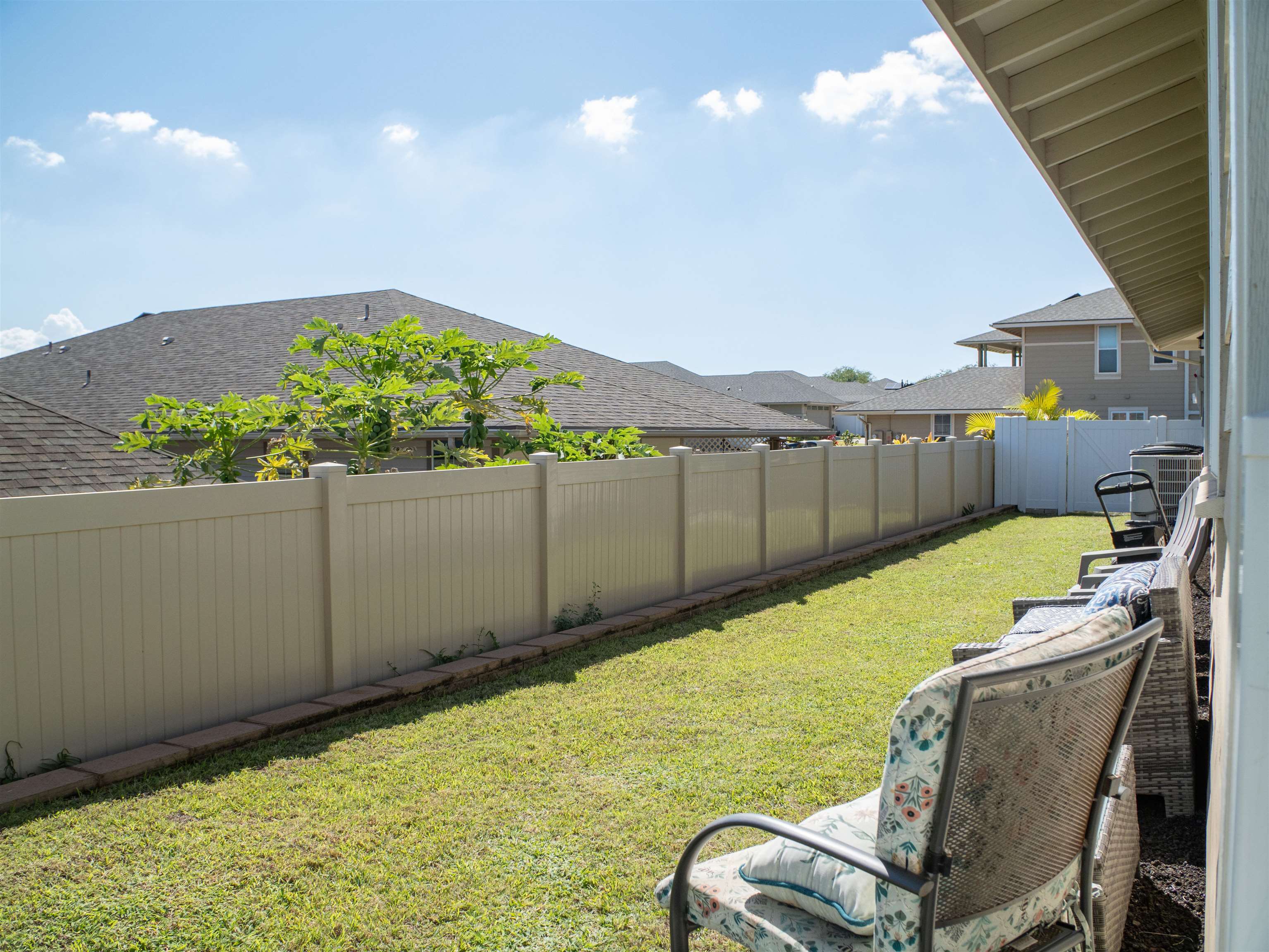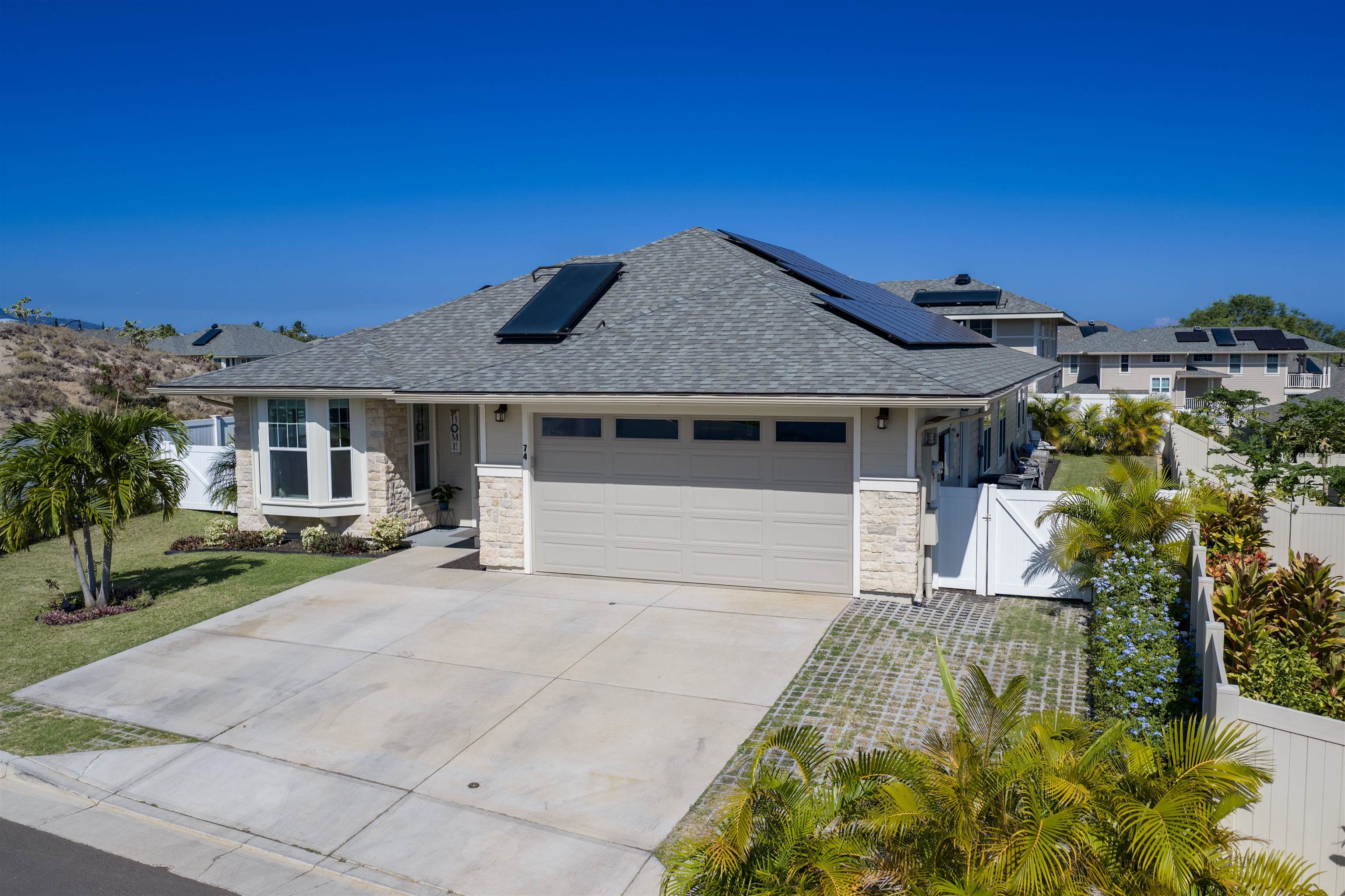 Welcome to this nearly new, single-level 3-bedroom home in The Parkways at Maui Lani, one of Central Maui’s most desirable neighborhoods. Built in 2022 and thoughtfully enhanced since, this residence offers modern comfort, functionality, and beautifully curated outdoor spaces. The home features forced-air air conditioning throughout, including the garage, along with upgraded lighting, ceiling fans, and custom blinds in every room. The open, light-filled interior is complemented by upgraded GE appliances, upgraded countertops in the kitchen and bathrooms, a new kitchen faucet, and a full-size GE washer and dryer. Outside, the property truly shines. A huge extended driveway with grasscrete pavers easily accommodates four vehicles, with additional daytime parking available on the quiet dead-end street. The fully landscaped front and back yards include complete irrigation, walking paths, multiple seating and picnic areas, and mature tropical landscaping featuring plumeria, ti leaf, areca palms, and more—creating a peaceful, private outdoor retreat. Multiple exterior gates have been added, including a wide access gate suitable for a boat, golf cart, or future shed, with a rear gate leading toward the golf course. New fencing and exterior lighting enhance both security and evening ambiance. The entry and lanai have been freshly painted in a modern slate gray for a clean, updated look. Energy efficiency is a plus with 35 leased solar panels and three Tesla batteries, helping reduce electric costs and provide added peace of mind. Move-in ready, flexible, and impeccably maintained, this home offers the rare opportunity to enjoy near-new construction with extensive upgrades already completed—all within a premier Maui Lani community close to golf, shopping, schools, and island conveniences.