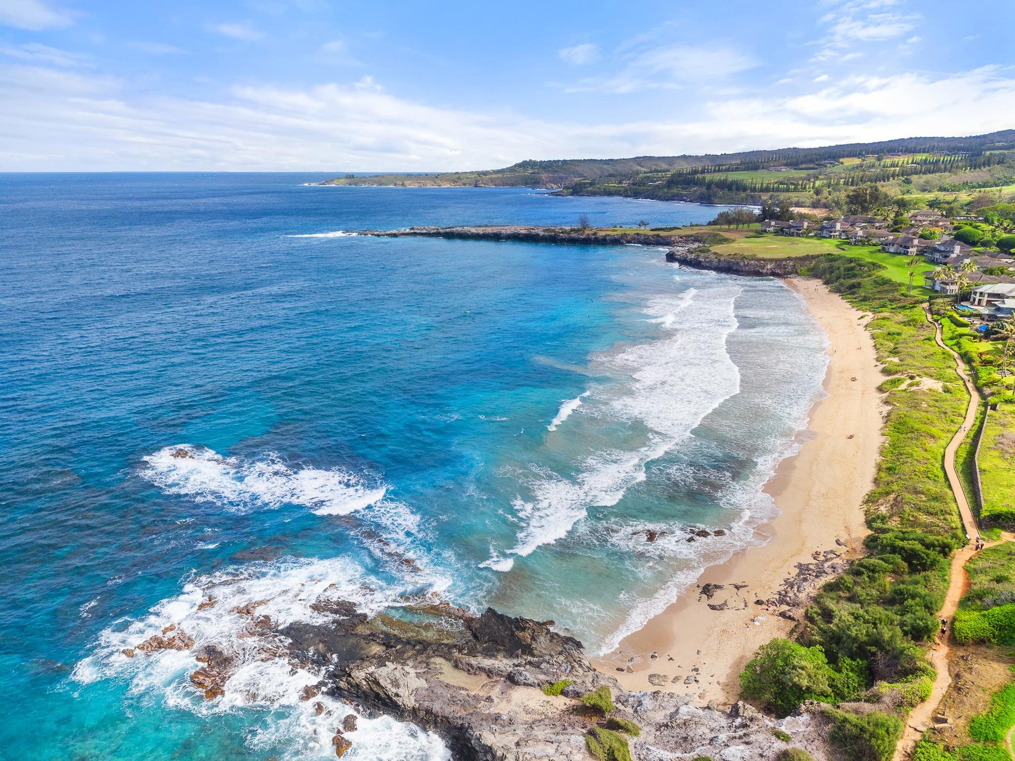 Feel the warm island breeze and the sparkle of the Pacific the moment you enter this beautifully remodeled oceanfront 1-bedroom, 1.5-bath villa in the gated community of Kapalua Bay Villas. Bathed in natural light and designed with a sophisticated Hawaiian-inspired aesthetic, this bi-level retreat offers sweeping ocean views and views of Molokai from nearly every room, effortlessly blending indoor comfort with the serene beauty of Maui. The open-concept living areas invite you to relax and unwind, with the living, dining, and kitchen spaces flowing effortlessly together. Enjoy the fresh Maui air or relax in cool A/C comfort. Expansive windows frame the views and a covered ocean-view lanai provides the perfect spot for morning coffee or evening cocktails while taking in the view and island breezes. The kitchen is both elegant and functional, featuring light-toned cabinetry that comes fully equipped for gourmet cooking and entertaining, a tiled backsplash, large Thermador refrigerator, stainless steel Café appliances, a wine fridge, and a breakfast bar ideal for casual dining. A convenient half bath on the main level enhances daily comfort and entertaining ease. Ascend to the upper level, where the primary suite welcomes you with a king-sized bed, stunning views, and a lanai overlooking the Pacific. The beautifully updated en-suite bathroom invites you in with its custom-tiled shower and luxurious touches and offers a peaceful sanctuary after island adventures. A queen sleeper sofa on the main level adds flexibility for families or small groups, comfortably accommodating up to four guests. The condo includes a private exterior storage closet, ideal for storing bikes, beach gear, surfing and snorkeling equipment, as well as tennis or pickleball essentials. As a resident of Kapalua Bay Villas, you’ll enjoy world-class resort amenities just off the coastline, including three heated ocean-view pools, tennis courts with ghost lined pickleball courts within, and gas BBQs, all with the luxury of being just steps away from the scenic Kapalua Coastal Trail. In addition, nearby amenities like the Kapalua Tennis Gardens host an additional 16 pickleball courts to enjoy. Golf lovers will appreciate the close proximity to the Kapalua Plantation Course, making this location ideal for those who love pickleball, tennis, or golf. Kapalua Bay Beach is just a short two-minute walk away, with Oneloa Beach nearby as well.