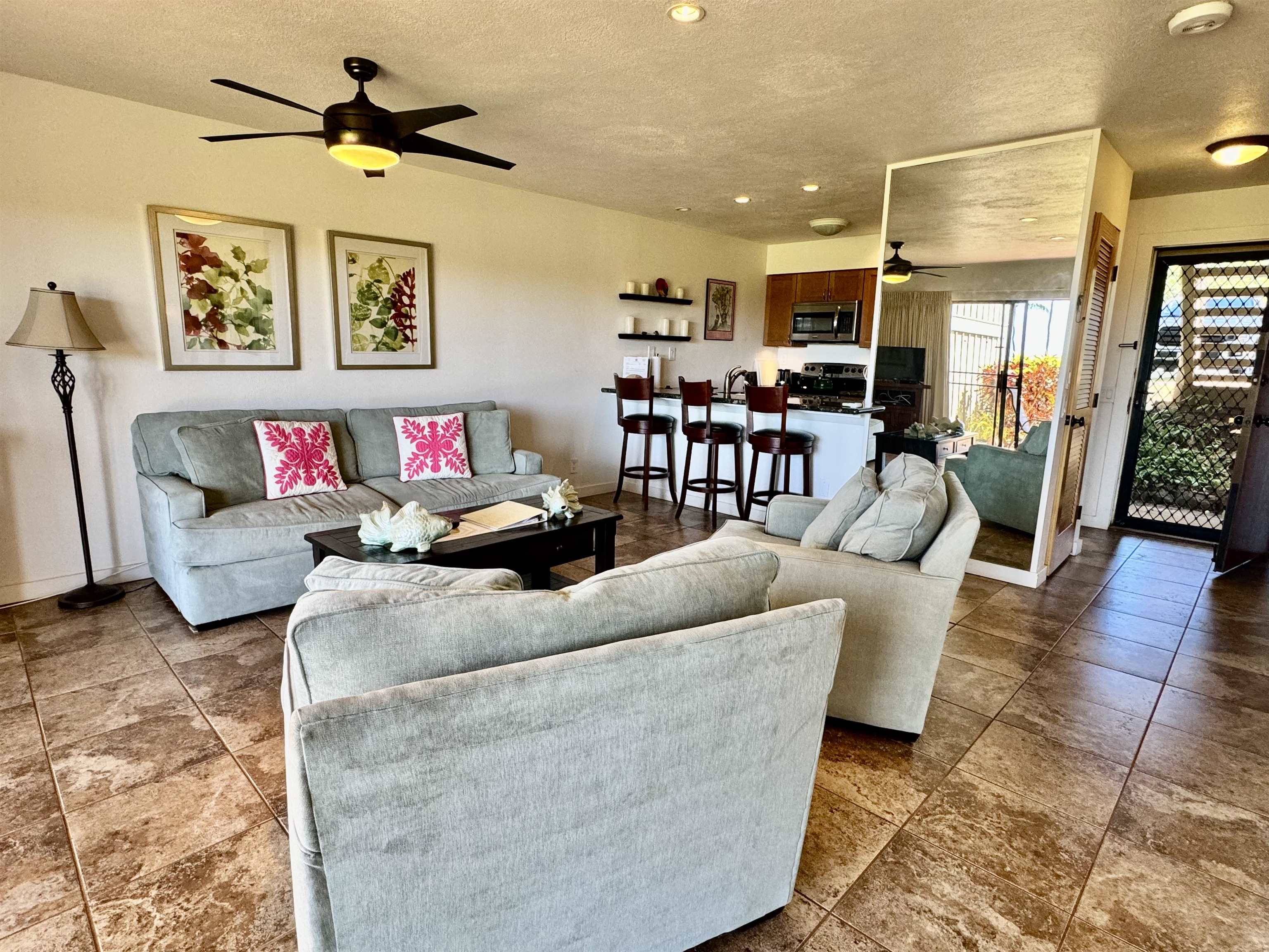 INCREDIBLE Papohaku Beach views from this lovely updated ground floor unit at Ke Nani Kai. The suite includes tile floors, granite countertops and stainless appliances. Washer/Dryer and eating bar with stools. Possible rental potential or move in ready. Being sold as-is and turnkey. Ke Nani Kai has tennnis/pickleball, pool, jacuzzi, bbq's and a clubhouse. Enjoy being in paradise, close to the white sand beaches and sparkling blue ocean!