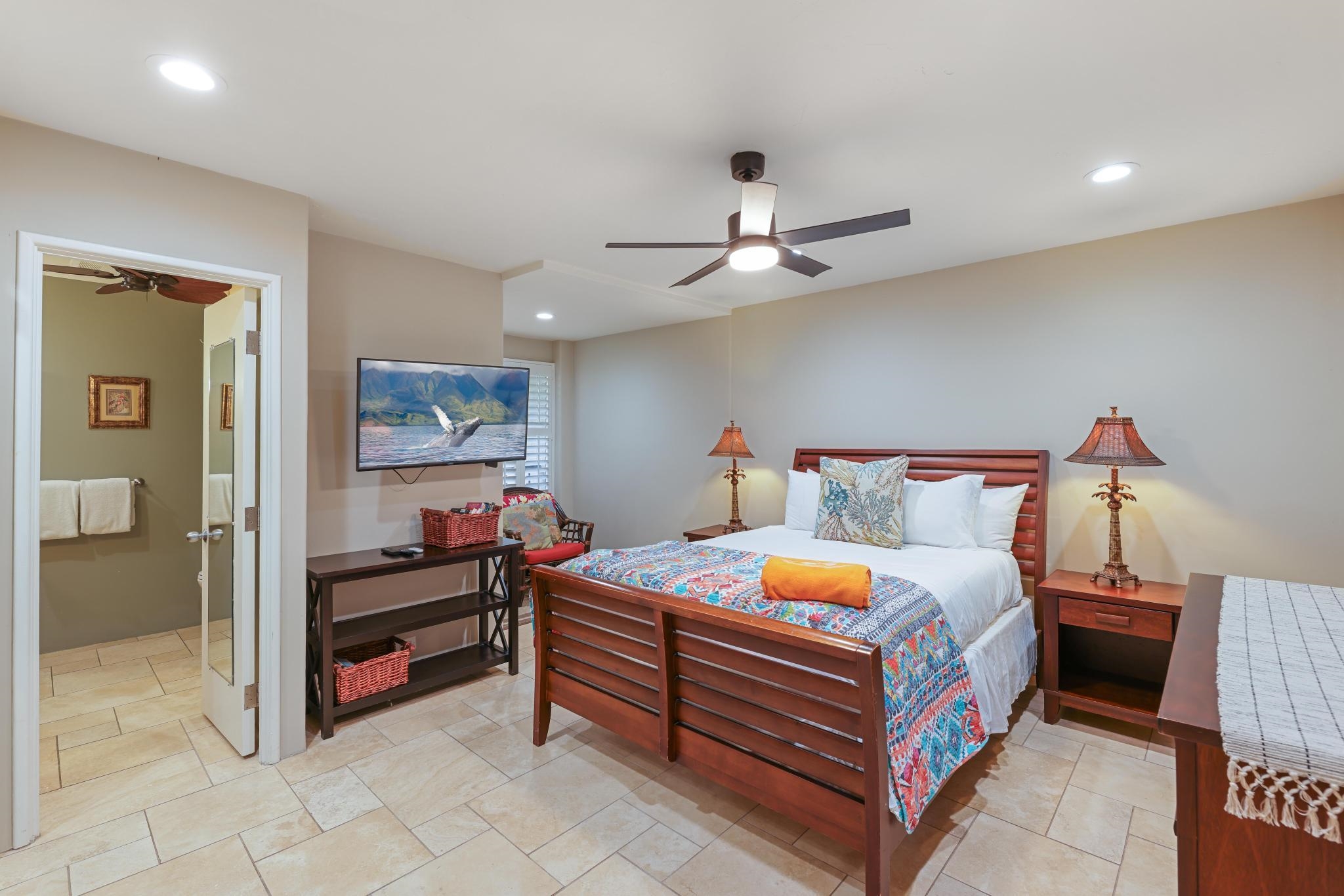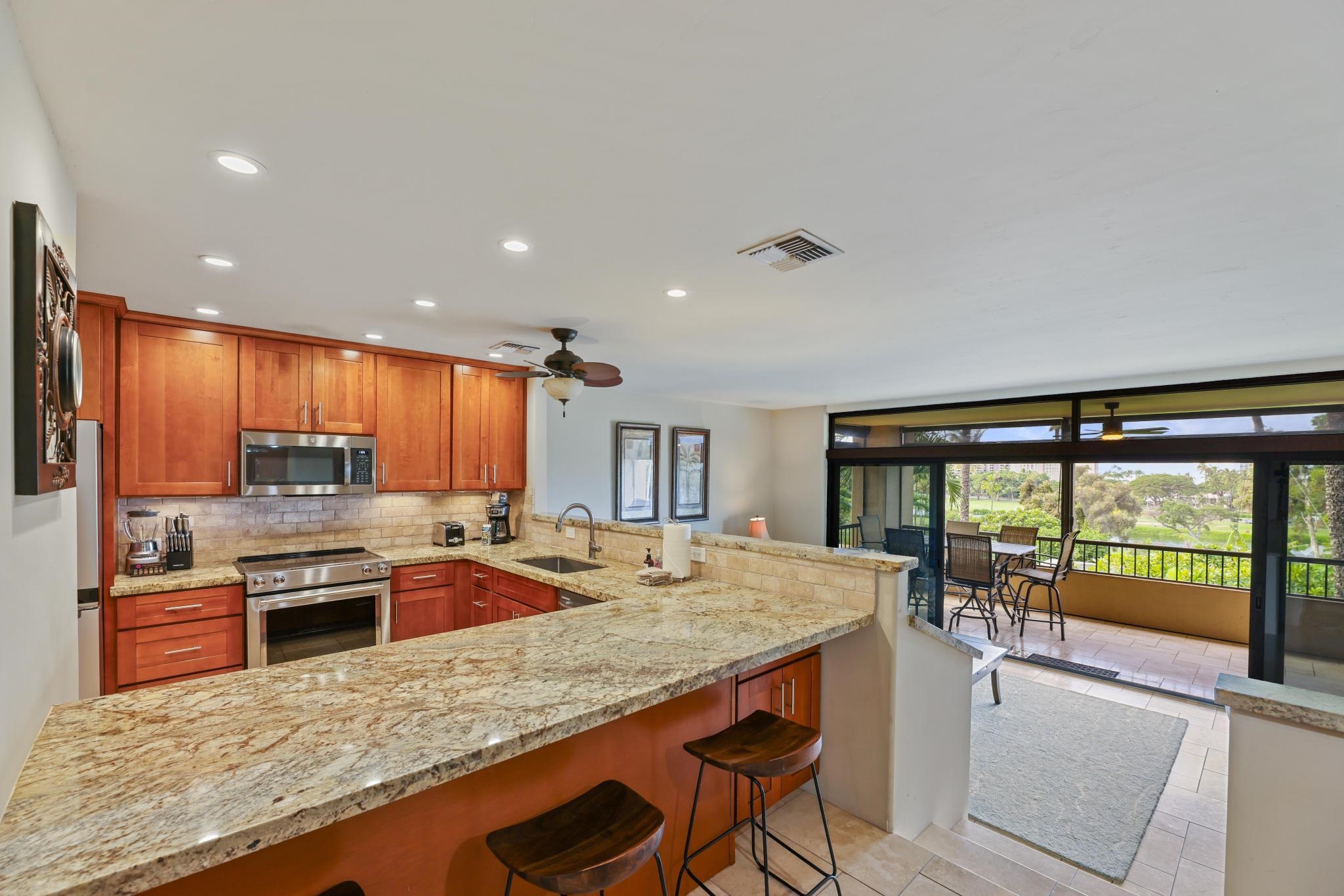 Kaanapali Royal L-201 - Located in the heart of the Kaanapali Resort on West Maui, this delightful two-bedroom, two-bath single-level condominium offers comfort, convenience, and a prime resort lifestyle. The unit features tiled flooring throughout, exquisite granite countertops, stainless steel appliances, and updated cabinetry with glass display shelving. Large patio doors fill the living space with natural light and open to an extended lanai with pleasant ocean-facing views. The primary bathroom is well appointed with double-sink vanities and walk-in showers accented by custom layered tilework. A full-size washer and dryer add everyday convenience. Situated on the second floor, the unit offers direct access to the parking area without the need to go up or down stairs. The property is set along the 16th hole of the Kaanapali Royal Golf Course and includes a gated entrance, swimming pool, clubhouse, barbecue areas, and tennis courts. Just a short distance to world-famous Kaanapali Beach and Whalers Village shopping and dining, this is one of the most desirable locations in Kaanapali. Ideal for full-time living or a part-time residence. Currently approved for vacation rentals, subject to potential future changes under Bill 9.