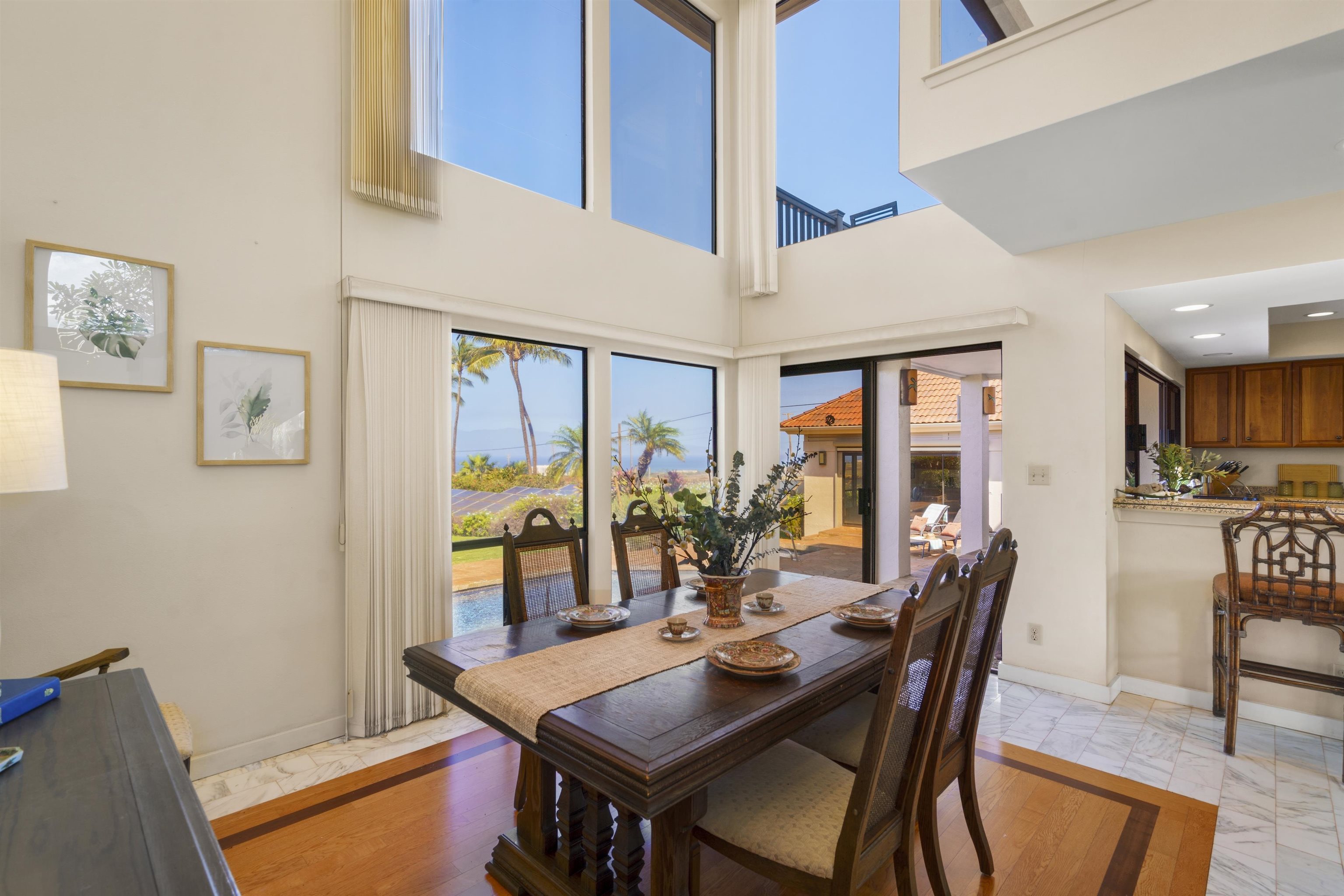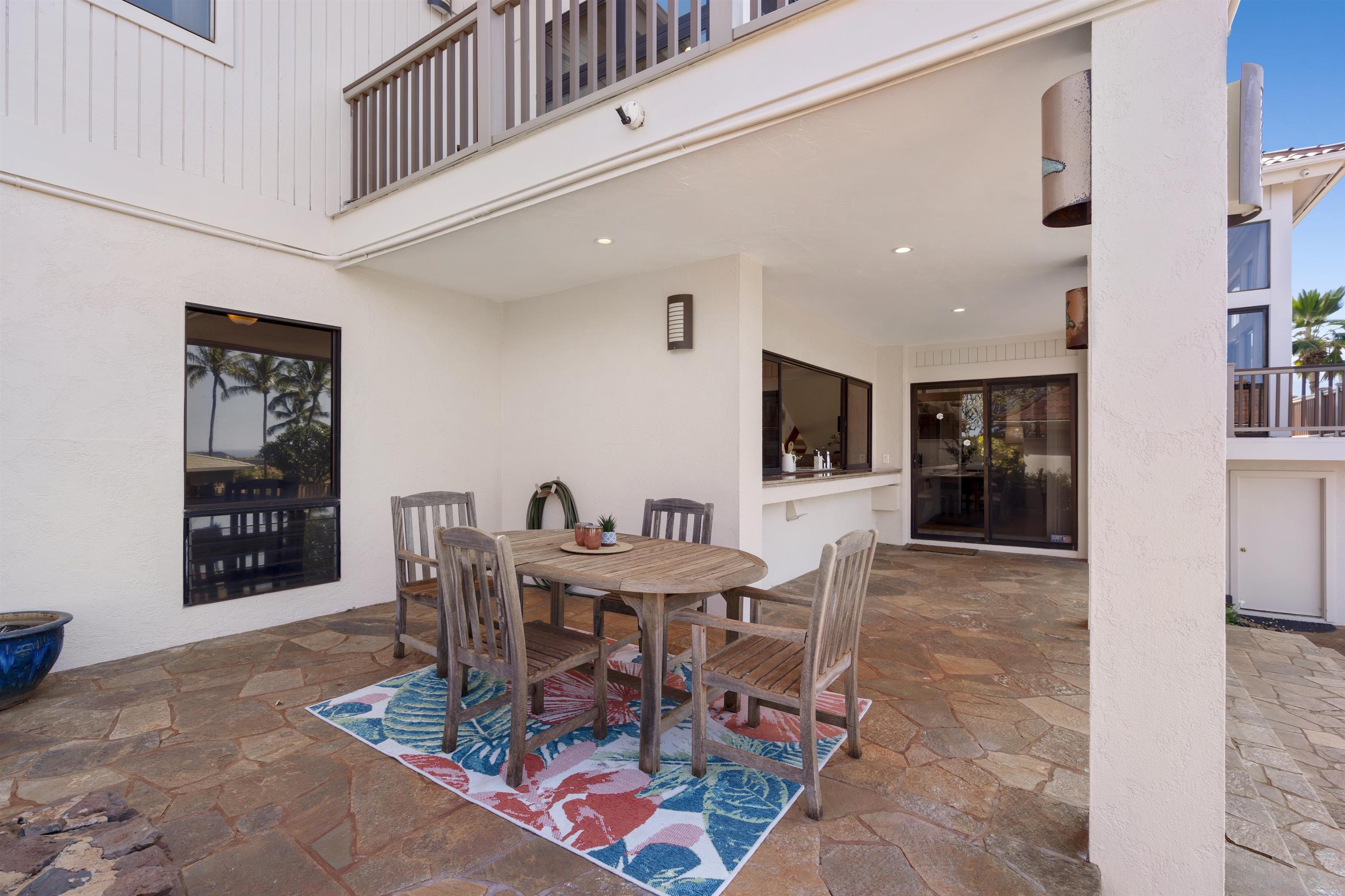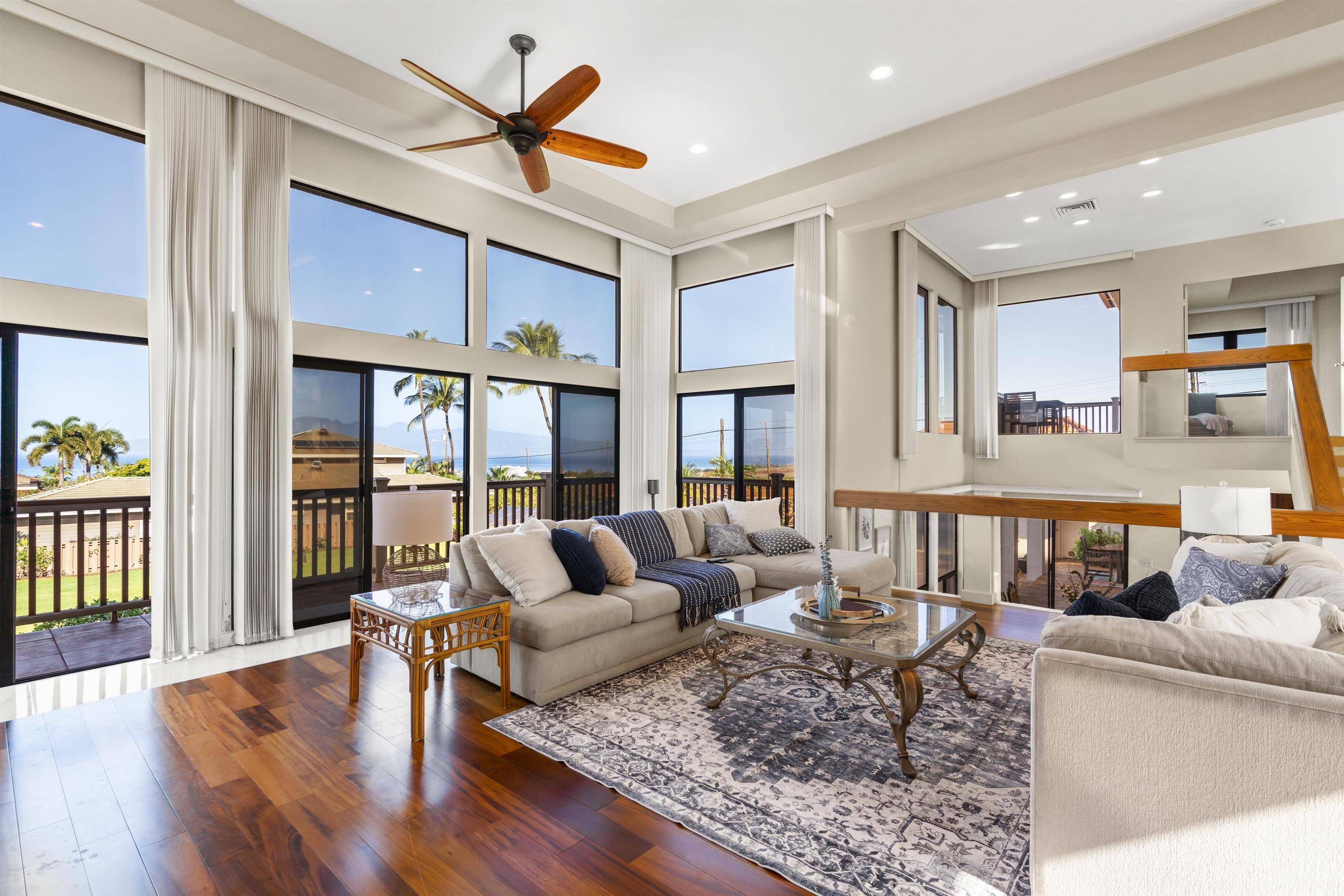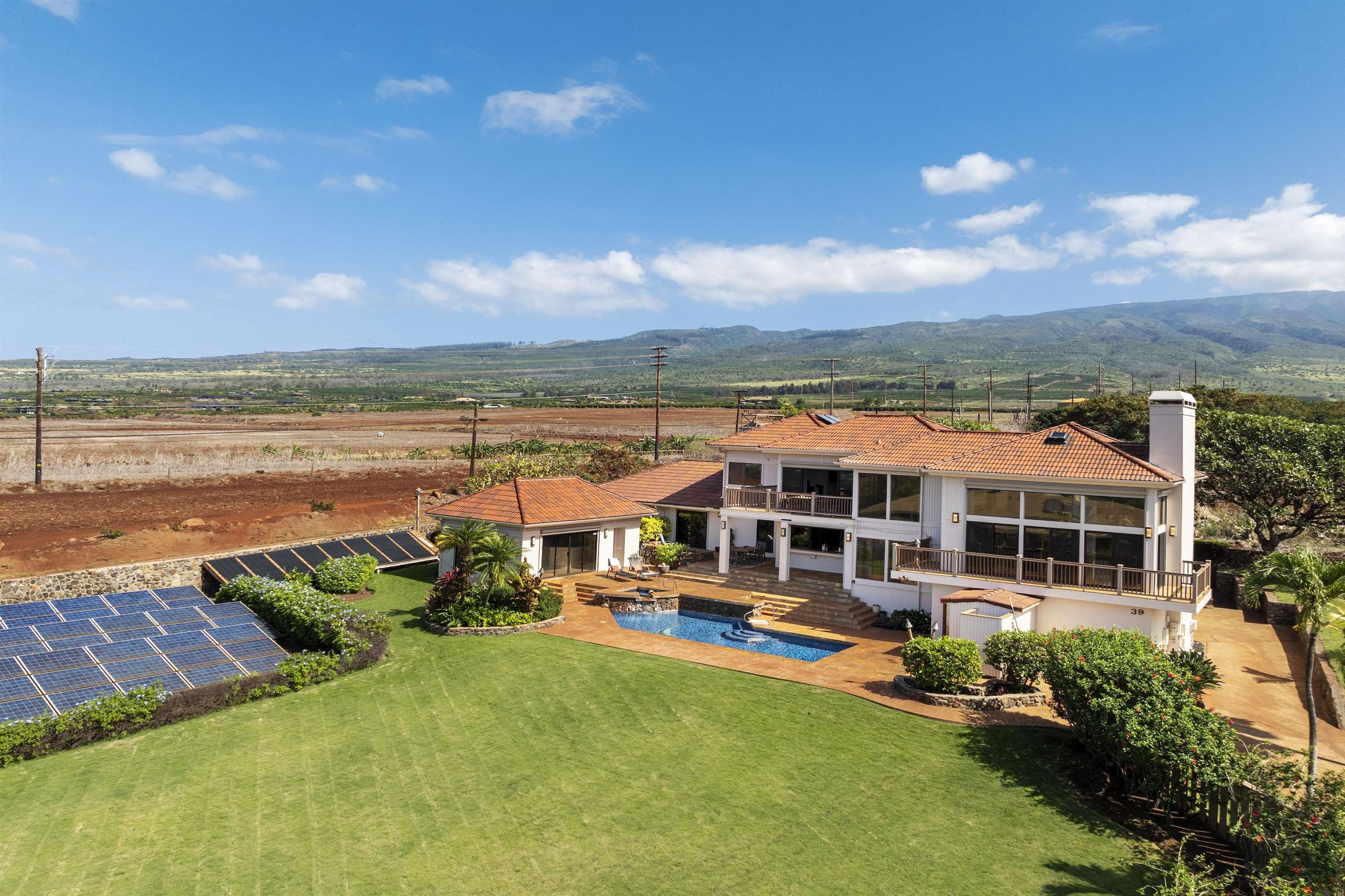 Poised at the top of a quiet cul-de-sac in the Kaanapali Hillside, 39 Hakui Loop presents a rare opportunity to own a private West Maui estate spanning two separate lots. Elevated on the premier row of the neighborhood, the property enjoys exceptional privacy, expansive ocean and outer-island views, and seasonal whale watching. The 3,785-square-foot split-level main residence is defined by dramatic 10- to 16-foot walls and thoughtfully scaled living spaces designed for both everyday comfort and refined entertaining. The home offers four bedrooms and three and one-half bathrooms, including two generously sized primary suites. The upper-level primary suite captures commanding views and features a spa-style bathroom with a steam room and a jetted soaking tub. Living areas include a formal dining room, an expansive living room, a dedicated office, and seamless indoor–outdoor kitchen and entertaining spaces. Hardwood, tile, and marble flooring are carried throughout. Complementing the main residence is a detached 432-square-foot ohana, currently configured as a pool house and entertainment room with a full bathroom and wet bar, offering flexible auxiliary space that enhances the home’s resort-style setting. Outdoor amenities are designed for relaxed island living, featuring a solar-heated swimming pool, hot tub, outdoor sauna, generous lawn, lush tropical landscaping, and multiple spaces for gathering and retreat with the added privacy of a six-foot stone privacy wall. Additional highlights include a two-car attached garage, ample storage, an owned 69-panel photovoltaic solar system, and a hard-wired propane generator for added reliability and convenience during power outages. Secluded, elevated, and elegantly composed, 39 Hakui Loop offers privacy, scale, and exceptional view exposure in one of West Maui’s most coveted residential enclaves.
