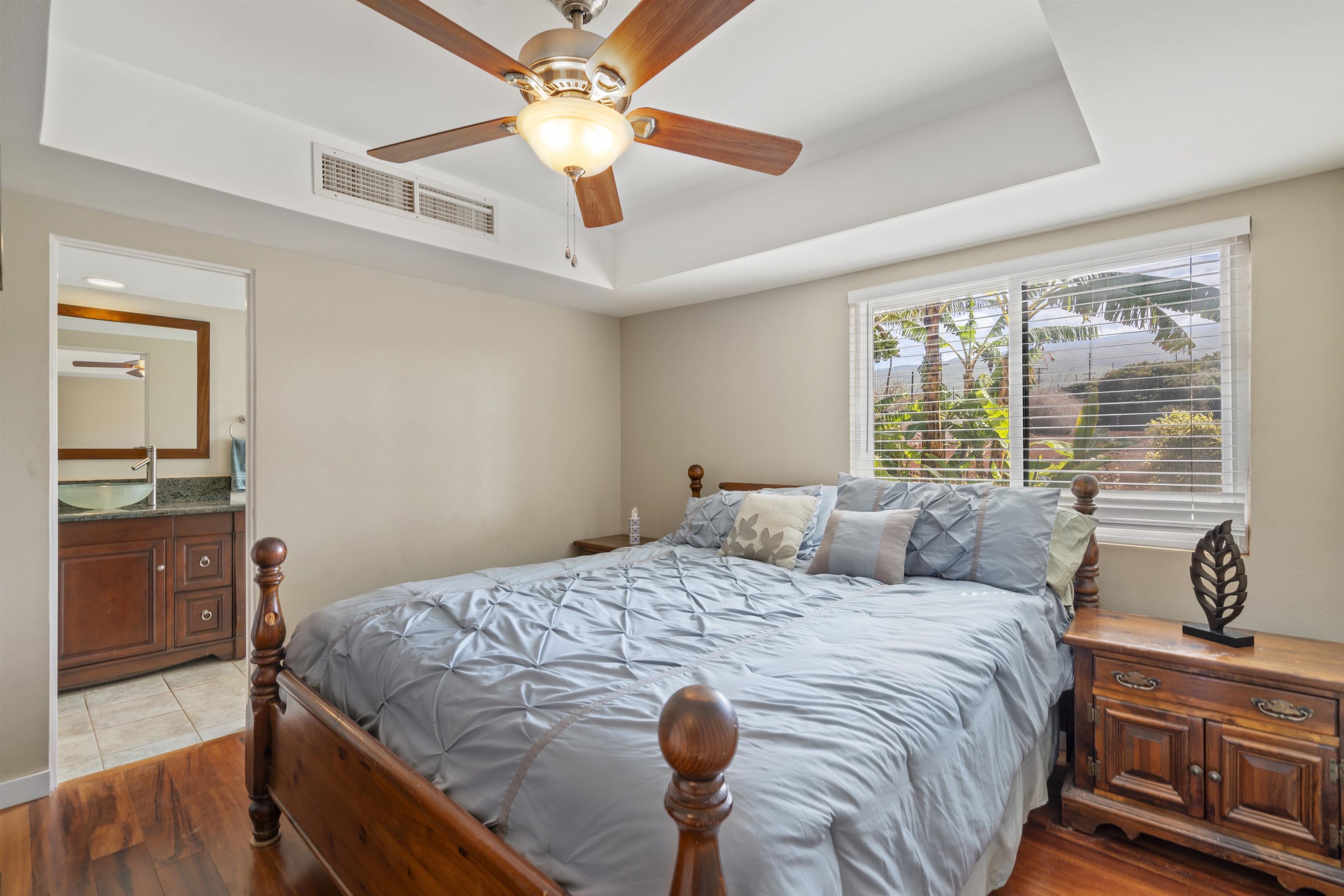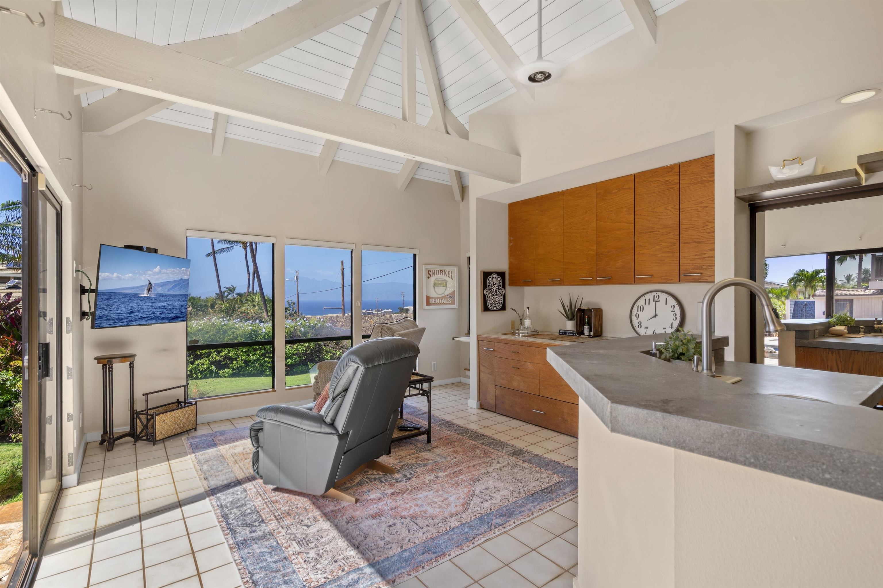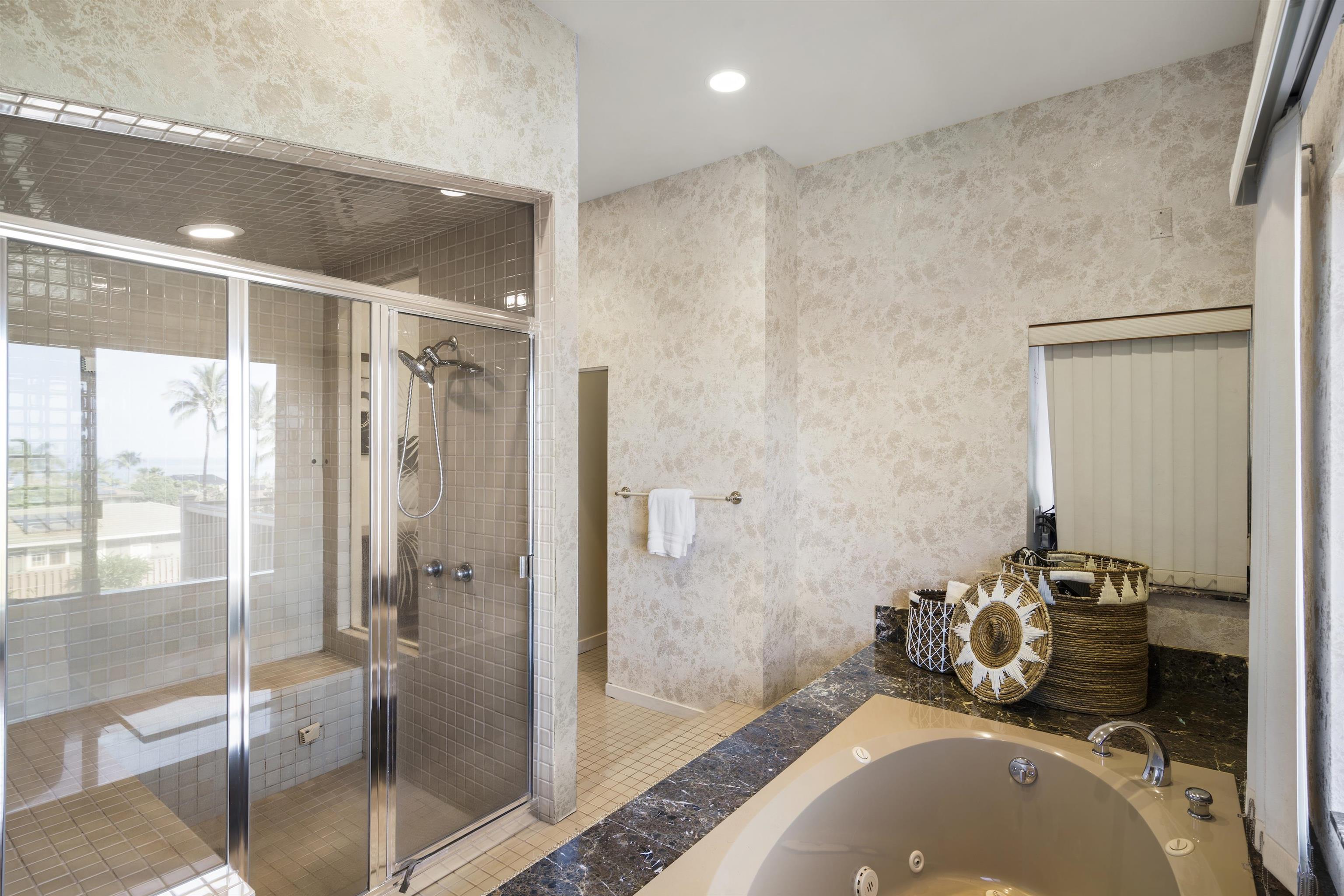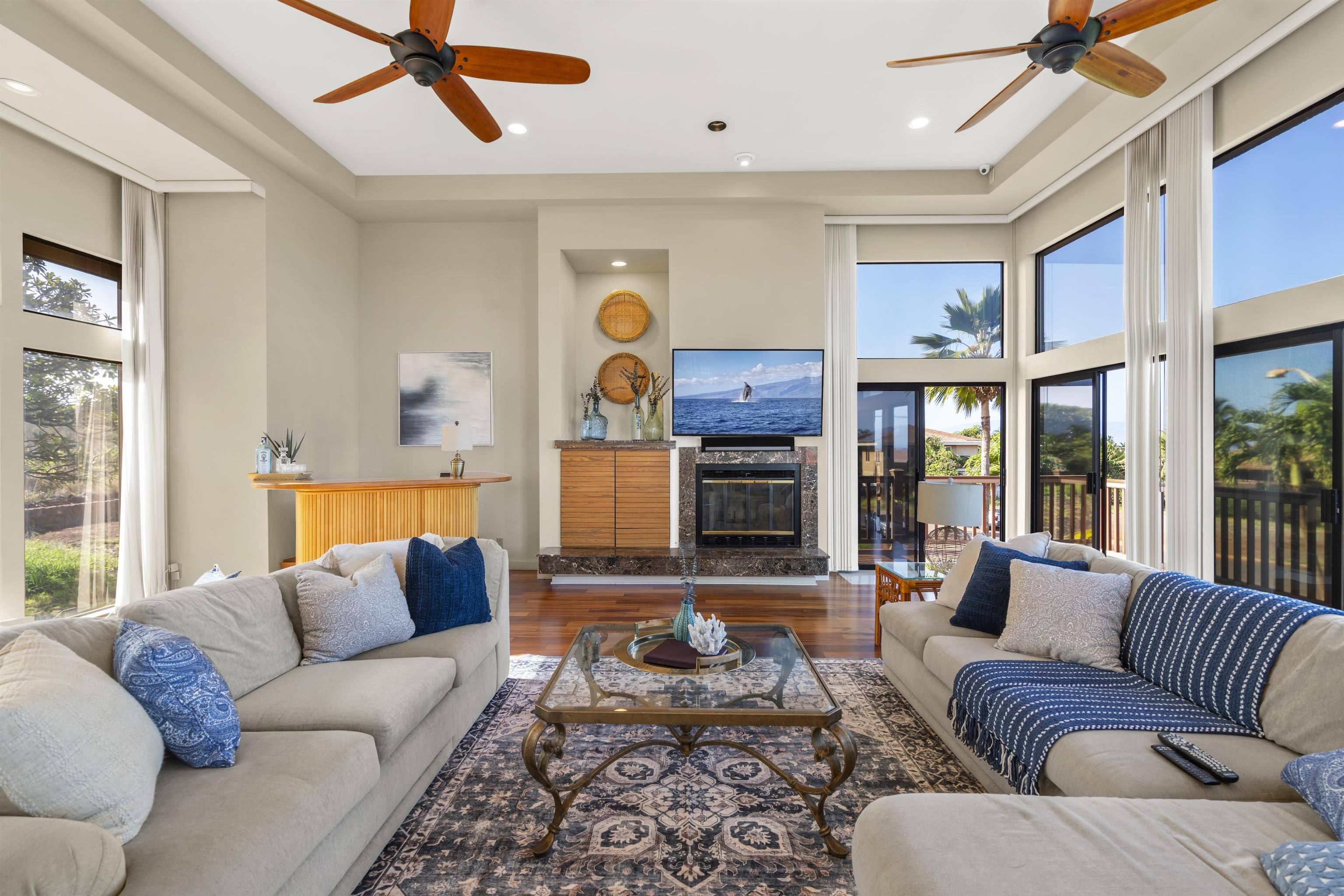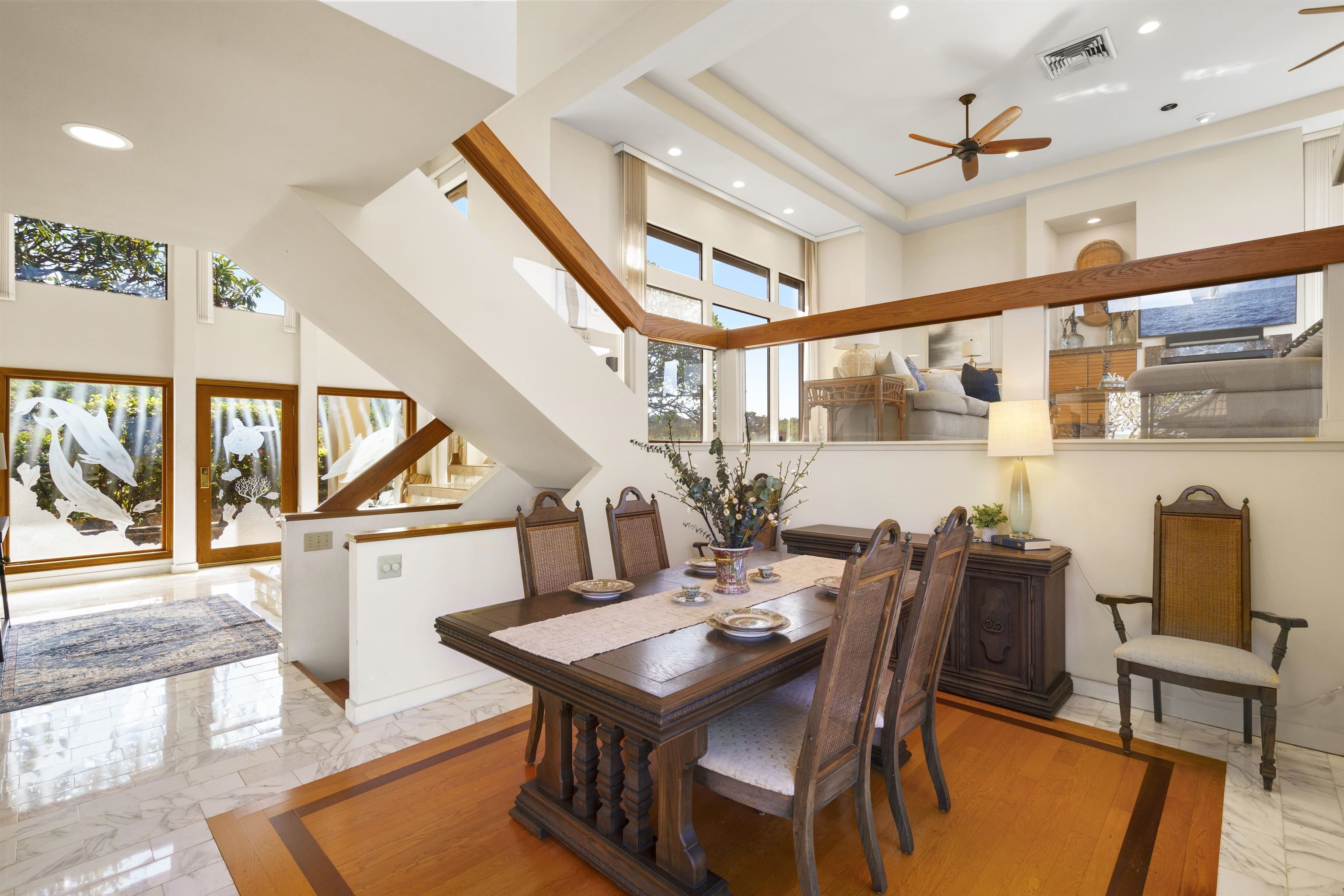 Poised at the top of a quiet cul-de-sac in the Kaanapali Hillside, 39 Hakui Loop presents a rare opportunity to own a private West Maui estate spanning two separate lots. Elevated on the premier row of the neighborhood, the property enjoys exceptional privacy, expansive ocean and outer-island views, and seasonal whale watching. The 3,785-square-foot split-level main residence is defined by dramatic 10- to 16-foot walls and thoughtfully scaled living spaces designed for both everyday comfort and refined entertaining. The home offers four bedrooms and three and one-half bathrooms, including two generously sized primary suites. The upper-level primary suite captures commanding views and features a spa-style bathroom with a steam room and a jetted soaking tub. Living areas include a formal dining room, an expansive living room, a dedicated office, and seamless indoor–outdoor kitchen and entertaining spaces. Hardwood, tile, and marble flooring are carried throughout. Complementing the main residence is a detached 432-square-foot ohana, currently configured as a pool house and entertainment room with a full bathroom and wet bar, offering flexible auxiliary space that enhances the home’s resort-style setting. Outdoor amenities are designed for relaxed island living, featuring a solar-heated swimming pool, hot tub, outdoor sauna, generous lawn, lush tropical landscaping, and multiple spaces for gathering and retreat with the added privacy of a six-foot stone privacy wall. Additional highlights include a two-car attached garage, ample storage, an owned 69-panel photovoltaic solar system, and a hard-wired propane generator for added reliability and convenience during power outages. Secluded, elevated, and elegantly composed, 39 Hakui Loop offers privacy, scale, and exceptional view exposure in one of West Maui’s most coveted residential enclaves.