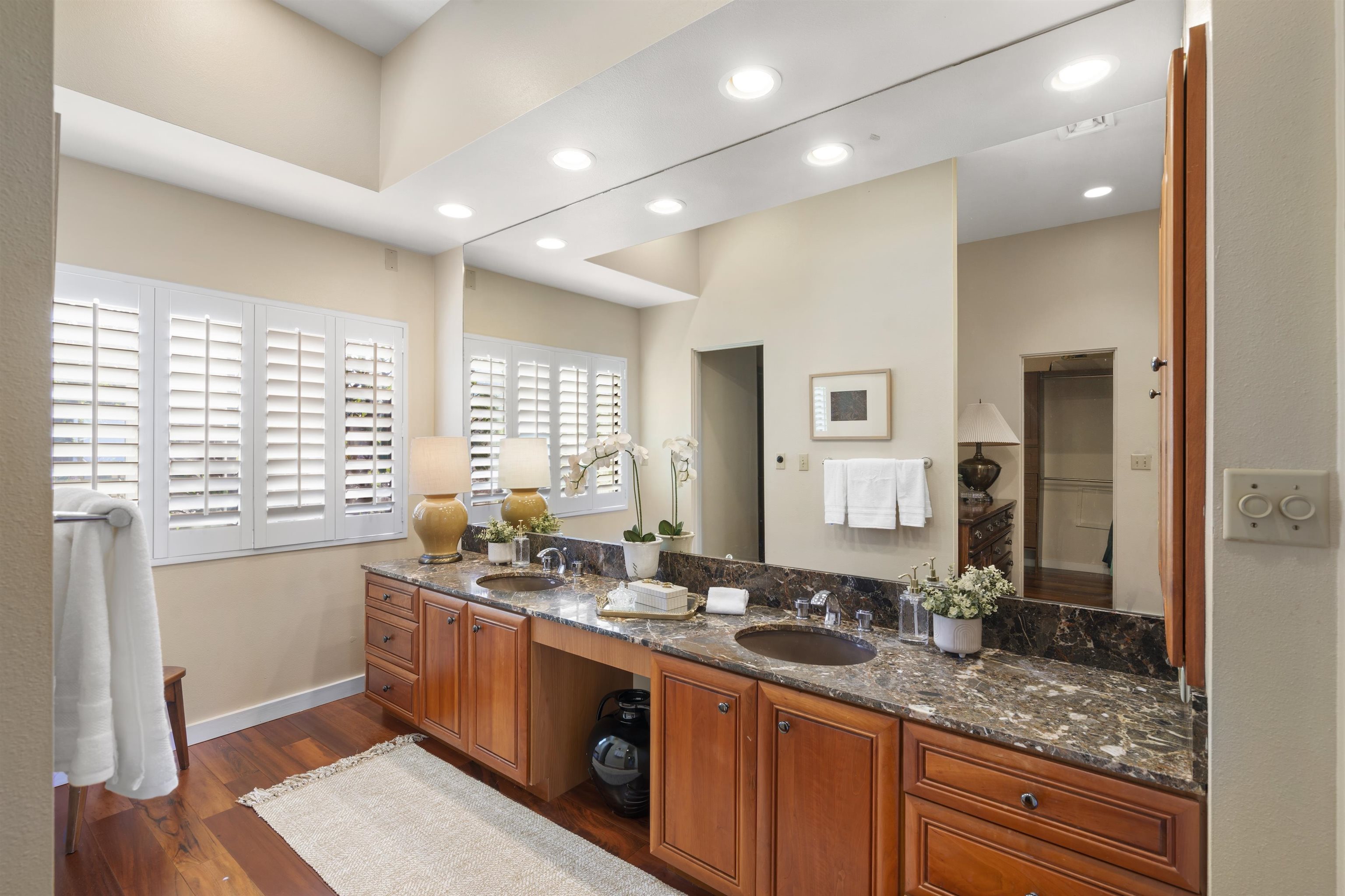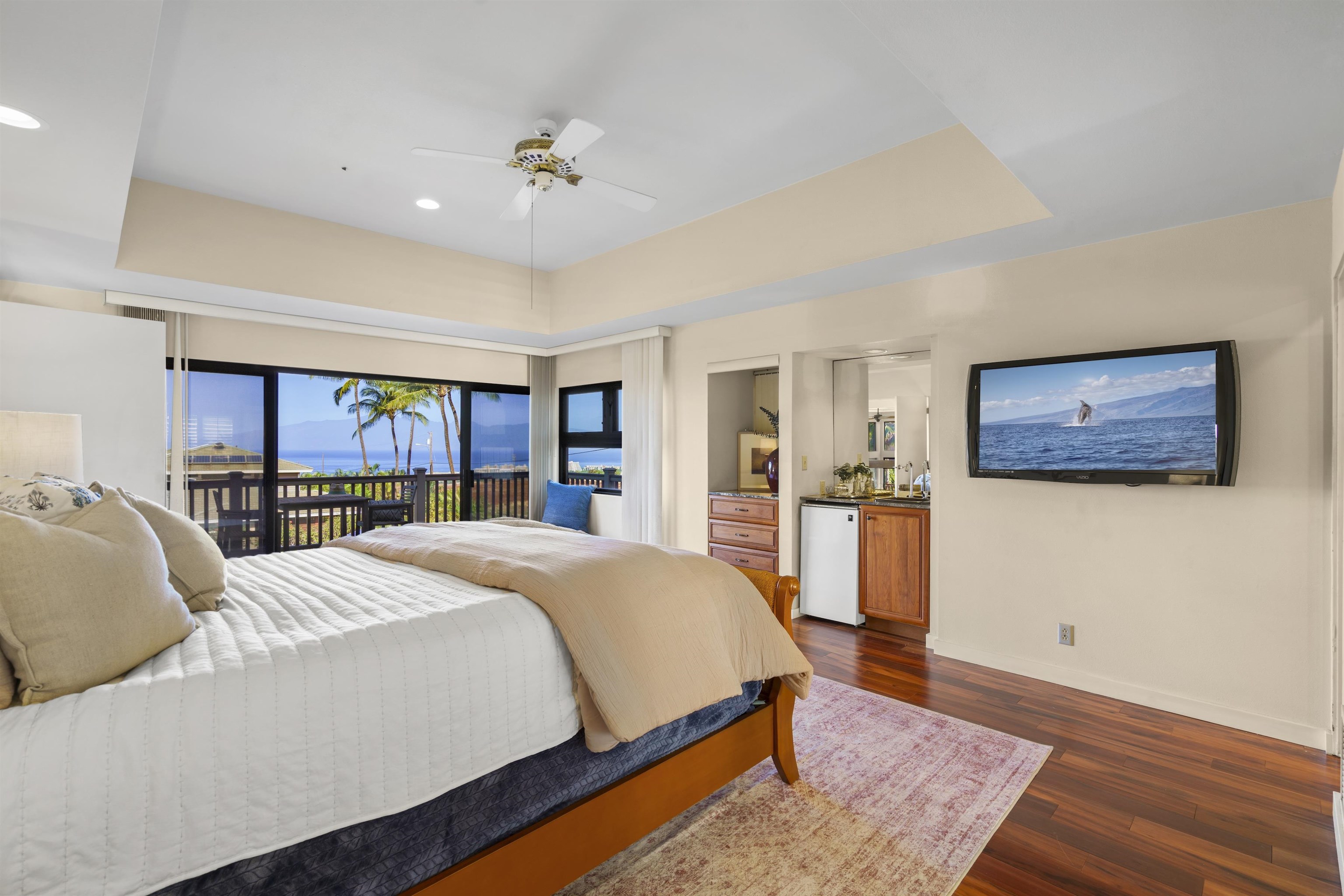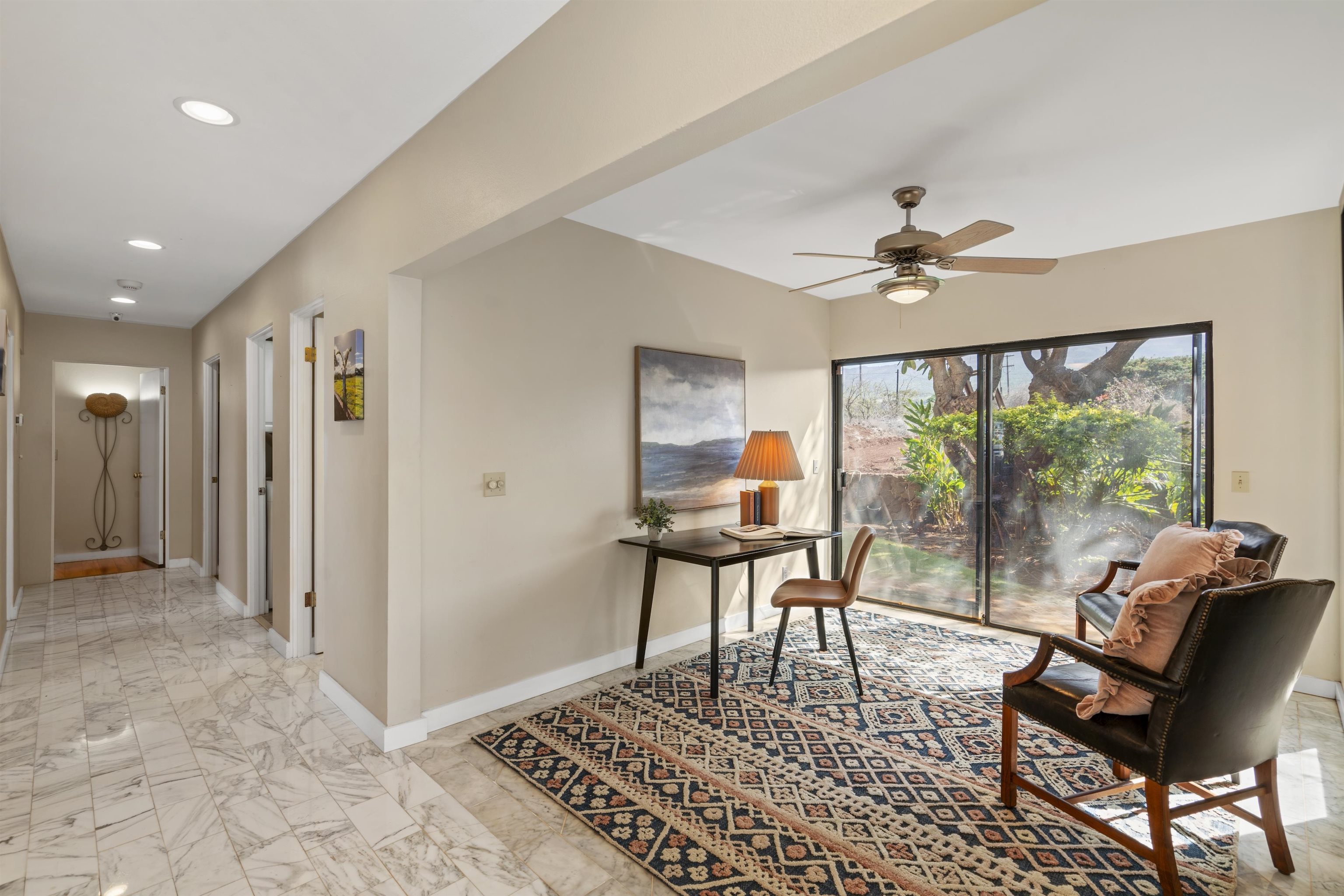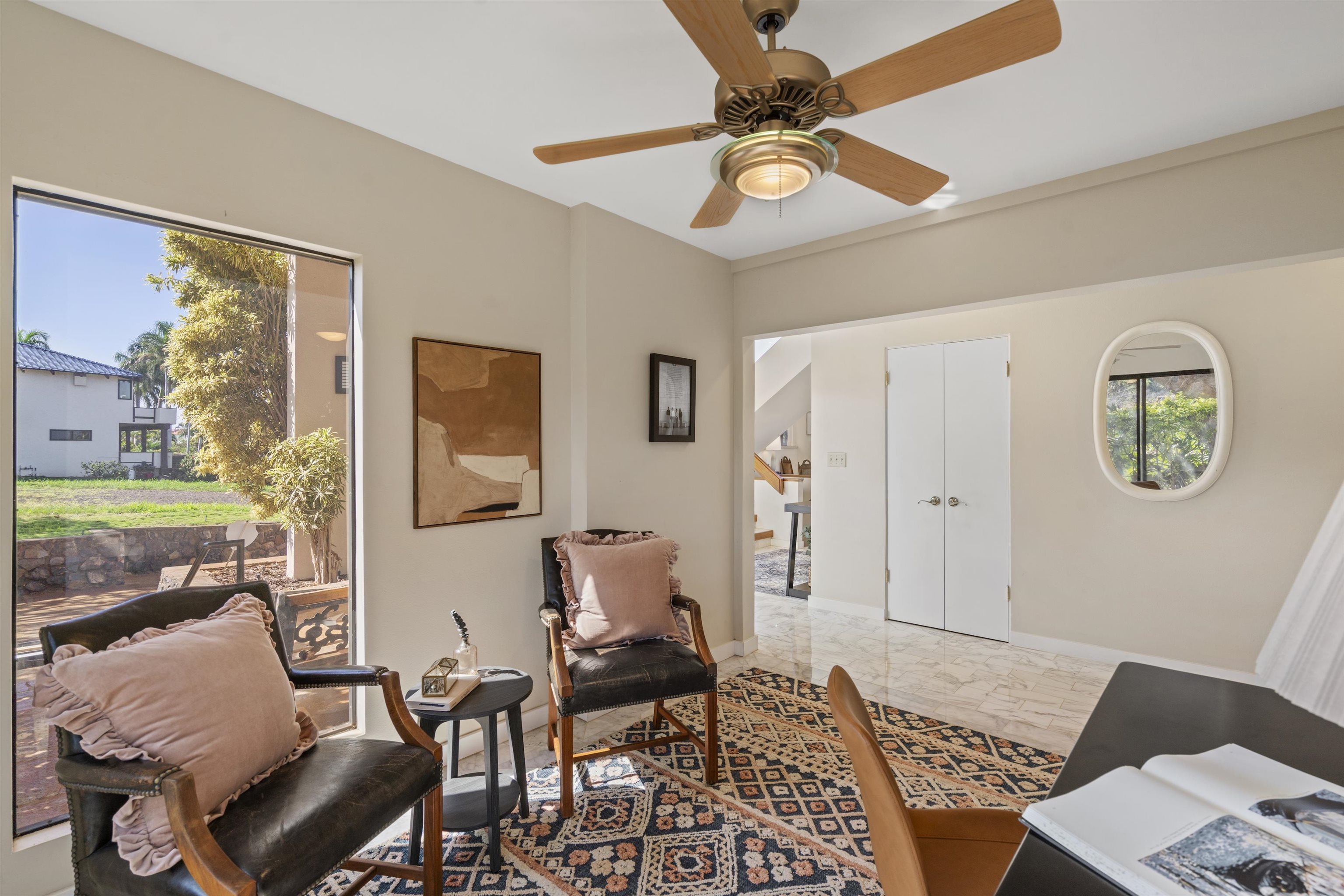 Poised at the top of a quiet cul-de-sac in the Kaanapali Hillside, 39 Hakui Loop presents a rare opportunity to own a private West Maui estate spanning two separate lots. Elevated on the premier row of the neighborhood, the property enjoys exceptional privacy, expansive ocean and outer-island views, and seasonal whale watching. The 3,785-square-foot split-level main residence is defined by dramatic 10- to 16-foot walls and thoughtfully scaled living spaces designed for both everyday comfort and refined entertaining. The home offers four bedrooms and three and one-half bathrooms, including two generously sized primary suites. The upper-level primary suite captures commanding views and features a spa-style bathroom with a steam room and a jetted soaking tub. Living areas include a formal dining room, an expansive living room, a dedicated office, and seamless indoor–outdoor kitchen and entertaining spaces. Hardwood, tile, and marble flooring are carried throughout. Complementing the main residence is a detached 432-square-foot ohana, currently configured as a pool house and entertainment room with a full bathroom and wet bar, offering flexible auxiliary space that enhances the home’s resort-style setting. Outdoor amenities are designed for relaxed island living, featuring a solar-heated swimming pool, hot tub, outdoor sauna, generous lawn, lush tropical landscaping, and multiple spaces for gathering and retreat with the added privacy of a six-foot stone privacy wall. Additional highlights include a two-car attached garage, ample storage, an owned 69-panel photovoltaic solar system, and a hard-wired propane generator for added reliability and convenience during power outages. Secluded, elevated, and elegantly composed, 39 Hakui Loop offers privacy, scale, and exceptional view exposure in one of West Maui’s most coveted residential enclaves.