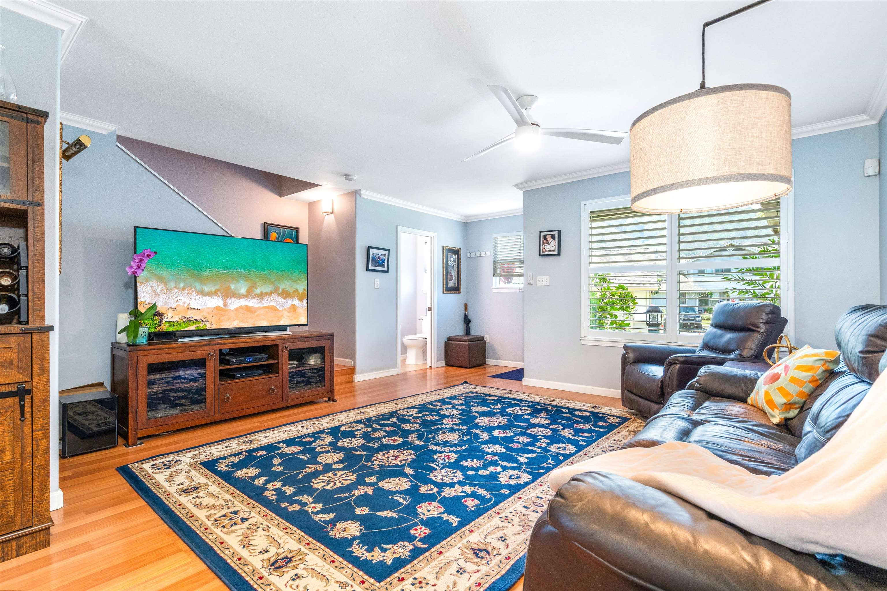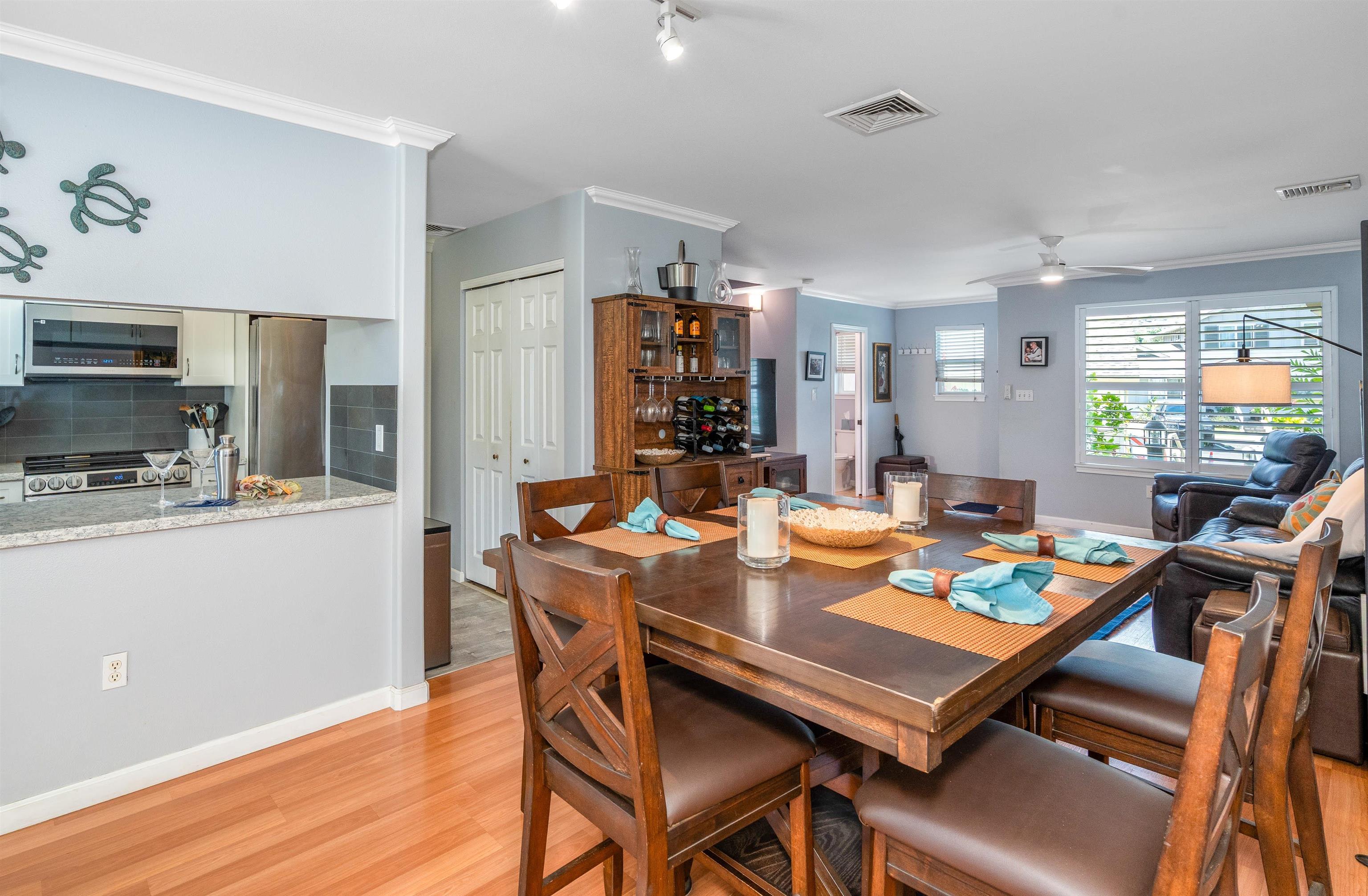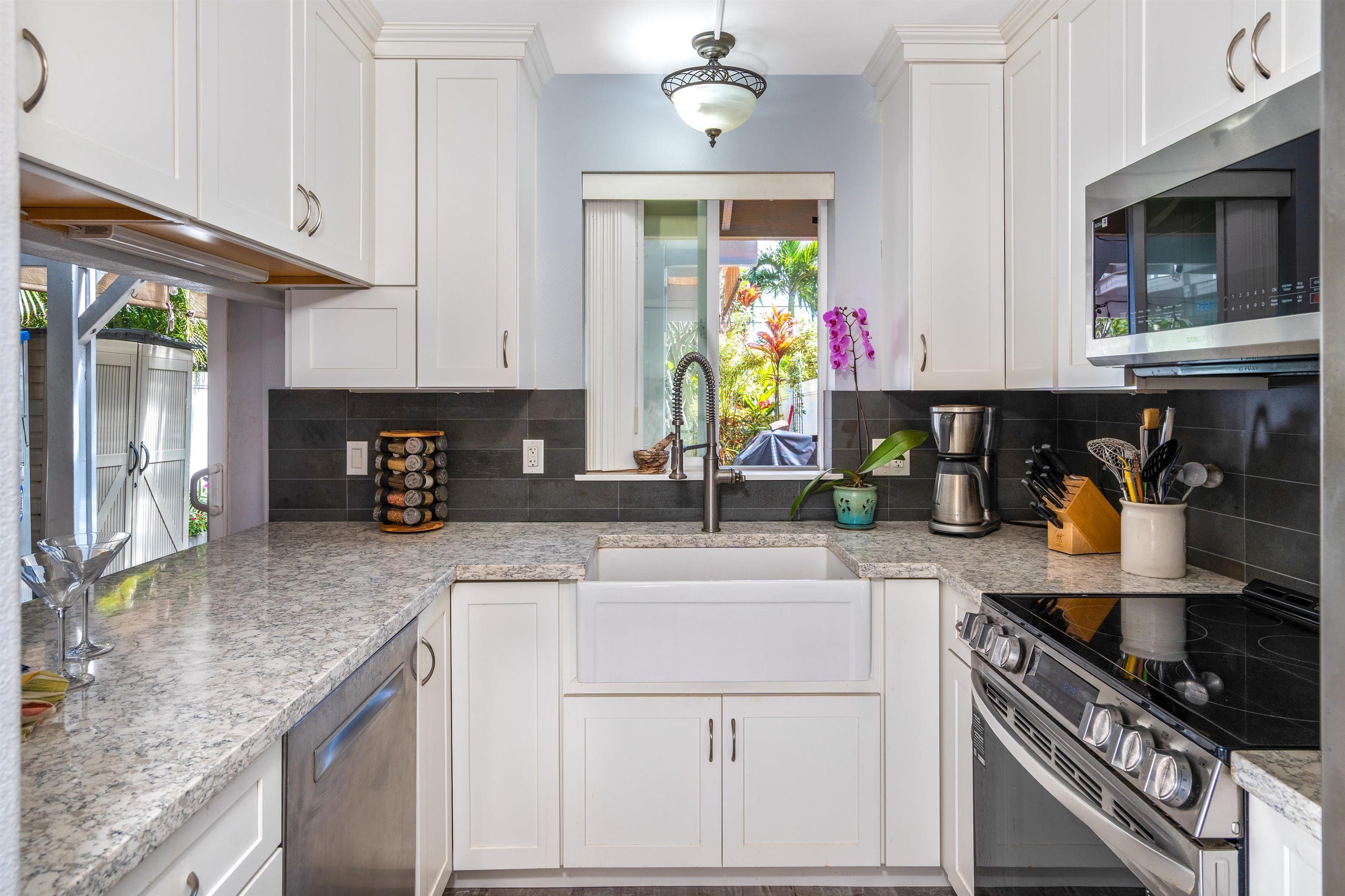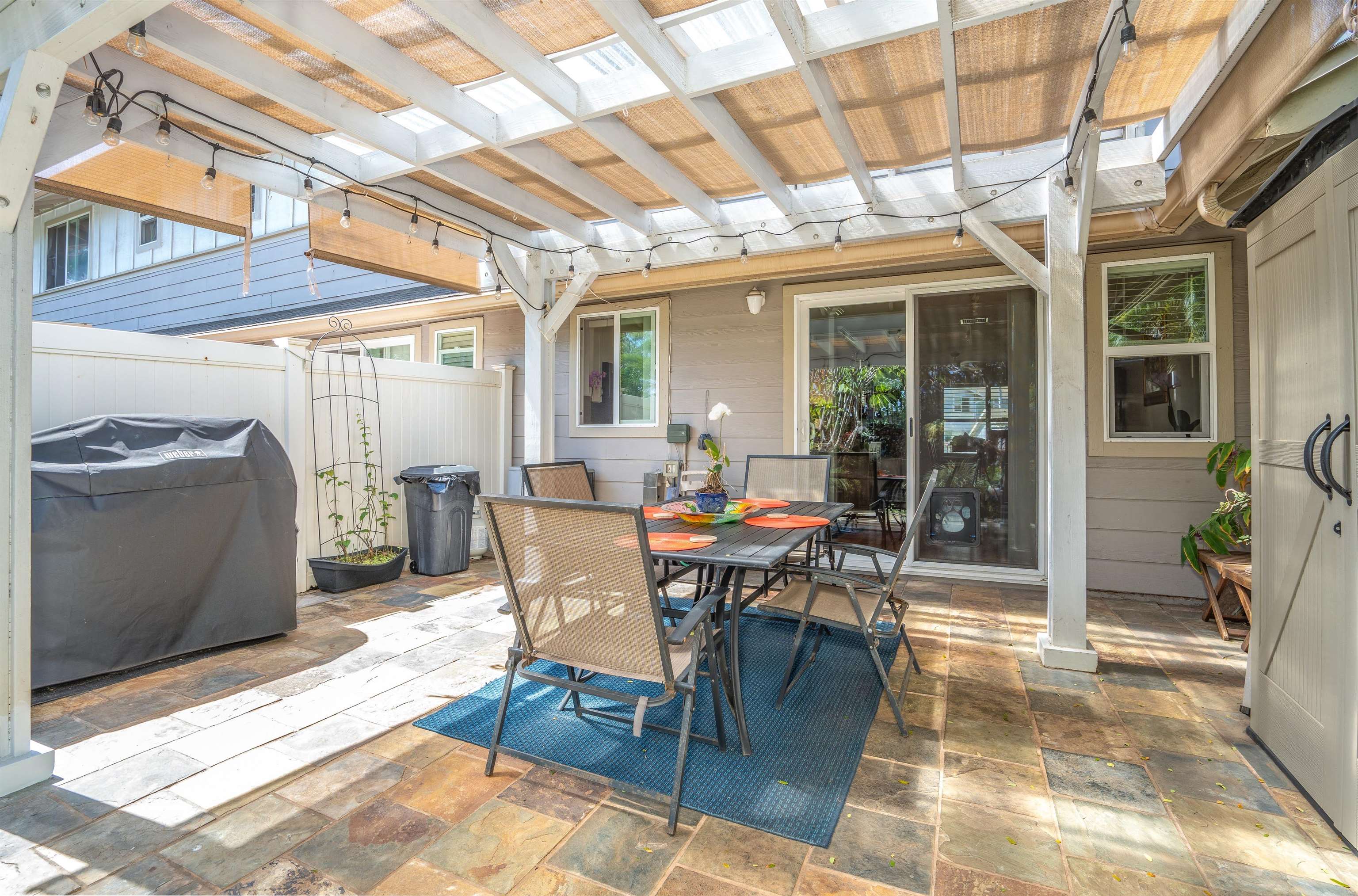 Welcome to your private island retreat in the heart of Wailuku, the historic county seat of Maui and home to our vibrant arts district. Restaurants, shopping, hiking, beach combing, easy access to everything Maui has to offer. This beautifully updated 3 bedroom, 2.5 bath townhome offers the perfect blend of indoor comfort and outdoor island style living. Interior spaces flow near seamlessly outdoors into a tropical garden retreat. Lush landscaping surrounds a stunning 20 x 20 natural slate tile hardscape and fully sheltered outdoor living and dining space. A 6 foot privacy fence surrounds this approximately 1,200 sqft fully irrigated sanctuary making this, arguably, the largest private yard in this complex. The unique additional 400 square feet of Pergola-covered living space invites you to host dinner parties, celebrate friends with a backyard BBQ, read books or play ball with a pet. This al fresco enclave has no comparison: Plumerias, bananas, ginger, crotons and mature royal palms envelope your Hawaiian style sanctuary. November 2022 professional kitchen renovation ($44,000) included a classic white farmhouse sink with apron-front design, stainless appliances, beautifully appointed chef’s kitchen showcasing white quartz countertops and fresh, modern cabinetry. Additional notable features include: sophisticated plantation shutters, custom crown molding, custom garden lighting transforming the outdoor space after dark, central air conditioning, exterior storage, covered parking, West Maui Mountain views and so much more. Two deeded parking stalls (108 and 105). Newer windows and doors (2016). Open layout. Abundant natural light. Fire up the grill and rest underneath the stars. Your Maui home is waiting.