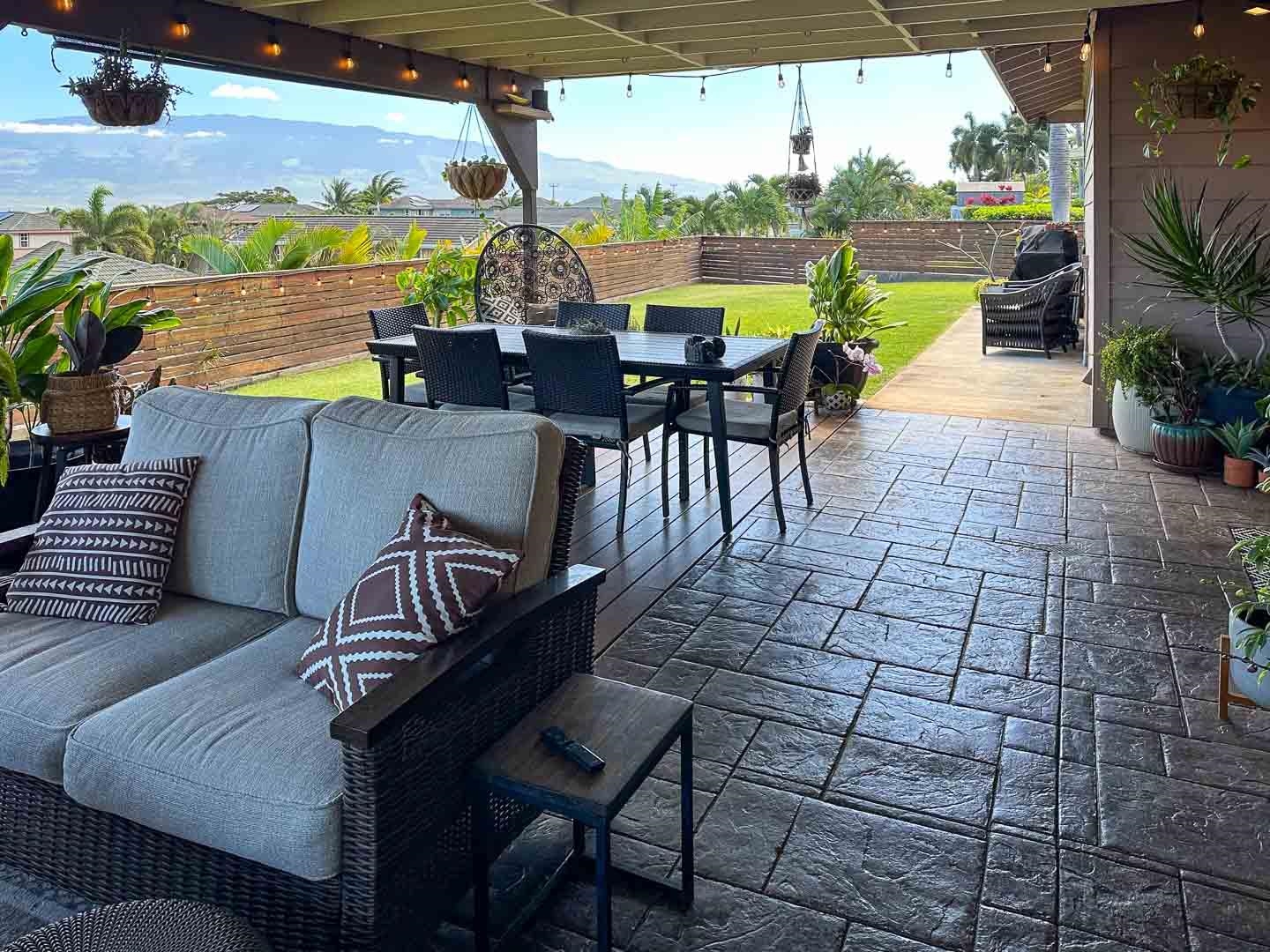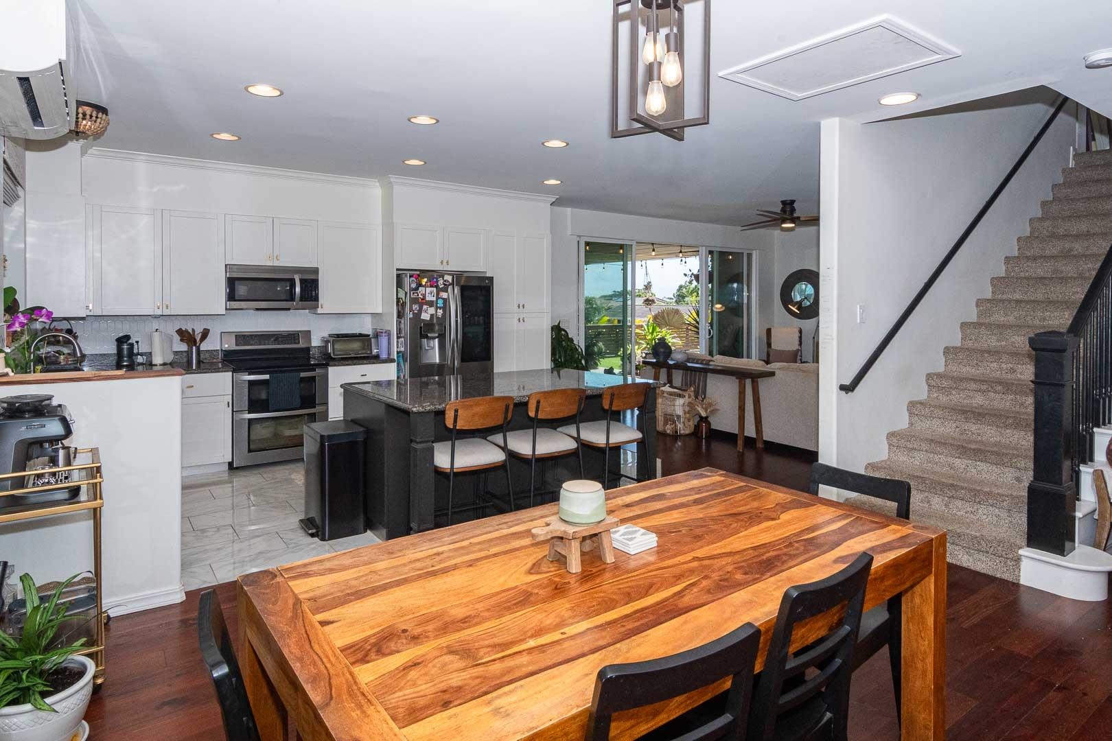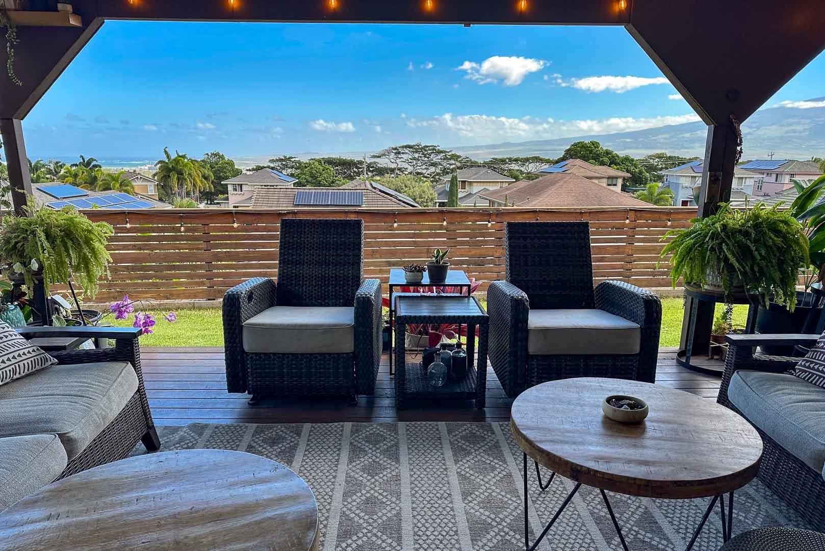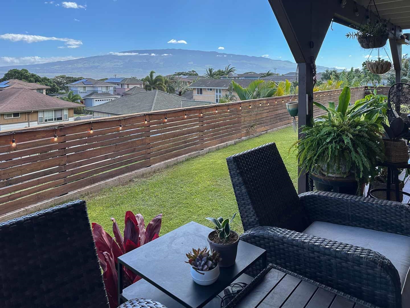 Entertainer’s delight! Owners transformed this property into one of the premier properties in Kehalani for hosting gatherings, relaxing under a super-sized covered lanai, and taking advantage of astonishing ocean and Haleakala mountain views. Through having a retaining wall built and bringing in fill, an area for a wide lawn and expansive covered lanai was created. The meticulously maintained property is both a peaceful oasis and perfect locale to welcome friends and family. Visitors notice the surprising sense of privacy in a location that is so convenient. The lower level features pre-engineered hardwood floors in the living room, dining area, and family room, leading out to the extra-large covered lanai with stamped concrete and Trex flooring, and a sprinklered back yard, which is also accessible from side gates. The kitchen, with seating at the island with granite counter-tops, includes a new Bosch dishwasher, a double-oven range, refinished cabinets and porcelain tile floors. A fun under-stairs play area, half-bathroom with bidet and 2-car garage with Tesla charger (compatible to other EV vehicles with an adaptor) in front of the home are also on the ground level. 3 bedrooms and 2 remodeled bathrooms are located upstairs, with ocean and mountain views. The property comes with 2 Mitsubishi split air-conditioners (master bedroom and downstairs.)