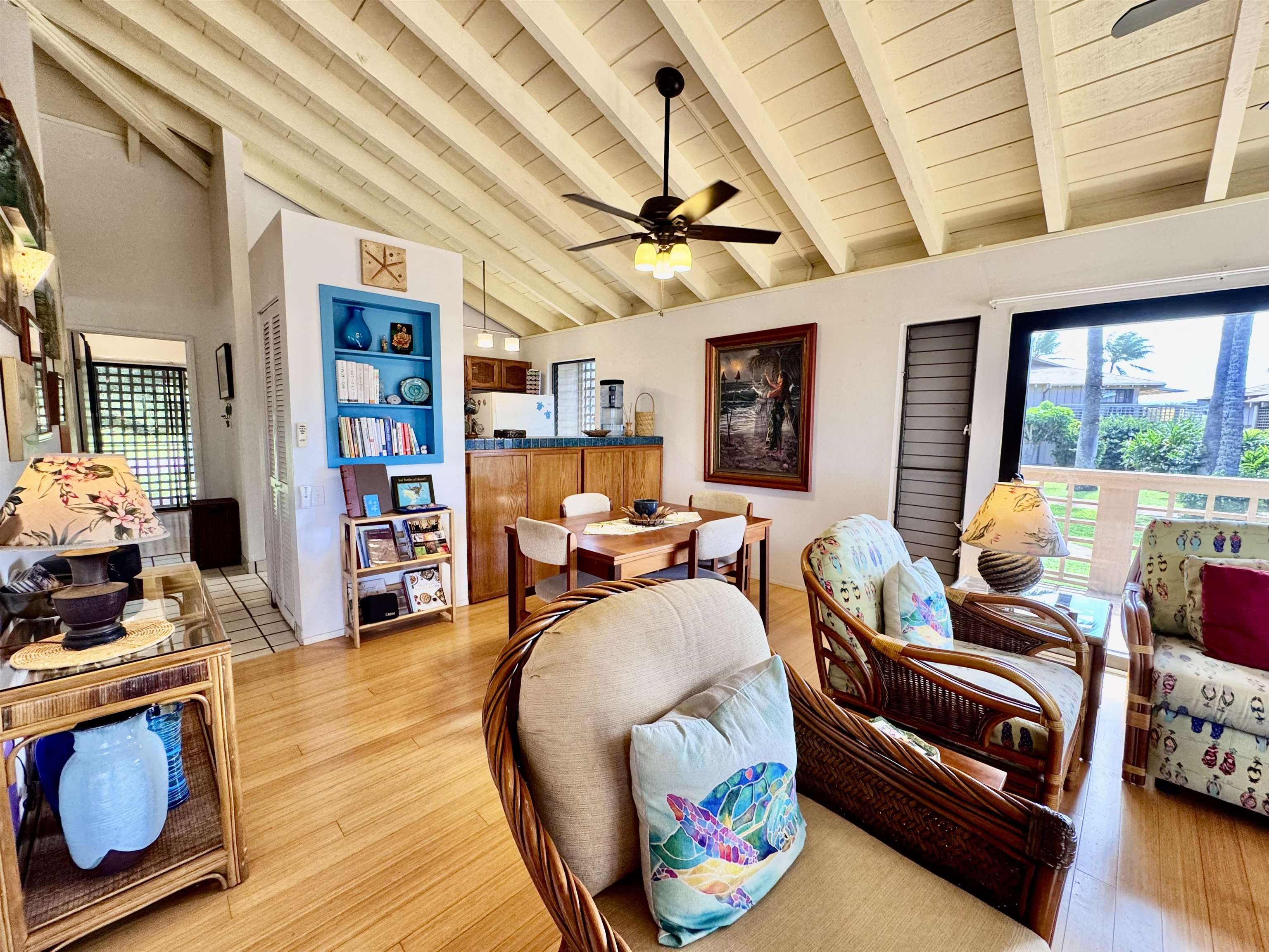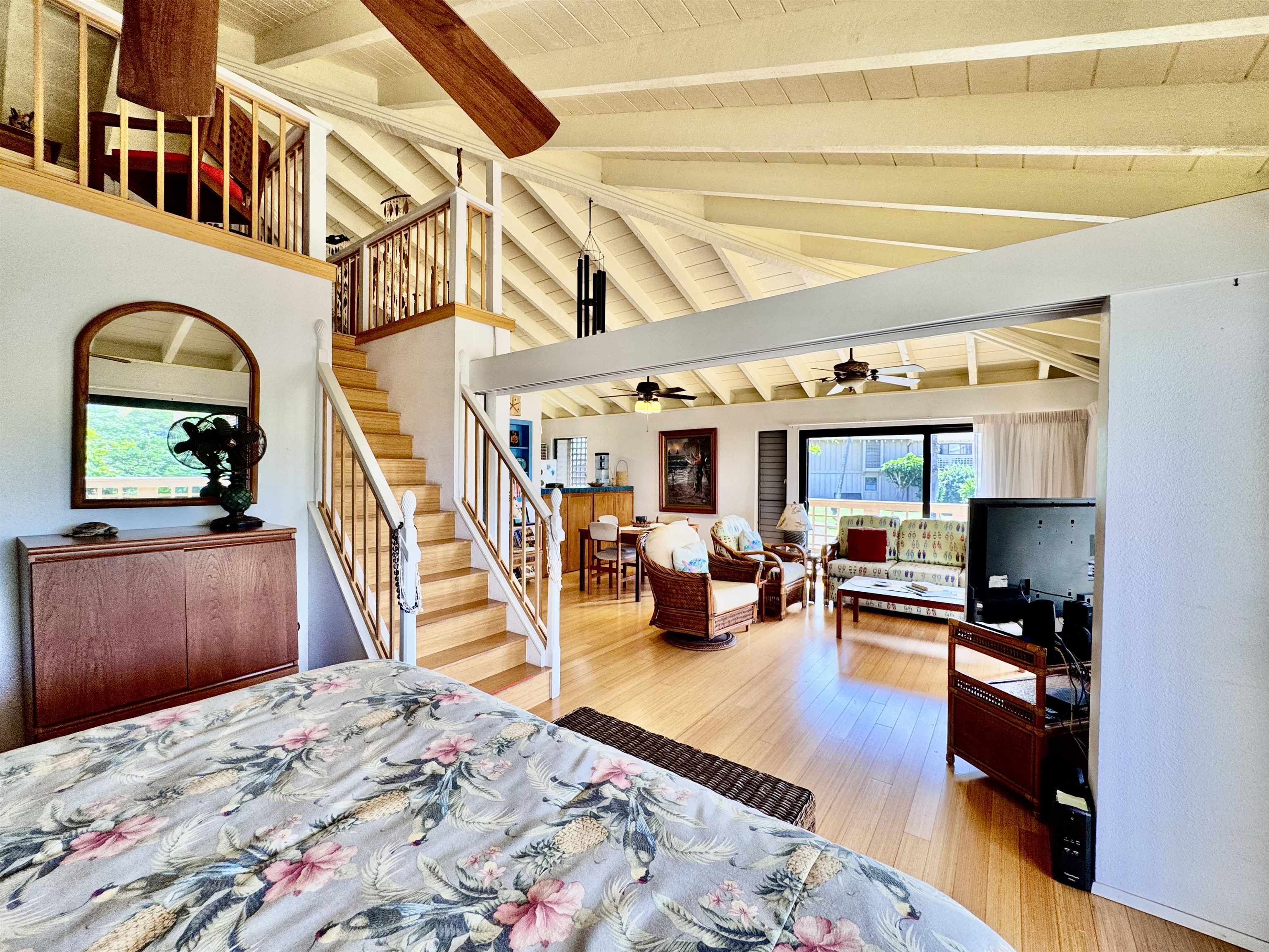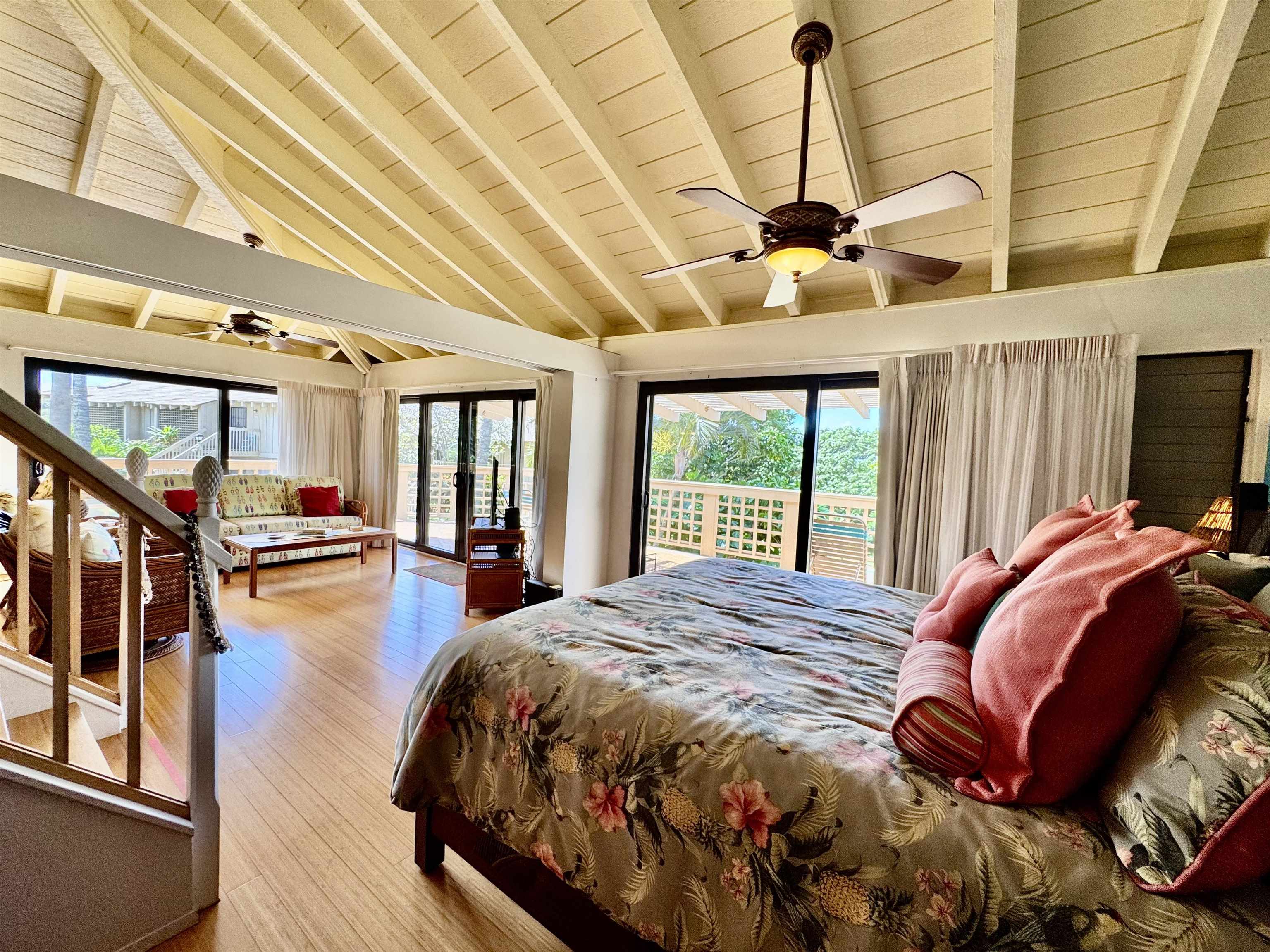 Ke Nani Kai resort exudes charm and easy living. This spacious and inviting condo unit boasts high ceilings and a wrap-around lanai with small water views, providing ample outdoor space for lounging and dining. It offers two bedrooms and two bathrooms, with a finished loft that you access up a high quality stair case. It is being sold turn key and fully furnished. Notably, it has not been used as a rental property. The lush tropical grounds surrounding the condo and resort add to its tropical appeal. Amenities include a tennis court, BBQs, pool & spa, and a cabana. Additionally, it’s just a short walk to the pristine white sand beaches, and a short drive to Dixie Maru, the quiet snorkeling beach. Paradise found!