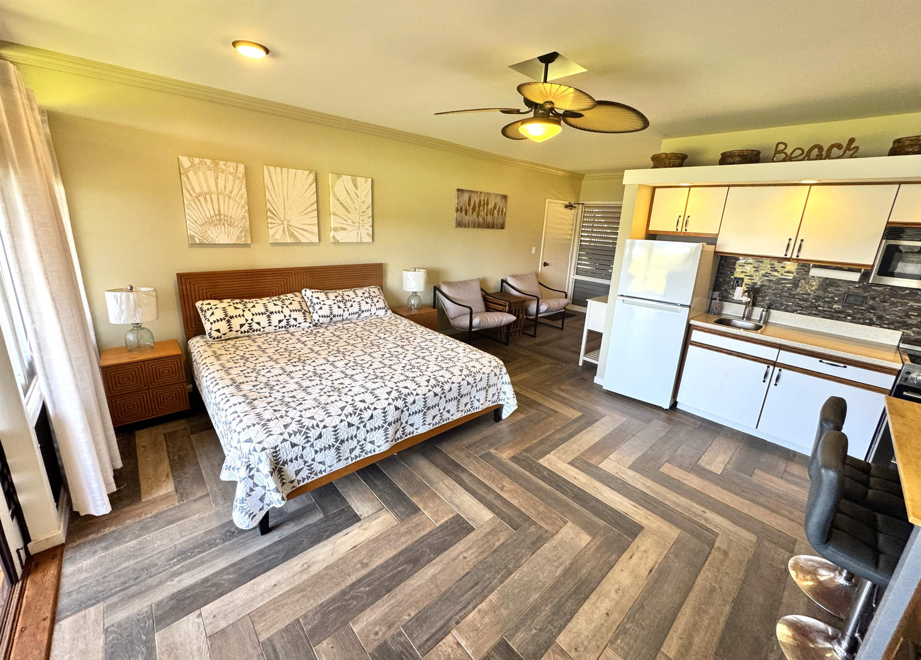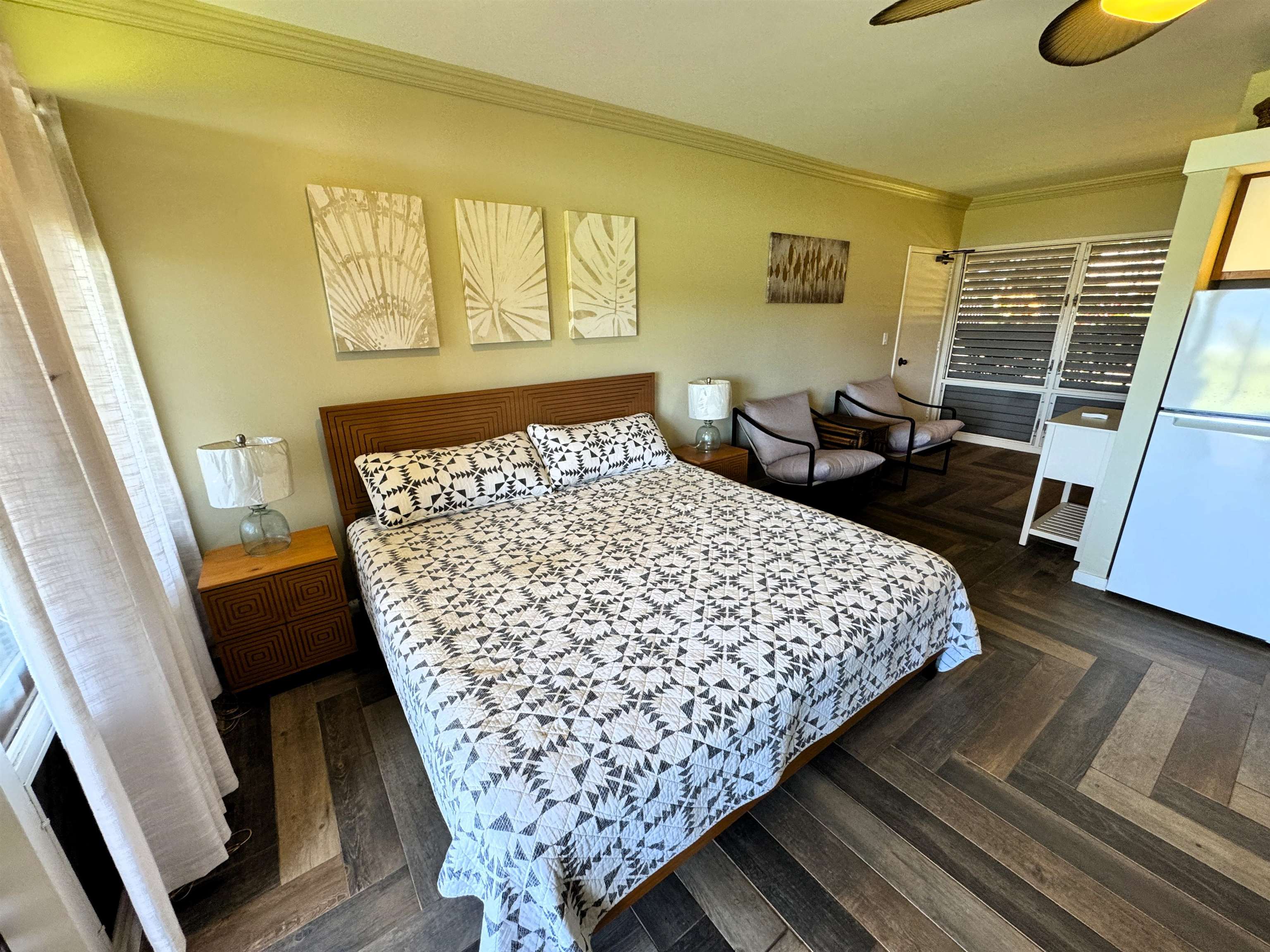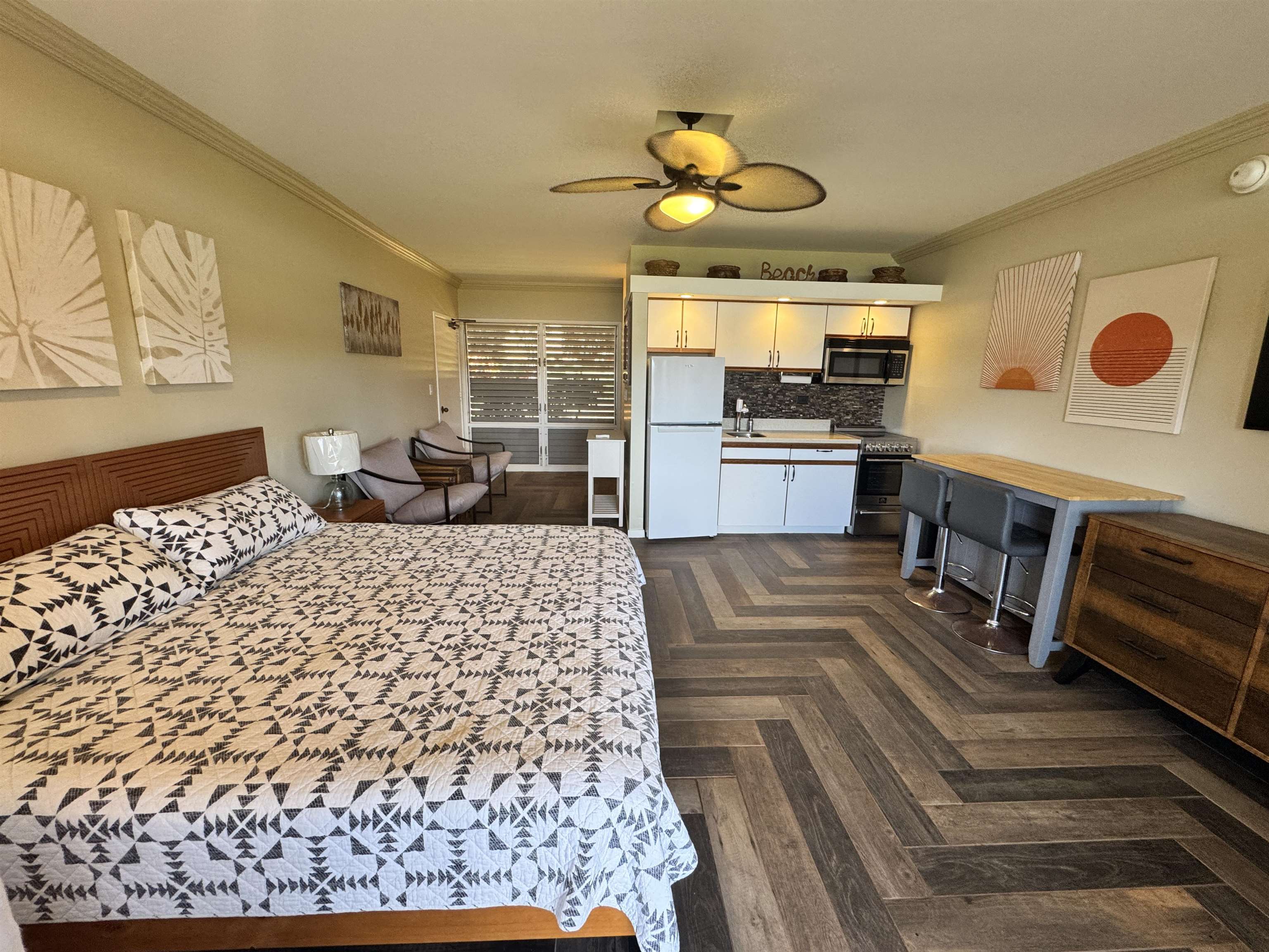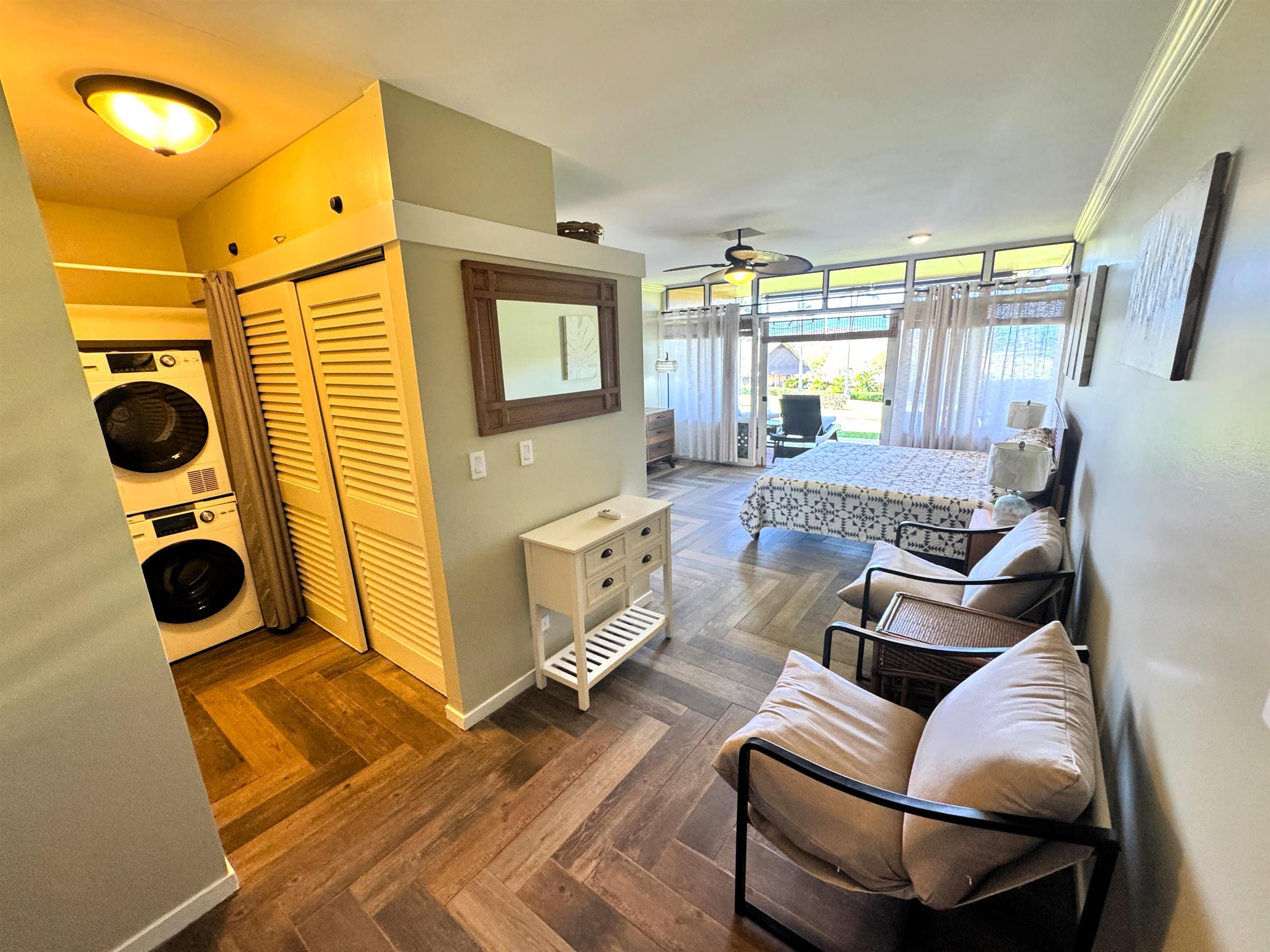 Escape to the tranquil west side of Molokai in this beautifully updated, ground-floor studio. Unit 1162 is located in a resort-zoned community, making it a rare and legal opportunity for short-term vacation rentals—perfect for the savvy investor or the part-time resident looking to offset costs. This gem offers the perfect blend of modern convenience and island charm, featuring stylish herringbone-patterned flooring and a fully equipped kitchen with a stainless steel range and updated cabinetry. The open-concept living area flows seamlessly onto a private lanai, where you can enjoy your morning coffee against a backdrop of lush tropical grounds and the Pacific blue. Practicality meets paradise with the rare inclusion of an in-unit washer/dryer and a functional layout designed for effortless stays. Just steps from your door, you can explore the golden sands of Kepuhi Beach, lounge by the oceanfront pool, or take a short stroll to the world-renowned Papohaku Beach. Whether you’re watching seasonal whales from the shore or enjoying legendary "green flash" sunsets, this turn-key, fee-simple condo is your gateway to the ultimate Hawaiian lifestyle.