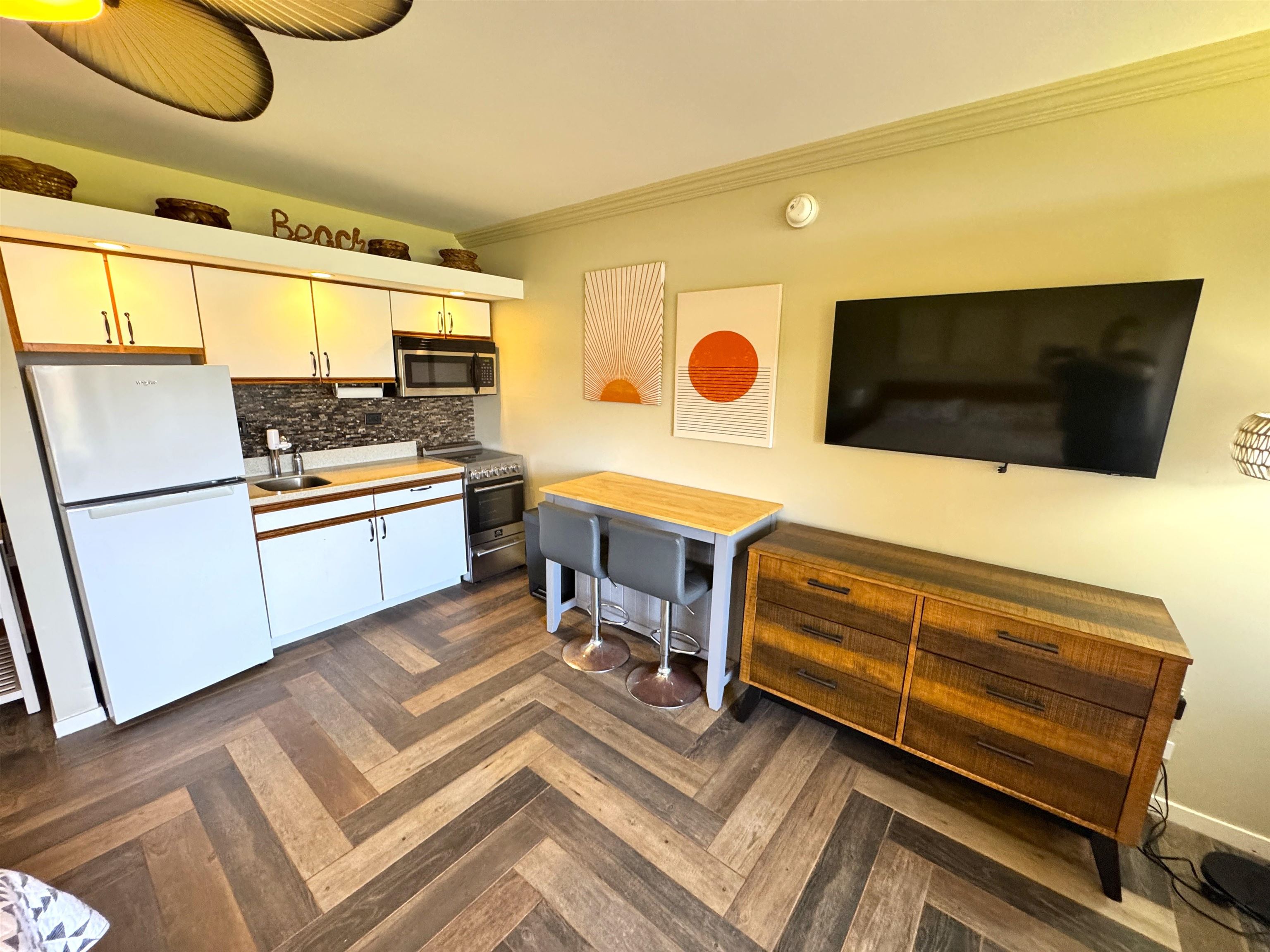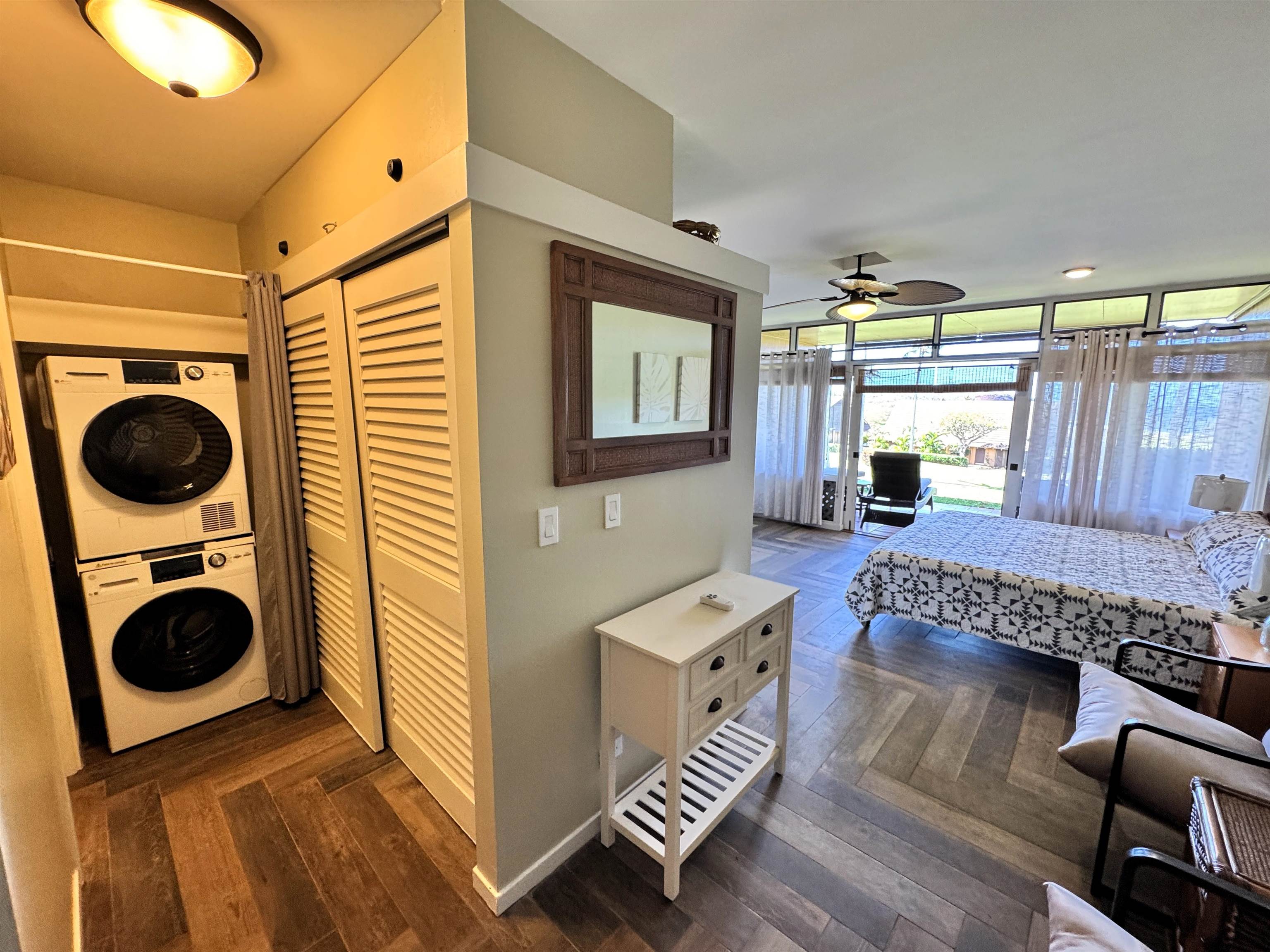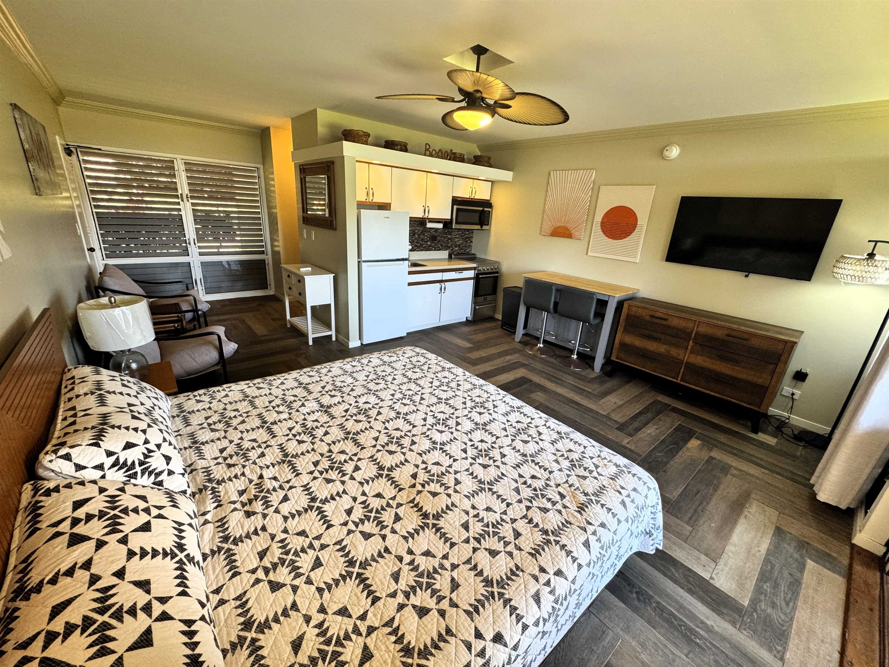 Escape to the tranquil west side of Molokai in this beautifully updated, ground-floor studio. Unit 1162 is located in a resort-zoned community, making it a rare and legal opportunity for short-term vacation rentals—perfect for the savvy investor or the part-time resident looking to offset costs. This gem offers the perfect blend of modern convenience and island charm, featuring stylish herringbone-patterned flooring and a fully equipped kitchen with a stainless steel range and updated cabinetry. The open-concept living area flows seamlessly onto a private lanai, where you can enjoy your morning coffee against a backdrop of lush tropical grounds and the Pacific blue. Practicality meets paradise with the rare inclusion of an in-unit washer/dryer and a functional layout designed for effortless stays. Just steps from your door, you can explore the golden sands of Kepuhi Beach, lounge by the oceanfront pool, or take a short stroll to the world-renowned Papohaku Beach. Whether you’re watching seasonal whales from the shore or enjoying legendary "green flash" sunsets, this turn-key, fee-simple condo is your gateway to the ultimate Hawaiian lifestyle.
