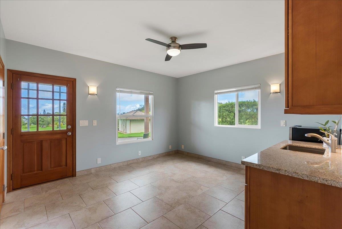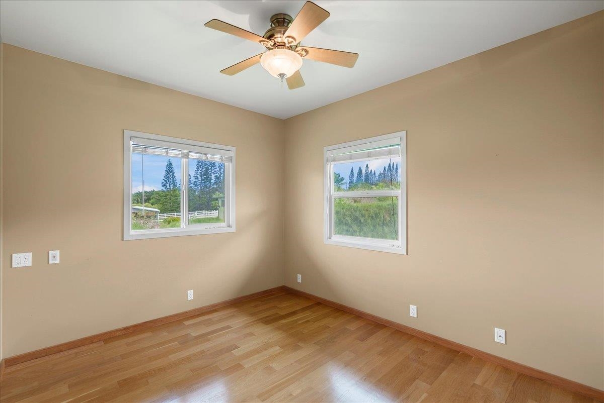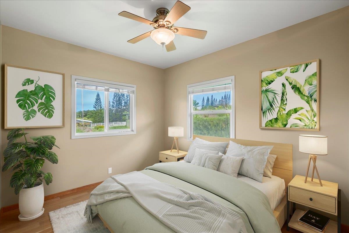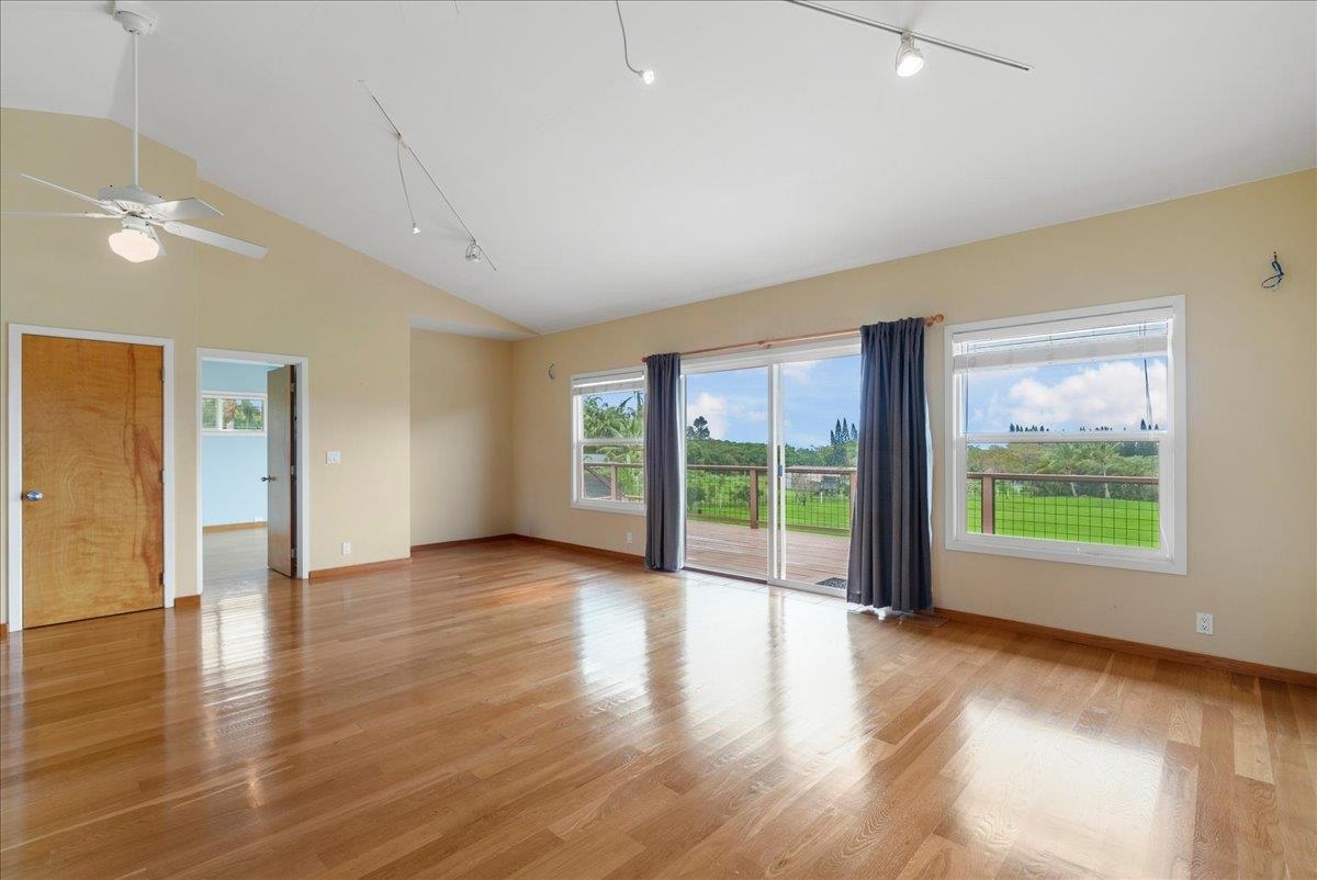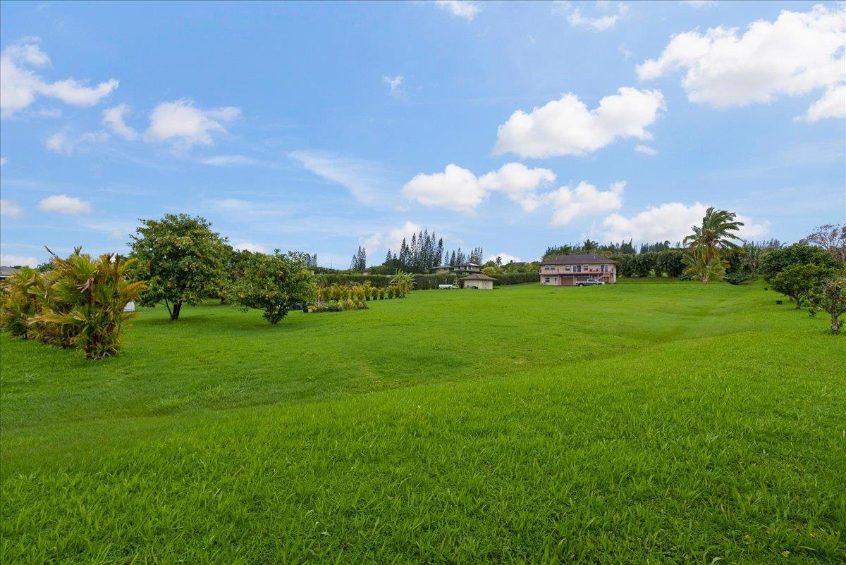 Haiku Mauka Oceanview Home on 2 fenced Acres! Two story Plantation Style inspired living with flexible floor plan: Upstairs 3 bedrooms/2 bathrooms and a large ocean facing lanai. Downstairs features a Bonus private entrance studio bedroom + full bath and wet bar. Ideal for possible income, or room for guests and extended family. Property has views of Haleakala, West Maui Mountains, Giggle Hill, and North Shore Ocean vistas. Home boasts beautiful custom finishes throughout including oak sandwood floors, granite countertops, custom cherry wood cabinets, gas cook top stove, and vaulted ceilings. Luxurious primary bathroom featuring granite counters, bamboo cabinetry, walk in shower, and walk-in closet. Spacious 2 car garage, workshop, laundry area with a half bathroom, and outdoor shower. Unique detached 12 x 20ft Garden Workshop , Established Orchard Trees (tangerine, orange, lemon, lime, mango, grapefruit, & coconut palms), and space to add a detached Ohana. Nestled centrally within the highly sought after Haiku Mauka neighborhood , adjacent to "Giggle Hill" Park in Haiku. Park features an equestrian ring, hiking, community playground, large open space, and event pavilions. This stunning offering is the perfect blend of country living and modern convenience in the Heart of Haiku, a short drive to Shopping, Dining, Gym, Post office and 10 minutes to world Famous Ho'okipa Beach. FURNISHINGS ARE DIGITALLY STAGED. Easy to Show!