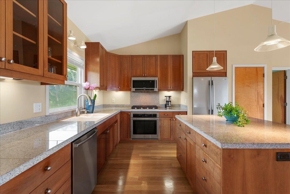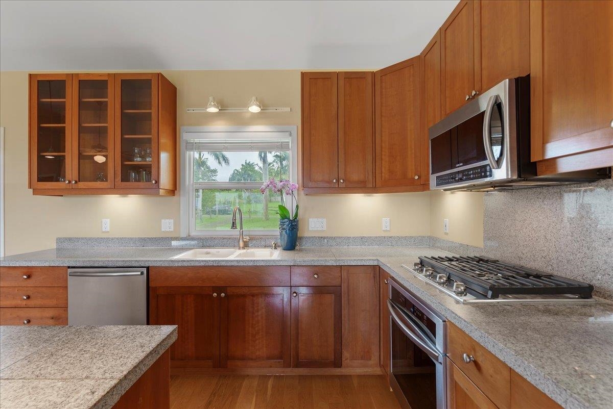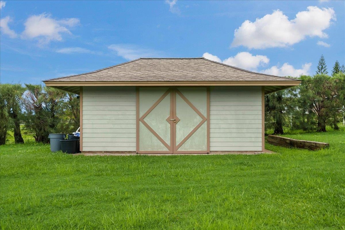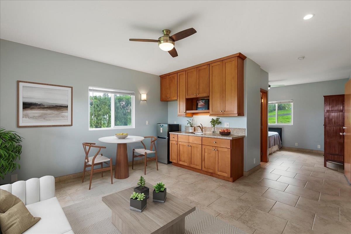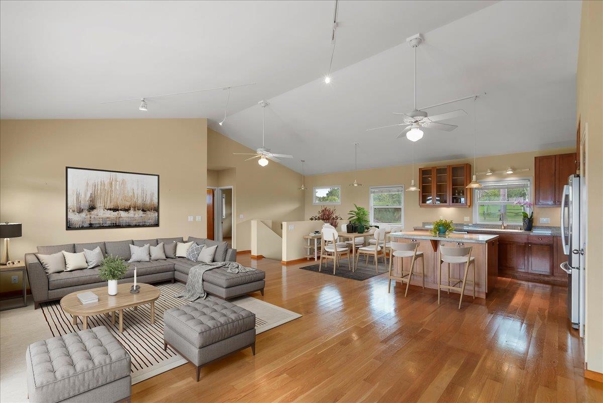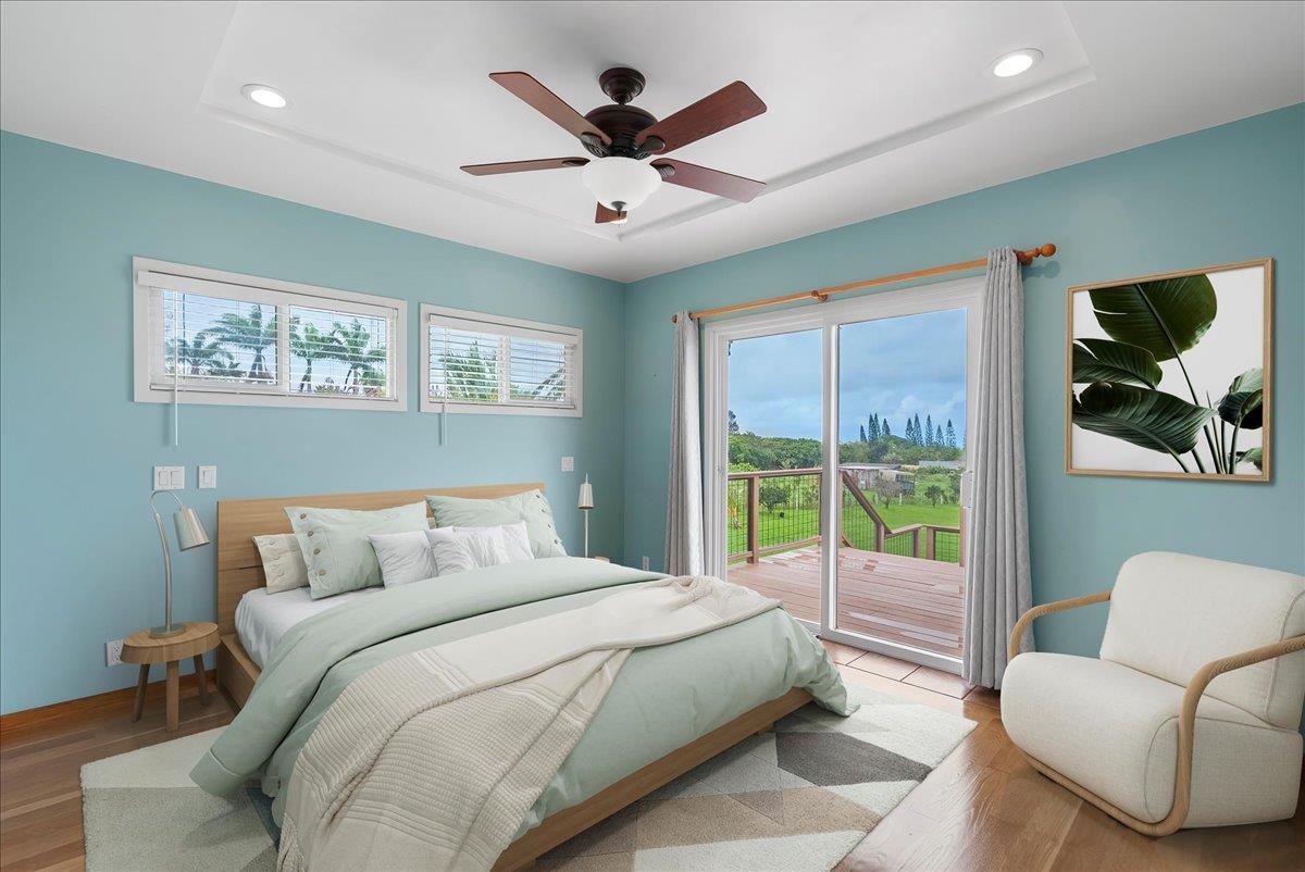 Haiku Mauka Oceanview Home on 2 fenced Acres! Two story Plantation Style inspired living with flexible floor plan: Upstairs 3 bedrooms/2 bathrooms and a large ocean facing lanai. Downstairs features a Bonus private entrance studio bedroom + full bath and wet bar. Ideal for possible income, or room for guests and extended family. Property has views of Haleakala, West Maui Mountains, Giggle Hill, and North Shore Ocean vistas. Home boasts beautiful custom finishes throughout including oak sandwood floors, granite countertops, custom cherry wood cabinets, gas cook top stove, and vaulted ceilings. Luxurious primary bathroom featuring granite counters, bamboo cabinetry, walk in shower, and walk-in closet. Spacious 2 car garage, workshop, laundry area with a half bathroom, and outdoor shower. Unique detached 12 x 20ft Garden Workshop , Established Orchard Trees (tangerine, orange, lemon, lime, mango, grapefruit, & coconut palms), and space to add a detached Ohana. Nestled centrally within the highly sought after Haiku Mauka neighborhood , adjacent to "Giggle Hill" Park in Haiku. Park features an equestrian ring, hiking, community playground, large open space, and event pavilions. This stunning offering is the perfect blend of country living and modern convenience in the Heart of Haiku, a short drive to Shopping, Dining, Gym, Post office and 10 minutes to world Famous Ho'okipa Beach. FURNISHINGS ARE DIGITALLY STAGED. Easy to Show!
