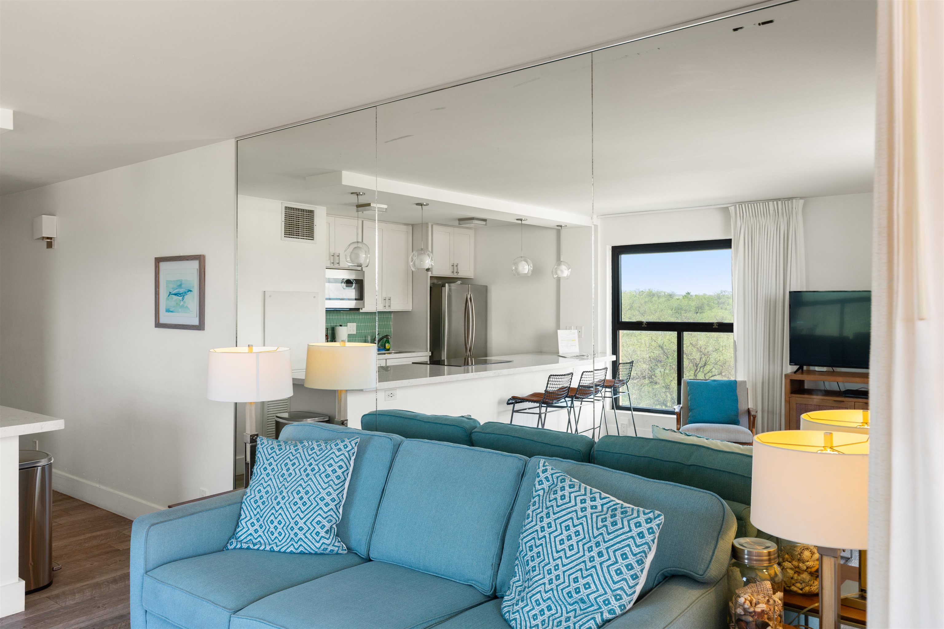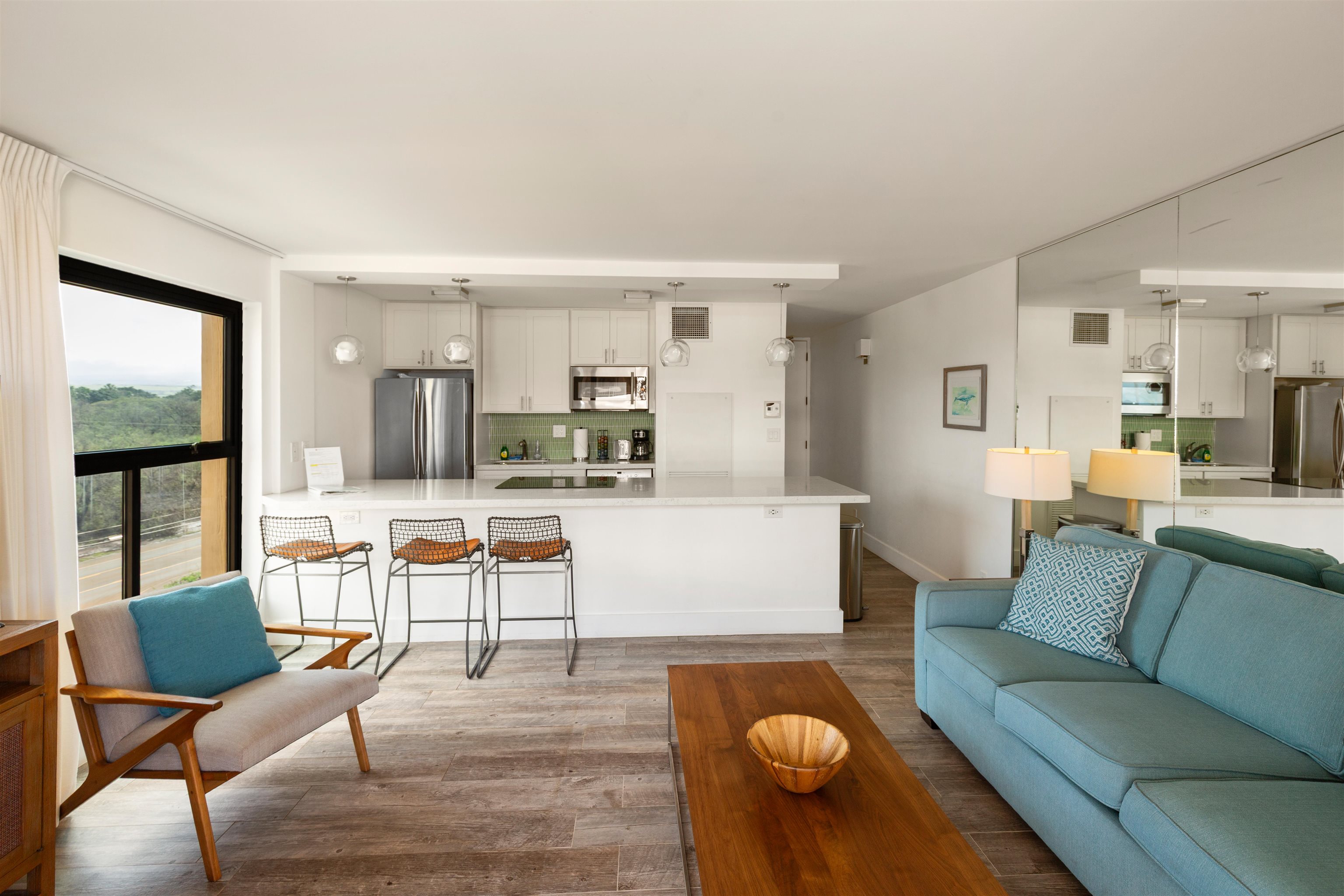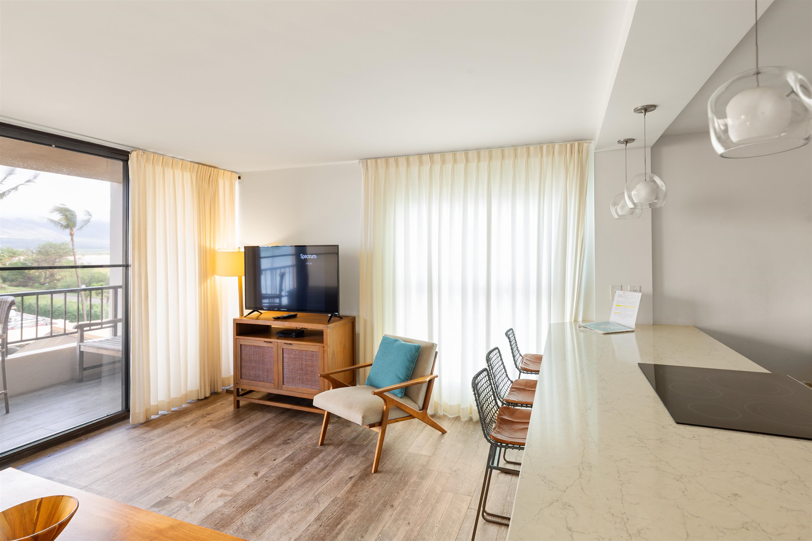 Sugar Beach Resort #502 offers a top-quality remodel with porcelain tile flooring, custom aquamarine tilework, stainless appliances, and quartz countertops. This fully furnished corner unit features extra windows, ocean, mountain, and pond views, central AC, in-unit washer/dryer, and access to the oceanfront pool, hot tub, sauna, and on-site restaurant. The unit is pet-friendly with no size restrictions and allows legal short-term vacation rentals zoned Hotel/Resort. Sugar Beach Resort sits on over 5 miles of sugar fine sand with whale watching during whale season. Relax on your private lanai, where the soothing sounds of ocean waves and vibrant sunsets create an unforgettable atmosphere. Comprehensive Utilities Included.......all utilities, such as electricity, water, sewer, garbage, Wi-Fi, cable TV, an individual internet connection, and telephone—providing hassle-free living and predictable expenses.