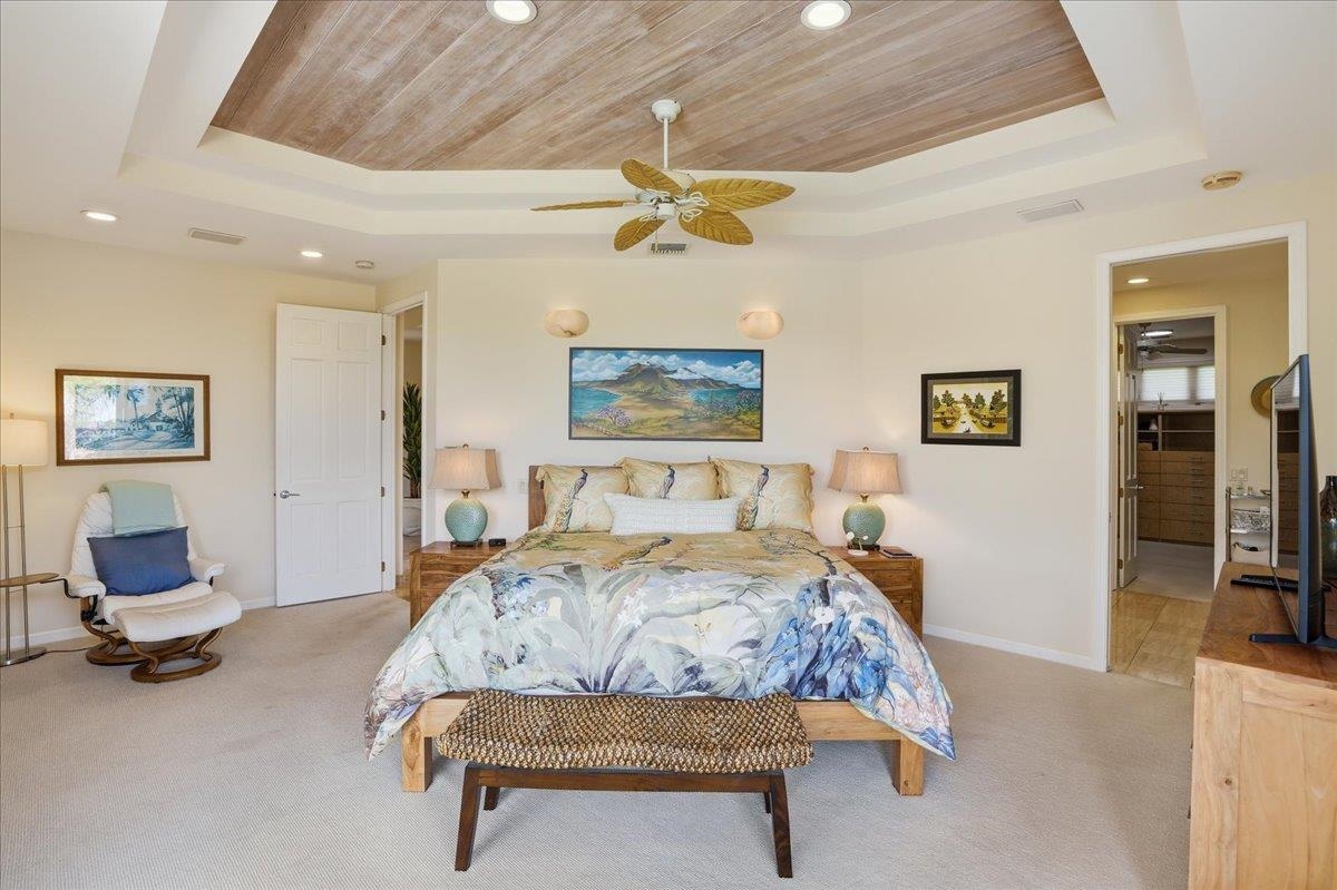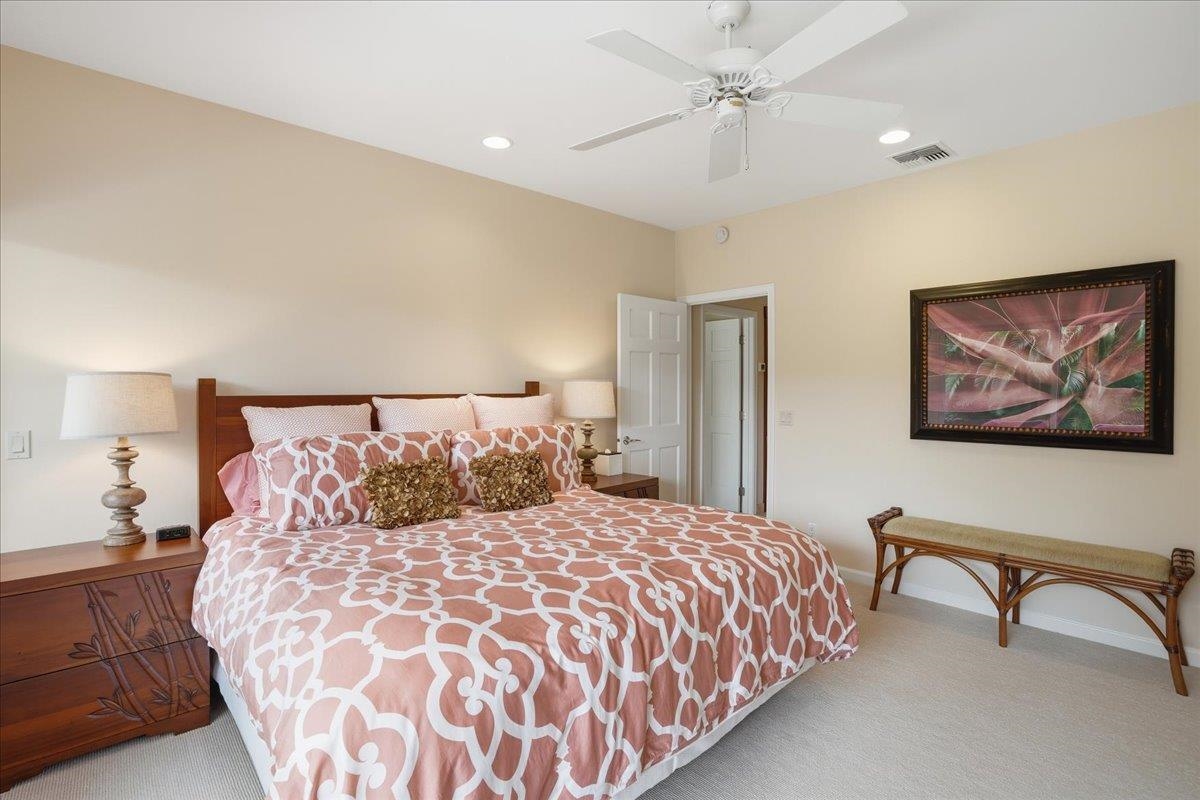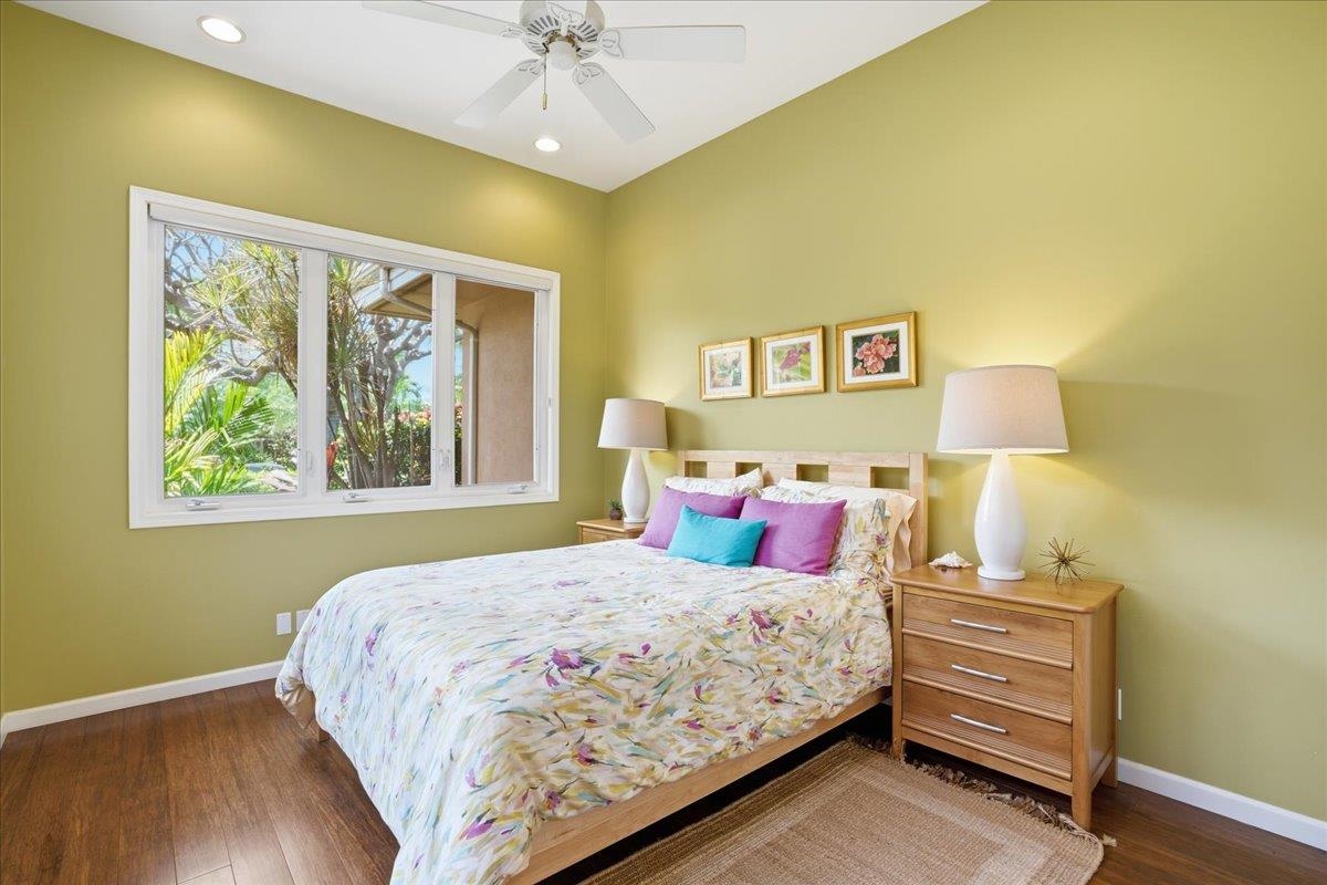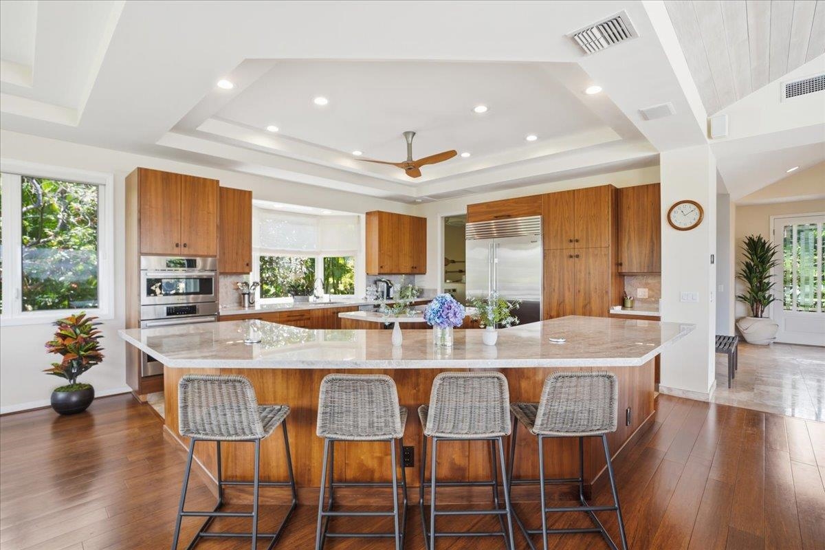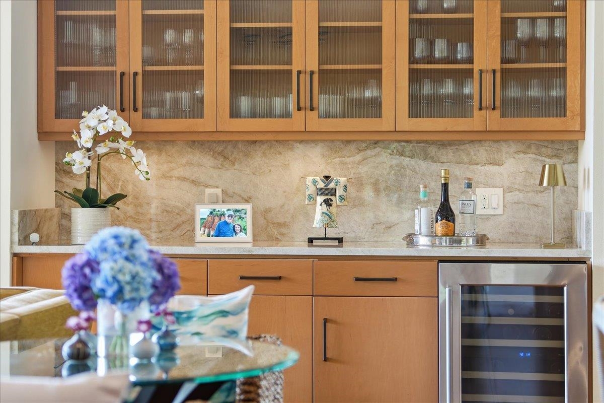 Experience Wailea Luxury living in this beautifully updated Wailea Pualani Estates residence at 347 Kualono Pl. This private residence is located in a gated community within the Wailea Resort, surrounded by world-class golf courses, shopping, dining, and beautiful beaches. Enjoy lush tropical garden vistas and a pleasant ocean view from the main living area and lanai. Nestled along the neighborhood greenbelt for extra privacy, this home is designed for seamless indoor-outdoor living. This luxurious home features an open-concept great room with large sliding glass doors that disappear into the walls, flowing effortlessly to a tiled pool deck and covered lanai—creating a private oasis for relaxing or entertaining. The remodeled gourmet kitchen showcases custom walnut cabinetry, Taj Mahal quartzite countertops, and modern appliances. With approximately 3,000 sq. ft. and a flexible 4-bedroom, 3.5-bath layout that lives primarily on one level, plus two private ensuite guest rooms below, this fully furnished home is perfect for families or guests. Downstairs, a temperature-controlled wine cellar adds a refined touch. Photovoltaic panels, solar hot water, whole-house water filtration and softening systems, and an outdoor shower enhance comfort and efficiency at 347 Kualono Pl. in sunny Wailea.