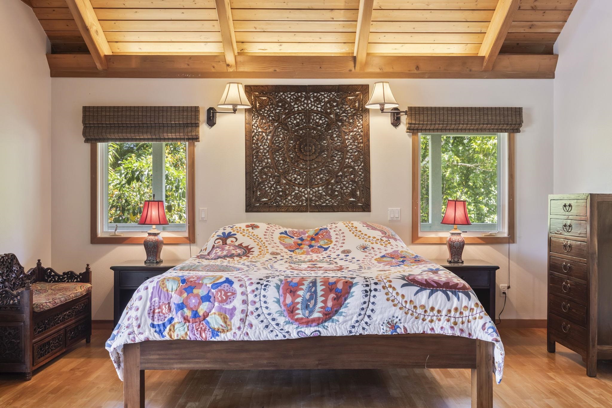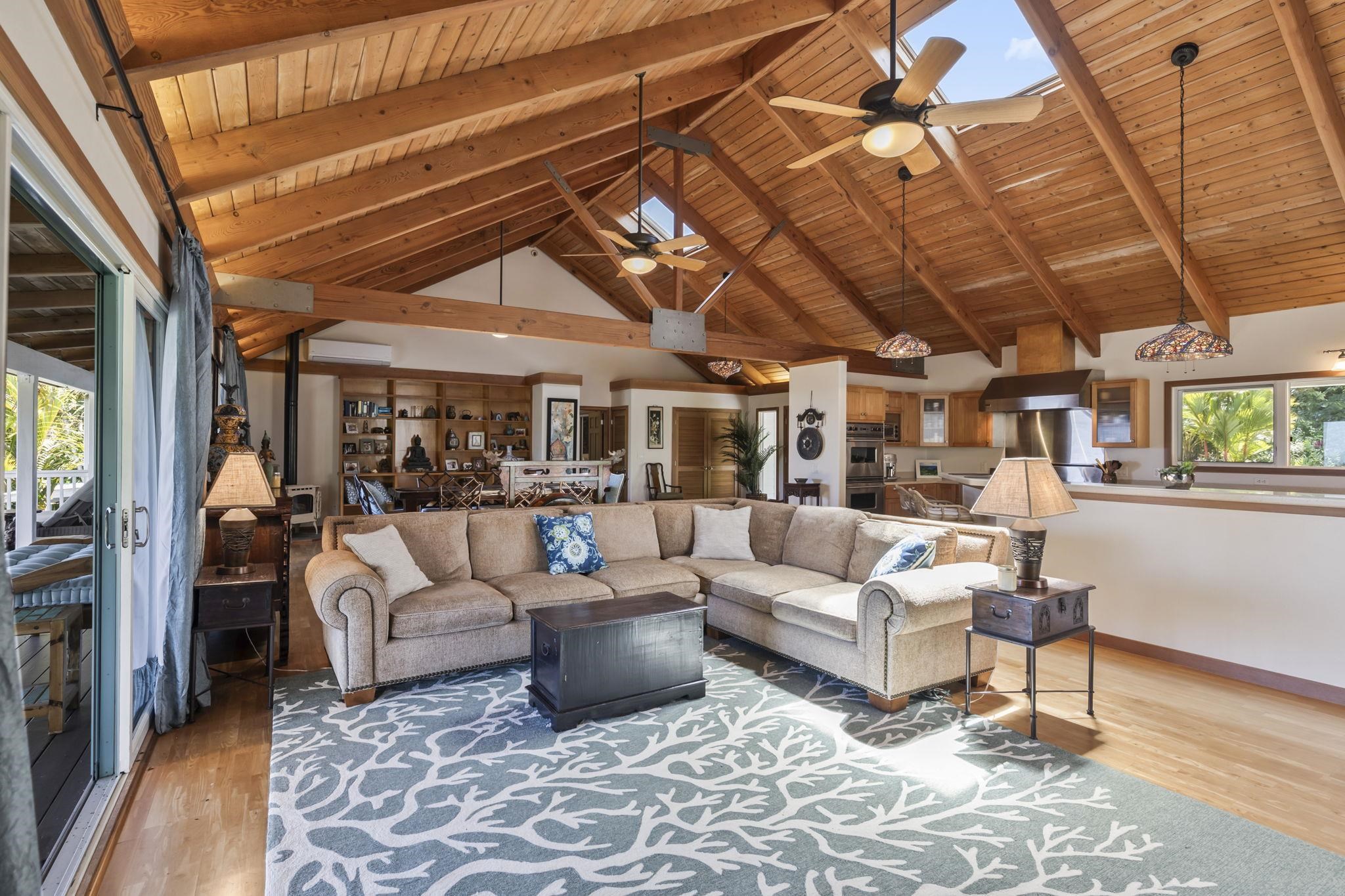 Experience stunning ocean views paired with a majestic mountain backdrop on this exquisite 9.53-acre estate. Embrace the tranquil lifestyle that Hana has to offer, nestled at the end of a peaceful cul-de-sac. The lush, vibrant grounds provide a wealth of agricultural opportunities while the cozy interior invites relaxation. Featuring open beam ceilings, hardwood floors, a warm fireplace, air conditioning, and a wraparound deck, this home perfectly balances comfort and serenity. Explore your own tropical paradise filled with colorful flowers and a variety of fruit trees. The property also includes a spacious covered recreational area, a two-car garage, and caretaker's quarters for added convenience. Just a short drive from Hana Airport, Waianapanapa State Park, beautiful beaches including the famous Hamoa Beach, as well as local restaurants, food trucks, farm stands, art galleries, and so much more! Contact your favorite realtor today to arrange a private showing!