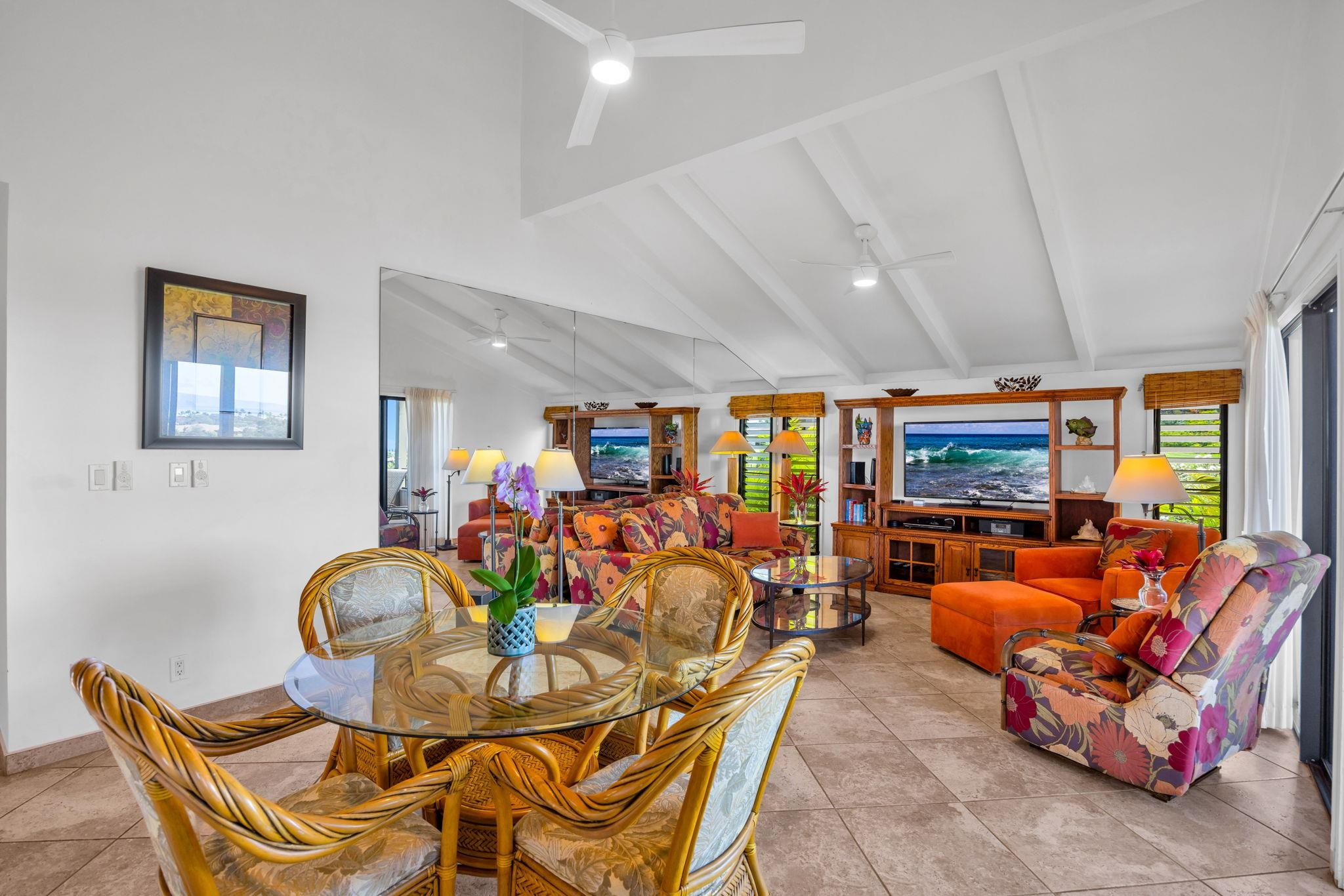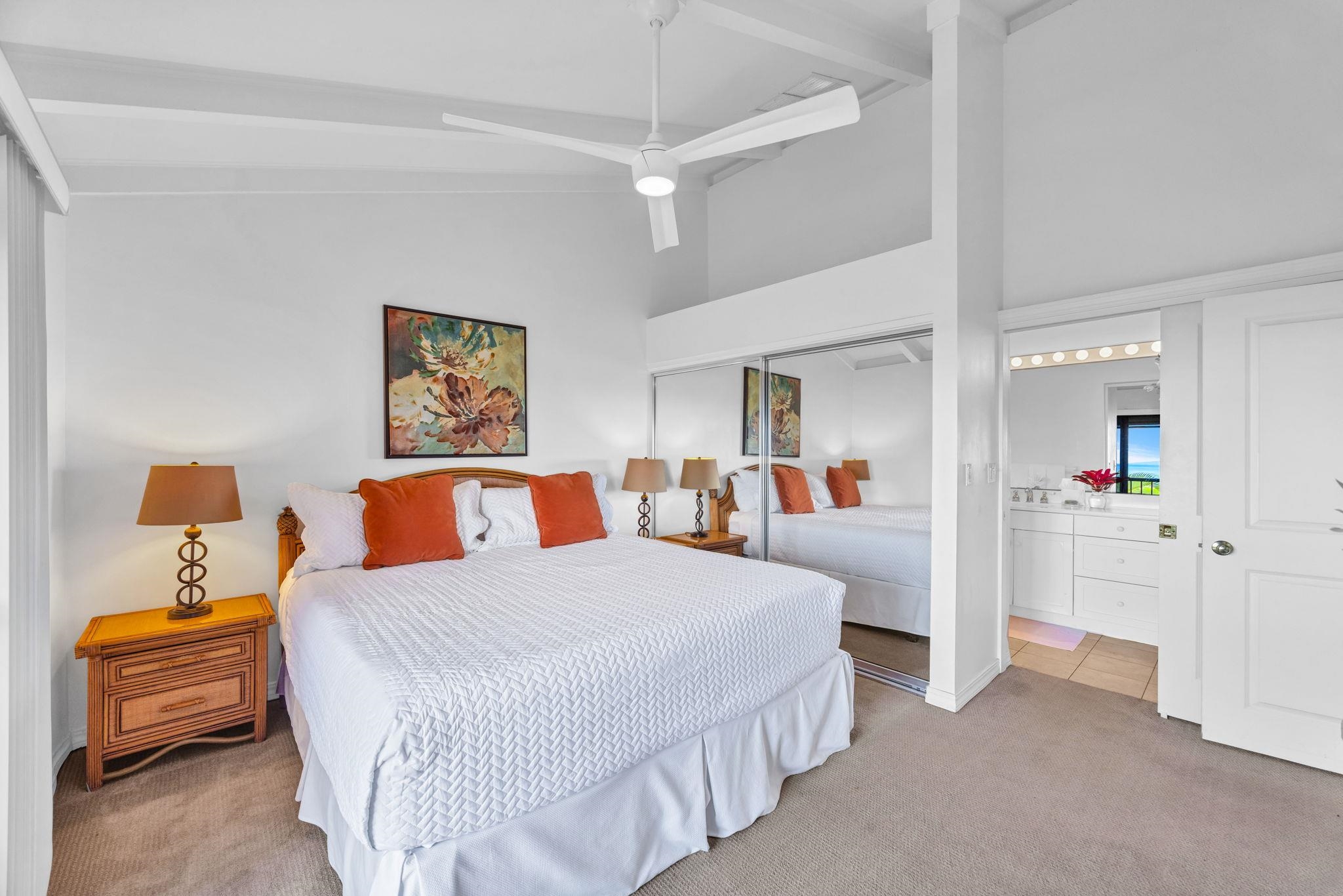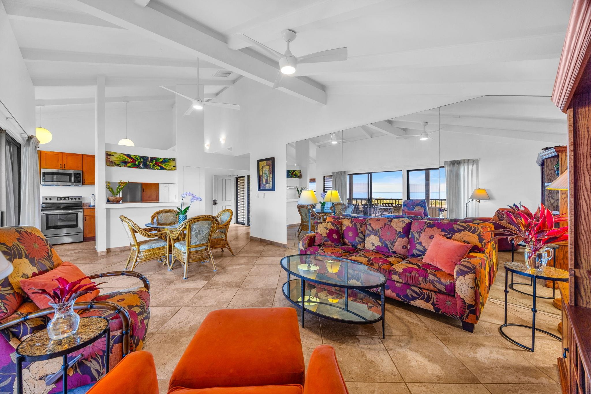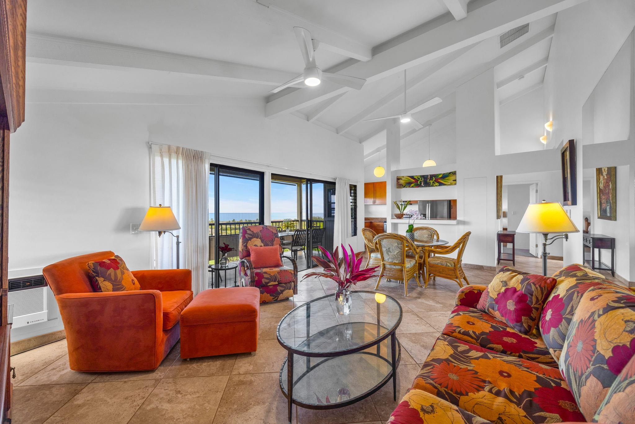 FRONT ROW, PRIME LOCATION. 180 DEGREE OCEAN VIEWS. Wailea Ekolu 308 delivers it all. Overlooking the Wailea Blue Golf Course affords more than beauty: it creates a buffer of open private space that enhances the pastoral view. Sunsets light the sky in a blazing symphony of colors and never cease to inspire. This spacious two-bedroom, two-bath residence is offered turnkey, furnished, and features vaulted ceilings that create architectural drama, drawing one's eye upward, filling the voluminous space with light. The open floor plan flows seamlessly between the living, dining and expansive ocean view lanai. Each bedroom has its own private lanai, providing three lanais in total. The primary ocean view bedroom includes a renovated ensuite bath. You will enjoy your morning latte with a clear view of the blue horizon. World class golf, tennis, beaches, dining, and shopping abound. No need to plan your day around logistics. Afternoons are spent on the sand or by the pool, and evenings naturally return to the lanai for sunsets. Wailea Ekolu is one of Wailea Resort's beloved addresses. Residents enjoy multiple swimming pools, BBQ areas, and garden pathways throughout the property. Looking for A TURN-KEY, FURNISHED, FRONT-ROW, WAILEA CONDO THAT COMBINES INCREDIBLE OCEAN VIEWS, EASY ACCESS, AND EASE OF CONDO OWNERSHIP, WAILEA EKOLU 308 is a great choice and opportunity.